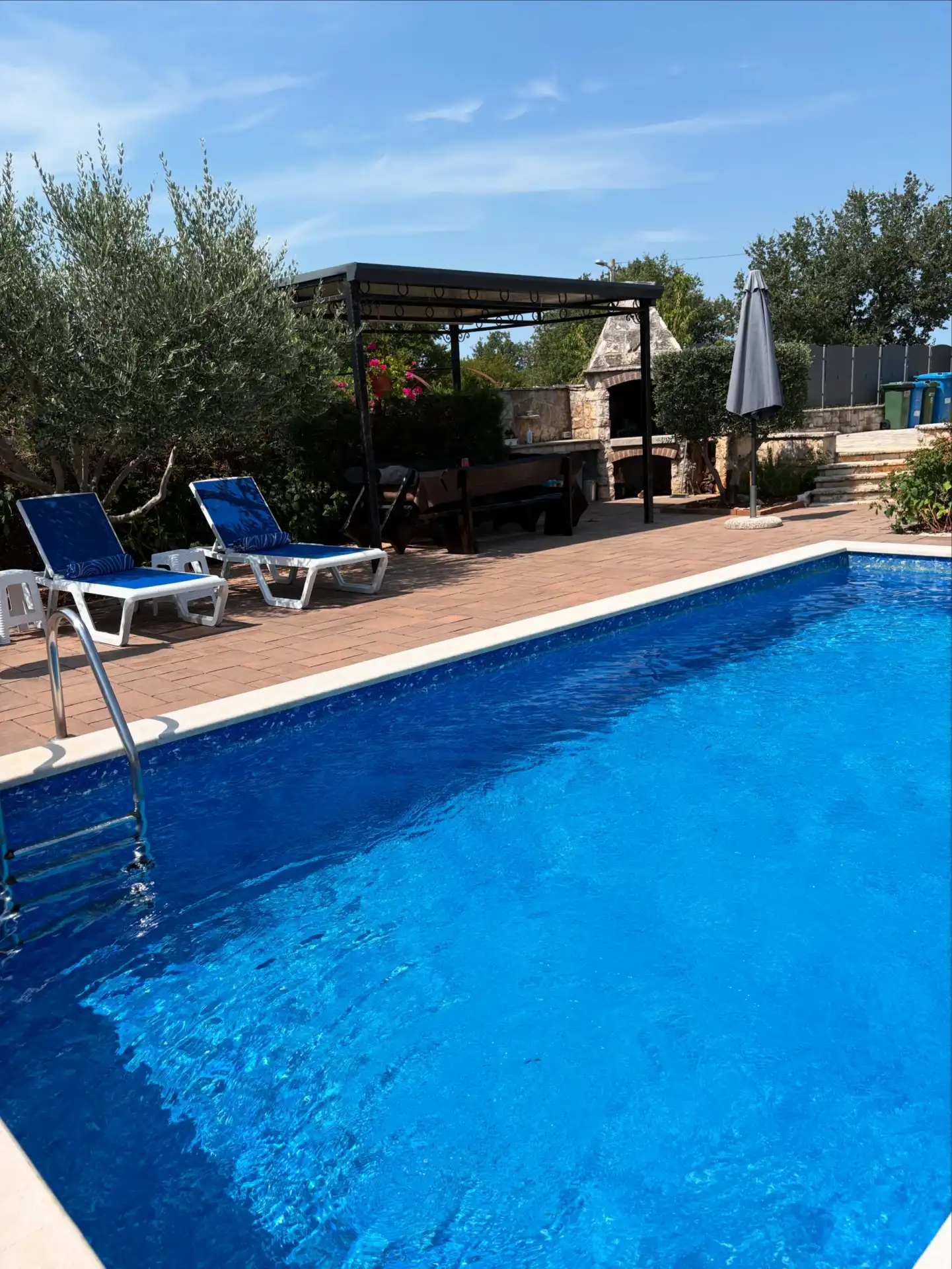 Dům se skládá ze 3 apartmánů, maximálně pro 7 osob. Pronajímá se jako jedna bytová jednotka. Pro jednu rodinu nebo skupinu až 7 osob. V zahradě je bazén s pláží plně vybavený zahradním nábytkem a lehátky a kamenným grilem. Dům je obklopen olivovými háji a umožňuje naprosté soukromí. Nachází se v klidné lokalitě s vlastním parkovištěm. Rezervace pouze o víkendech (sobota/neděle až sobota/neděle). Vítejte!