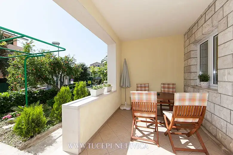 Náš apartmán A2+2 se nachází v přízemí domu. Obsahuje pokoj, přistýlku pro jednu nebo dvě osoby (děti). V koupelně je pračka, máte verandu, kde je jídelní stůl. Výhodou tohoto bytu je, že je blízko centra a pláže. Parkování je u domu.