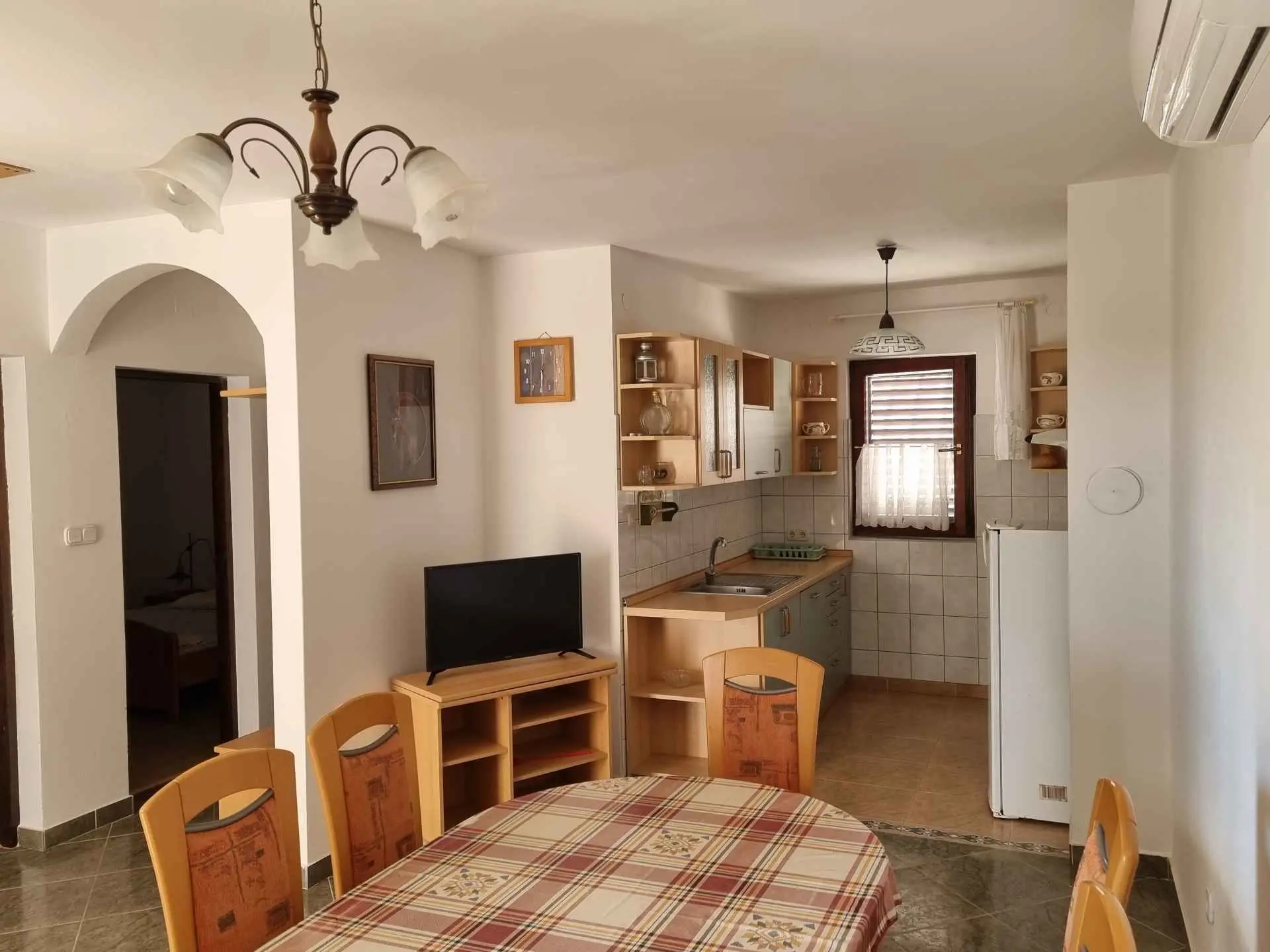 Plně vybavený a klimatizovaný apartmán (2 ložnice, kuchyň, jídelna, koupelna, krytá terasa). Apartmán se nachází v prvním patře samostatně stojícího domu v klidné slepé ulici. Je to 5 minut chůze od pláže, 2 minuty chůze od obchodu a 20 minut chůze podél moře do centra Viru.
