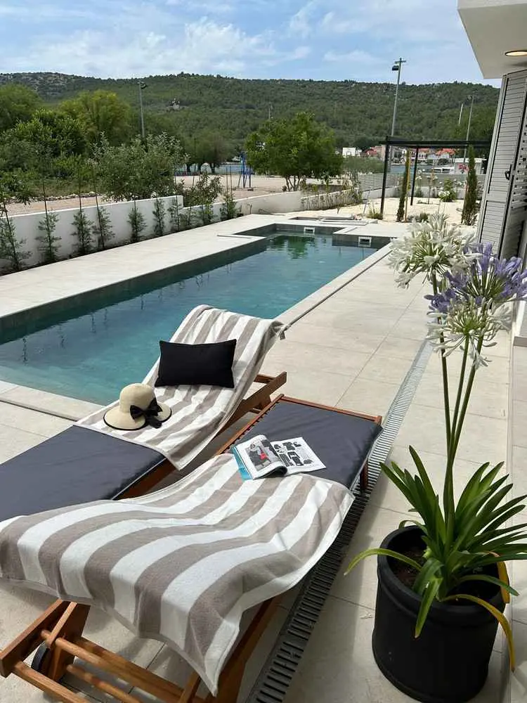 Dieses moderne und komfortable Ferienhaus liegt direkt am Meer in Bilice, einer idealen Gegend für Familien. Das Anwesen bietet einen privaten, 35 Quadratmeter großen Außenpool, der ganzjährig beheizt ist. Das Haus verfügt über vier geräumige Schlafzimmer, jedes mit einem Kingsize-Bett, und drei Badezimmer mit Duschen. Die voll ausgestattete Küche umfasst einen Kühlschrank, einen Gefrierschrank, einen Backofen, einen Geschirrspüler und alle notwendigen Küchenutensilien. Der Wohnbereich ist mit einem Kamin, einem Fernseher und WLAN ausgestattet. Zu den Außenanlagen gehören ein Garten, Gartenmöbel, ein Grill, ein Balkon und eine Terrasse, die viel Platz zum Entspannen und für Unterhaltung bieten. Das Anwesen verfügt außerdem über einen privaten Parkplatz mit fünf Stellplätzen. Zur weiteren Ausstattung gehören ein Spielzimmer, ein Reisebett, ein Safe und ein Bügeleisen. Haustiere sind erlaubt, maximal ein Haustier pro Buchung. Die Umgebung bietet eine Vielzahl von Attraktionen und Aktivitäten. Der Strand Stubalj ist nur 70 Meter und die historische Altstadt von Šibenik 8 Kilometer entfernt. In der Nähe finden Sie einen Supermarkt, einen Flughafen, einen Busbahnhof sowie eine Reihe von Restaurants und Cafés. Es besteht die Möglichkeit, ein 5–8 Meter langes Schlauchboot zu mieten. Ein Bootsliegeplatz kann direkt vor dem Haus reserviert werden. WLAN und Klimaanlage sind kostenlos. Privatparkplatz für 5 Autos. Babybett und Kinderhochstuhl sind verfügbar. Haustiere sind auf Anfrage kostenlos erlaubt. Rauchen ist im Haus verboten, nur im Freien. Das Haus ist videoüberwacht. Der Außenpool ist 35 m² groß und 1,6 m tief. Das Haus ist für maximal 8 Personen + 1 Kind ab 4 Jahren geeignet.