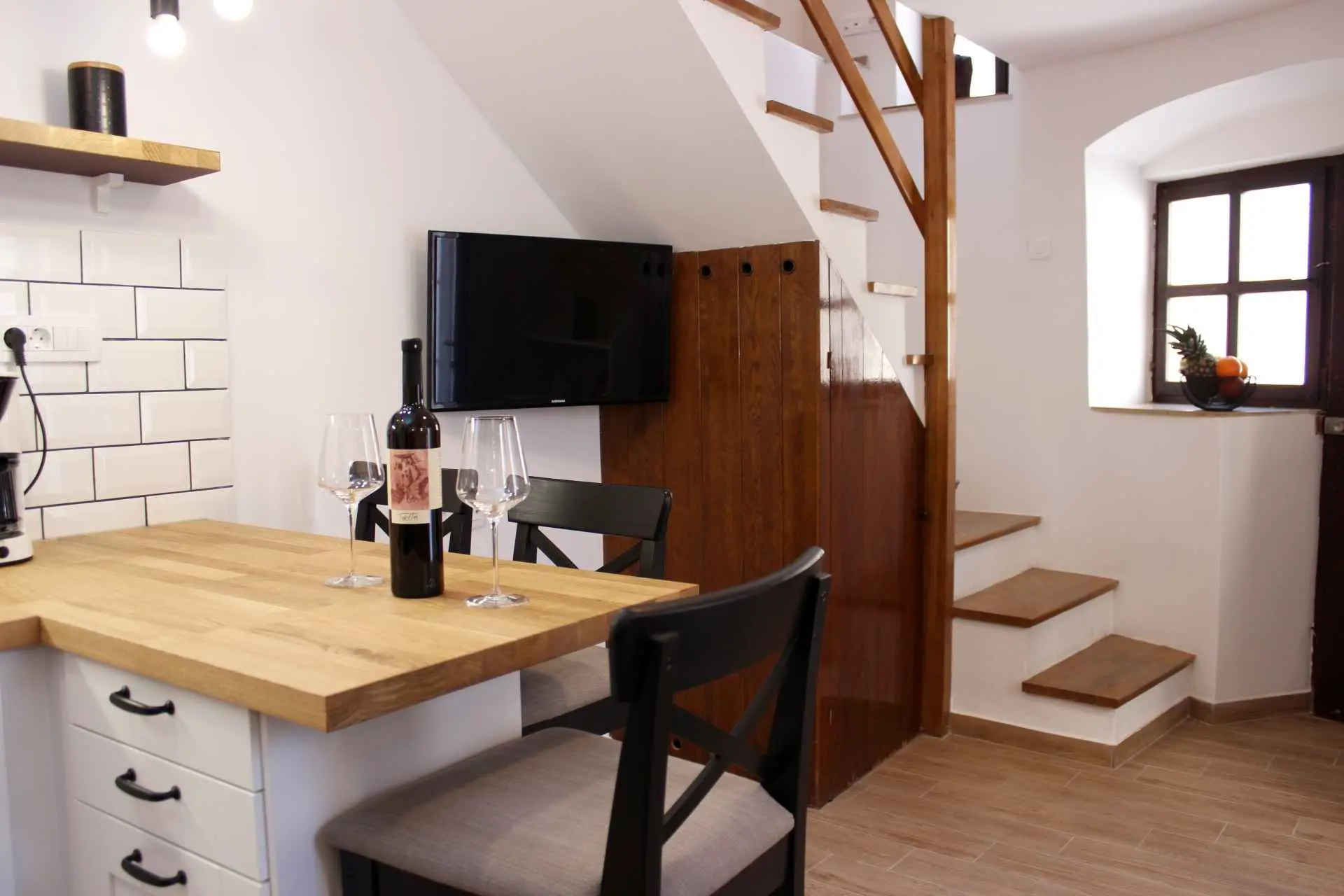 Das moderne zweistöckige Studio-Apartment Kendi liegt im Zentrum der malerischen Stadt Sutivan auf der Insel Brač. In der unteren Etage gibt es eine Toilette mit Bad und eine Küche mit Wohnzimmer. Die obere Etage besteht aus einem Bett neben einem schönen Kamin, der für eine besondere Atmosphäre sorgt, und einem Balkon mit Blick auf den Ort. Die Wohnung befindet sich im Zentrum von Sutivan, umgeben von typisch dalmatinischen Steinhäusern, nur 150 Meter von der Uferpromenade und dem Meer entfernt. Es ist klimatisiert, verfügt über WLAN und einen privaten Parkplatz.