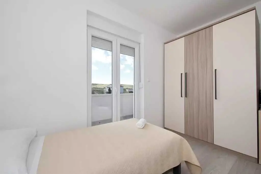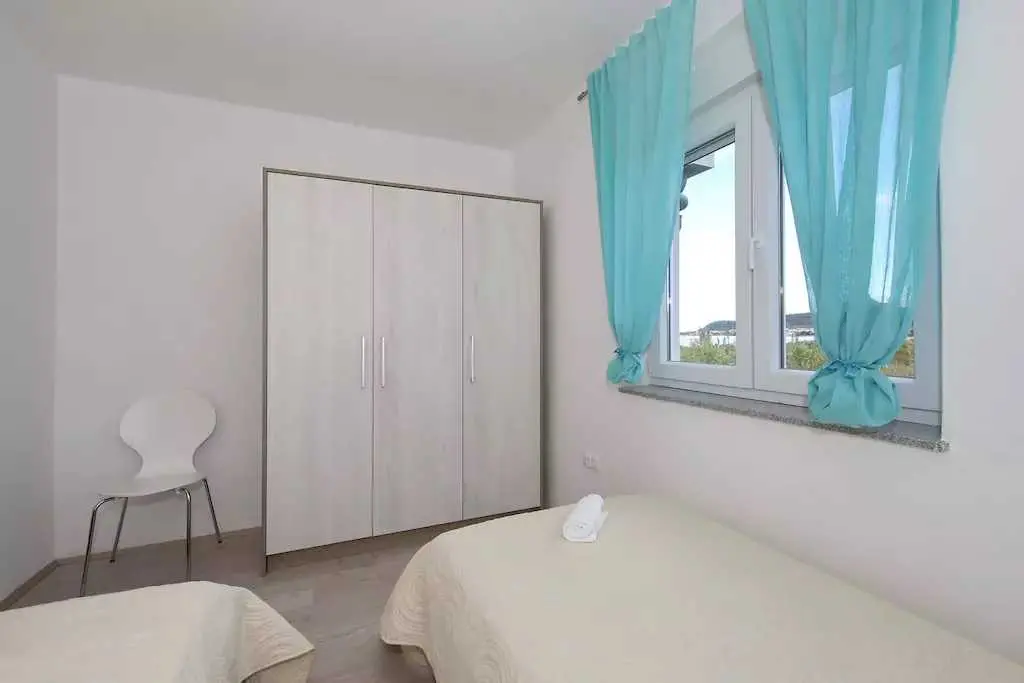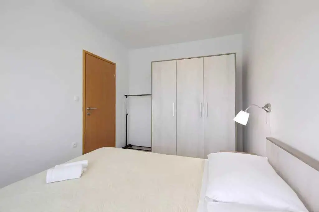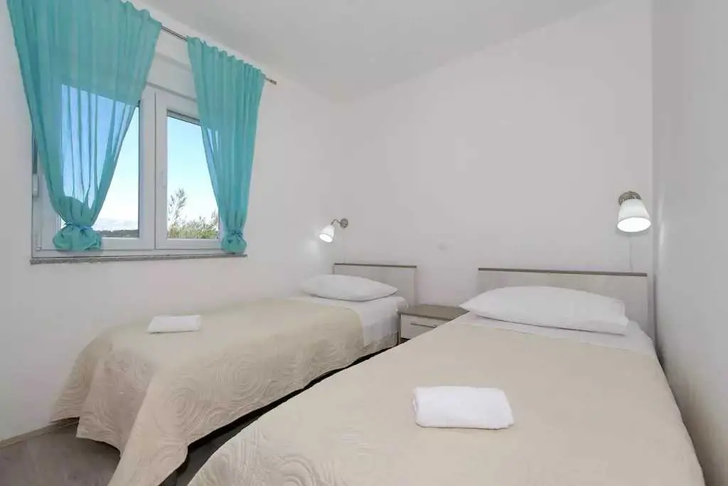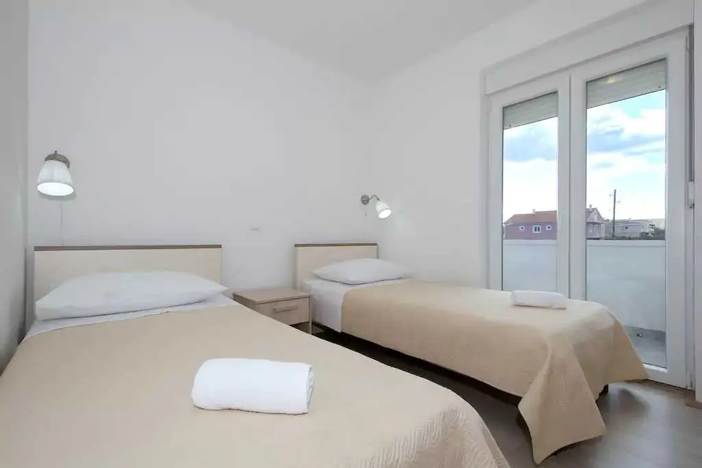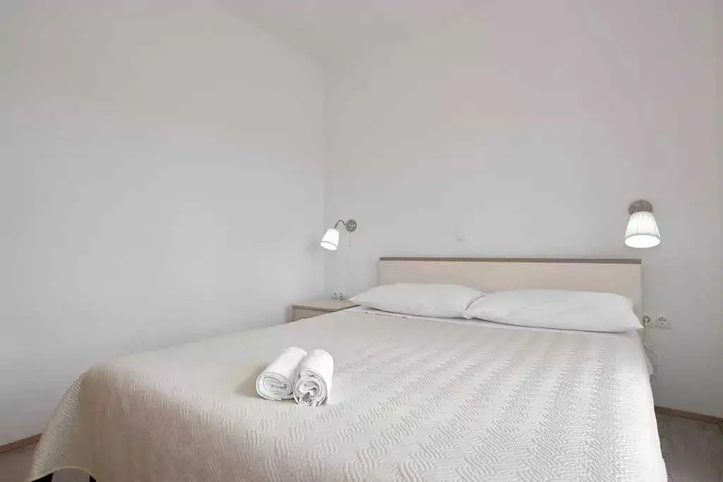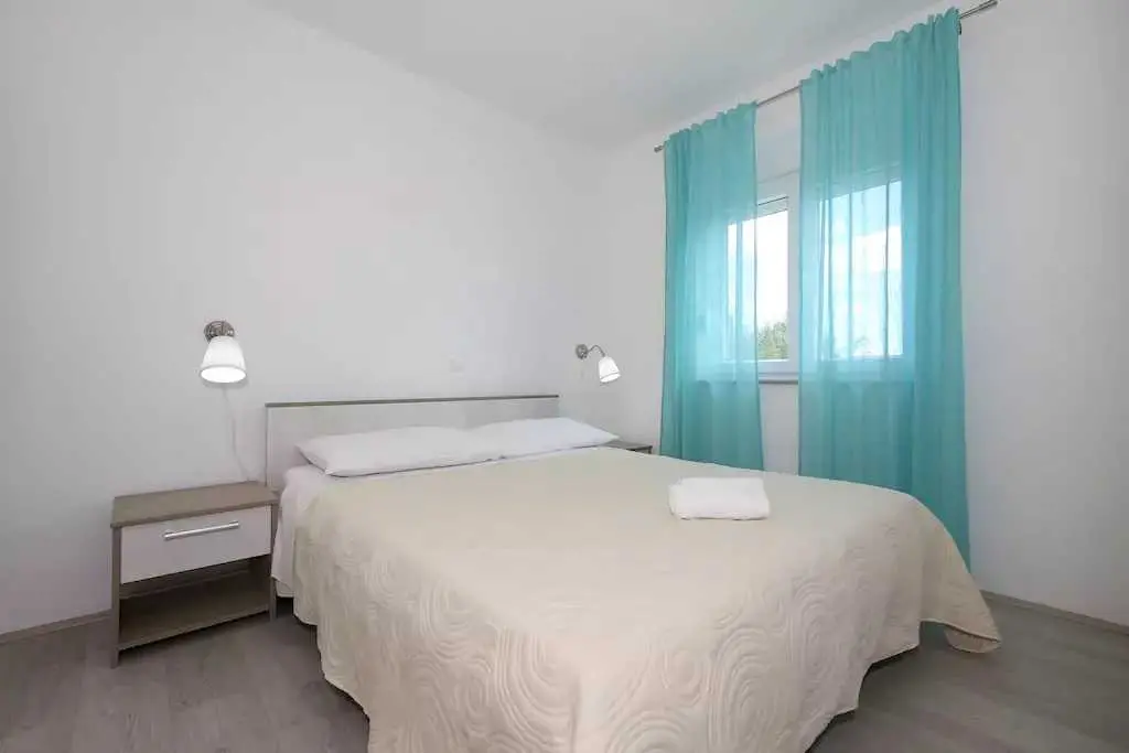 Genießen Sie einen Familienurlaub in unmittelbarer Nähe eines Sandstrandes in der ruhigen dalmatinischen Stadt Ljubač in der Region Zadar! Das Haus mit direktem Meerblick in zwei Wohnungen bietet Unterkunft für 8-10 Personen! Jede Wohneinheit hat eine Fläche von 70 m², besteht aus zwei Schlafzimmern, einer Küche und einem Wohnzimmer sowie einem Badezimmer und bietet Platz für 4-5 Personen. Die Apartments verfügen über kostenfreies WLAN und einen Flachbild-TV. Die Klimaanlage sorgt in den Sommermonaten für einen angenehmen Schlaf. Handtücher, Bettwäsche, eine Mikrowelle und ein Wasserkocher sind vorhanden. Haustiere sind nicht erlaubt. Ein Aufenthaltsraum mit Waschmaschine und kostenfreie Parkplätze gehören zum Angebot. Das nächste Restaurant ist 500 m und das Geschäft 800 m entfernt. Post, Apotheke, Arzt, größeres Tommy-Einkaufszentrum, Bibliothek und Fischmarkt befinden sich im Nachbarort Ražanac. Der Sandstrand neben dem Haus ist die perfekte Wahl für Familien mit kleinen Kindern. Preise pro Wohnung pro Nacht: 01.01. – 30.04.: 50 € 01.09. – 31.05.: 61 € 01.06. – 30.06.: 78 € 01.07. – 19.07.: € 100 20.07. – 20.08.: € 122 21.08 – 31.08.: € 100 01.09. – 30.09: 67 € 01.10. – 31.12.: 50 €