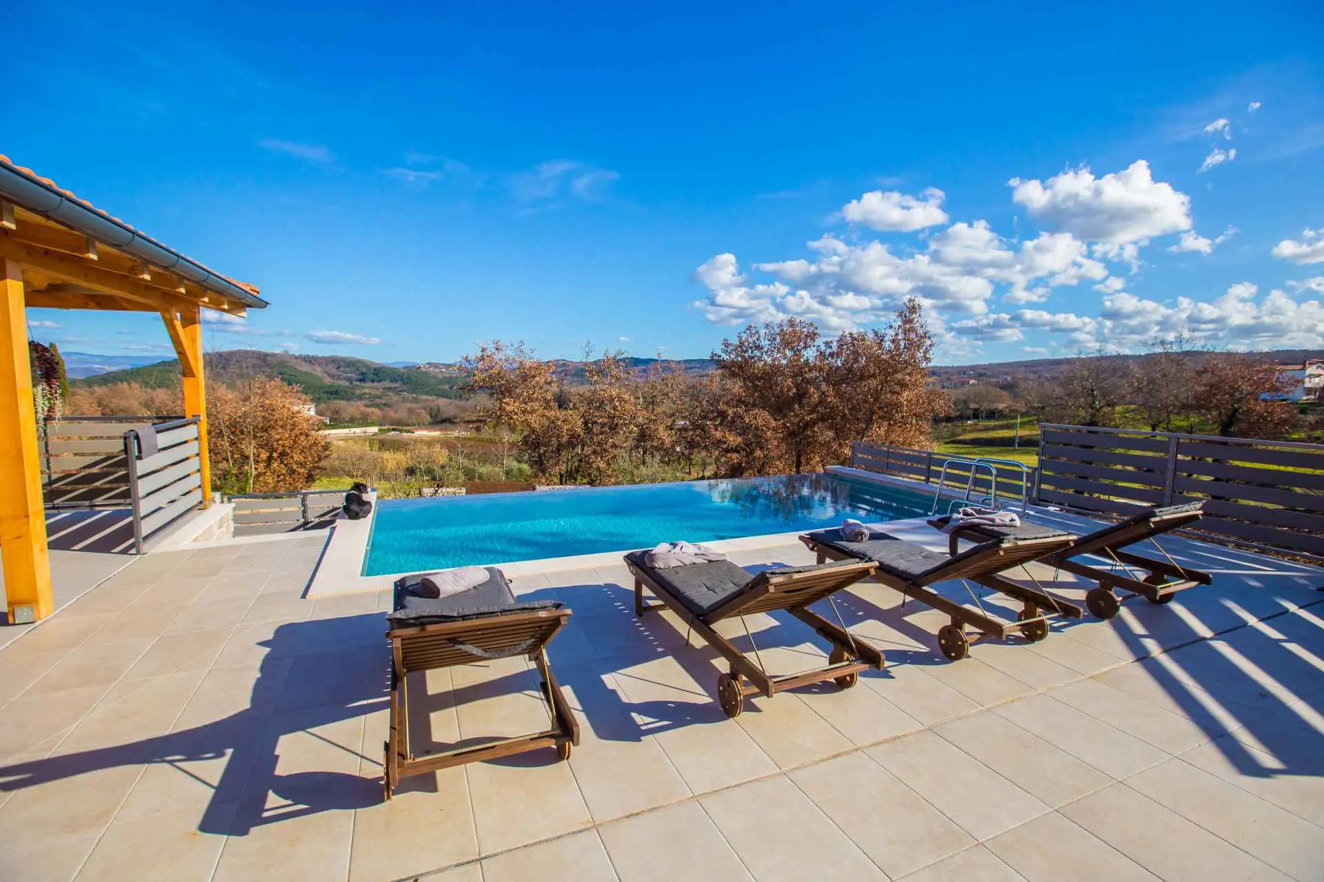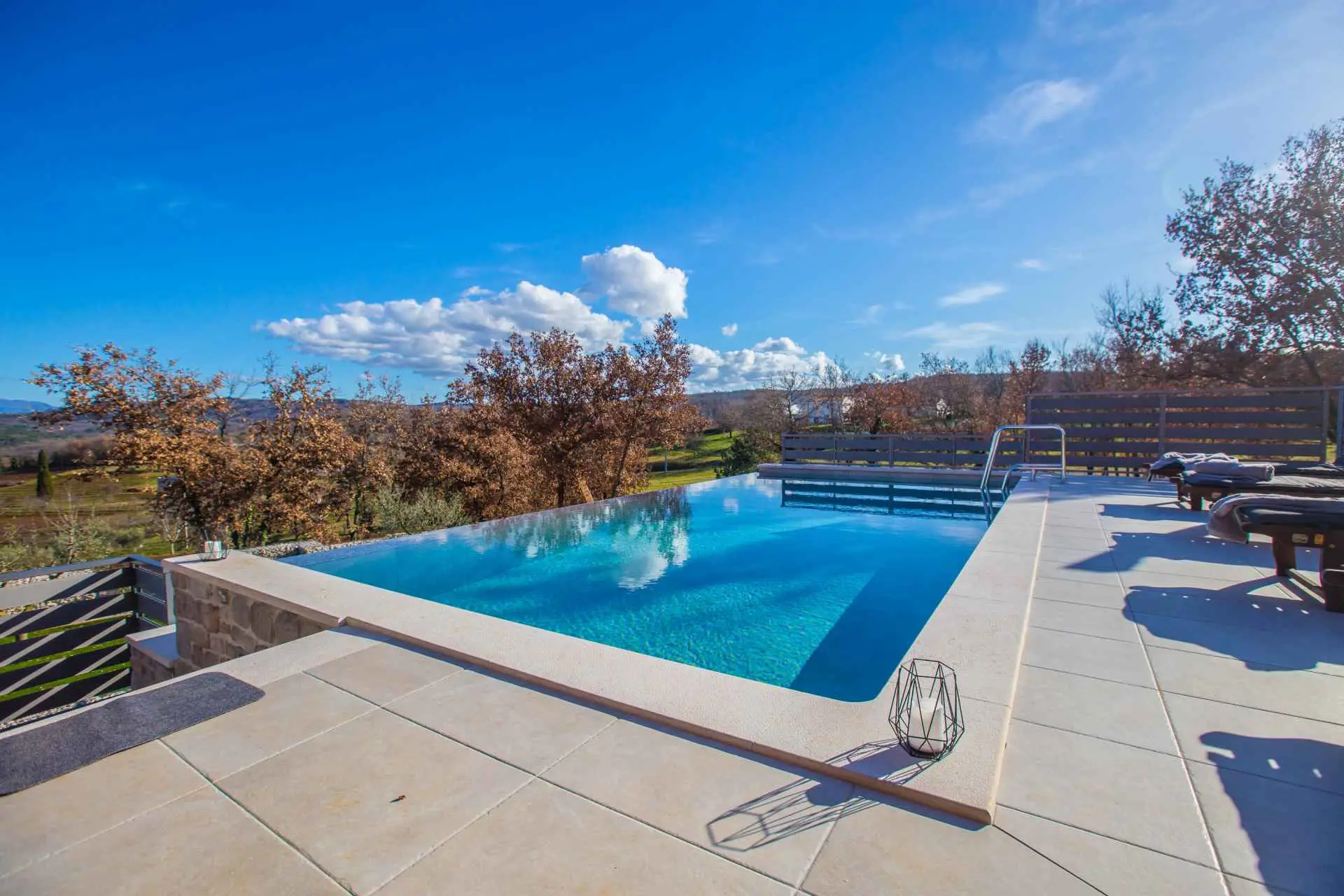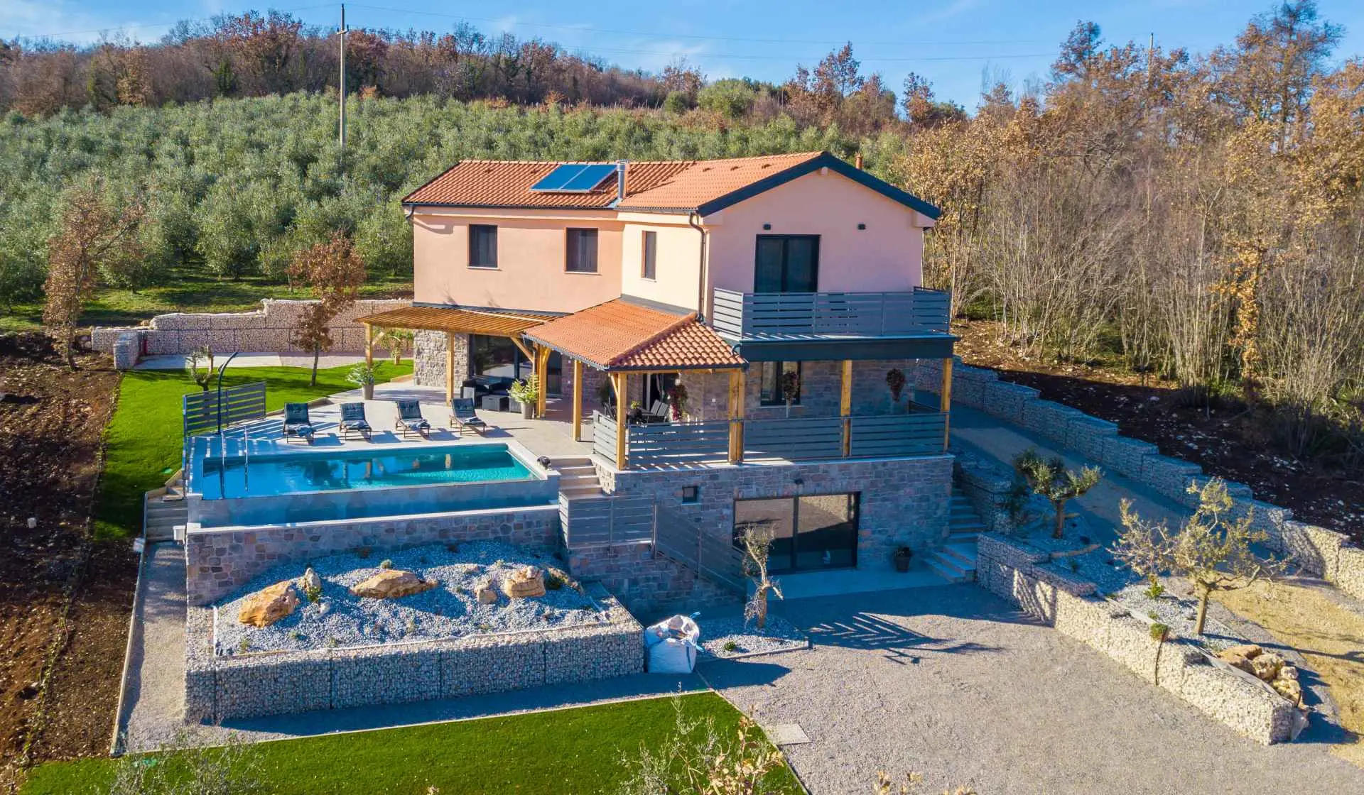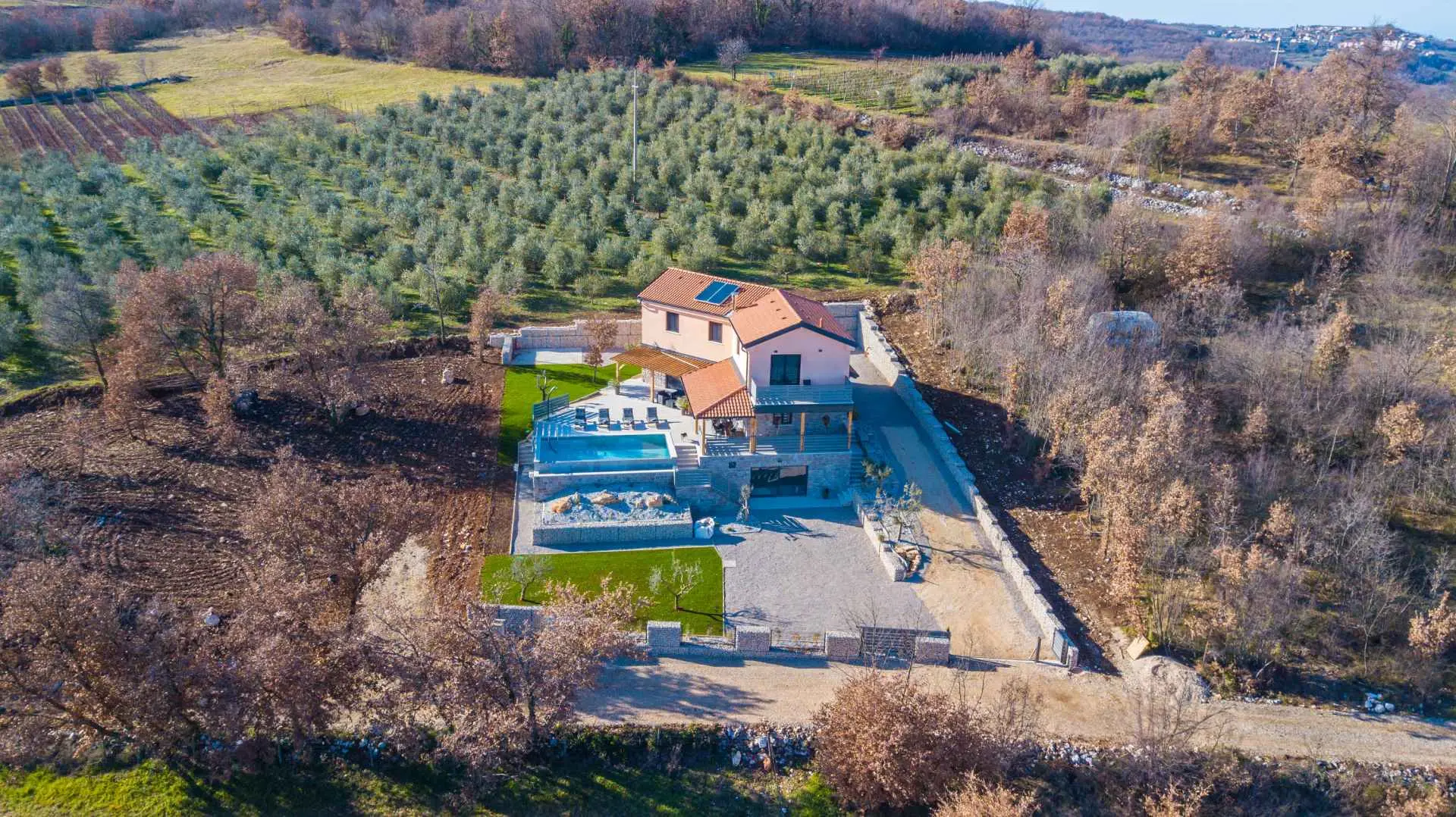 Die Villa Dominika liegt in Zentralistrien, in der Nähe des kleinen Dorfes Pahovići, unweit von Motovun. Sie ist abgeschieden, umgeben von Olivenhainen und Wäldern. Diese attraktive Villa bietet einen herrlichen Blick auf Motovun und das Gebirge Učka. Das Grundstück erstreckt sich über 1000 m², ist komplett eingezäunt und für Haustiere geeignet. Von jeder Ecke der Außenterrasse bietet sich ein unglaublicher Blick auf das umliegende Grün und den Olivenhain, der durch ein Gefühl der Ruhe und Stille ergänzt wird – genau das, was Sie für einen perfekten Urlaub brauchen. Die Umgebung des Hauses bietet Möglichkeiten zum Wandern, Radfahren entlang des berühmten Touristenpfades Parenzana sowie zum Pilze- und Spargelsammeln. Die 250 m² große Wohnfläche umfasst ein geräumiges Wohnzimmer, das in einen Entspannungsbereich und eine Bar mit Weinen lokaler Winzer unterteilt ist. Beide Bereiche des Wohnzimmers öffnen sich zu einer Terrasse, einem Sonnendeck und einem 32 m² großen Infinity-Pool mit herrlichem Blick in die Natur. Der Essbereich, der mit der Küche verbunden ist, führt zu einer großen überdachten Terrasse mit Sitzecke, Essbereich und Außengrill – ideal für geselliges Beisammensein im Freien. Im ersten Stock befinden sich drei Schlafzimmer, jedes mit eigenem Bad für absolute Privatsphäre. Zwei Zimmer sind mit Doppelbetten ausgestattet, das dritte mit zwei Einzelbetten. Eines der Schlafzimmer verfügt über eine Terrasse mit herrlichem Blick auf Motovun und das Učka-Gebirge.