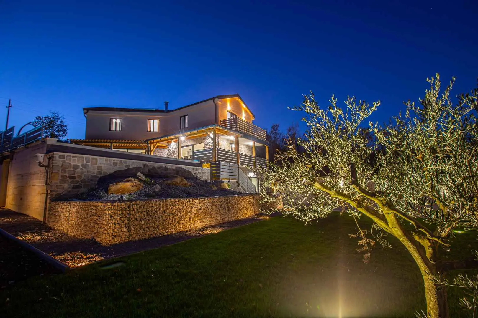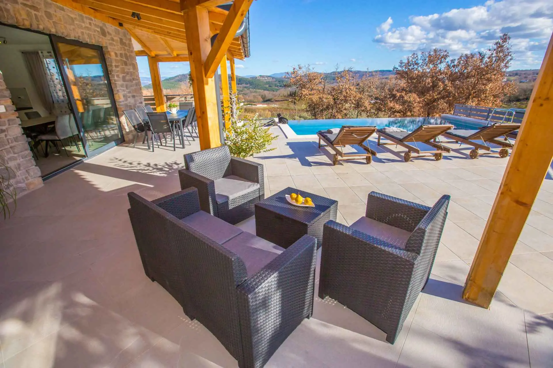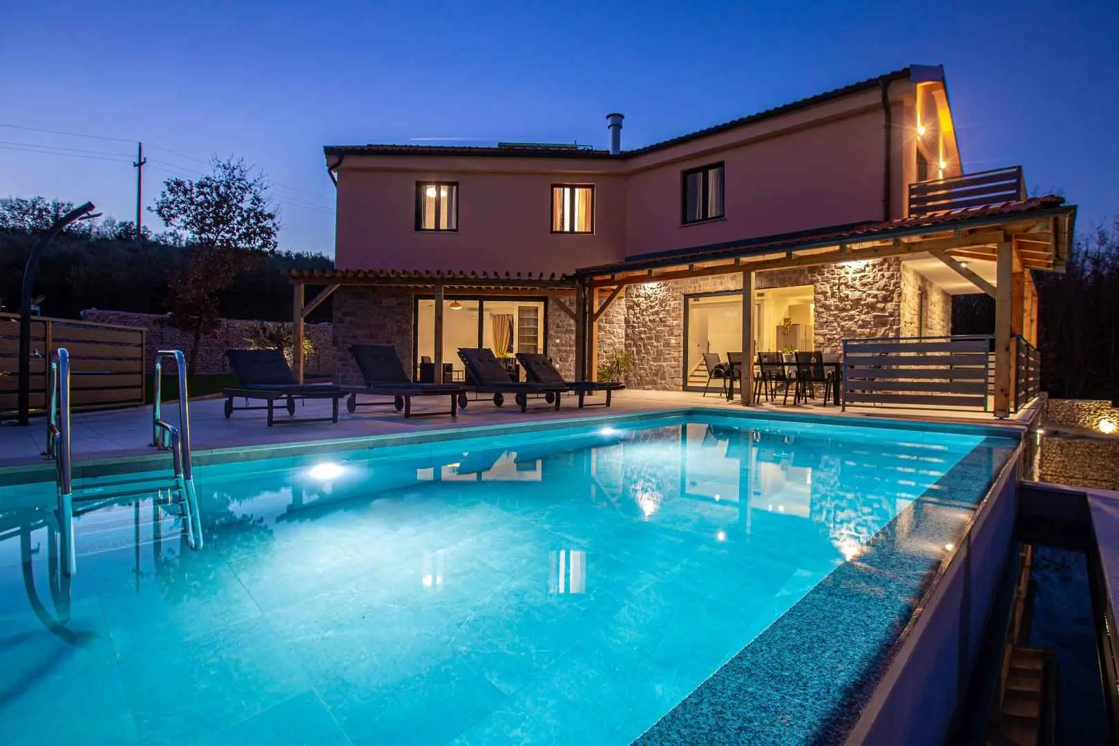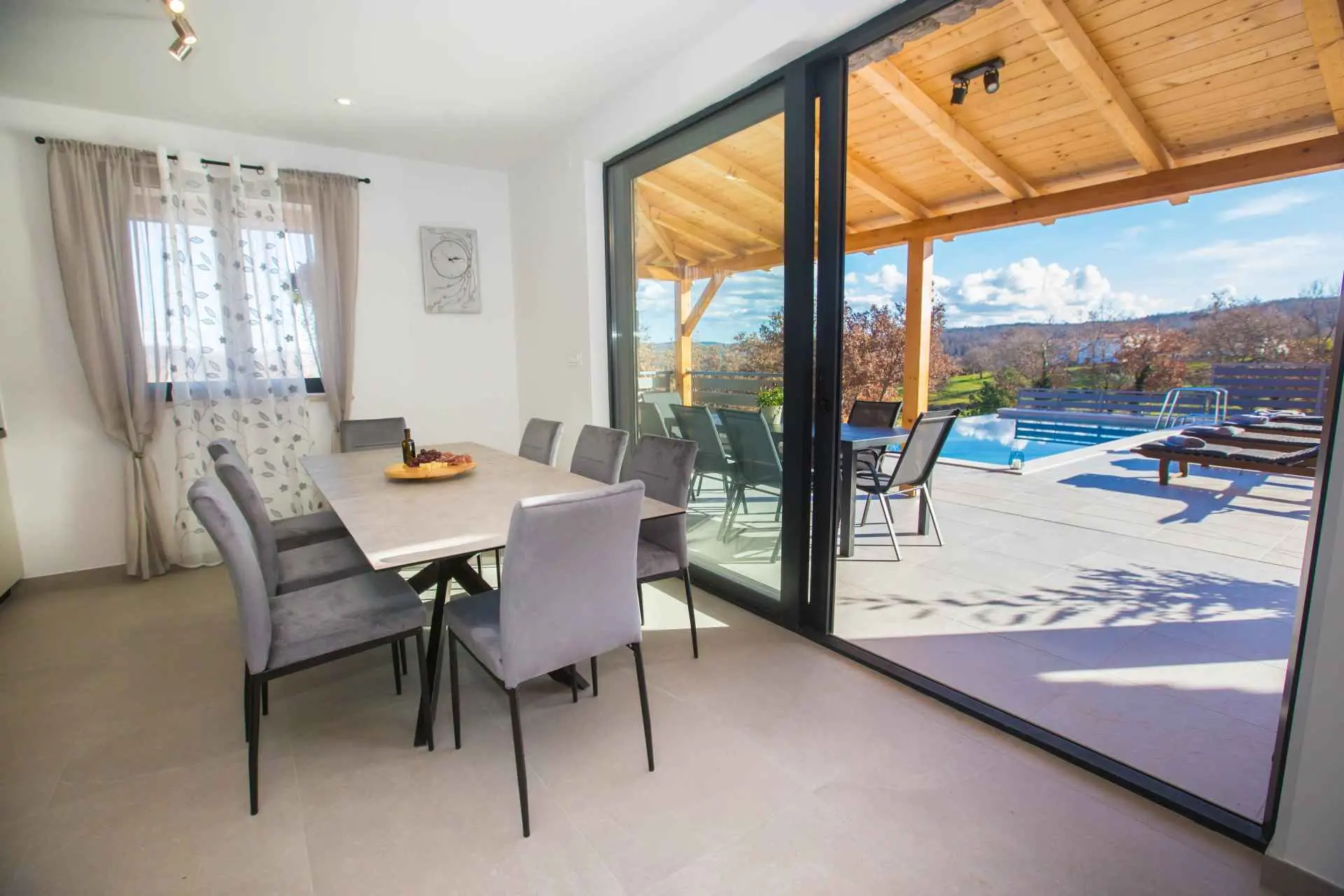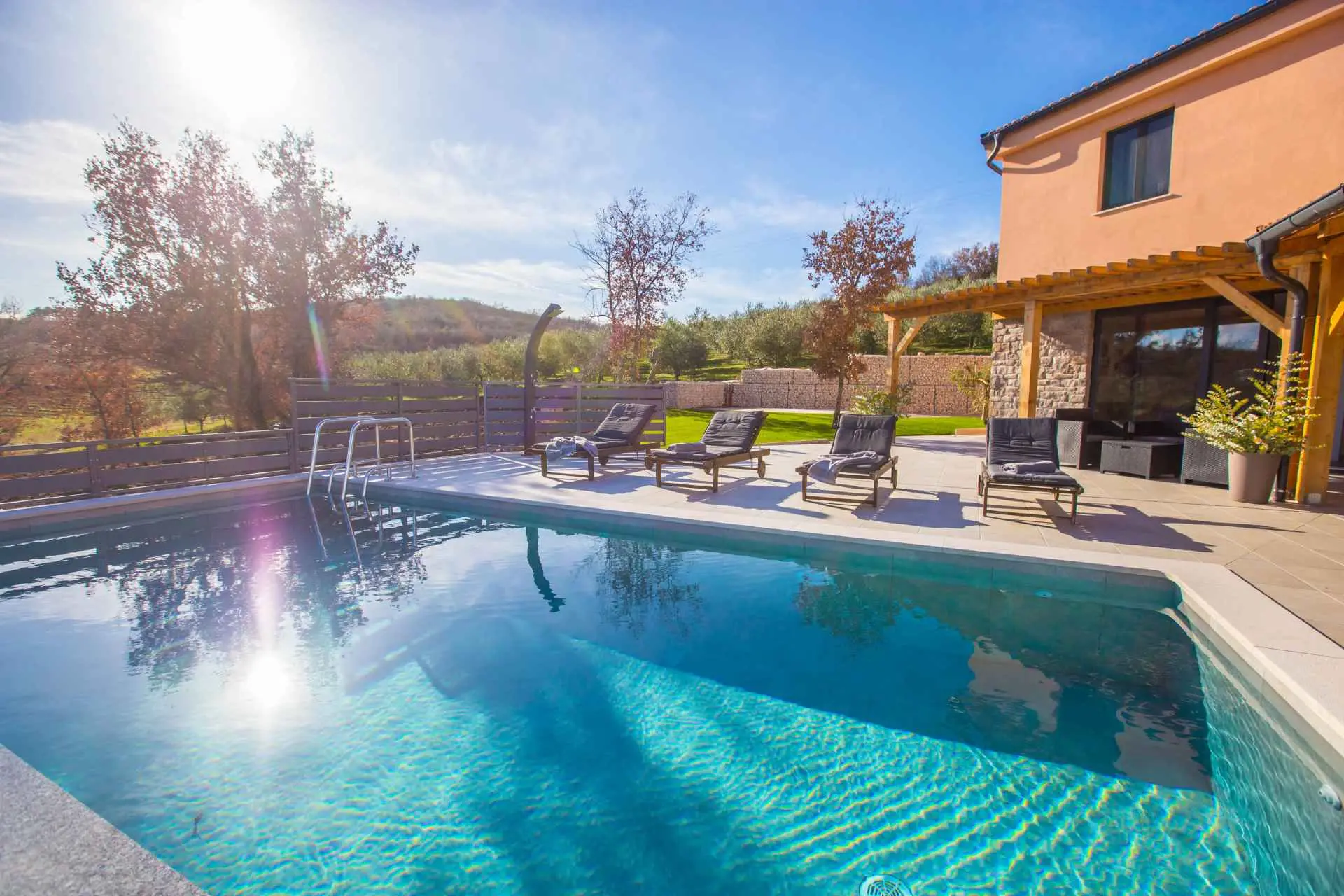 Die Villa Dominika liegt in Zentralistrien, in der Nähe des kleinen Dorfes Pahovići, unweit von Motovun. Sie ist abgeschieden, umgeben von Olivenhainen und Wäldern. Diese attraktive Villa bietet einen herrlichen Blick auf Motovun und das Gebirge Učka. Das Grundstück erstreckt sich über 1000 m², ist komplett eingezäunt und für Haustiere geeignet. Von jeder Ecke der Außenterrasse bietet sich ein unglaublicher Blick auf das umliegende Grün und den Olivenhain, der durch ein Gefühl der Ruhe und Stille ergänzt wird – genau das, was Sie für einen perfekten Urlaub brauchen. Die Umgebung des Hauses bietet Möglichkeiten zum Wandern, Radfahren entlang des berühmten Touristenpfades Parenzana sowie zum Pilze- und Spargelsammeln. Die 250 m² große Wohnfläche umfasst ein geräumiges Wohnzimmer, das in einen Entspannungsbereich und eine Bar mit Weinen lokaler Winzer unterteilt ist. Beide Bereiche des Wohnzimmers öffnen sich zu einer Terrasse, einem Sonnendeck und einem 32 m² großen Infinity-Pool mit herrlichem Blick in die Natur. Der Essbereich, der mit der Küche verbunden ist, führt zu einer großen überdachten Terrasse mit Sitzecke, Essbereich und Außengrill – ideal für geselliges Beisammensein im Freien. Im ersten Stock befinden sich drei Schlafzimmer, jedes mit eigenem Bad für absolute Privatsphäre. Zwei Zimmer sind mit Doppelbetten ausgestattet, das dritte mit zwei Einzelbetten. Eines der Schlafzimmer verfügt über eine Terrasse mit herrlichem Blick auf Motovun und das Učka-Gebirge.