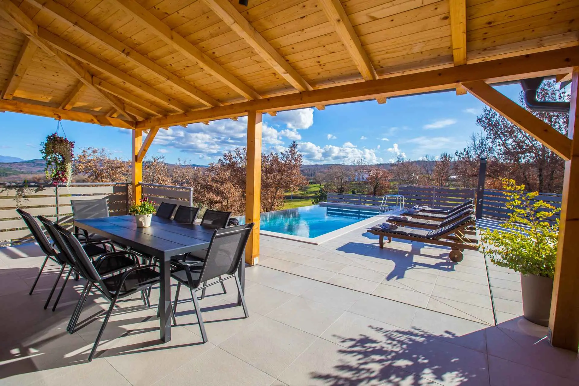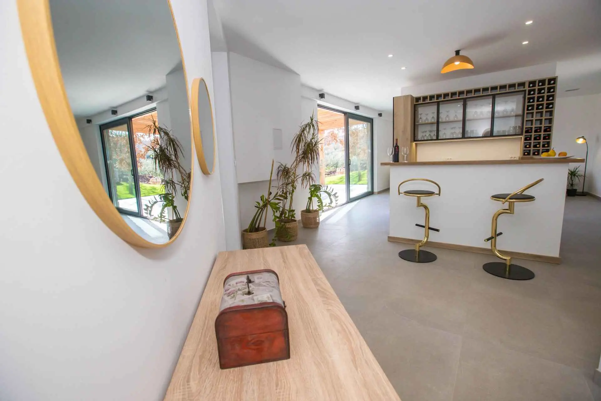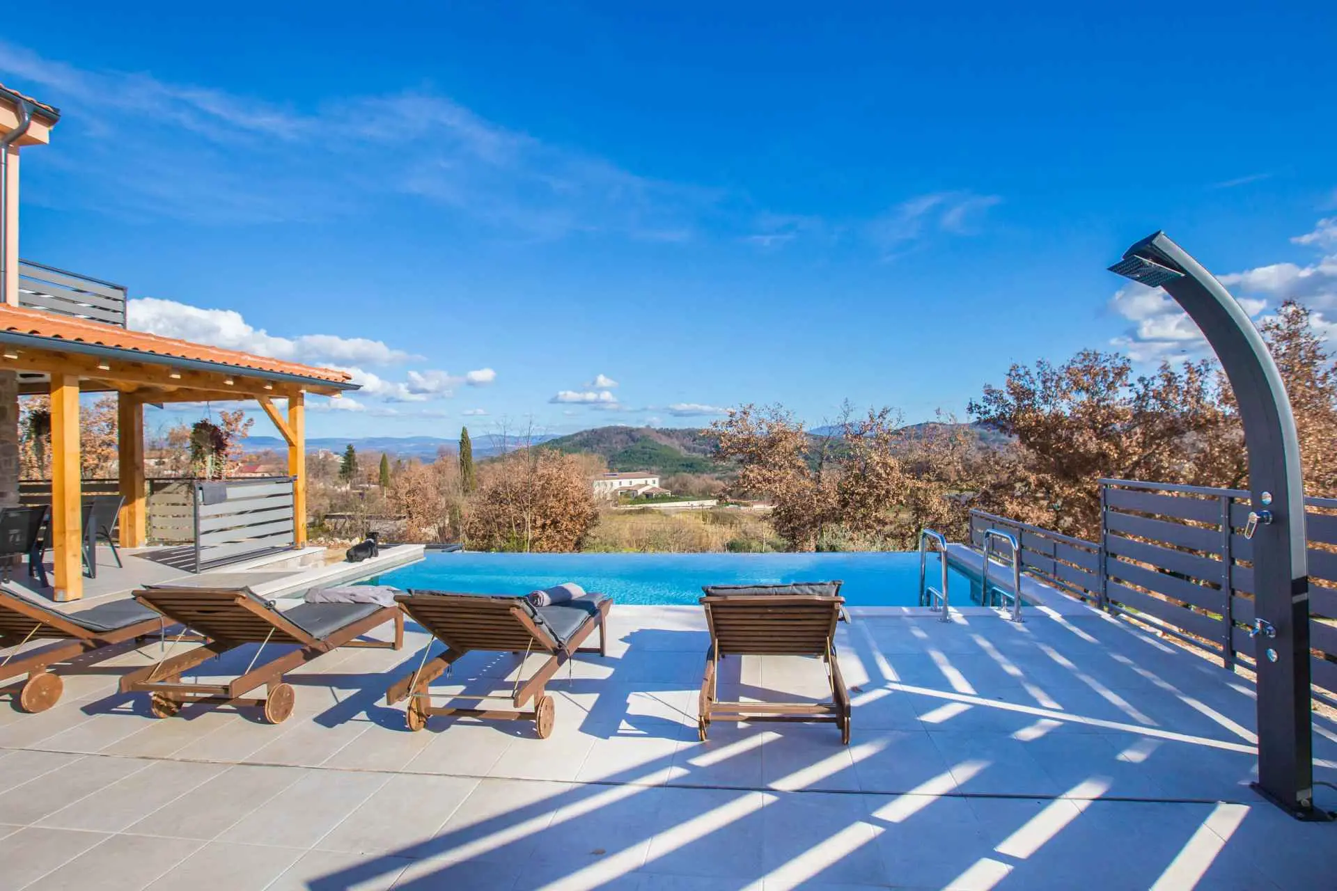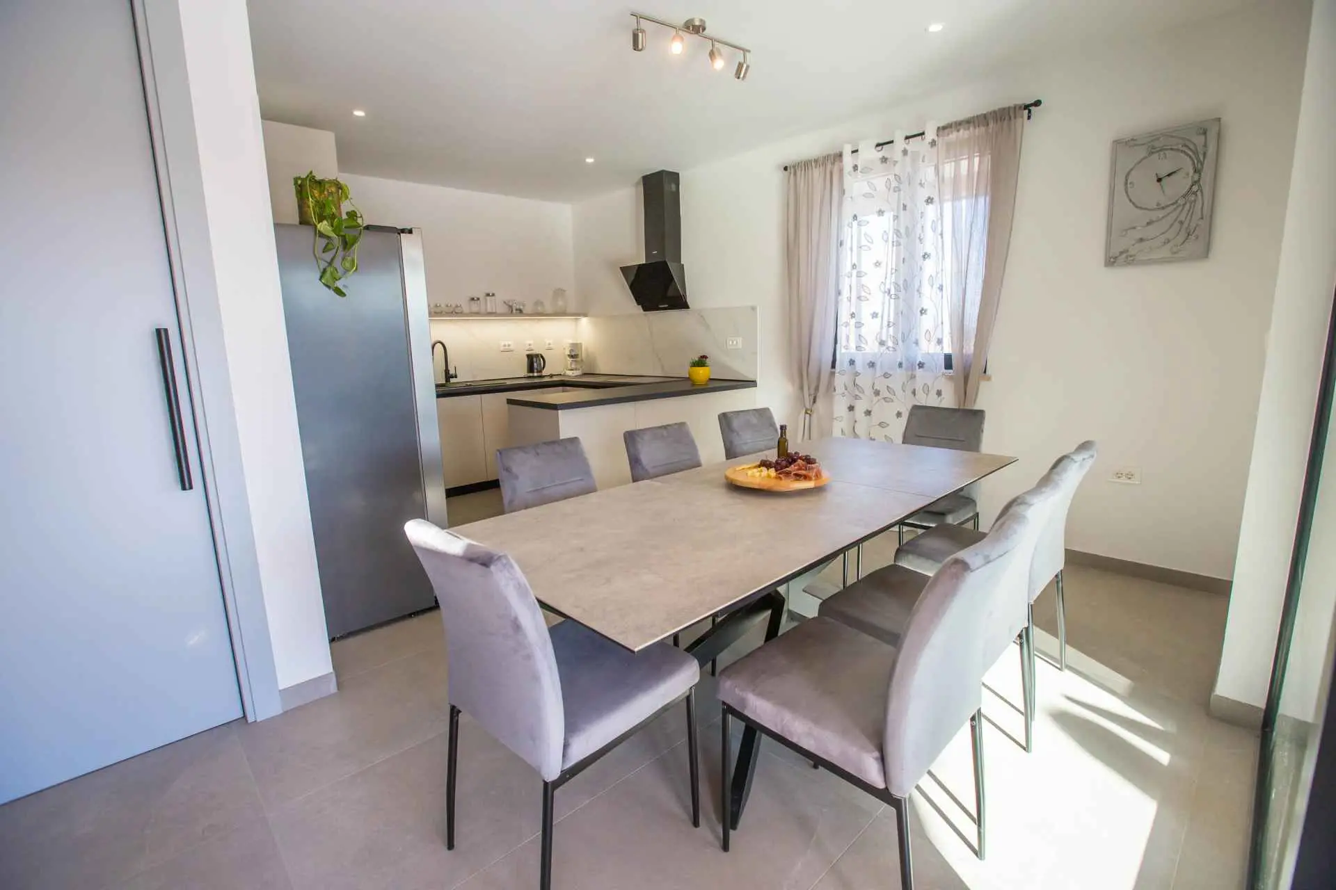 Die Villa Dominika liegt in Zentralistrien, in der Nähe des kleinen Dorfes Pahovići, unweit von Motovun. Sie ist abgeschieden, umgeben von Olivenhainen und Wäldern. Diese attraktive Villa bietet einen herrlichen Blick auf Motovun und das Gebirge Učka. Das Grundstück erstreckt sich über 1000 m², ist komplett eingezäunt und für Haustiere geeignet. Von jeder Ecke der Außenterrasse bietet sich ein unglaublicher Blick auf das umliegende Grün und den Olivenhain, der durch ein Gefühl der Ruhe und Stille ergänzt wird – genau das, was Sie für einen perfekten Urlaub brauchen. Die Umgebung des Hauses bietet Möglichkeiten zum Wandern, Radfahren entlang des berühmten Touristenpfades Parenzana sowie zum Pilze- und Spargelsammeln. Die 250 m² große Wohnfläche umfasst ein geräumiges Wohnzimmer, das in einen Entspannungsbereich und eine Bar mit Weinen lokaler Winzer unterteilt ist. Beide Bereiche des Wohnzimmers öffnen sich zu einer Terrasse, einem Sonnendeck und einem 32 m² großen Infinity-Pool mit herrlichem Blick in die Natur. Der Essbereich, der mit der Küche verbunden ist, führt zu einer großen überdachten Terrasse mit Sitzecke, Essbereich und Außengrill – ideal für geselliges Beisammensein im Freien. Im ersten Stock befinden sich drei Schlafzimmer, jedes mit eigenem Bad für absolute Privatsphäre. Zwei Zimmer sind mit Doppelbetten ausgestattet, das dritte mit zwei Einzelbetten. Eines der Schlafzimmer verfügt über eine Terrasse mit herrlichem Blick auf Motovun und das Učka-Gebirge.