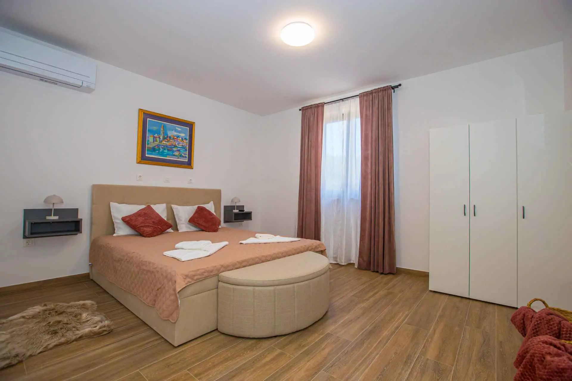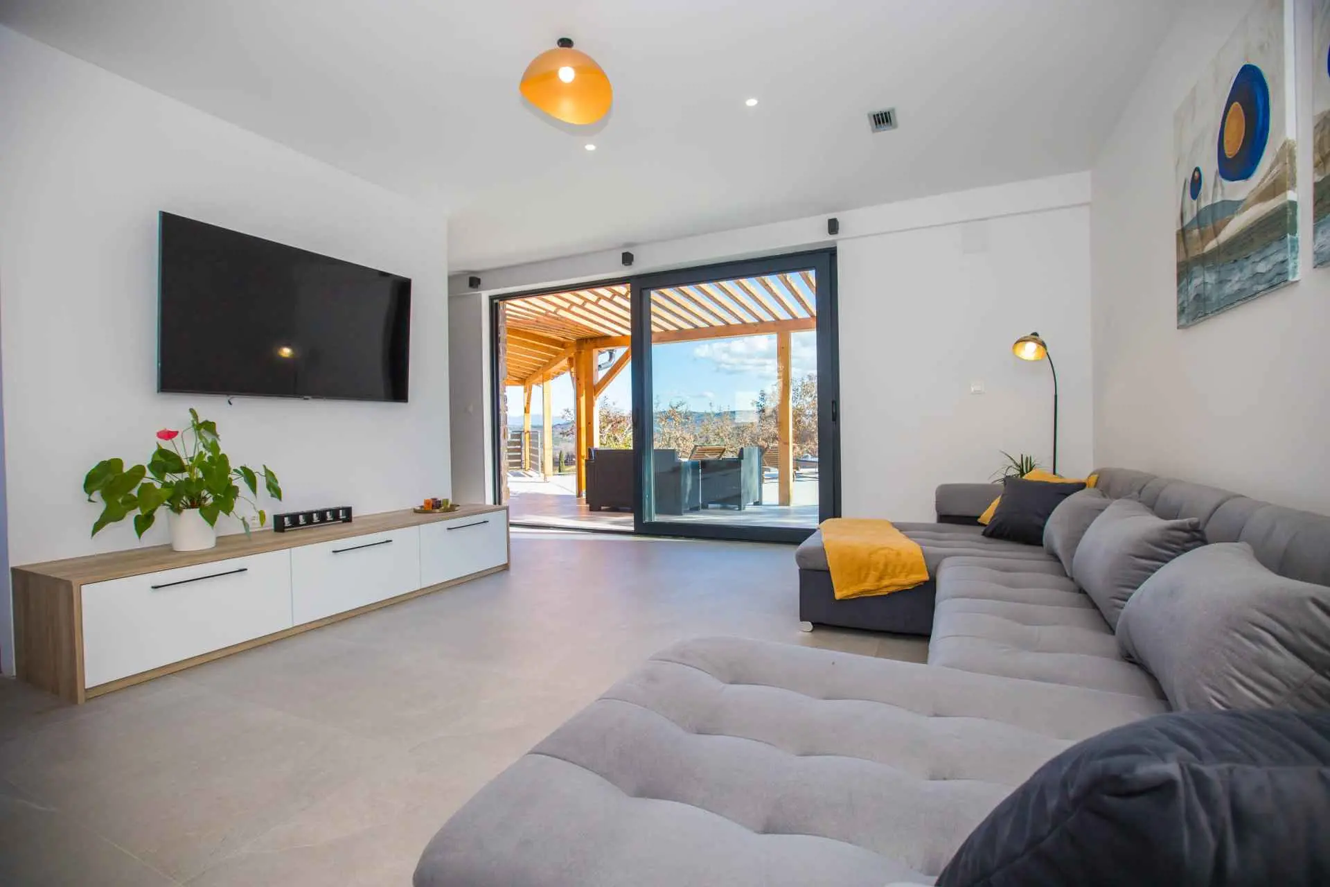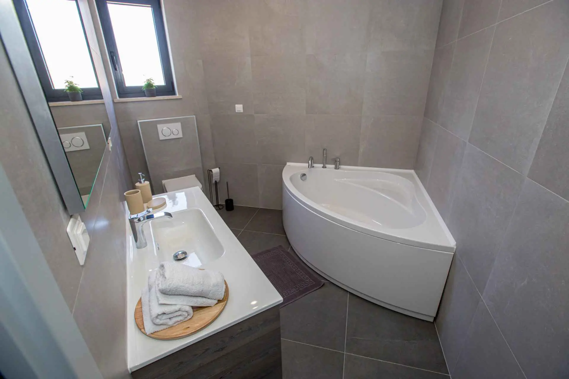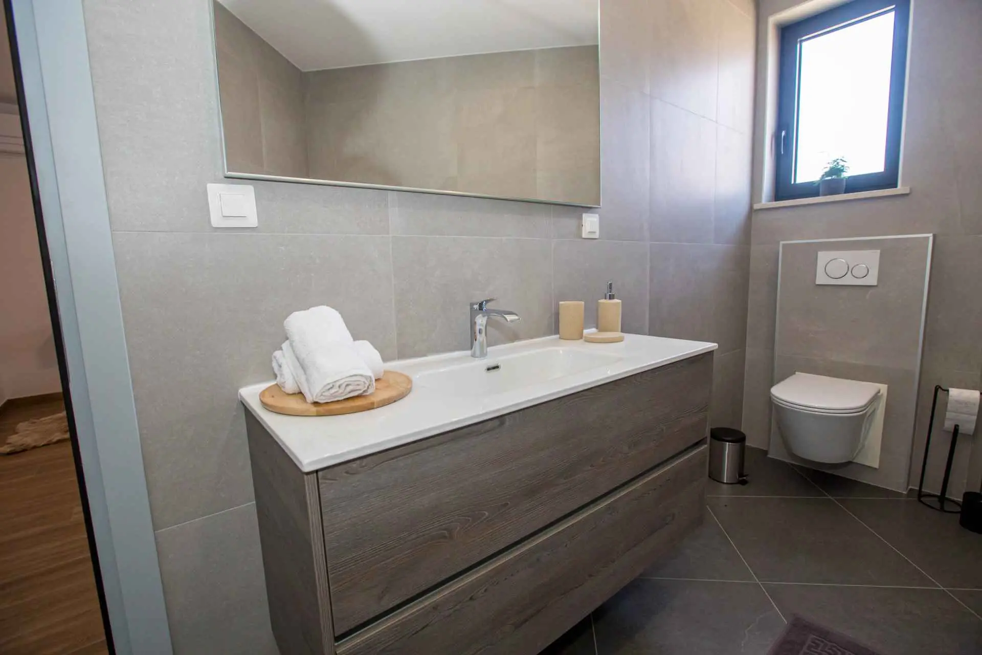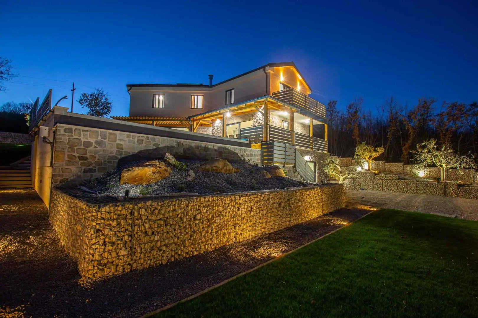 Die Villa Dominika liegt in Zentralistrien, in der Nähe des kleinen Dorfes Pahovići, unweit von Motovun. Sie ist abgeschieden, umgeben von Olivenhainen und Wäldern. Diese attraktive Villa bietet einen herrlichen Blick auf Motovun und das Gebirge Učka. Das Grundstück erstreckt sich über 1000 m², ist komplett eingezäunt und für Haustiere geeignet. Von jeder Ecke der Außenterrasse bietet sich ein unglaublicher Blick auf das umliegende Grün und den Olivenhain, der durch ein Gefühl der Ruhe und Stille ergänzt wird – genau das, was Sie für einen perfekten Urlaub brauchen. Die Umgebung des Hauses bietet Möglichkeiten zum Wandern, Radfahren entlang des berühmten Touristenpfades Parenzana sowie zum Pilze- und Spargelsammeln. Die 250 m² große Wohnfläche umfasst ein geräumiges Wohnzimmer, das in einen Entspannungsbereich und eine Bar mit Weinen lokaler Winzer unterteilt ist. Beide Bereiche des Wohnzimmers öffnen sich zu einer Terrasse, einem Sonnendeck und einem 32 m² großen Infinity-Pool mit herrlichem Blick in die Natur. Der Essbereich, der mit der Küche verbunden ist, führt zu einer großen überdachten Terrasse mit Sitzecke, Essbereich und Außengrill – ideal für geselliges Beisammensein im Freien. Im ersten Stock befinden sich drei Schlafzimmer, jedes mit eigenem Bad für absolute Privatsphäre. Zwei Zimmer sind mit Doppelbetten ausgestattet, das dritte mit zwei Einzelbetten. Eines der Schlafzimmer verfügt über eine Terrasse mit herrlichem Blick auf Motovun und das Učka-Gebirge.