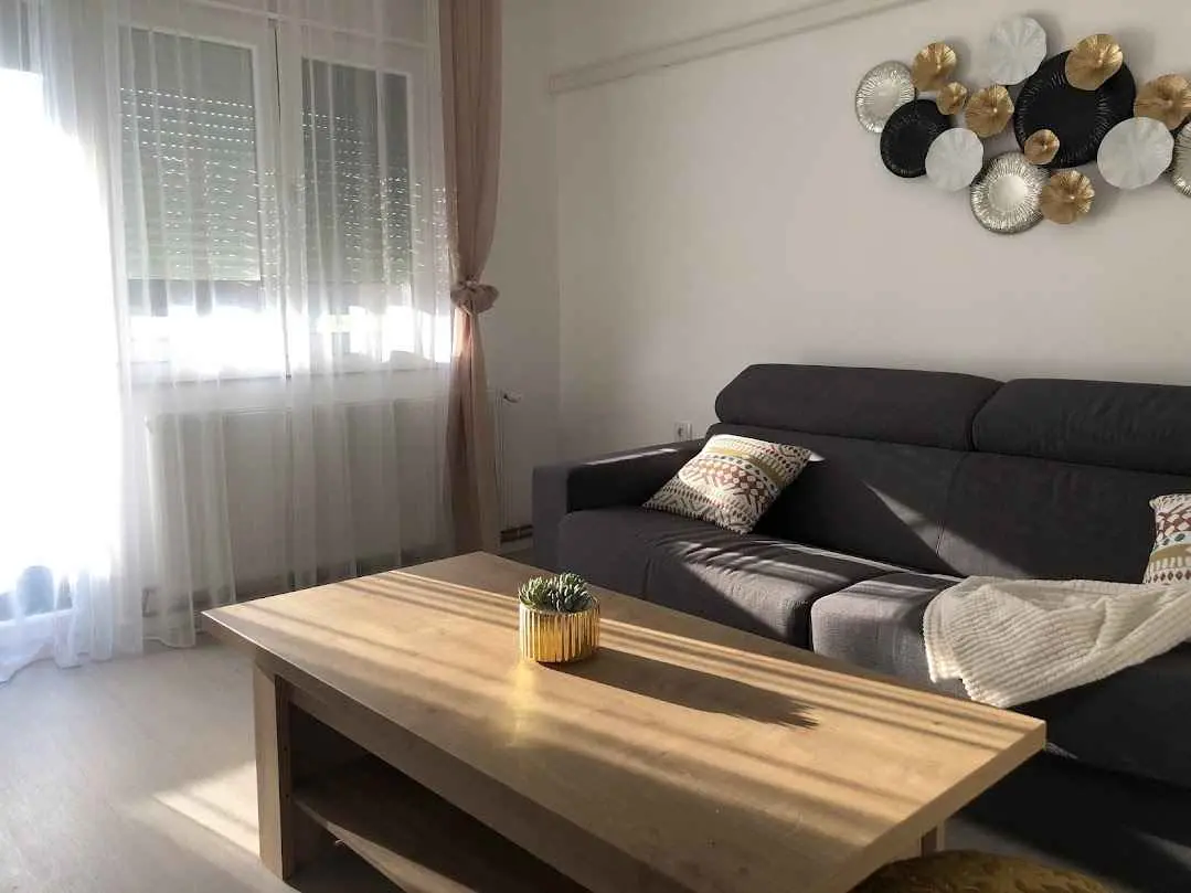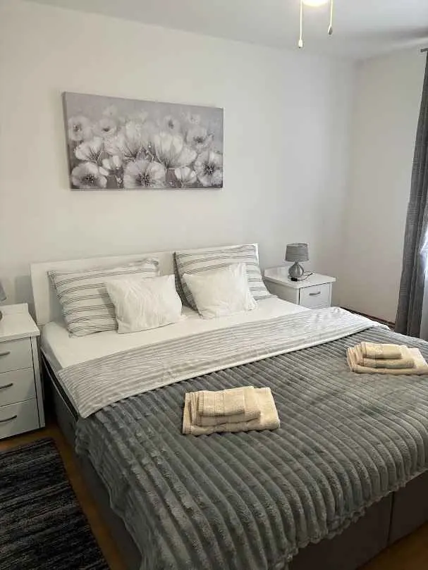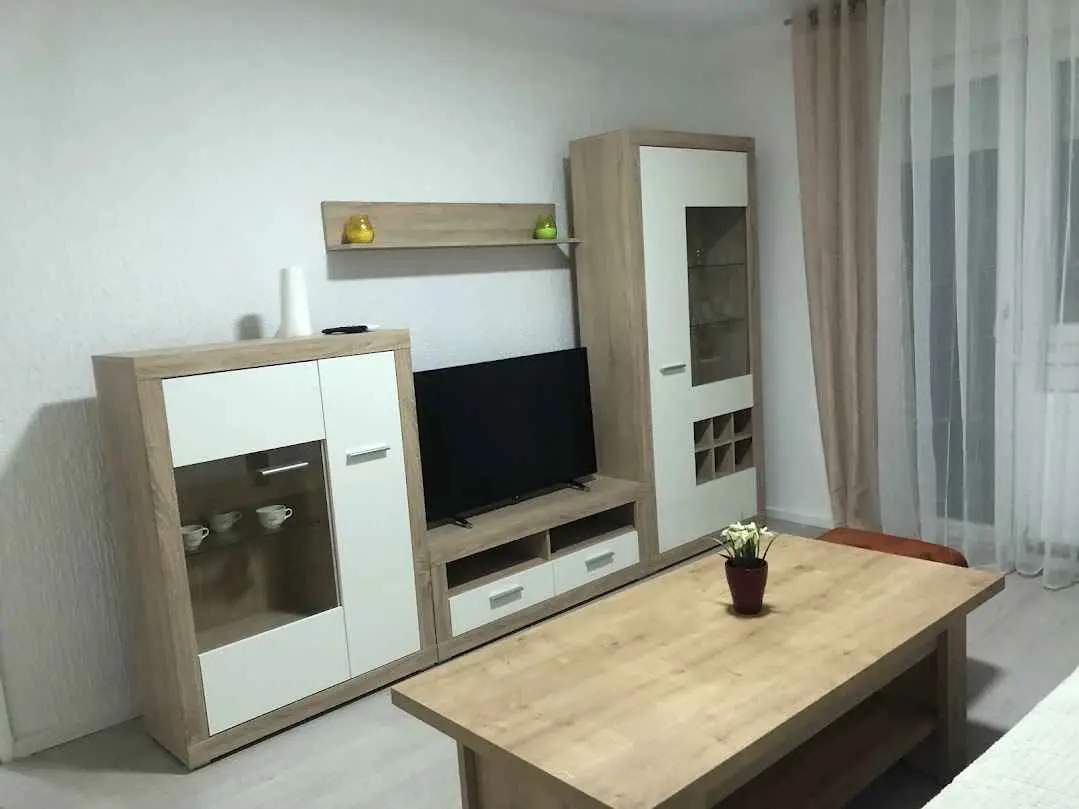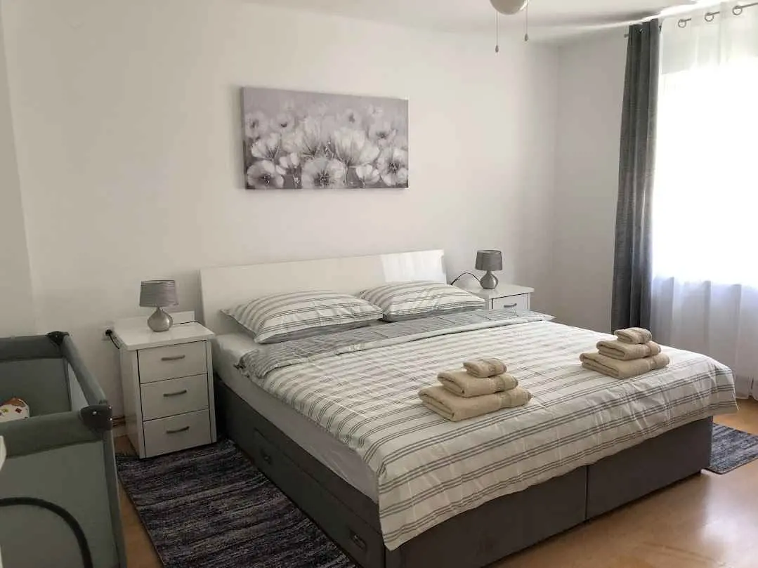 Die Wohnung befindet sich im zweiten Stock eines Wohnhauses in der Nähe des Zentrums, in einer ruhigen Gegend. Der Zugang zum Gebäude erfolgt über einen Code, und zum Betreten der Wohnung haben wir einen Behälter mit einem Schlüssel, ebenfalls mit einem Code. Zwei Zimmer, ein Schlafzimmer mit einem großen Kingsize-Bett und einem Kinderbett und ein Wohnzimmer mit einem Bett, das auf die Maße 160 x 200 erweitert werden kann. Esszimmer mit großem Tisch und Kühlschrank, Küche mit allem, was Sie für einen längeren Aufenthalt ohne Backofen benötigen, und ein Badezimmer mit allem Nötigen. Von der Küche aus haben Sie Zugang zu einem kleinen und vom Wohnzimmer aus zu einem größeren Balkon, auf dem Rauchen erlaubt ist, in den Zimmern jedoch nicht gestattet ist. Die Wohnung verfügt über Zentralheizung mit Heizkörpern, Klimaanlage, kostenloses und unbegrenztes Internet und alle Anweisungen zur Verwendung von Fernseher, Parkplatz, Beleuchtung ... Kleine Haustiere sind erlaubt, die an die Wohnung gewöhnt sind. Wenn Sie Ruhe und Entspannung suchen, kontaktieren Sie uns bitte. Familien mit Kindern, die die Hausregeln befolgen, sind besonders willkommen.