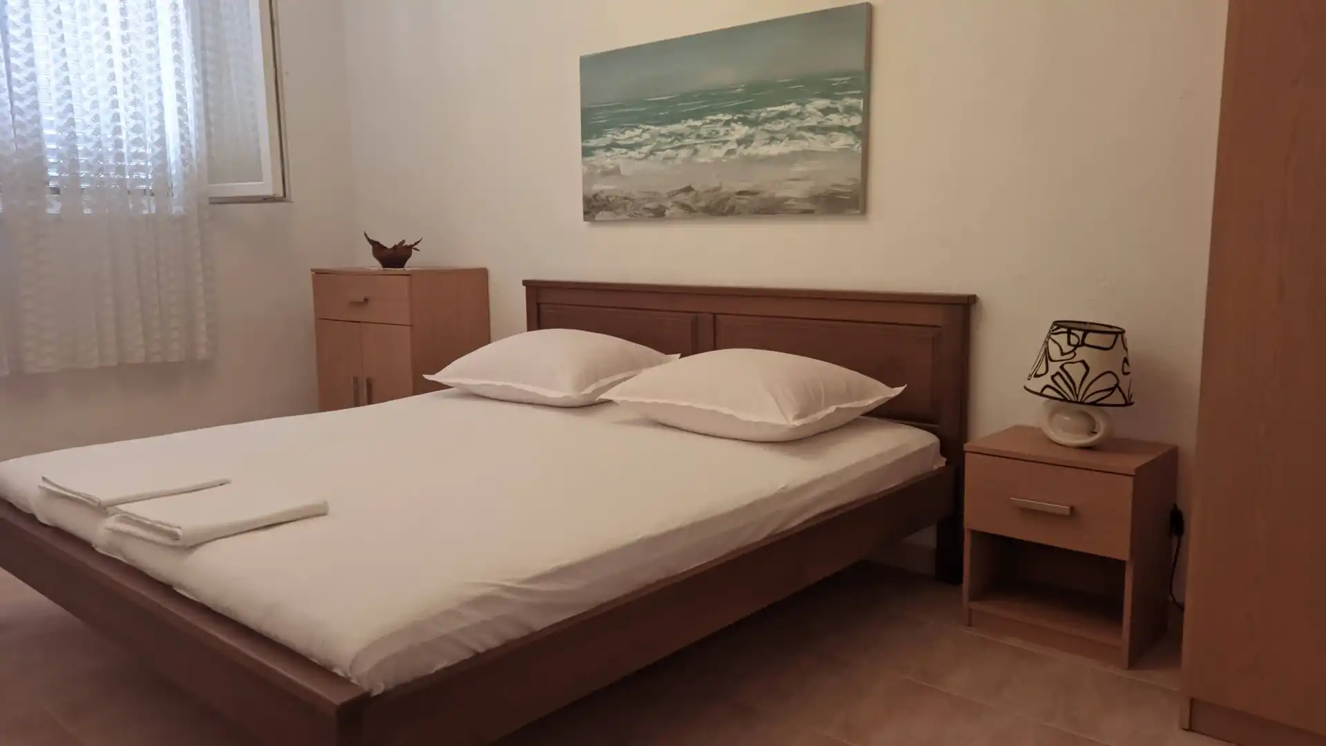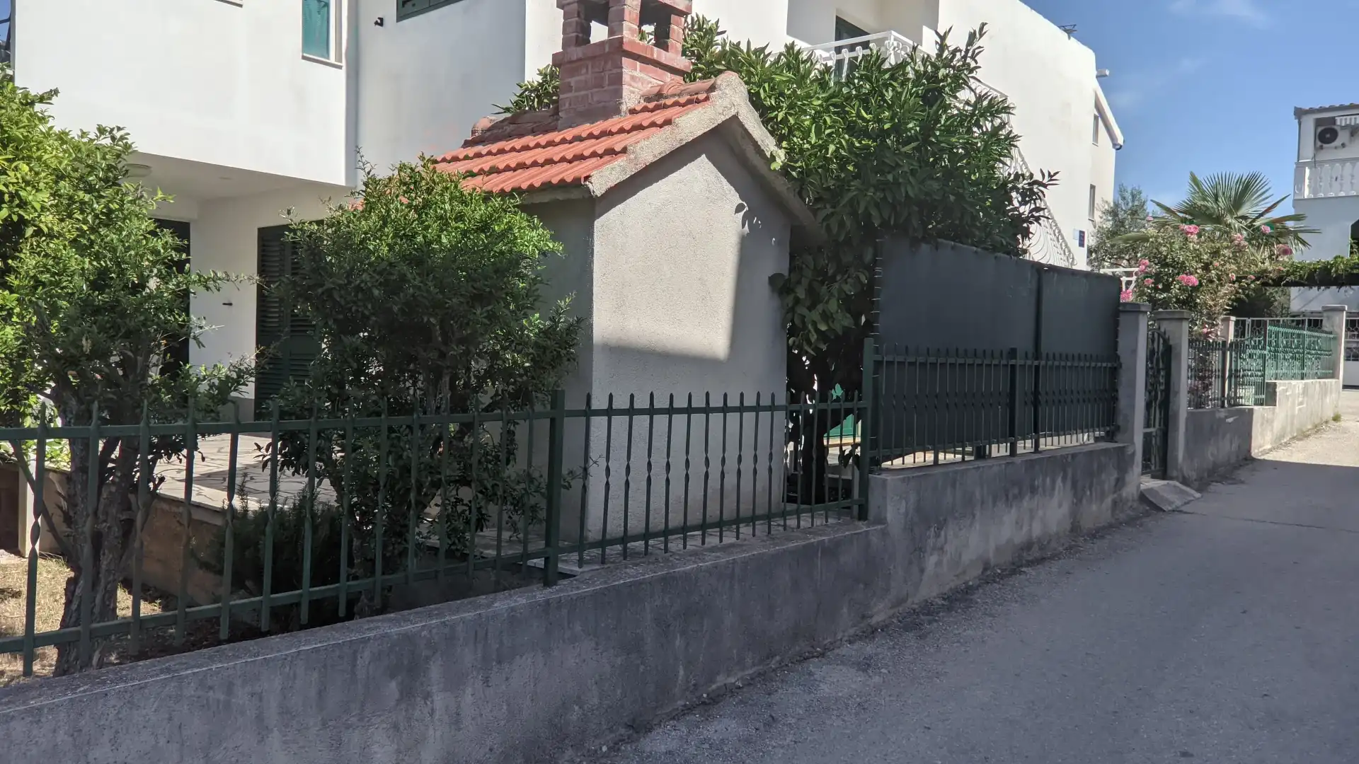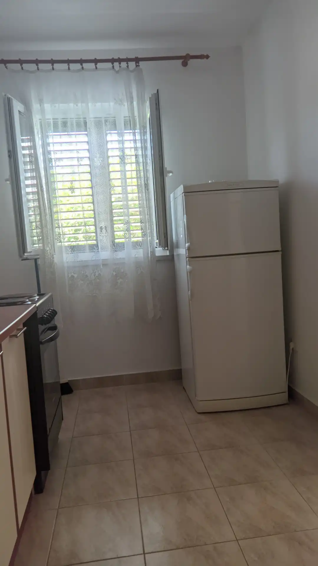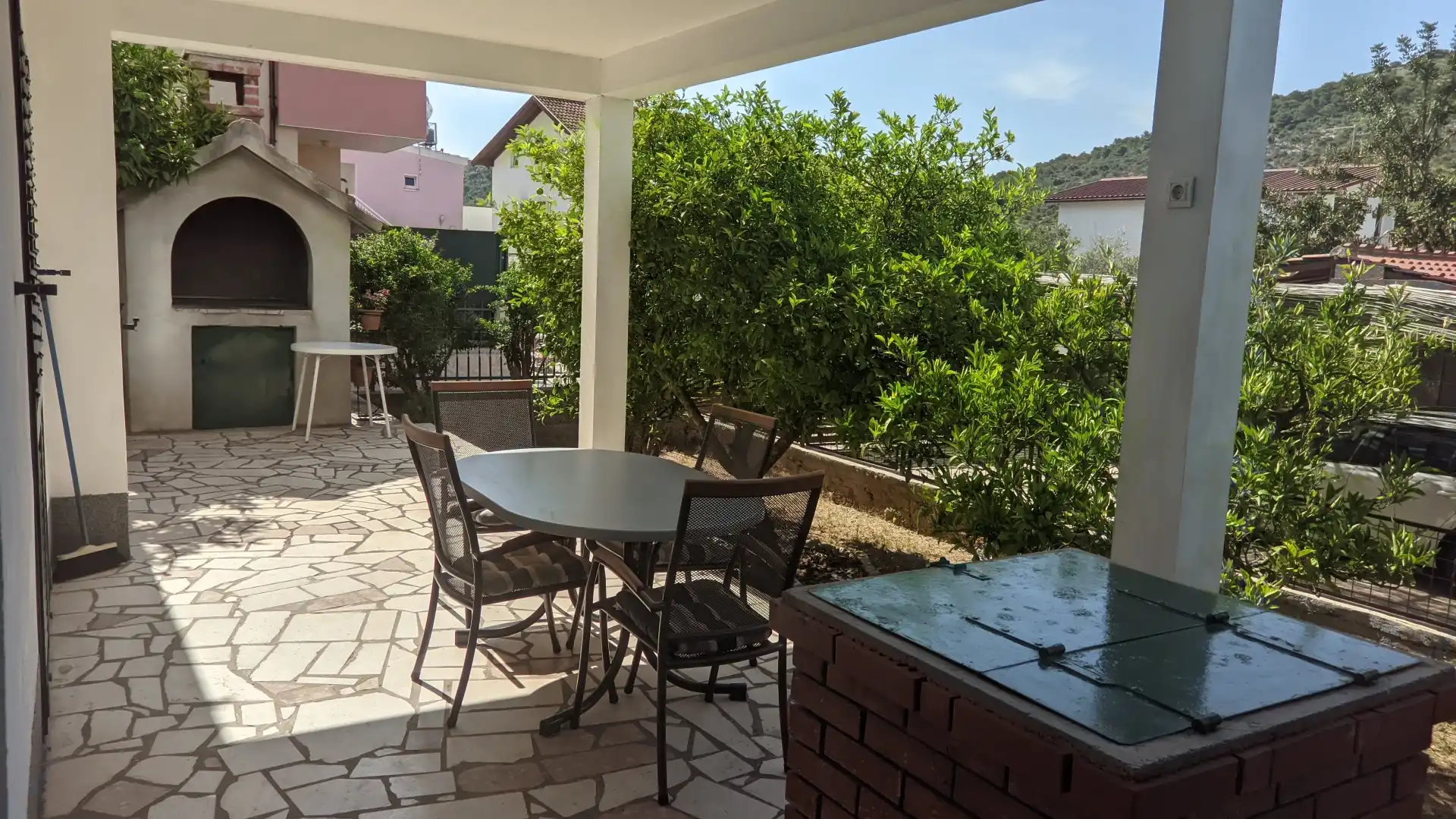 Rogoznica, Unterkunft in einem Einfamilienhaus im Stadtteil Stupin-Čeline II, nur 80 m vom Sandstrand entfernt. Die Wohnung befindet sich im Erdgeschoss und besteht aus zwei Schlafzimmern mit je zwei Betten (eines davon mit Doppelbett), einem Wohnzimmer mit zwei Zustellbetten, Sat-TV, WLAN, Bad und WC sowie einer Küche (Elektroherd, zwei Kühlschränke mit Gefrierfach). Terrasse und Kamin im Garten. Überdachter Parkplatz im Innenhof. Zimmertyp: 2 Schlafzimmer, max. Belegung: 4 Personen