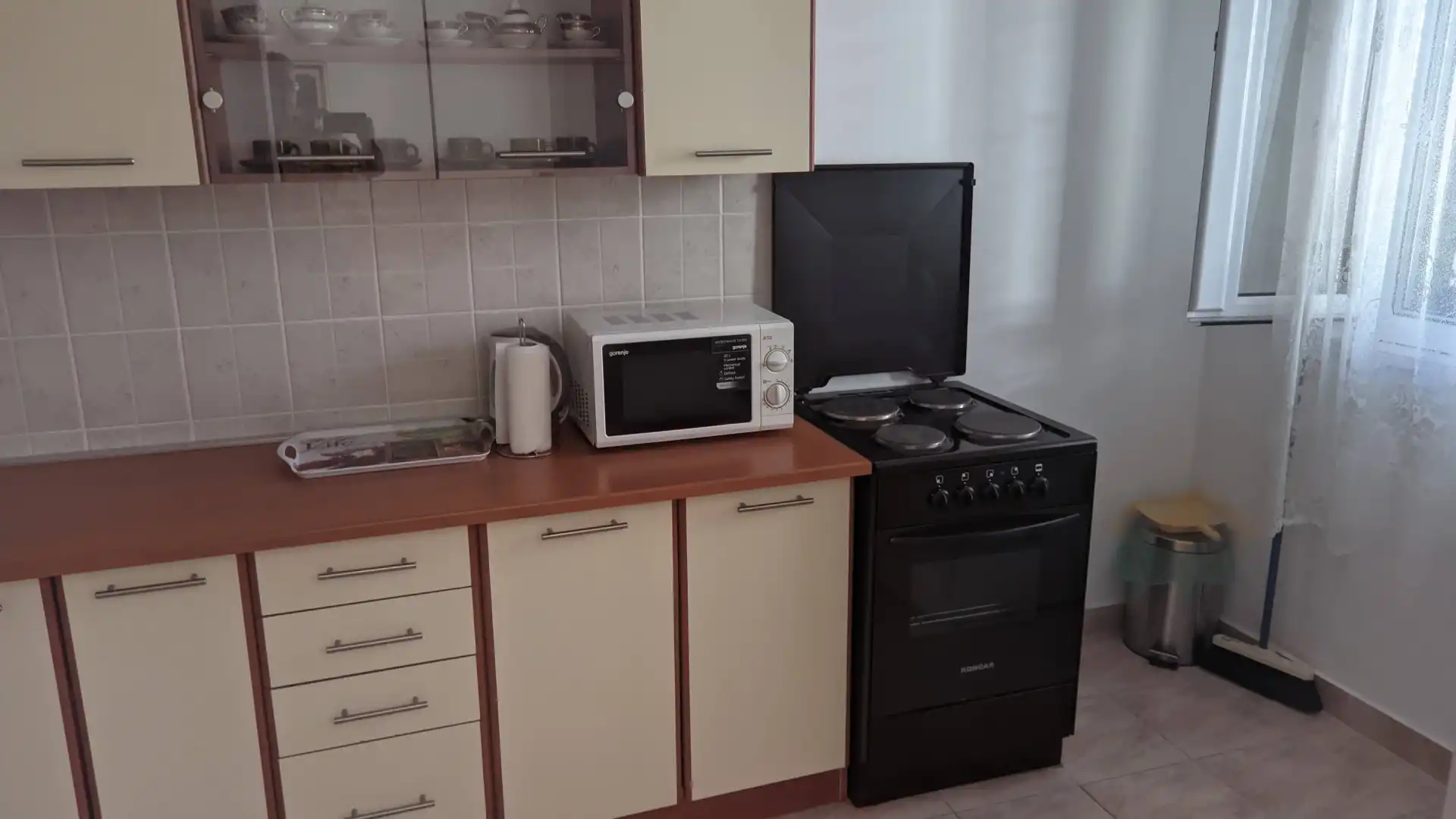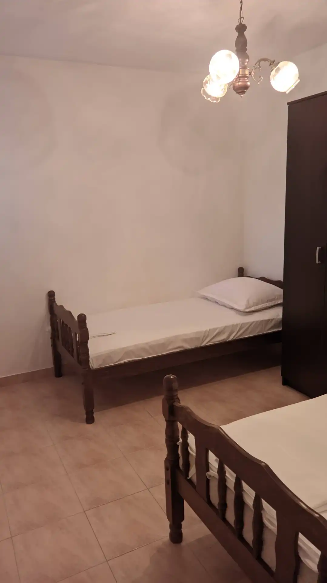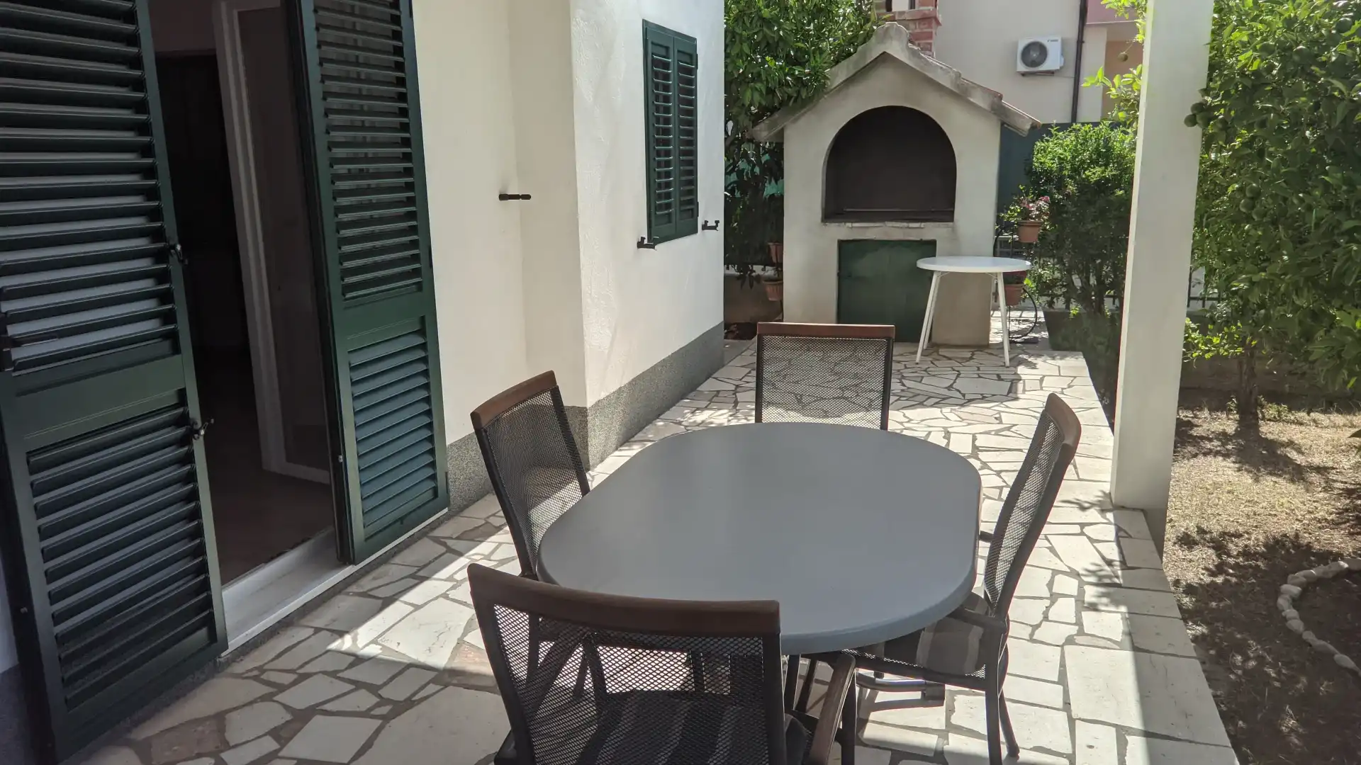 Rogoznica, Unterkunft in einem Einfamilienhaus im Stadtteil Stupin-Čeline II, nur 80 m vom Sandstrand entfernt. Die Wohnung befindet sich im Erdgeschoss und besteht aus zwei Schlafzimmern mit je zwei Betten (eines davon mit Doppelbett), einem Wohnzimmer mit zwei Zustellbetten, Sat-TV, WLAN, Bad und WC sowie einer Küche (Elektroherd, zwei Kühlschränke mit Gefrierfach). Terrasse und Kamin im Garten. Überdachter Parkplatz im Innenhof. Zimmertyp: 2 Schlafzimmer, max. Belegung: 4 Personen