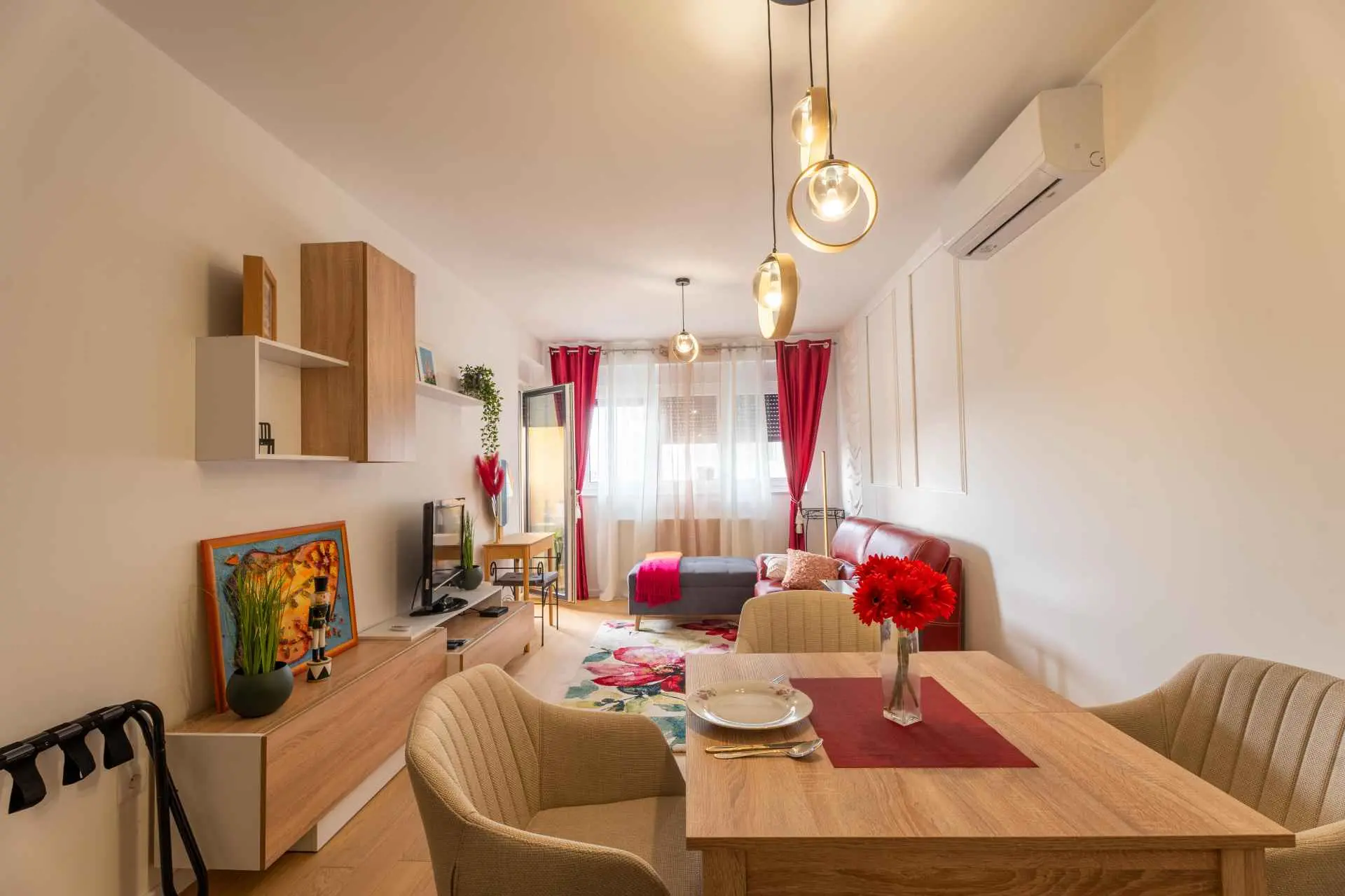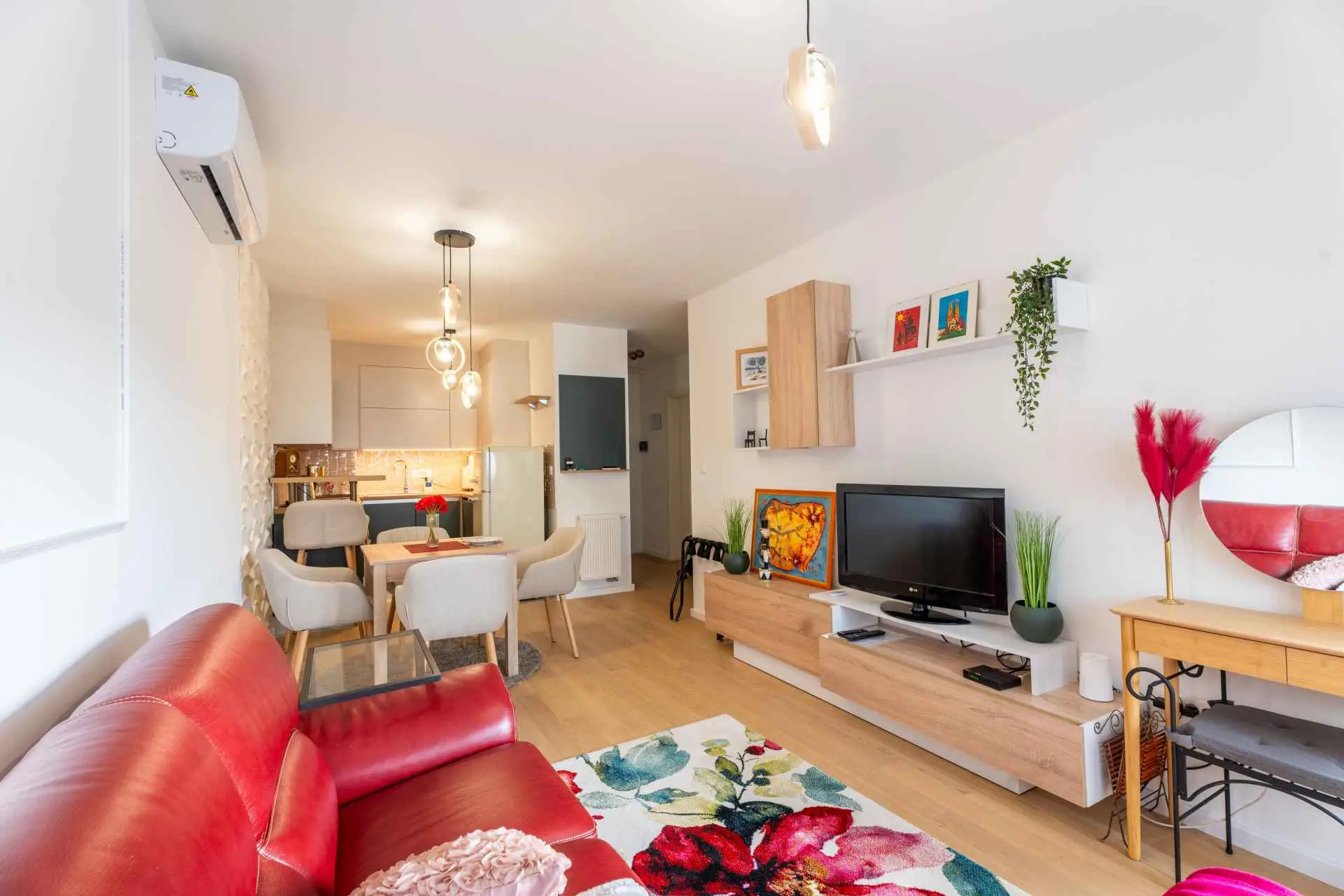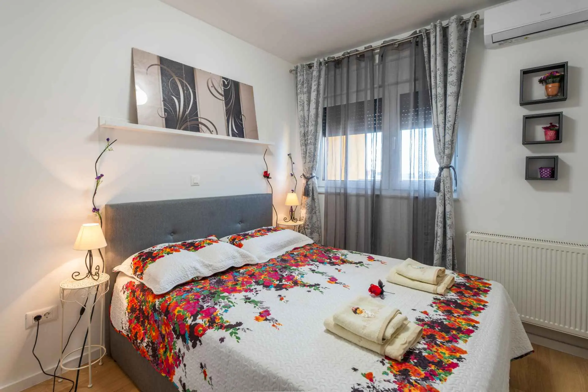 Das Apartment Anitushka befindet sich im neuen beliebten Teil von Velika Gorica - der Straße Andrije Kačića Miošića - in der Nähe eines Supermarkts, einer Apotheke, einer Kirche und einer Tankstelle. Die Größe von 45 m2 umfasst eine Küche mit Wohnzimmer und Esszimmer, eine Toilette mit Dusche, ein Schlafzimmer und einen Balkon mit einem angenehmen Ort zum Ausruhen und Kaffeetrinken. Sie befindet sich im 3. Stock eines Neubaus und ist als Wohnung 22 ausgewiesen. Das Schlafzimmer und die Wohnküche sind klimatisiert. Die Küche ist mit einem Backofen, einem Induktionskochfeld, einem Kühlschrank, einem Wasserkocher und einer Mikrowelle ausgestattet. Parkplätze sind vorhanden (im Freien und in der Garage).