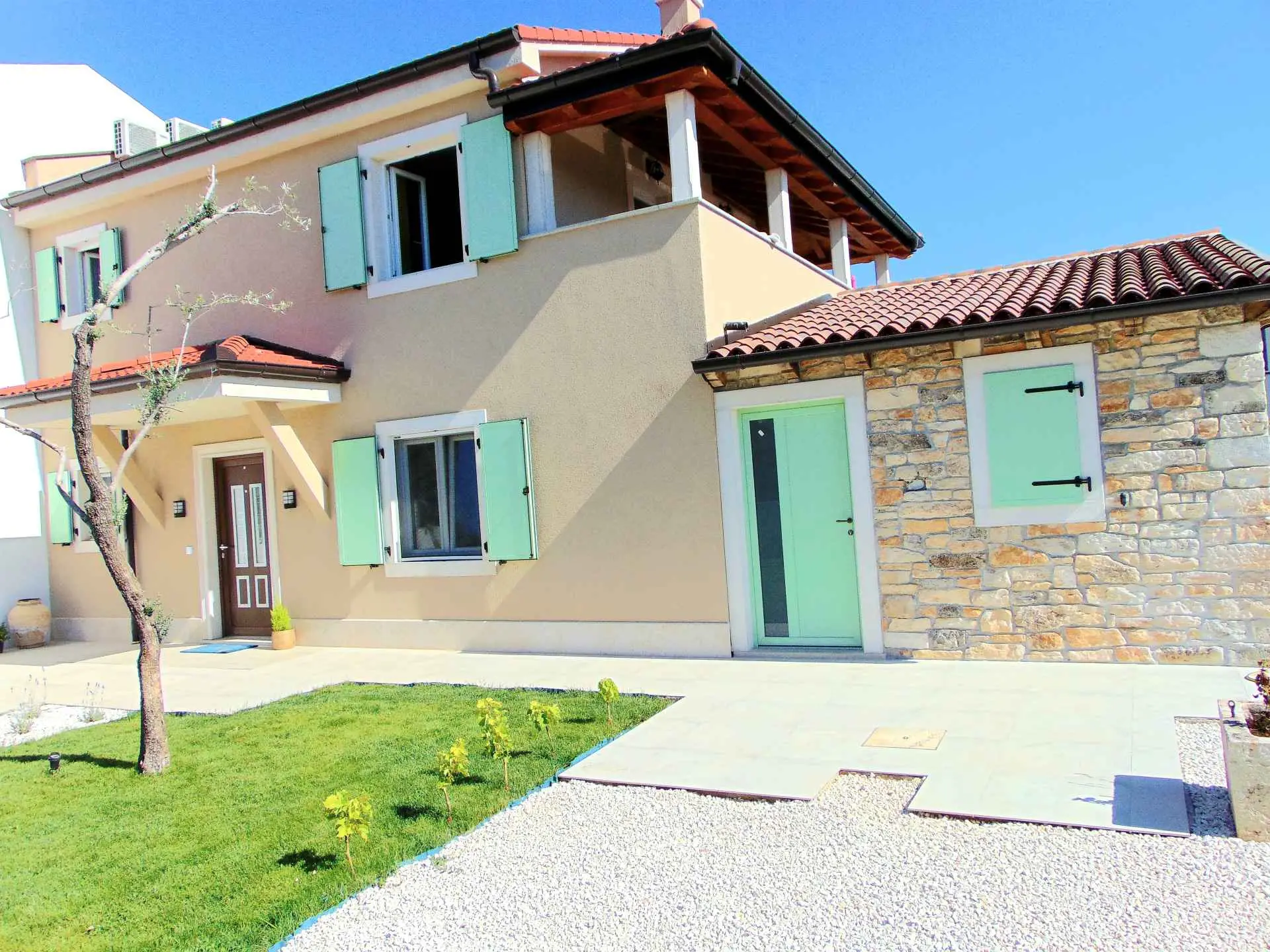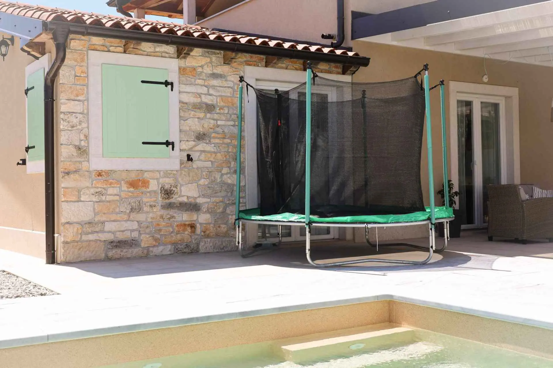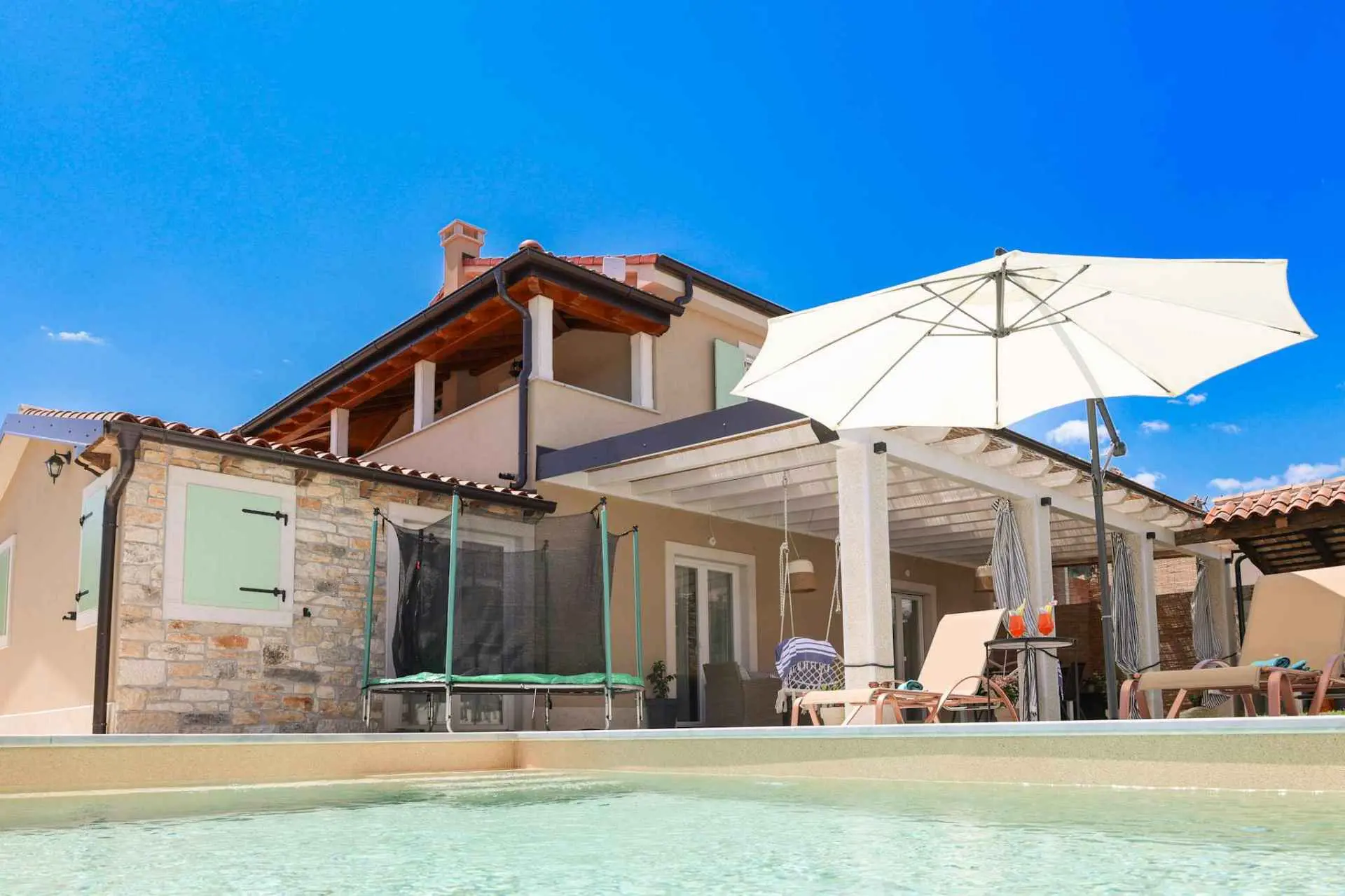 A wonderful holiday house in the fairytale town of Bale. The house has a fenced yard, a swimming pool with salt water, a children's playground, a summer kitchen with a fireplace and a gas grill, parking,... The house is fully equipped, all rooms are air-conditioned, 2 bedrooms and 2 bathrooms. In a quiet neighborhood, but only 300 m from the town center (shop, restaurant, bar, bakery, post office, doctor, pharmacy, ATM,...).