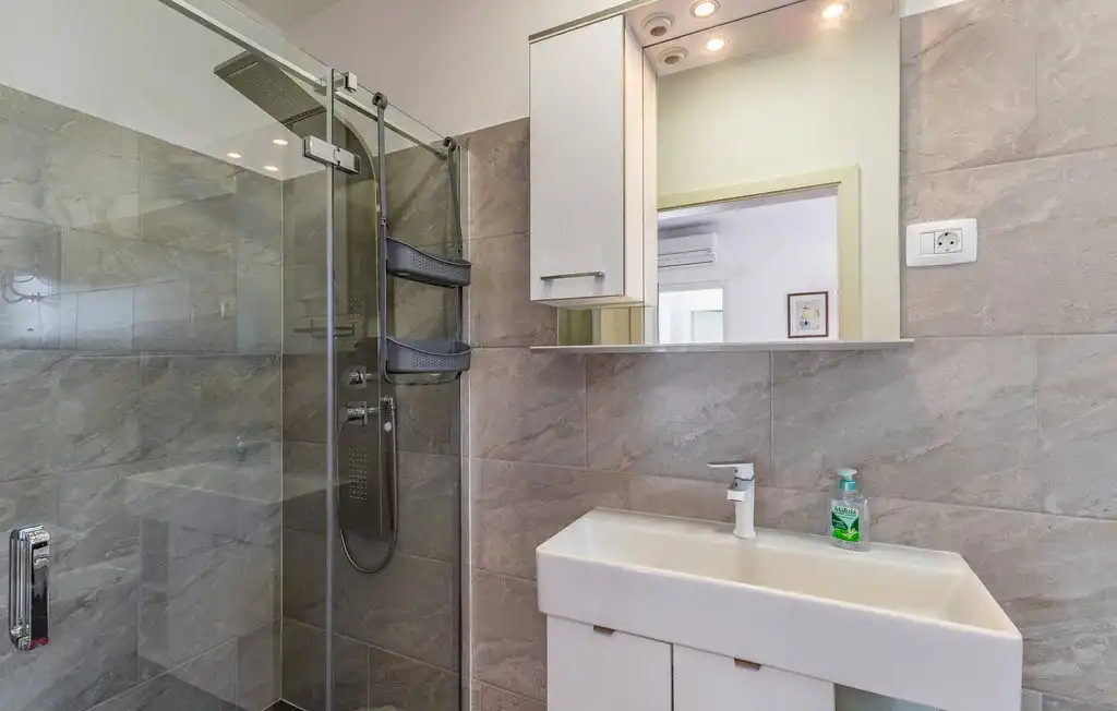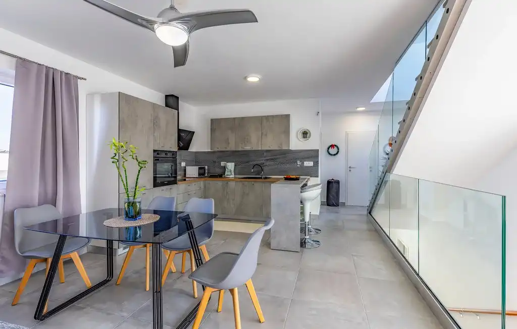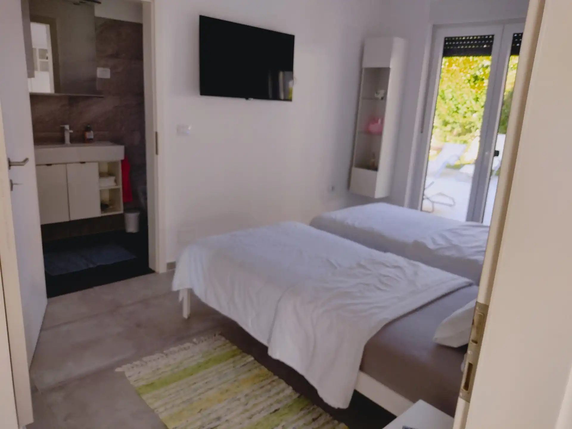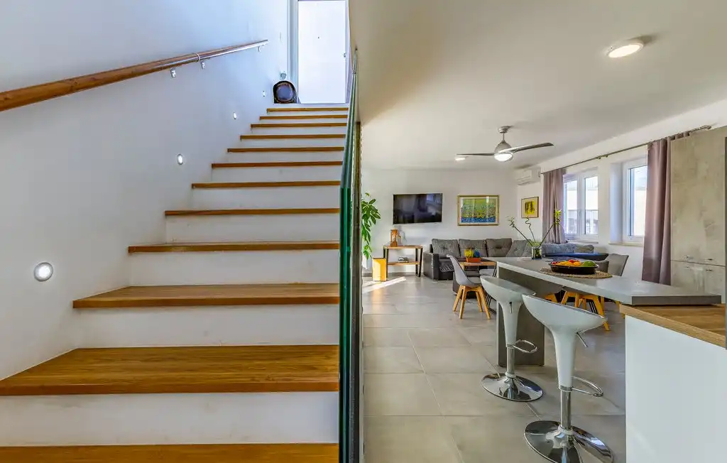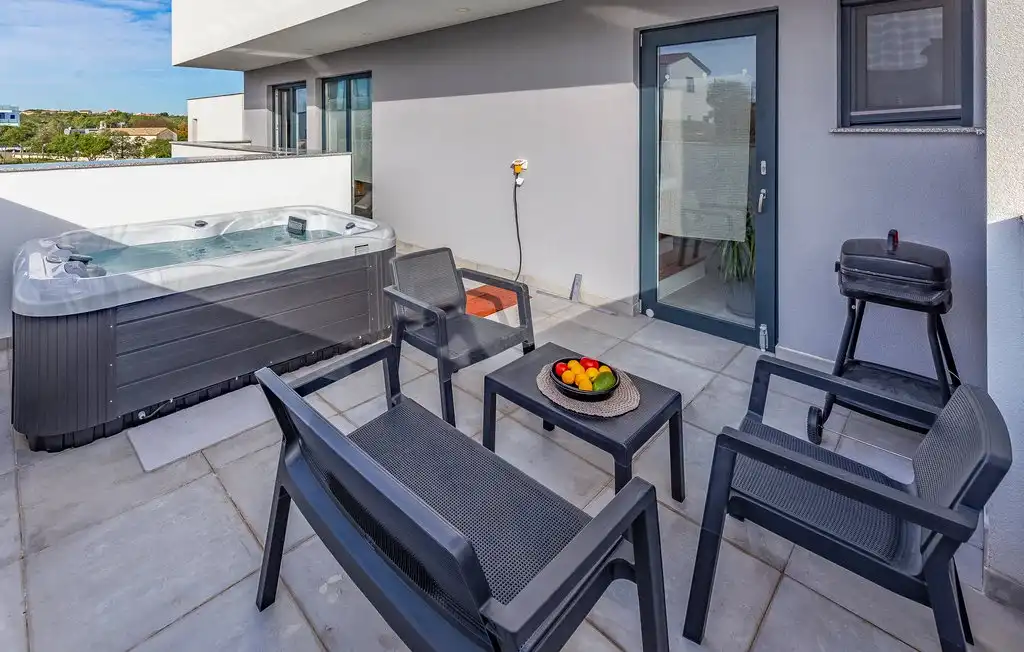 Sea-view duplex consisting of 3 bedrooms with en-suite bathrooms, 3 full bathrooms and one guest toilet, an open-space kitchen, living room, and a gallery with one extra bed, plus a large sea-view terrace. The house features a swimming pool and a fantastic hot tub where you can fully enjoy your moments of relaxation. The bright interiors and comfortable furnishings make this home the ideal place for a relaxing family holiday.