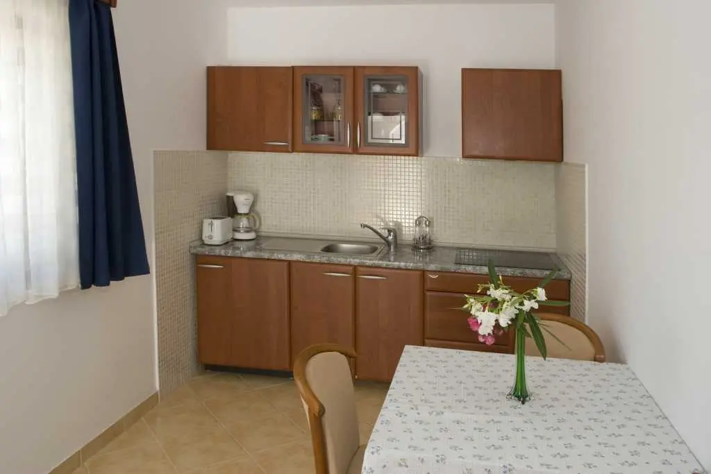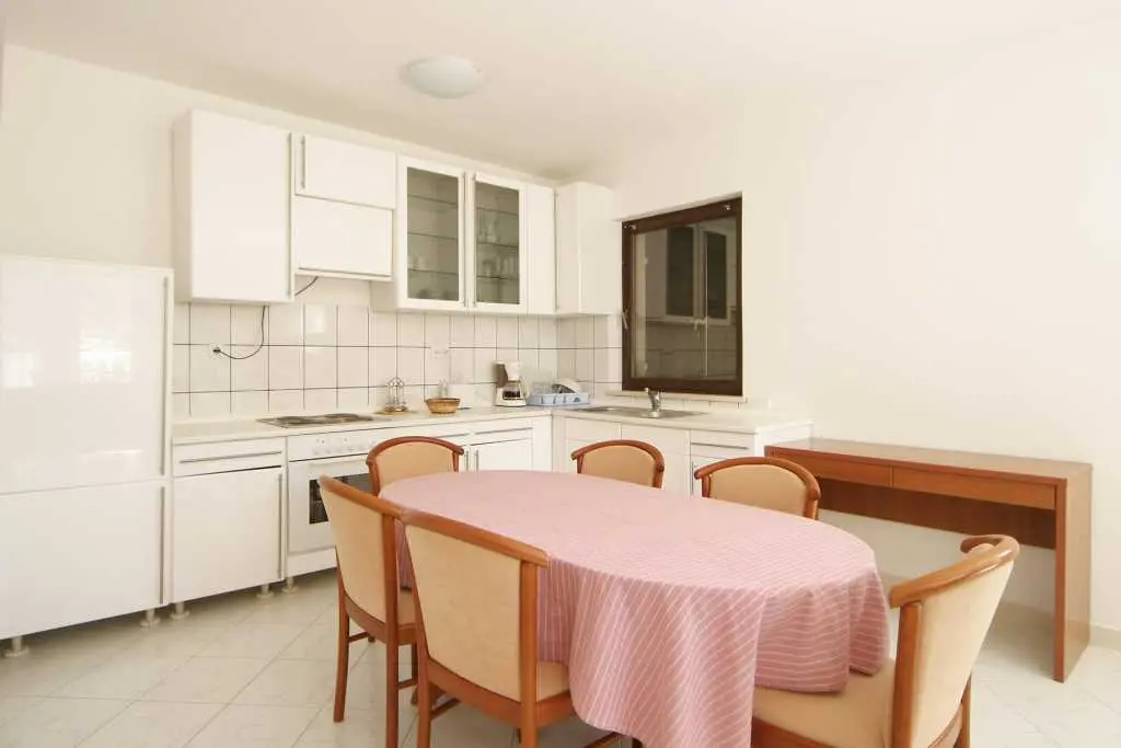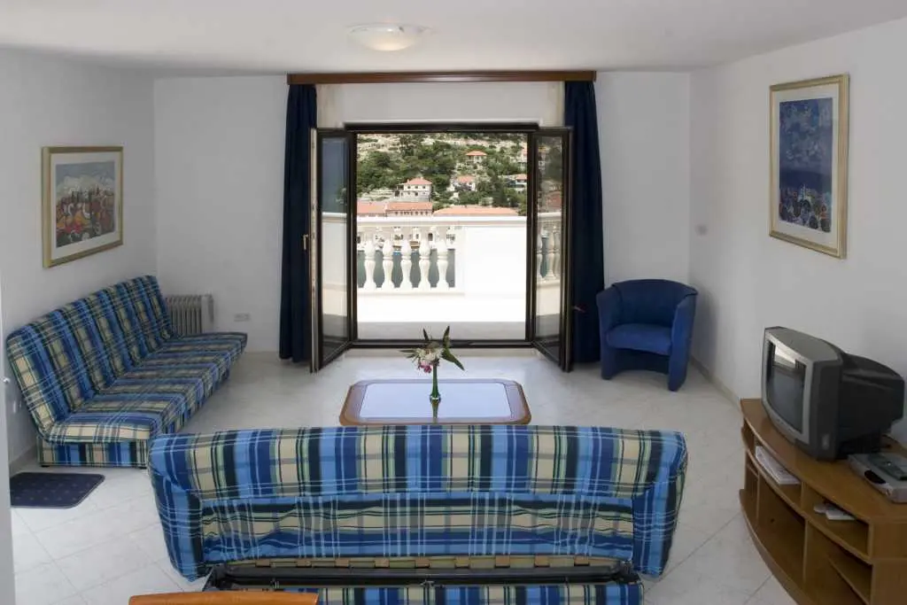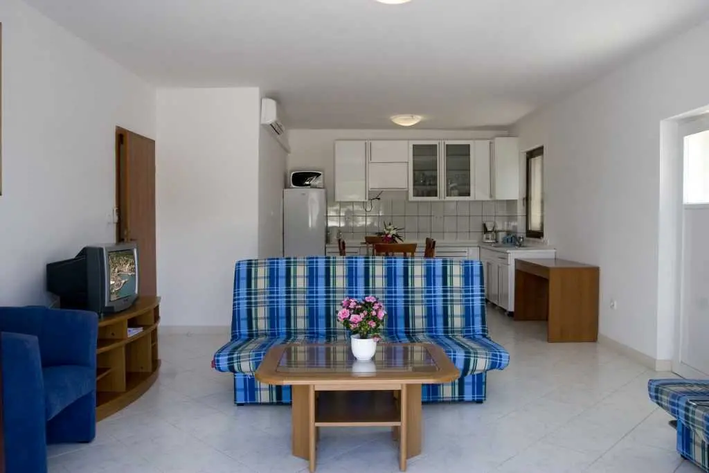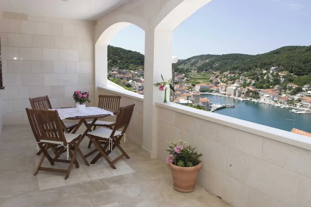 Apartments Pucisca are in Pucisca itself, on the hill above the bay, about 340 meters from the sea and a five-minute walk from the village centre. The house comprises of three apartments of different sizes, each with its own entrance, and although each apartment is rented as a separate unit, you can rent the entire house for a larger group of family or friends, as it can sleep up to 14 people altogether. The stone in this area is different from any other stone. Builders throughout history have recognised its quality, as have many others who have exported it to far-flung corners of the world and incorporated it into their buildings. And everyone who visits Pucisca, the capital of Brac stone, will notice it, too. The biggest apartment (A6+2) is located on the first floor and it comprises of 3 bedrooms (1 double and 2 twins), 2 bathrooms (1 tub, 1 shower), and a kitchen / dining / sitting area. Two additional single sofa beds (size 80 x 200 cm) are located in the sitting room area. Furthermore, a lot of a terrace area with a magnificent sea view, table and chairs, and sun loungers is on guest's disposal, in addition to an outdoor fireplace with a grill. The apartment is equipped with two air conditioning units, located in the sitting room area, and in the hall in front of the bedrooms.