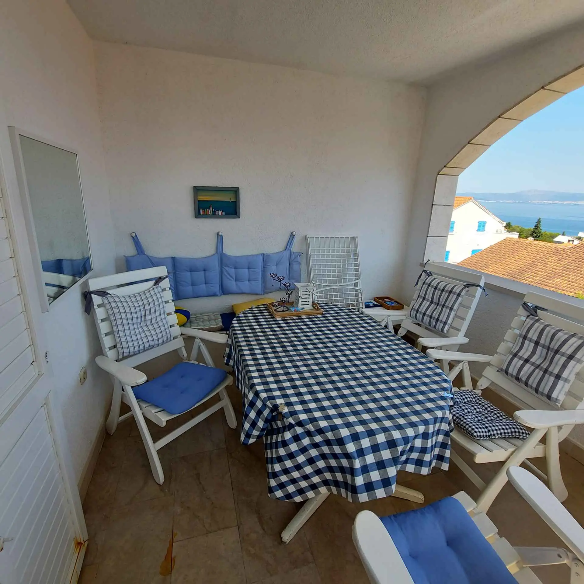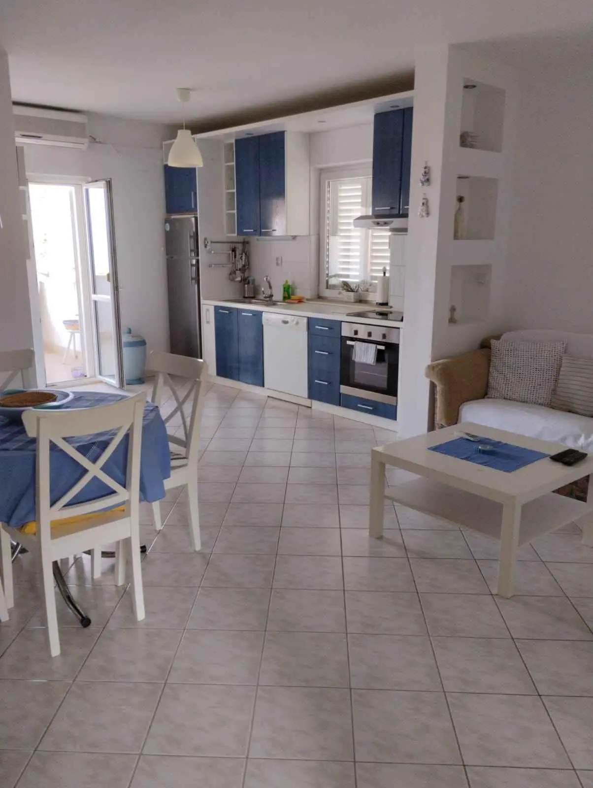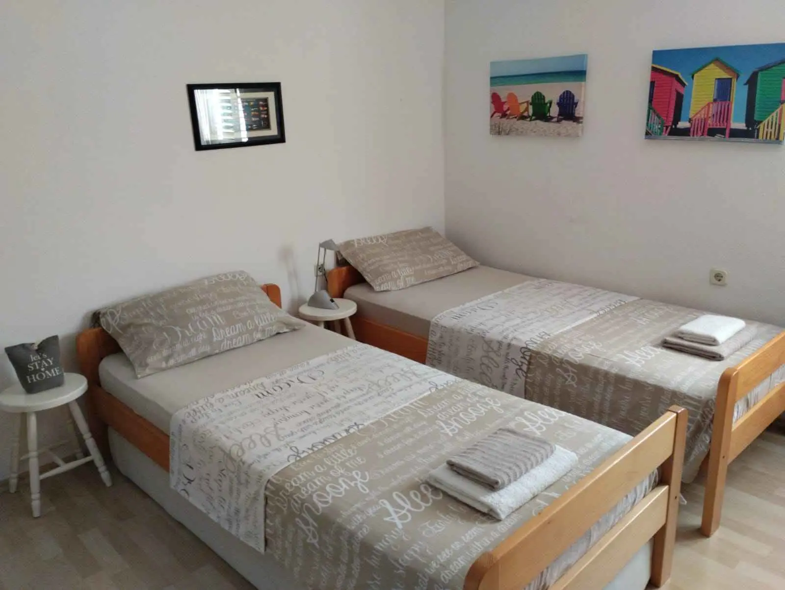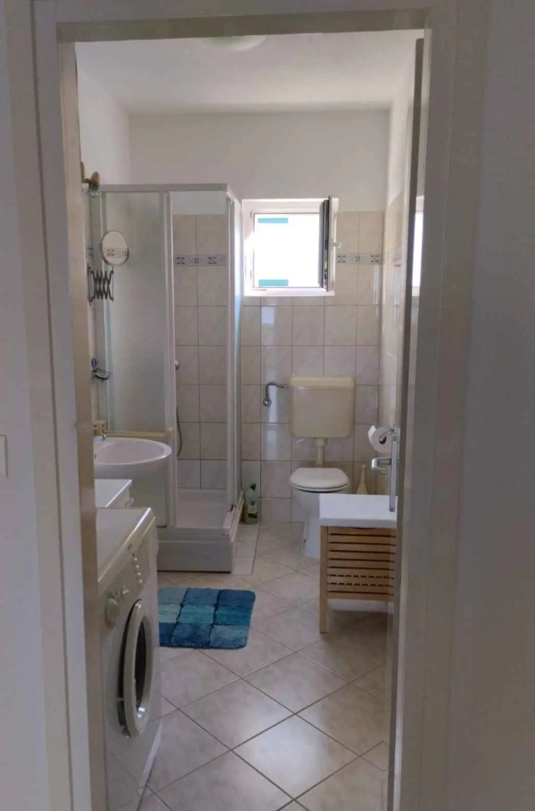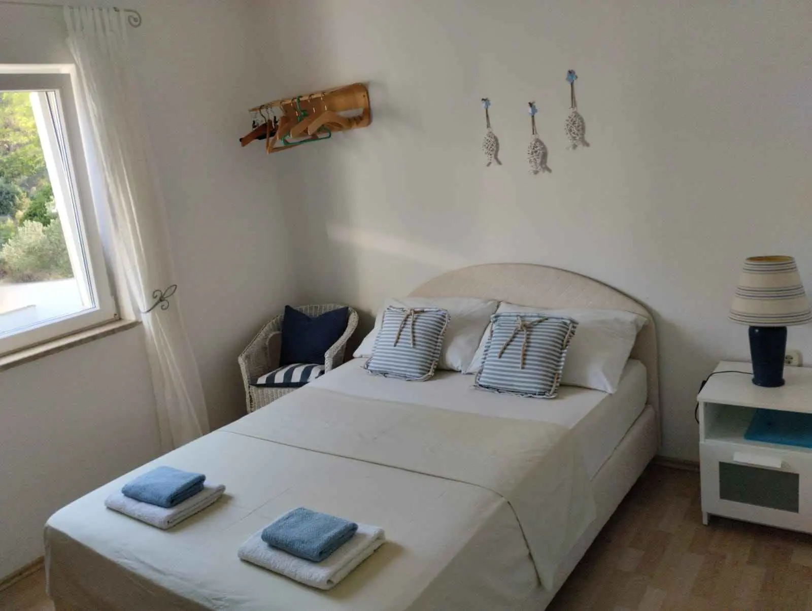 Air-conditioned (and heated) apartment (75m2, suitable for 4 persons) is situated on the 2. floor of small, residential building in the green and silent west side of Supetar, with assured parking place. It consists of anteroom with built-in wardrobe, a large living room with TV (over than 80 channels) free Wi-Fi and small library, fully equipped kitchen and dinning arrea, 2 badrooms and bathroom with laundry machine. The entrance to the big loggia (external dinning arrea) gives a wonderful view on the azure sea - the Canal of Brač and Split. The distance to the nearest beach with crystal clean sea is 150-200 meters (2-3 min.), while the closest supermarket takes 5 minutes by walk (500 meters). Other advantages include the nearness of two swimming pools, tennis courts,diving center, the gym, wellness center, hairstyle salon, beauty center and wood lane by the seacoast which is perfect for strolling and byciclism. Apartment gives an opportunity for a peaceful vacation in arrea of mediterranean climate and rich vegetation.