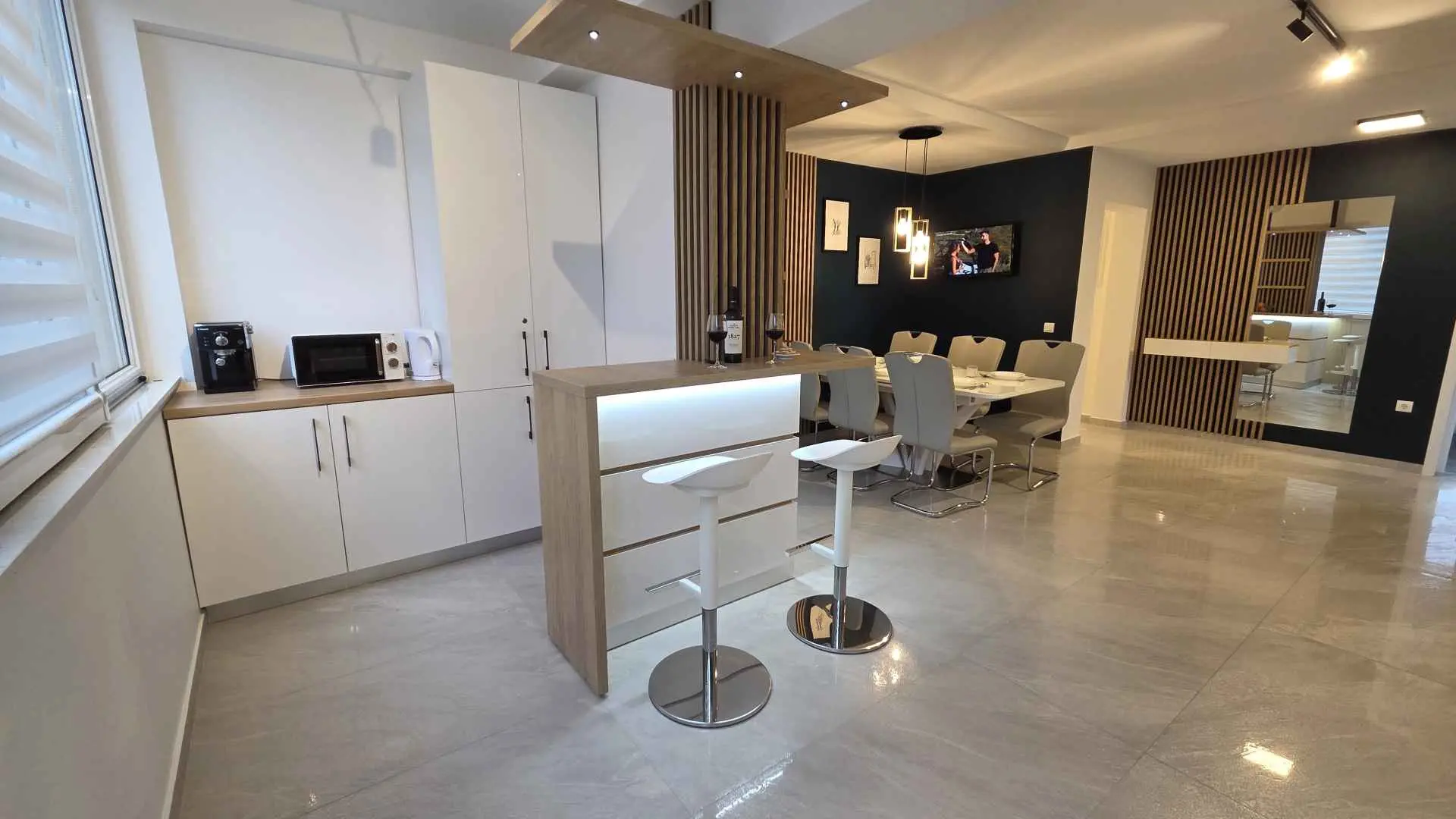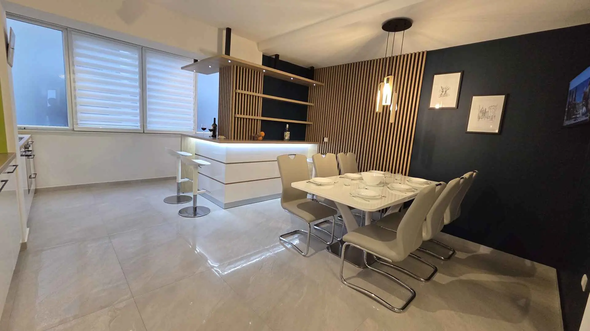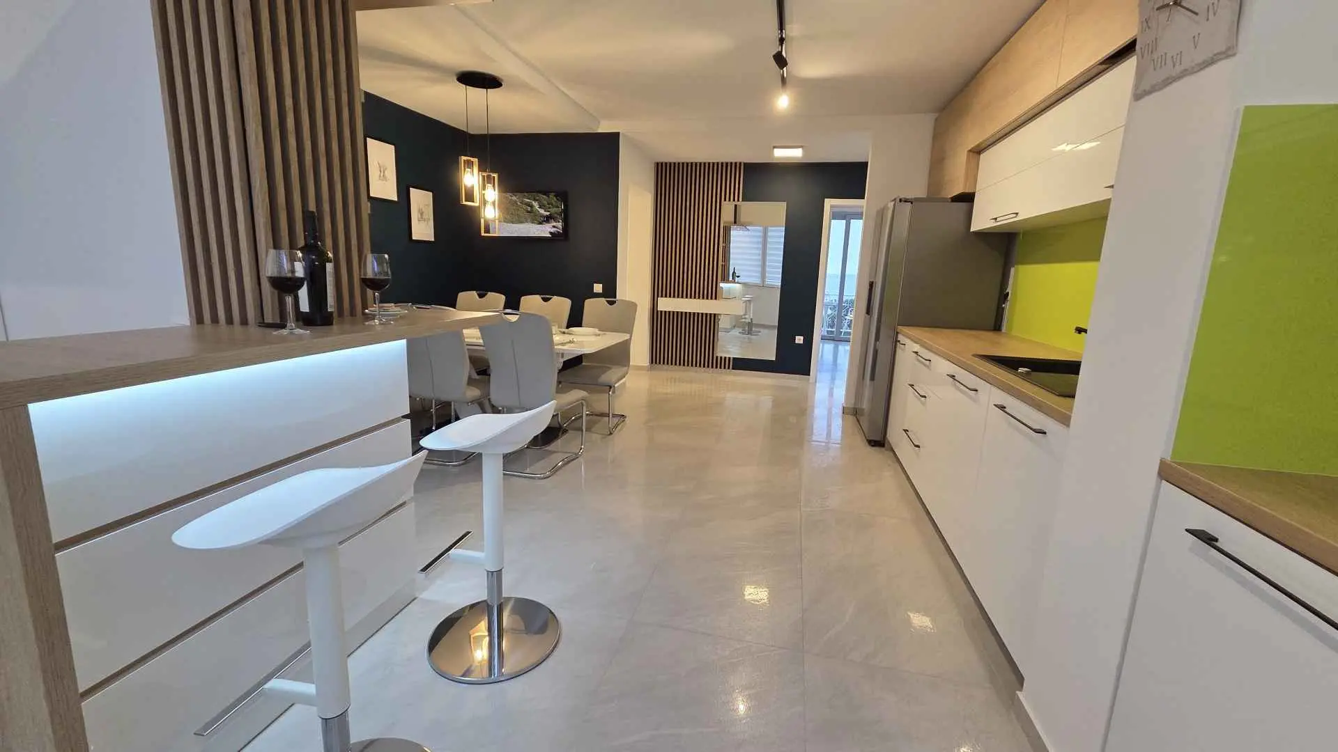 Apartment Minerva – Modern accommodation in Brela, Makarska Riviera Apartment Minerva is located in the very center of Brela, a charming seaside town on the Makarska Riviera, just 150 meters from the beach and a short walk from the famous Punta Rata Beach, one of the most beautiful beaches in Croatia. The apartment has 110 m² of space, fully renovated and tastefully furnished, ideal for 6 to 8 guests. It features 3 bedrooms, each with a private bathroom (two rooms have balconies with sea views), a spacious living room with a bar and dining area, and a fully equipped kitchen. ✔️ Air conditioning and smart TV in every room ✔️ Free Wi-Fi ✔️ 2 parking spaces nearby ✔️ Kitchen with induction cooktop, oven, twin-side refrigerator, microwave, espresso machine, kettle, and dishes for 10 people ✔️ Located near restaurants, shops, and seaside promenades Perfect for families or groups looking for a relaxing holiday on the Croatian coast, with all the comforts of home — right in the heart of the Makarska Riviera.