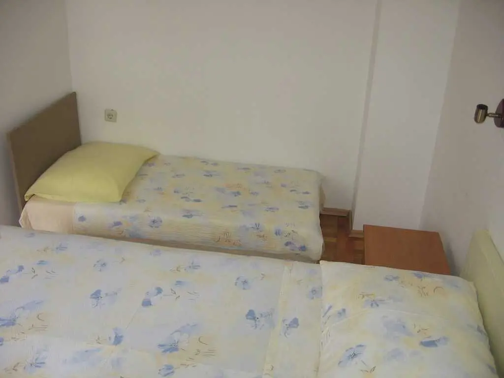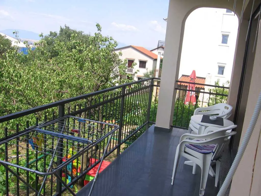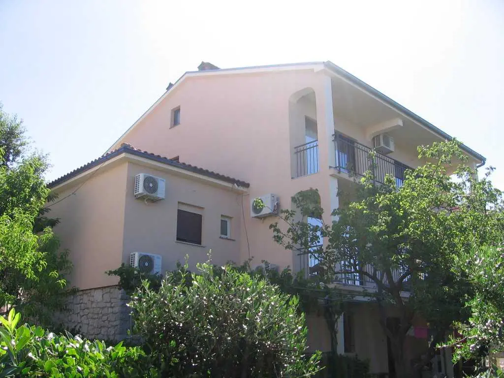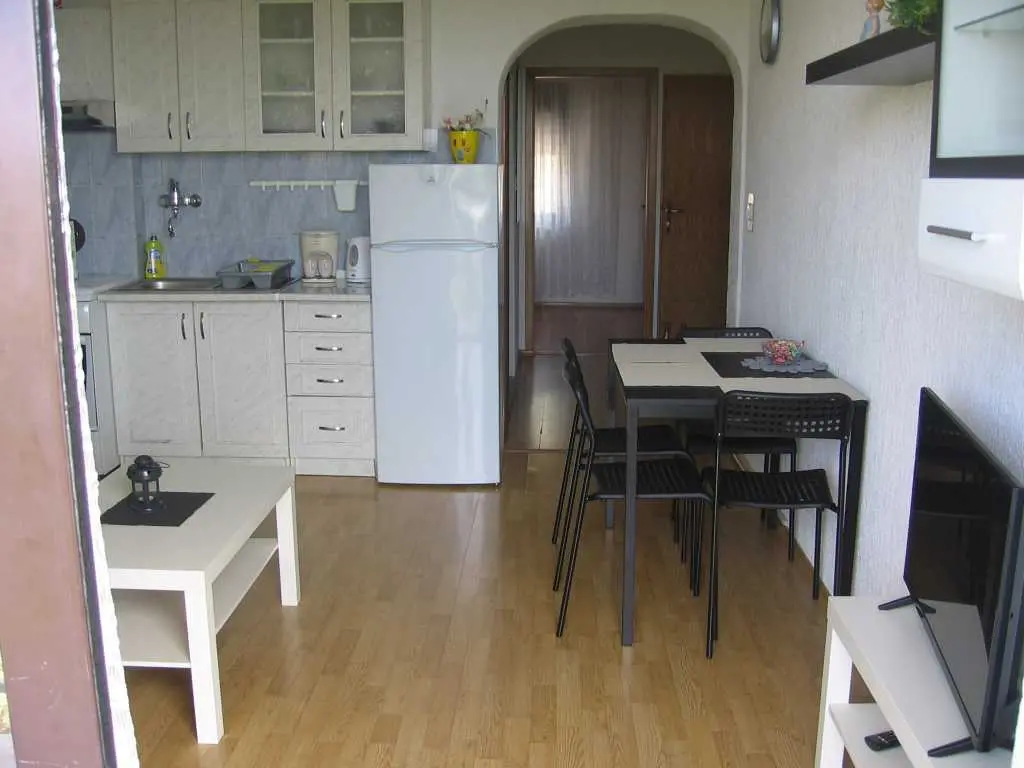 Bedroom ( double bed) + terrace, living room and kitchen are one room where there are two more beds + balcony, satellite TV. Kitchenette , table and chairs for every person, kitchen utensils, cutlery, etc. Provided, dish clothes, electric cooker and gas, refrigerator and freezer, mirkovalna, fan .. Bathroom with toilet, washing machine. One pet is allowed, several pets on request. Linen is changed weekly, towels ( 1 large, 1 small / per person a week ). Free Internet WI - FI. Own balcony, covered, Tables and chairs for the balcony are available, balcony: 8 m2 outer part. Cot available upon request. Barbecue. WHEN BOOKING LESS THAN 4 NIGHTS EXTRA 30% Capacity and positions: Capacity: 4 Number of beds: 5 Number of double beds : 2 Distance from the beach: 1000 m Beach type: sandy Distance from the center: 500 m Distance from the shop: 500 m Further information: Sea View yard terrace balcony parking place pets Internet connection Free Wi-Fi We speak foreign languages: English Italian German Device Features: TV satellite TV heating Bathroom Features: shower cabin Washing machine Kitchen: Dishes for preparing meals Dishes for serving food and drinks Cutlery kitchen range oven fridge freezer Coffee maker Additional services (on request ): Laundry Access: Closest airport: 15 km The nearest railway station: 30 km The nearest bus stop: 1 km Nearest ferry port: 25 km