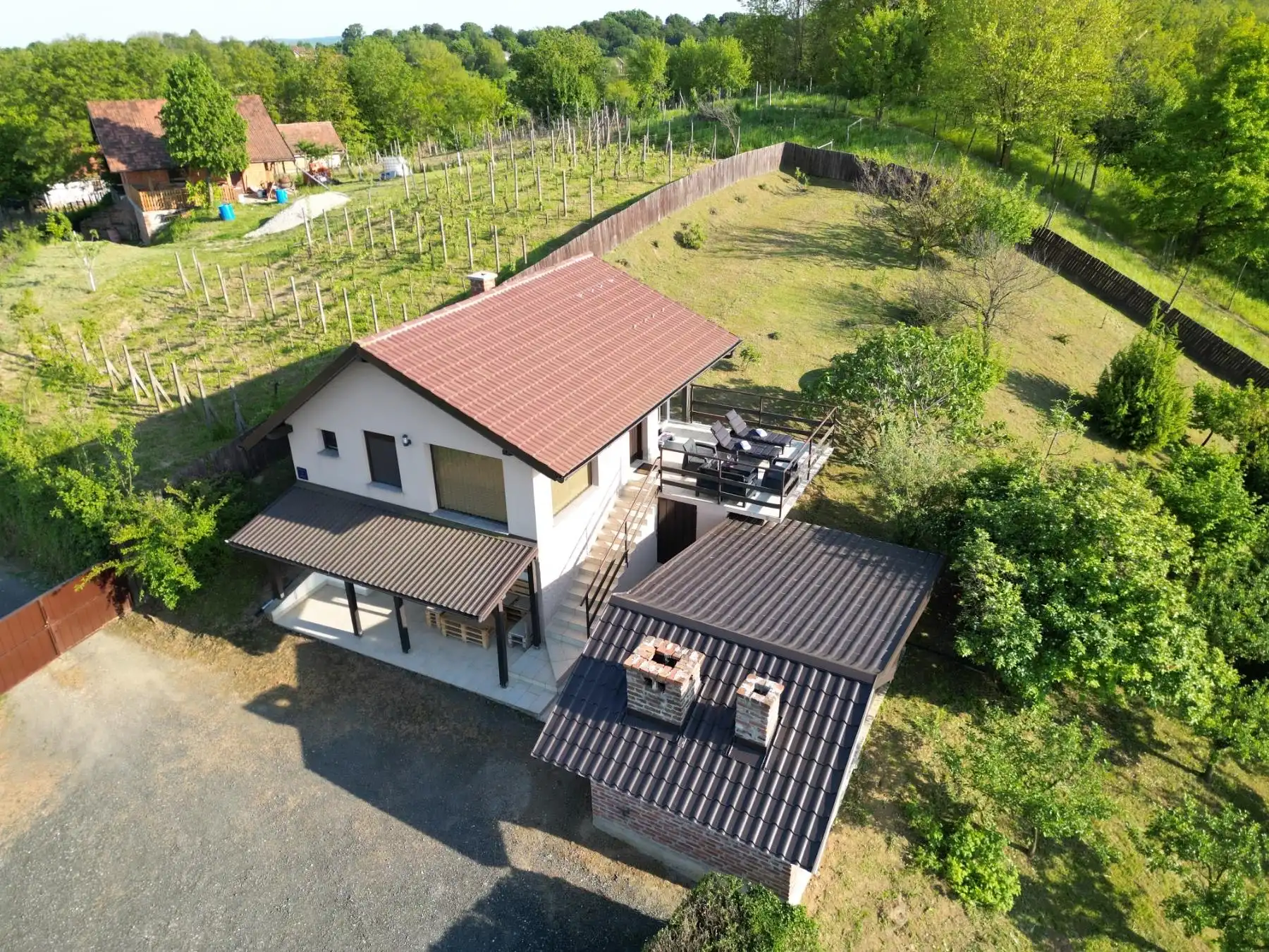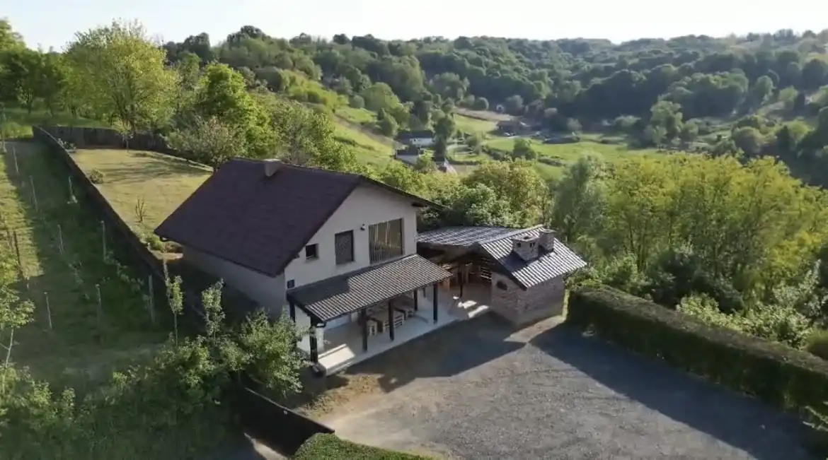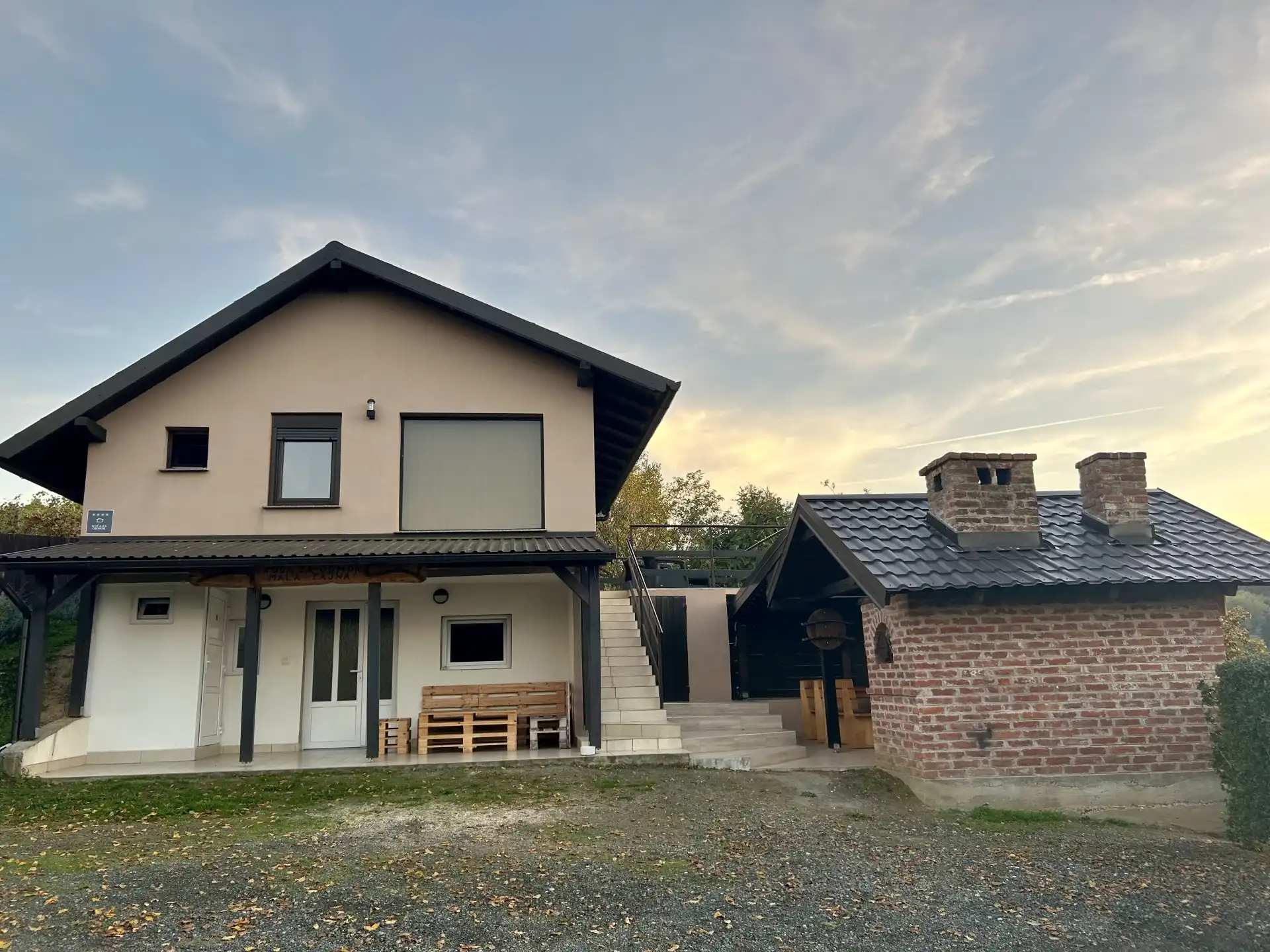 Among the vineyards, forests and greenery is the Holiday House Mala tajna. It is located in the town of Kunovec Breg in the Koprivnica-Križevac County. We are only 100 km from Zagreb, and from Varaždin 40 km. The house is intended for two, and pets are welcome. We have provided our guests with a large parking lot, an infrared sauna and a hydromassage pool, a grill, a grill and a bread oven. The house consists of two floors. The lower floor consists of a large kitchen with all appliances, a dining room with a smart TV next to the table, and a wooden table with a bench and a chair at the entrance, and a toilet. The upper floor consists of an open space living room with a corner sofa, a kitchenette, an infrared sauna and an open passage to the hydromassage pool located in the winter garden, a bedroom with a double bed and a bathroom with a walk-in shower. In addition to the above, there is a large terrace with corner furniture and two deckchairs. For more information - Matea 098 9195 249 or Mato 098 522 592. We look forward to your arrival
