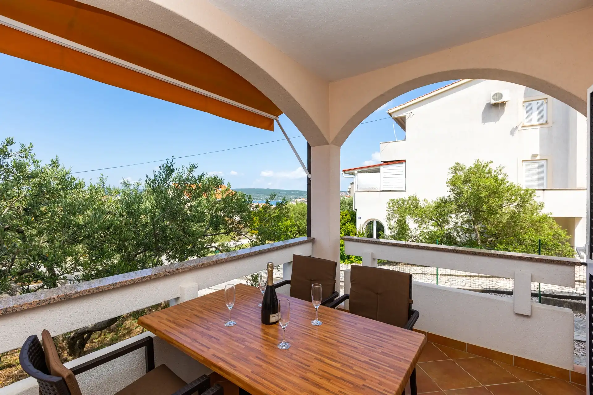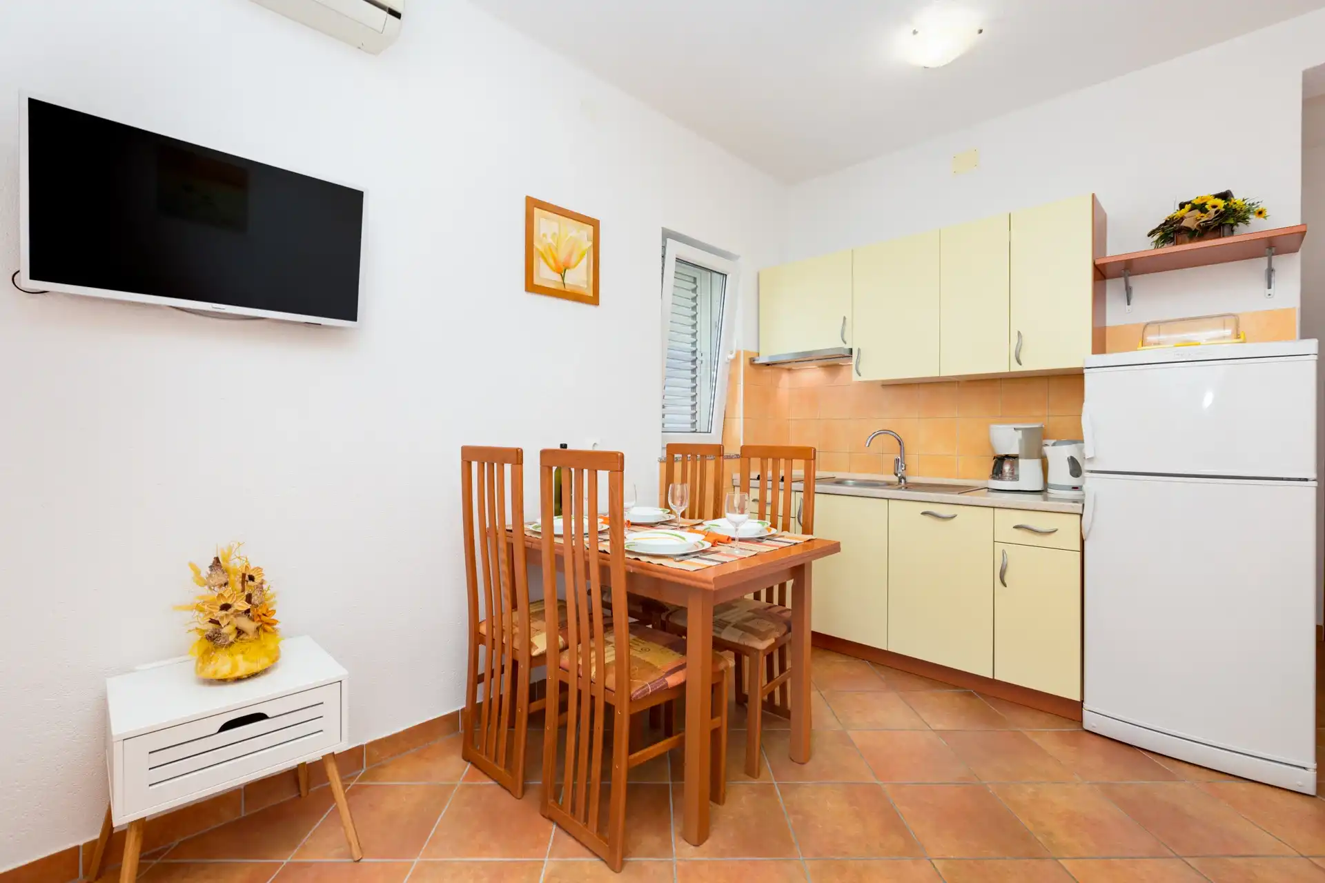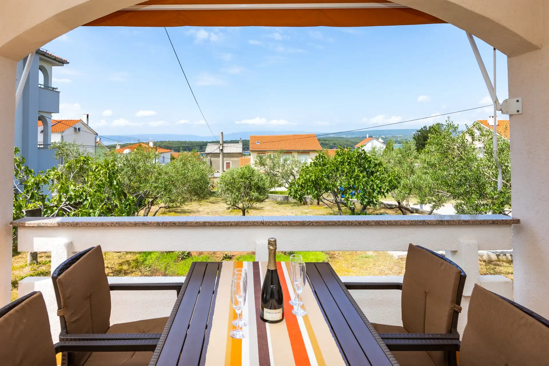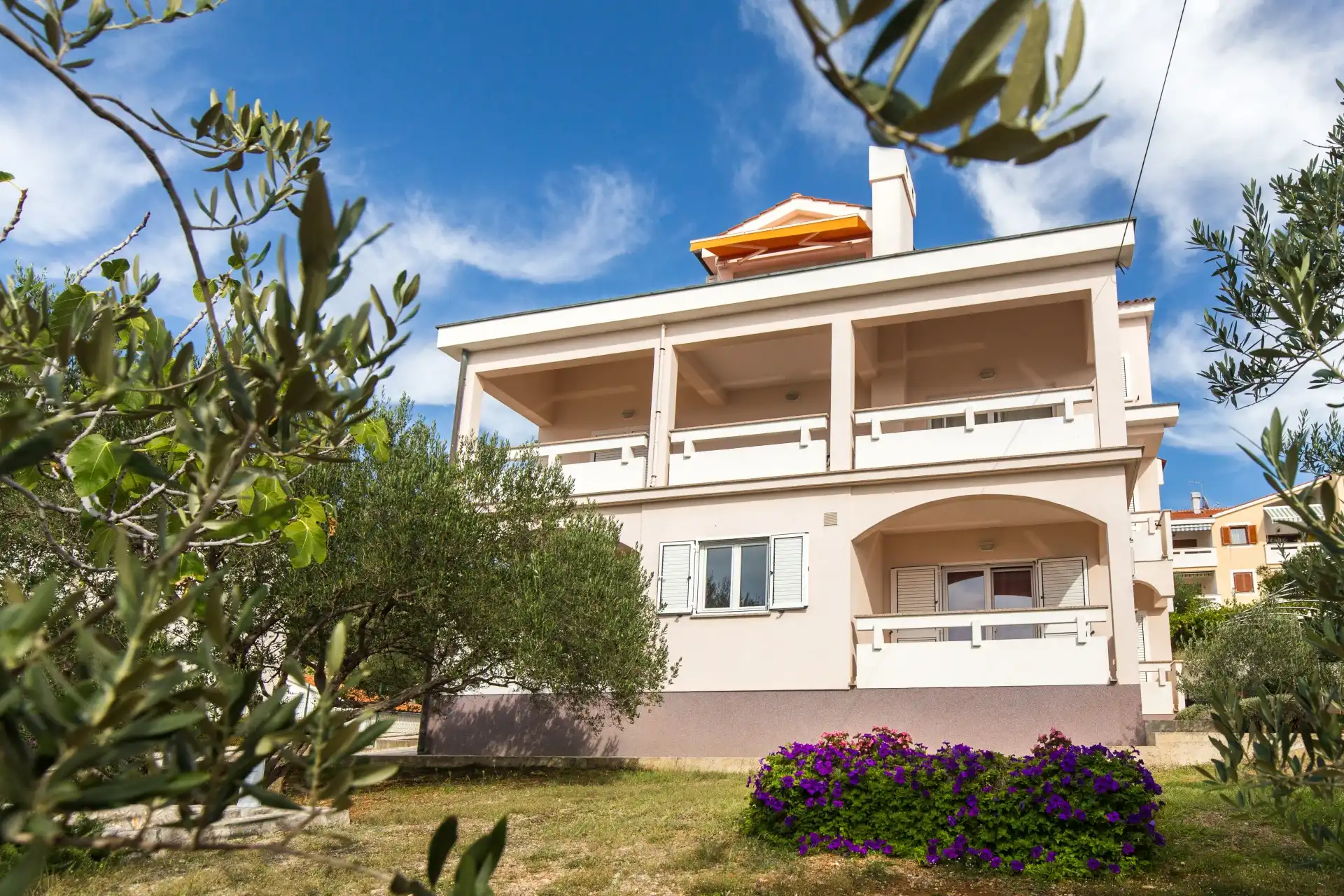 In the small coastal town of Punat, in a beautiful setting of olive trees and fig trees, is our family house with two modernly equipped apartments on the high ground floor. If you don't mind walking ten minutes to the beach or five minutes to the nearest restaurant, cafe or shop, then you have come to the right place. Each apartment has two separate bedrooms for four people, a bathroom/WC with shower, a kitchen with a living room in which there is an extra bed for one more person. The living room opens onto a spacious covered terrace equipped with a seating area. The apartments are equipped with air conditioning, SAT/TV, bed linen, towels, a dishwasher, a fridge with freezer, a coffee machine, a kettle, dishes and other kitchen utensils. A parking space is provided for your car in our yard. Pets are not allowed in the apartment. If you are not a fan of the summer heat and crowds on the beach, if you like to walk, hike or ride a bike, then spring is the best time of year to visit our island. Welcome!