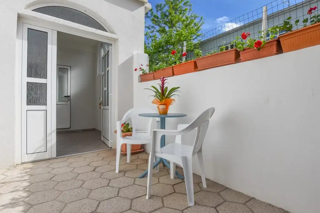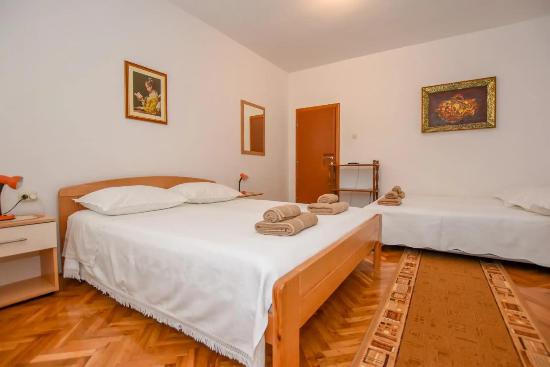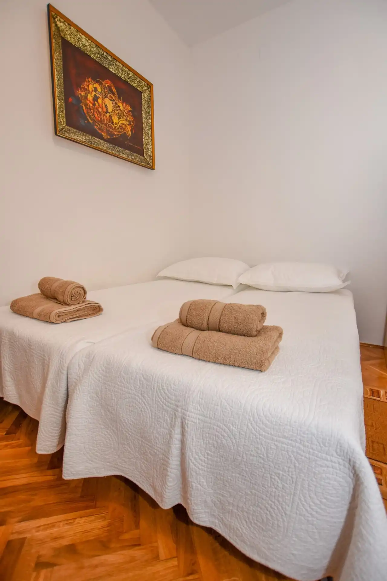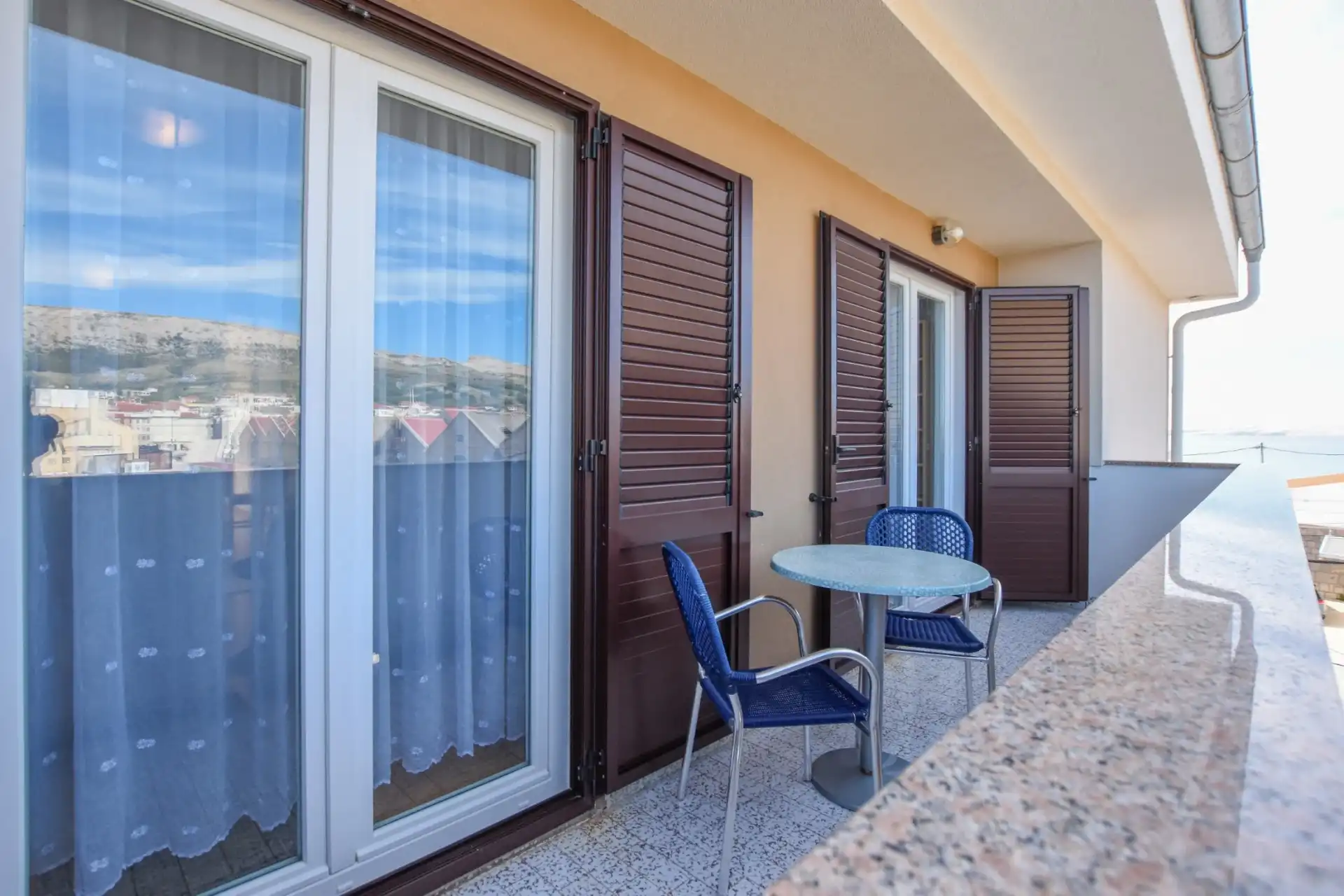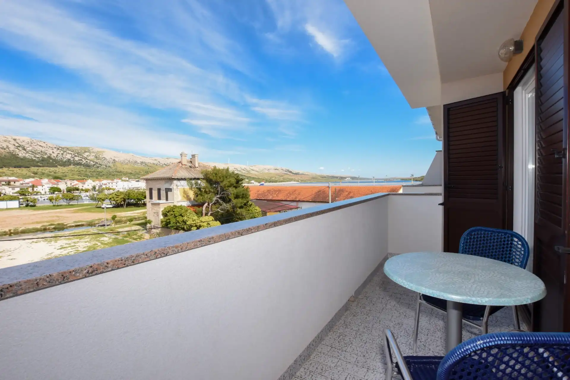 Tončica Apartments in the town of Pag consist of three separate accommodation units located in a family house in an exceptional position, only 20 meters from the beach and the sea, and about 100 meters from the town center, offering guests the ideal combination of seaside relaxation and proximity to all amenities. Tončica Apartment 1 is a spacious apartment with a surface area of approximately 80 m², situated on the second floor of the house. It features two bedrooms, two bathrooms, a fully equipped kitchen with a dining area, a living room, and a balcony or terrace with a sea view. One bedroom includes a double bed and an additional bed. All rooms are air conditioned. Guests have access to private parking, Wi-Fi, and air conditioning, while bed linen, towels, final cleaning, and tourist tax are included in the price. Tončica Apartment 2 offers approximately 60 m² of living space and is also located on the second floor of the family house. It consists of two bedrooms, a bathroom, a living room, and a fully equipped kitchen with a dining area, with access to a balcony overlooking the town and the sea. The apartment is air conditioned, provides free Wi-Fi, and includes secured parking. The accommodation price includes bed linen, towels, final cleaning, and tourist tax. Tončica Apartment 3 is a smaller apartment of approximately 50 m², located on the ground floor, making it especially suitable for families with small children. It comprises a bedroom with a double bed and an extra bed (160 × 200), a kitchen, a bathroom, and a closed terrace. The apartment is equipped with air conditioning and Wi-Fi, and guests are provided with parking, bed linen, towels, final cleaning, and tourist tax. All Tončica Apartments offer comfortable accommodation close to the sea, with sea or town views from the terraces, air conditioning, wireless internet, and private parking, making them an excellent choice for a family holiday or a stay with friends in Pag.