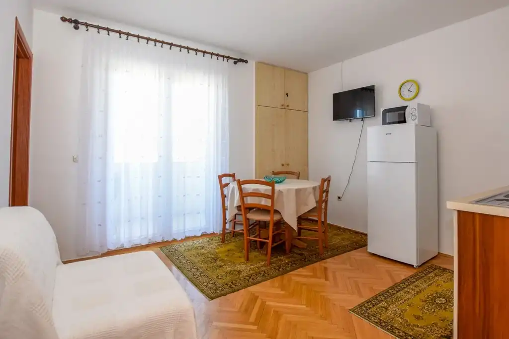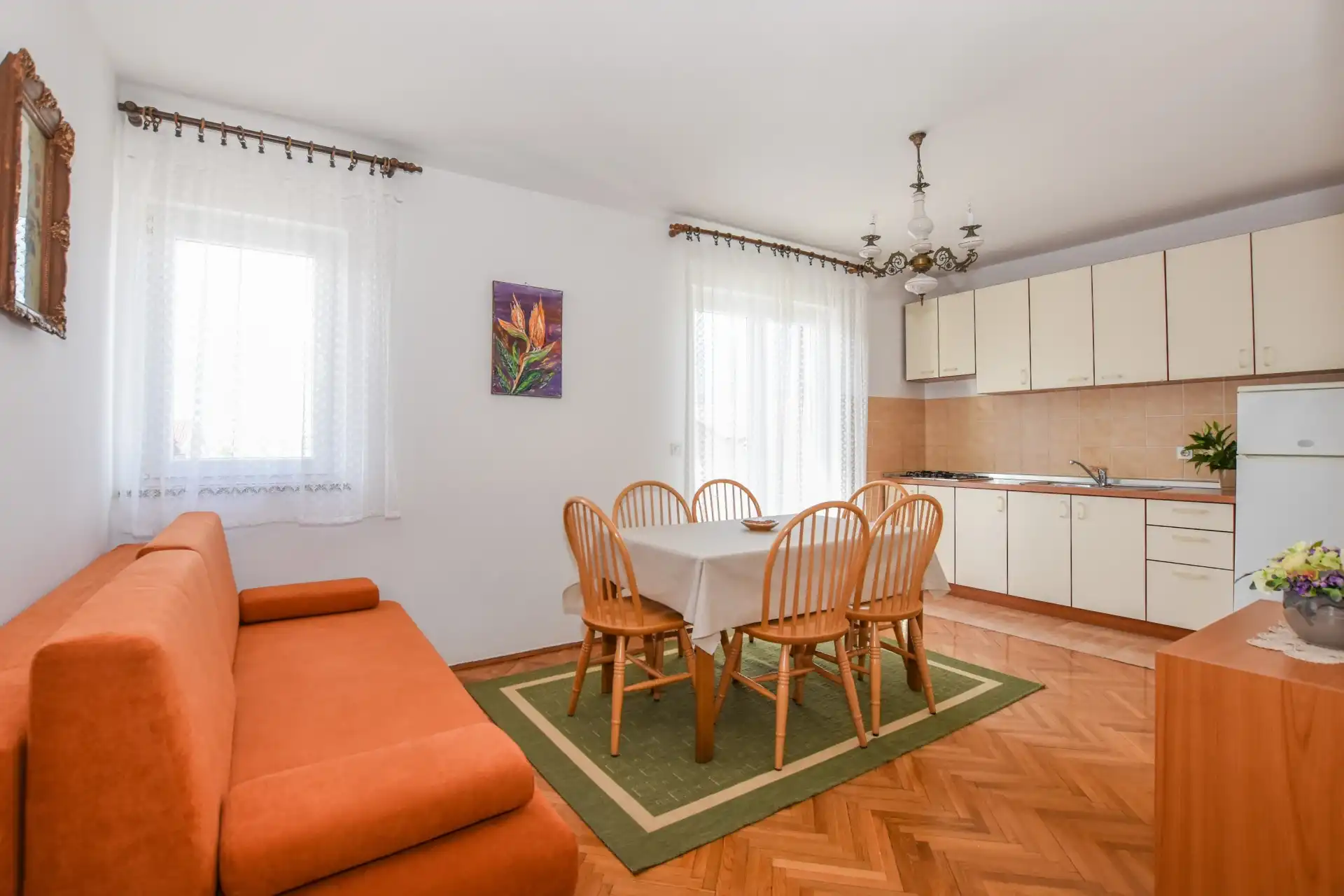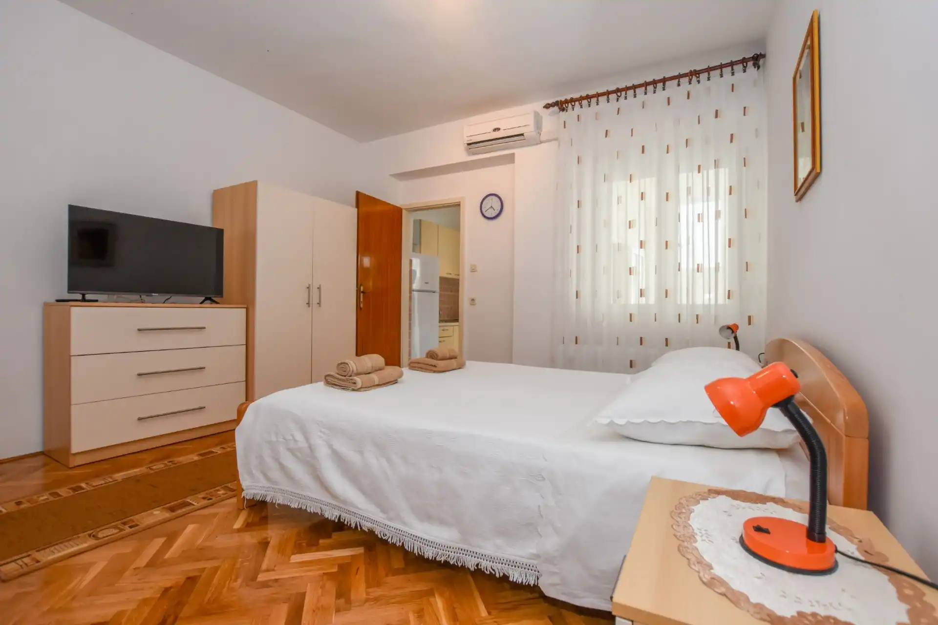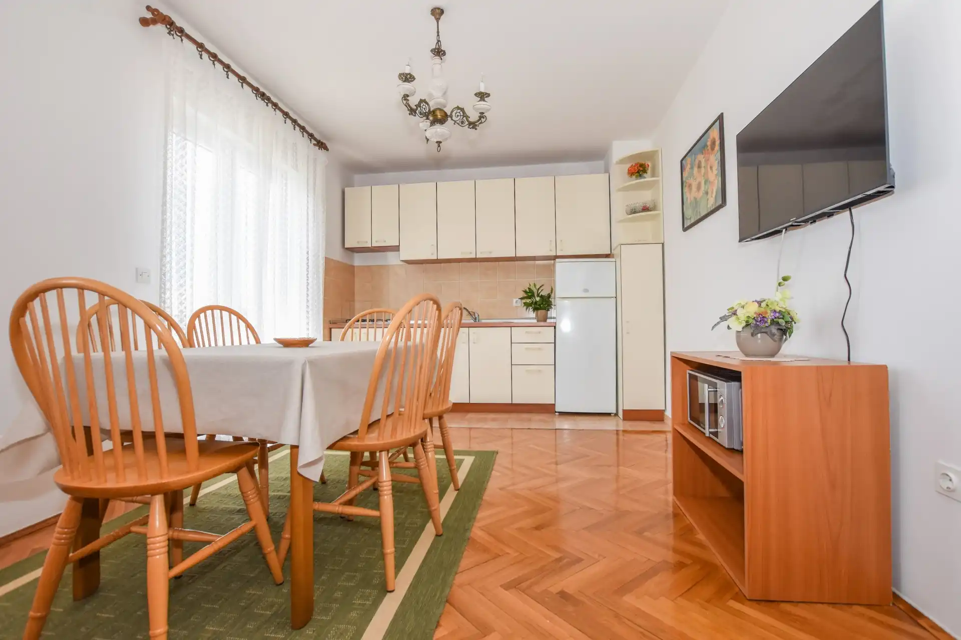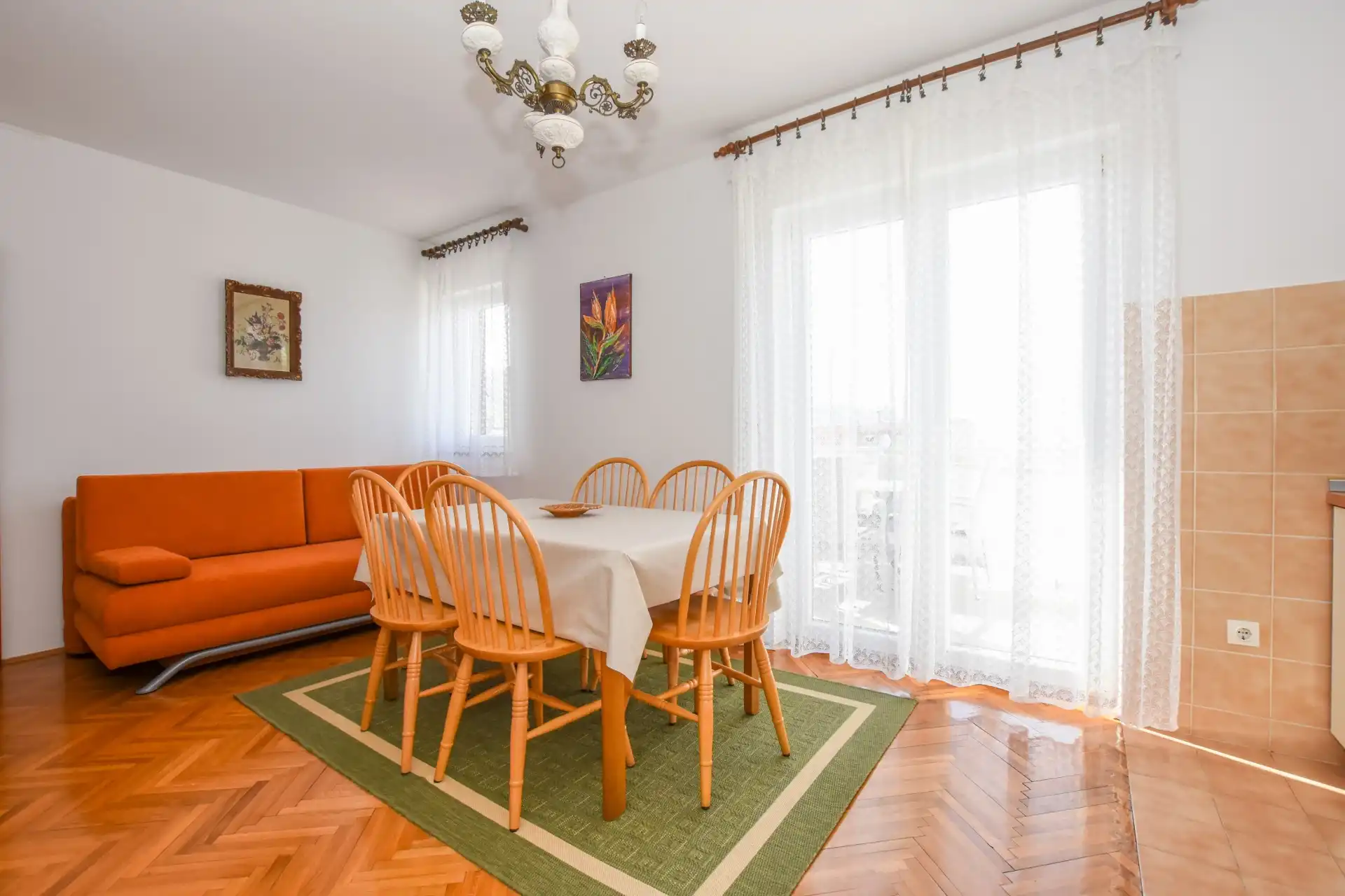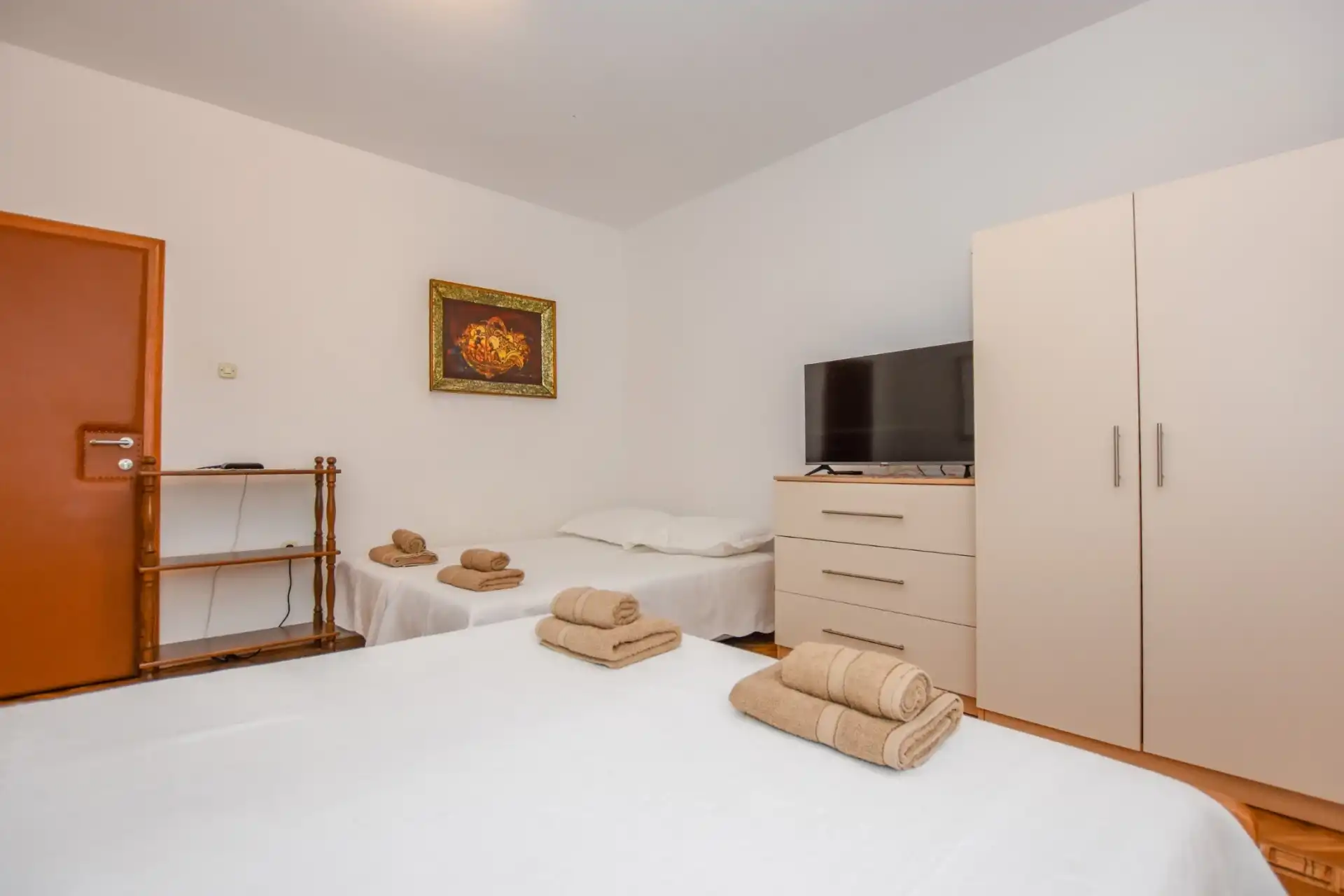 Tončica Apartments in the town of Pag consist of three separate accommodation units located in a family house in an exceptional position, only 20 meters from the beach and the sea, and about 100 meters from the town center, offering guests the ideal combination of seaside relaxation and proximity to all amenities. Tončica Apartment 1 is a spacious apartment with a surface area of approximately 80 m², situated on the second floor of the house. It features two bedrooms, two bathrooms, a fully equipped kitchen with a dining area, a living room, and a balcony or terrace with a sea view. One bedroom includes a double bed and an additional bed. All rooms are air conditioned. Guests have access to private parking, Wi-Fi, and air conditioning, while bed linen, towels, final cleaning, and tourist tax are included in the price. Tončica Apartment 2 offers approximately 60 m² of living space and is also located on the second floor of the family house. It consists of two bedrooms, a bathroom, a living room, and a fully equipped kitchen with a dining area, with access to a balcony overlooking the town and the sea. The apartment is air conditioned, provides free Wi-Fi, and includes secured parking. The accommodation price includes bed linen, towels, final cleaning, and tourist tax. Tončica Apartment 3 is a smaller apartment of approximately 50 m², located on the ground floor, making it especially suitable for families with small children. It comprises a bedroom with a double bed and an extra bed (160 × 200), a kitchen, a bathroom, and a closed terrace. The apartment is equipped with air conditioning and Wi-Fi, and guests are provided with parking, bed linen, towels, final cleaning, and tourist tax. All Tončica Apartments offer comfortable accommodation close to the sea, with sea or town views from the terraces, air conditioning, wireless internet, and private parking, making them an excellent choice for a family holiday or a stay with friends in Pag.