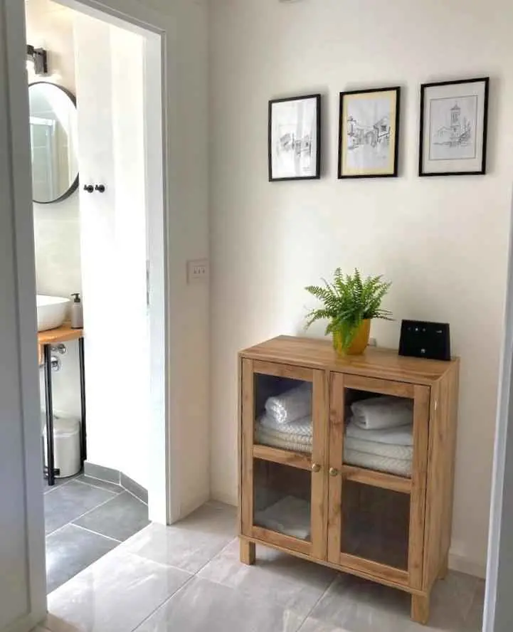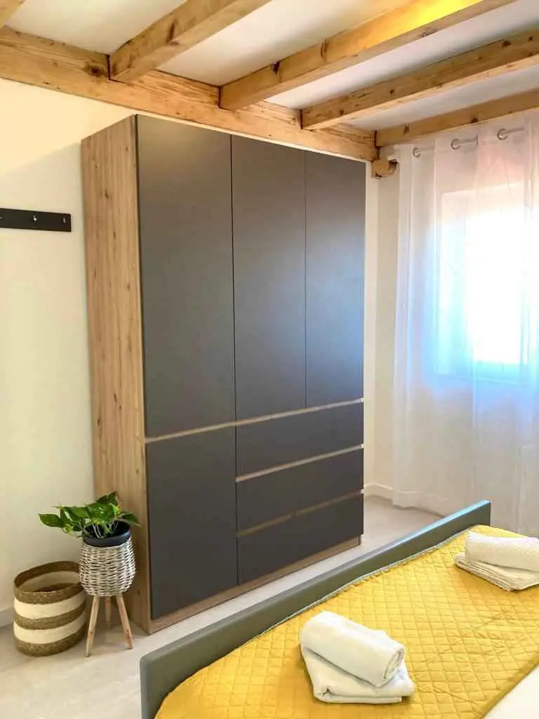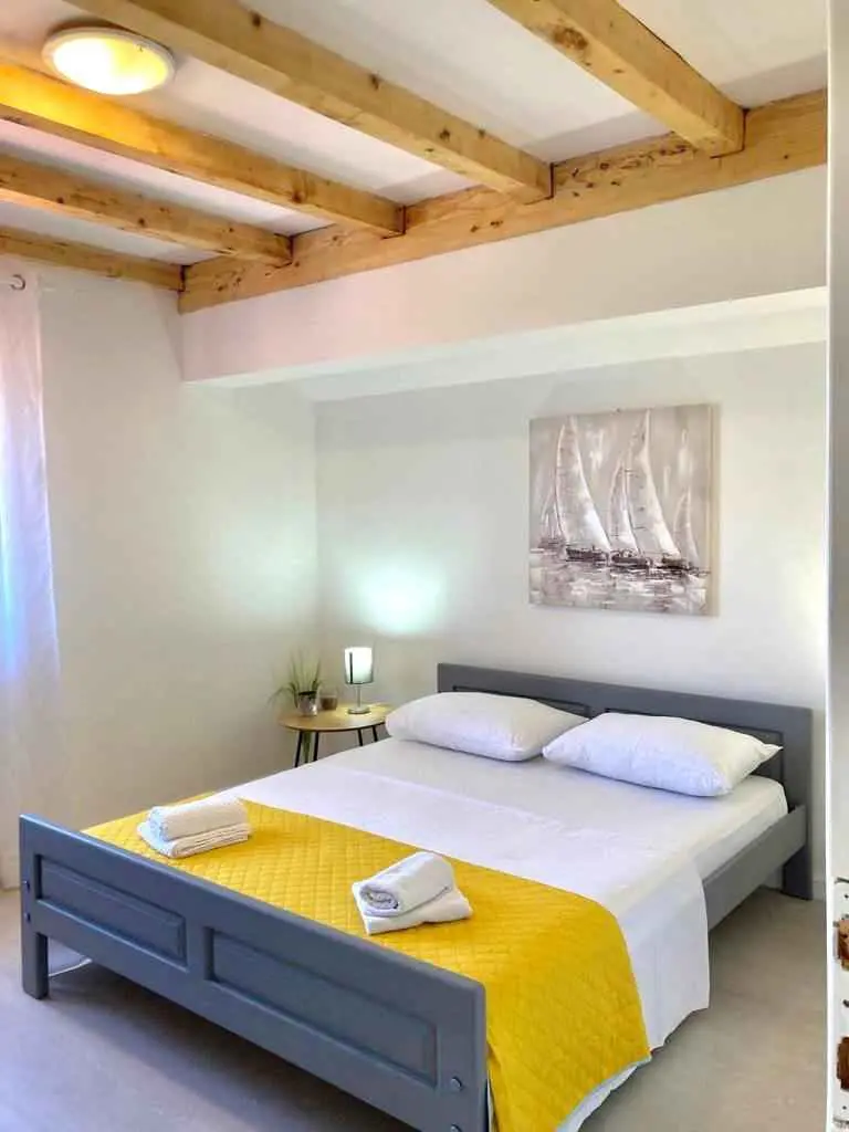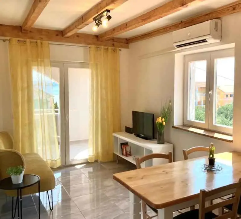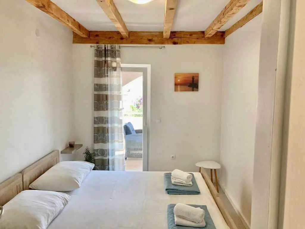 Enjoy your holiday in a modernly designed apartment in Tkon, combining white minimalism with the warmth of white oak. Located just a few minutes from the sea, the apartment offers a spacious terrace with a beautiful sea view, as well as a view of the Benedictine monastery Ćokovac from the entrance. In the nearby village of Ugrinić, there is a pebbled beach with a beach bar, ideal for families with children. The night club Džigibau is about 1 km away – far enough to keep the peace undisturbed, yet close enough for a fun night out. An added convenience is the household goods store located in the same building as the apartment. A perfect choice for a relaxed, simple, and authentic holiday on the island of Pašman.