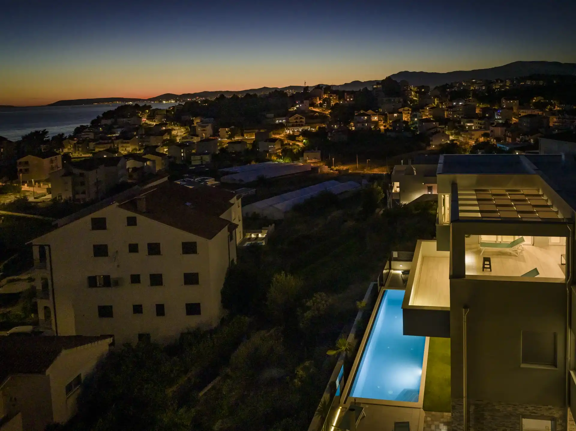 Welcome to the brand new Villa Ivka with an infinity pool with hydromassage, private parking, terrace, courtyard and panoramic sea views. It offers four fully furnished units ideal for a family vacation. Located on an elevated private plot with controlled access, it offers privacy, peace and isolation. The villa is an ideal place for relaxation and socializing, and at the same time only a few minutes walk from the beach and the coastal promenade - "lungomare". Each room is air-conditioned, which ensures full individual temperature control. Free WiFi is available throughout the property. Clean sea air and beautiful panoramas make a summer vacation at Villa Ivka unforgettable. Refreshment in the sea or pool during the day, pleasant, relaxing freshness at night gives a nice feeling of comfort when parents and children can look forward to moments of family happiness together. Children are safe, surrounded by interesting outdoor amenities. The luxury Penthouse Apartment for 6 people contains 3 spacious and comfortable bedrooms, and 3 fully equipped bathrooms with a modernly designed shower and one toilet in each. What makes this Penthouse special is the beautiful private terrace for relaxation (sun loungers) and plenty of space for gathering and socializing with unobstructed views of the Adriatic Sea and nearby islands. The Palma and Oliva apartments, for 4 people each, have open living rooms with dining areas and modern kitchens and large glass doors to the terrace with a pool and space for entertaining, sunbathing, sitting and relaxing. The cozy Studio Apartment is perfect for couples or solo travelers. It features an open space that effectively combines the living room, dining room and sleeping area in one bright and airy ambiance.