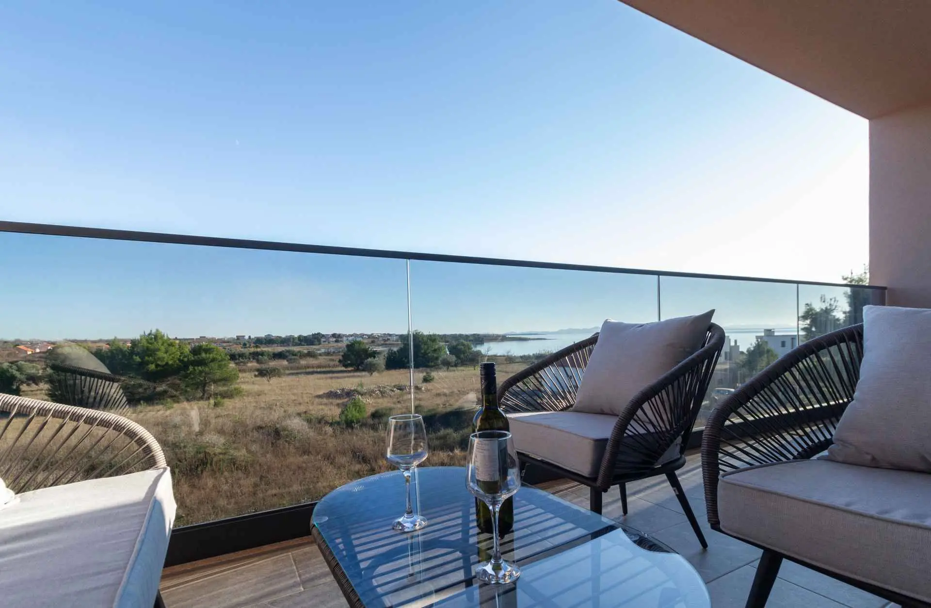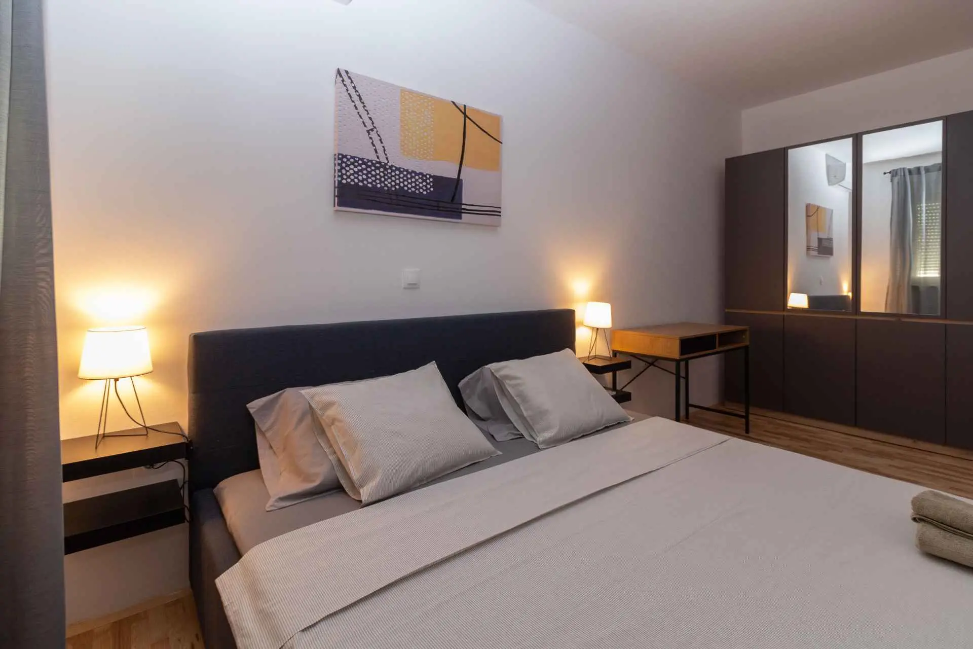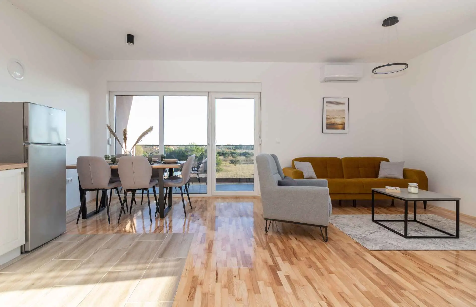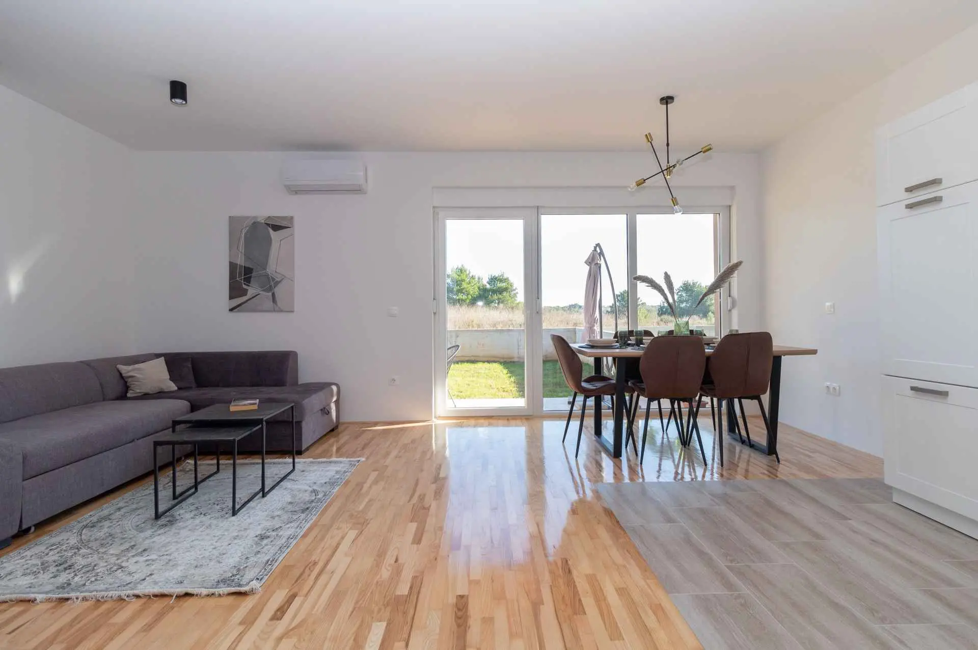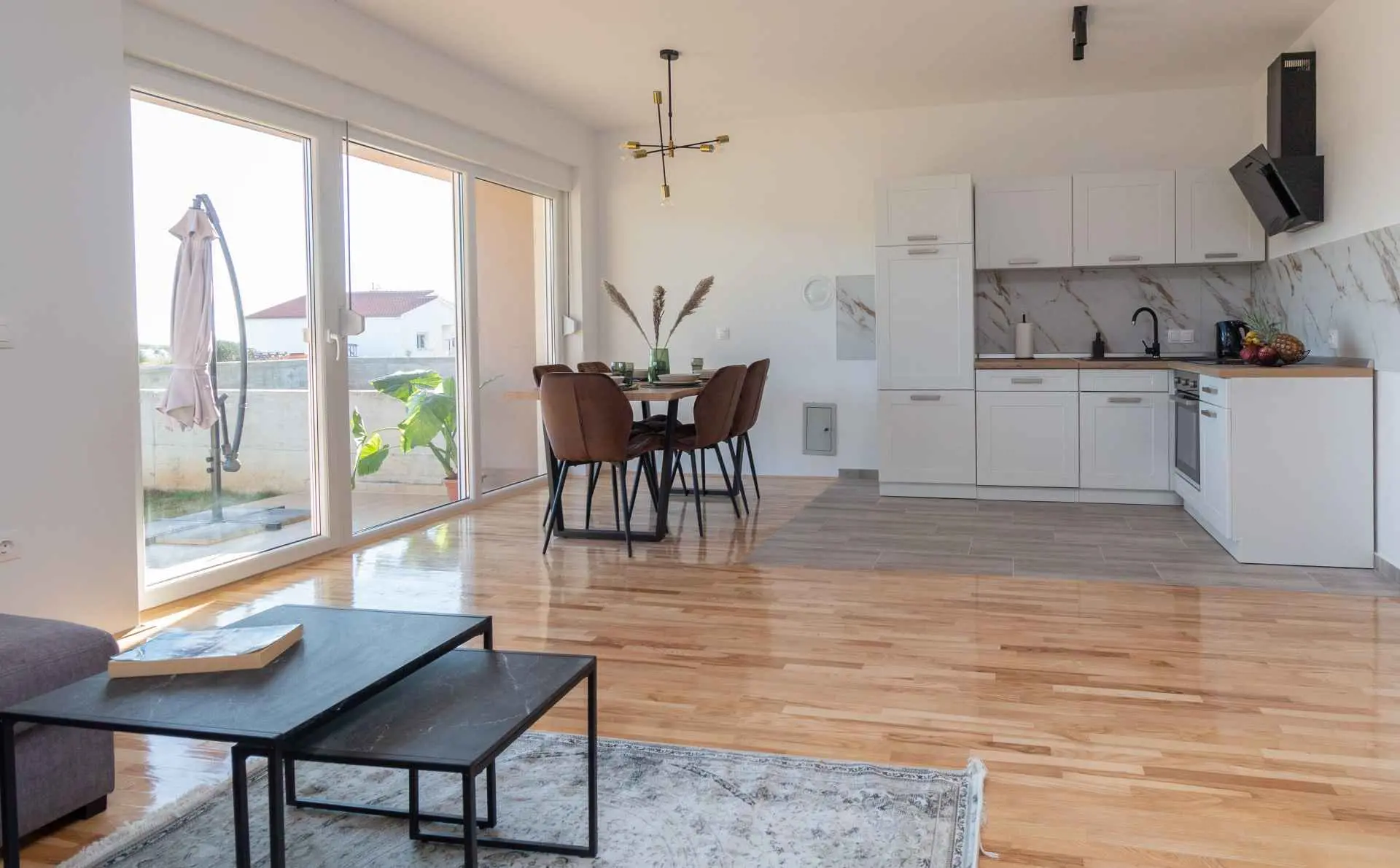 Apartments Dalmata are located in an excellent location in Privlaka near Zadar, just 150 meters from the sandy beach. The apartments have 2 bedrooms, a spacious living room with a kitchen, a bathroom, a toilet, a large balcony with a beautiful view of the sea. The building was newly built in 2023 and all the furniture is brand new. The apartments are equipped with all necessary facilities, flat screen TV with satellite channels, oven, stove, microwave oven, refrigerator with freezer, kettle, complete dishes, washing machine, hair dryer, each room has air conditioning and mosquito net. Free Wi-Fi and private parking are available to guests. In addition to the terrace, the apartment on the ground floor has its own garden, which is equipped with a barbecue, a children's playground and a solar shower, and a separate entrance/exit from the garden. Quality construction with new materials ensures a peaceful and pleasant stay in the apartment. Just a 2-minute walk from the sandy beach, there are restaurants, cafes and shops nearby. The apartments are 3 km from the historic town of Nin and 15 km from the world-famous town of Zadar. The nearest airport is only 30 km away.