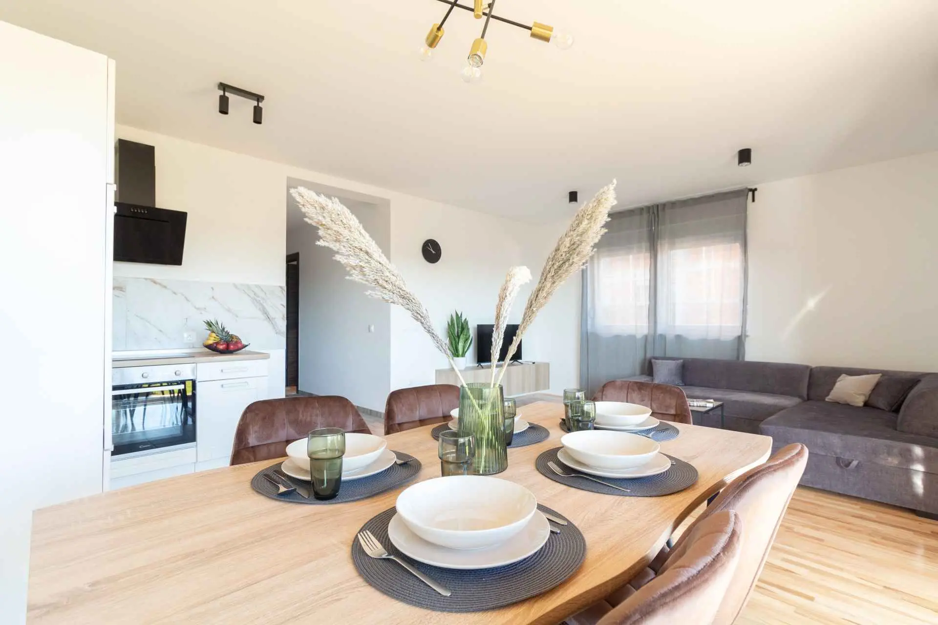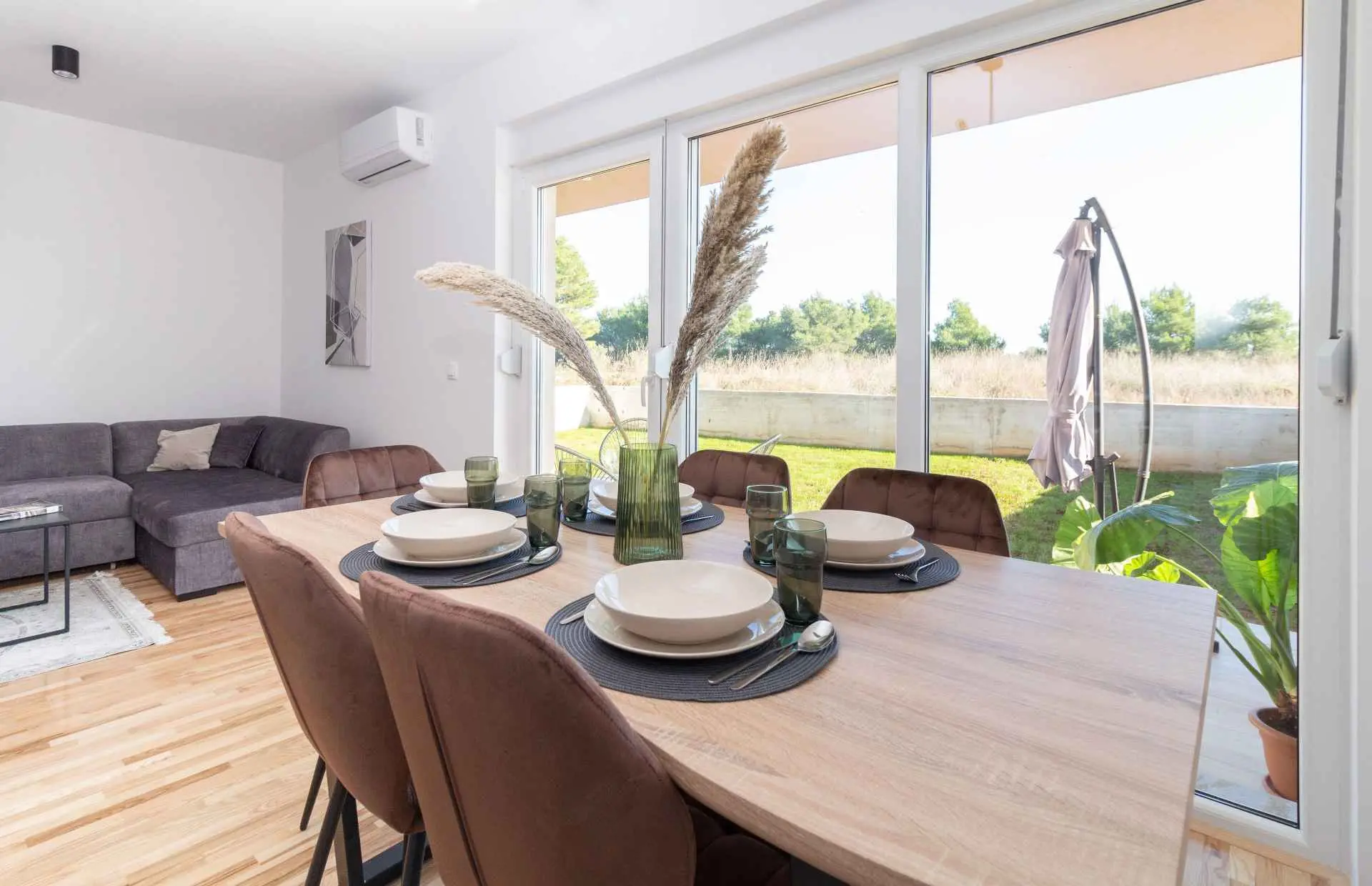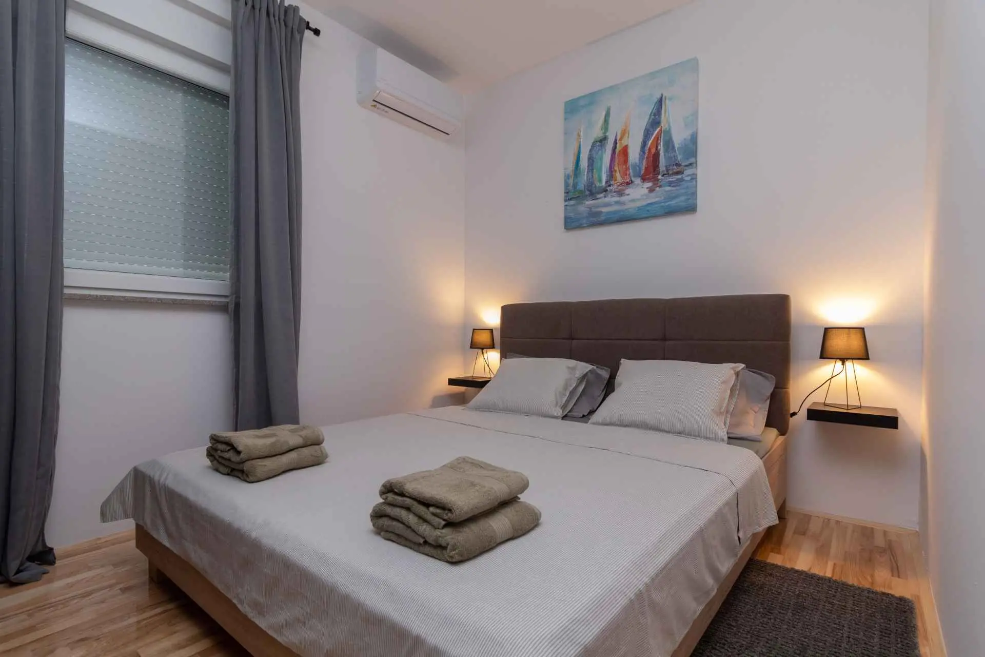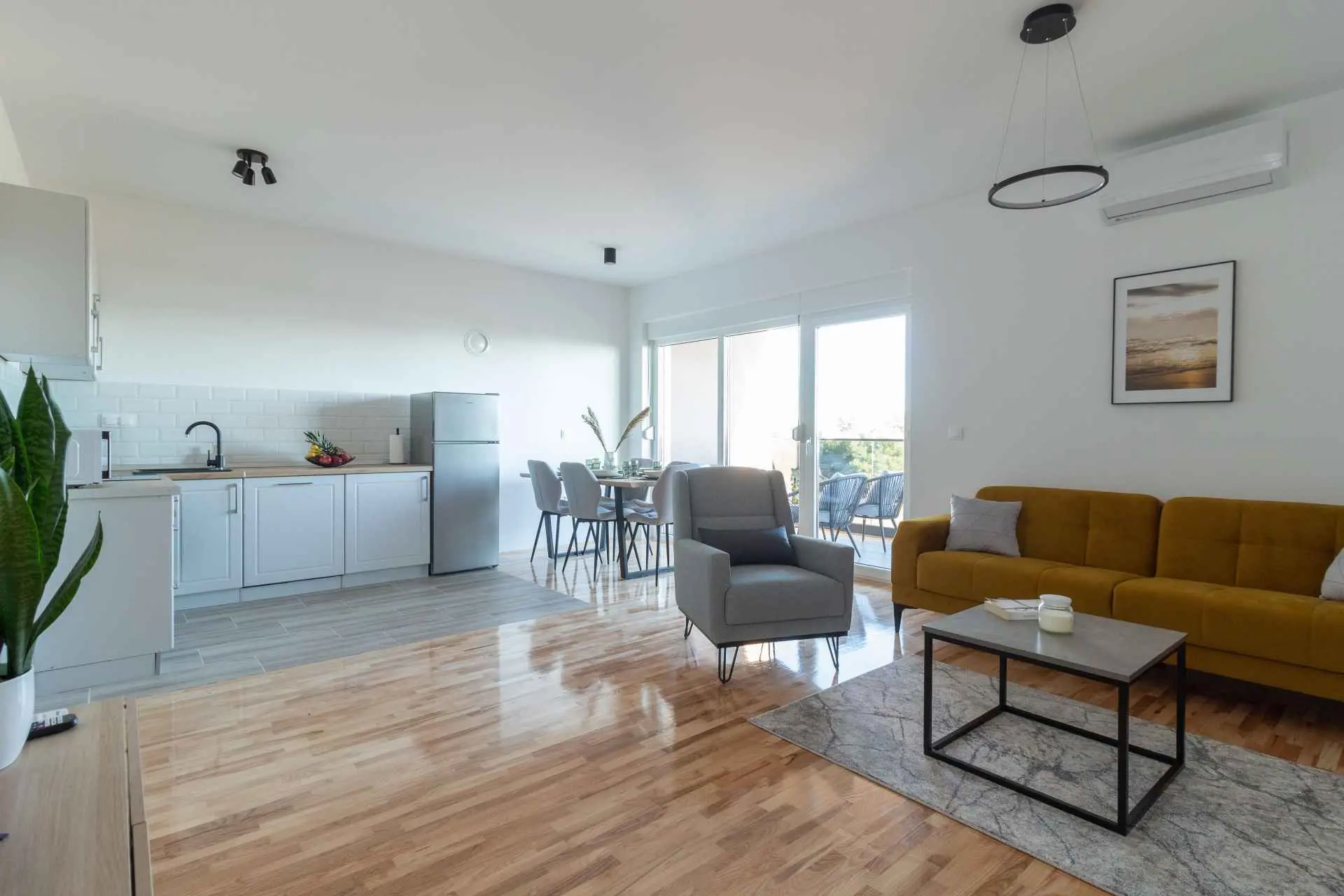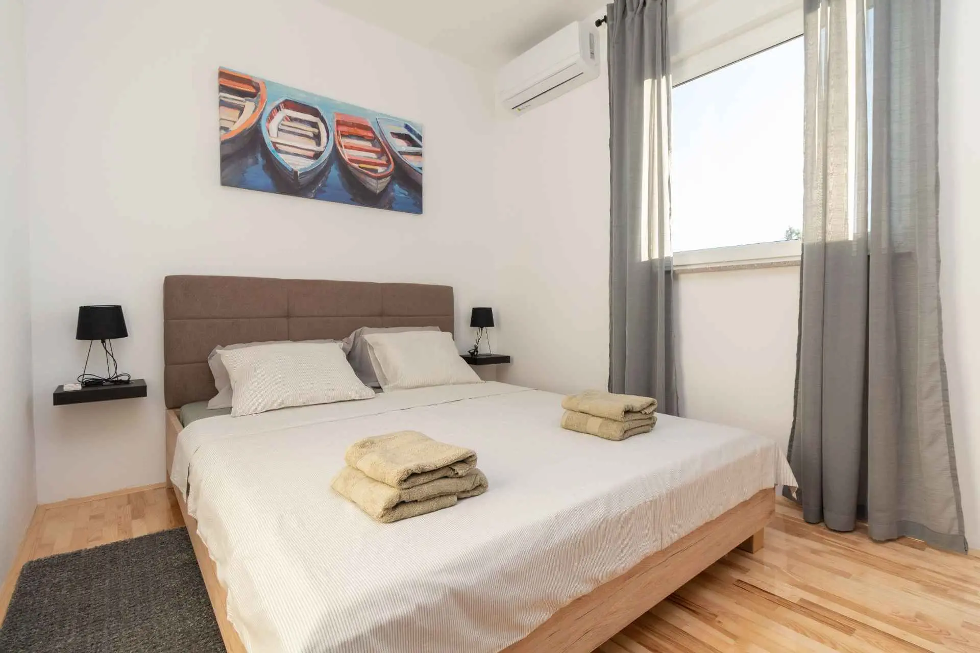 Apartments Dalmata are located in an excellent location in Privlaka near Zadar, just 150 meters from the sandy beach. The apartments have 2 bedrooms, a spacious living room with a kitchen, a bathroom, a toilet, a large balcony with a beautiful view of the sea. The building was newly built in 2023 and all the furniture is brand new. The apartments are equipped with all necessary facilities, flat screen TV with satellite channels, oven, stove, microwave oven, refrigerator with freezer, kettle, complete dishes, washing machine, hair dryer, each room has air conditioning and mosquito net. Free Wi-Fi and private parking are available to guests. In addition to the terrace, the apartment on the ground floor has its own garden, which is equipped with a barbecue, a children's playground and a solar shower, and a separate entrance/exit from the garden. Quality construction with new materials ensures a peaceful and pleasant stay in the apartment. Just a 2-minute walk from the sandy beach, there are restaurants, cafes and shops nearby. The apartments are 3 km from the historic town of Nin and 15 km from the world-famous town of Zadar. The nearest airport is only 30 km away.