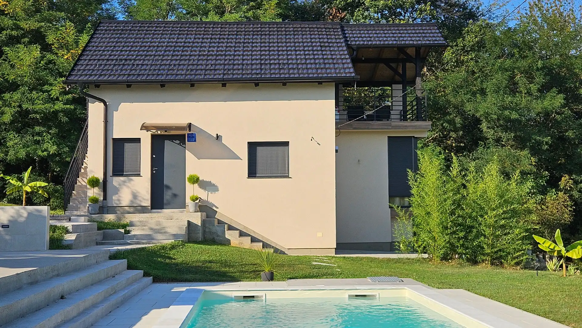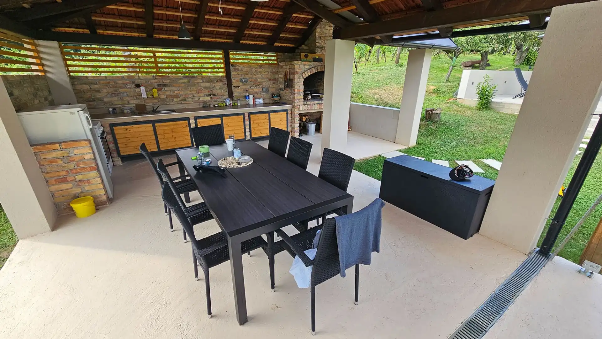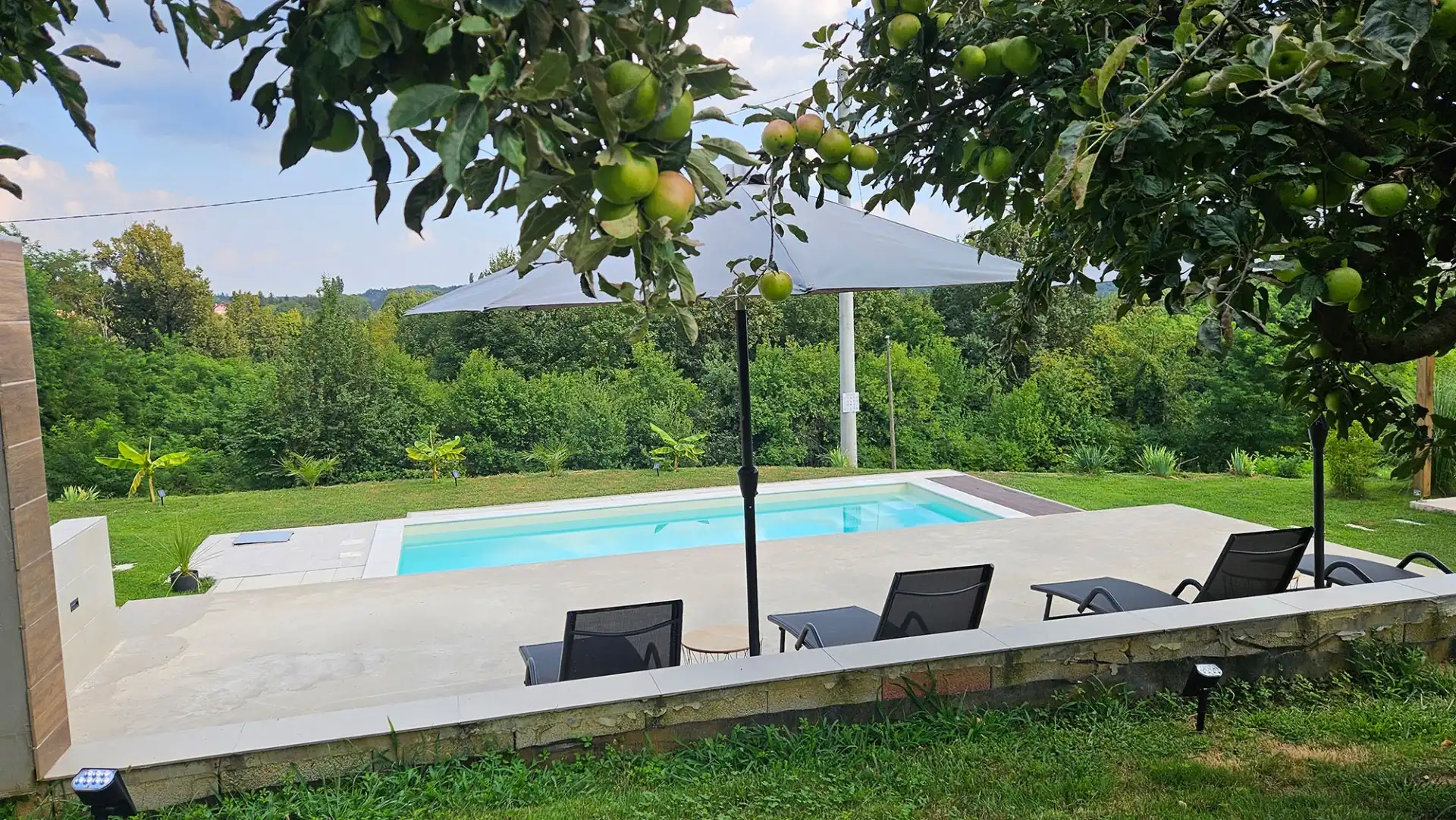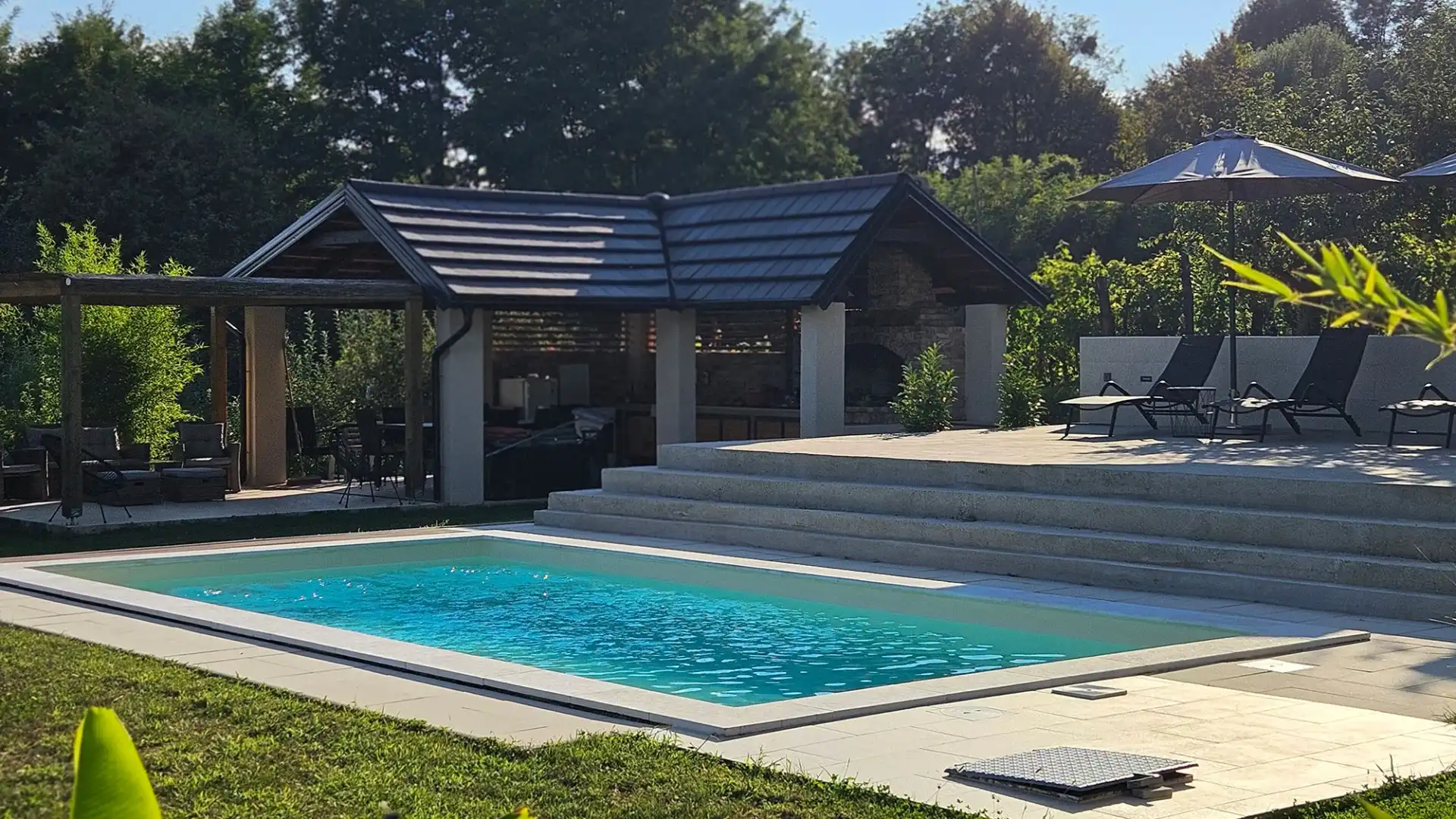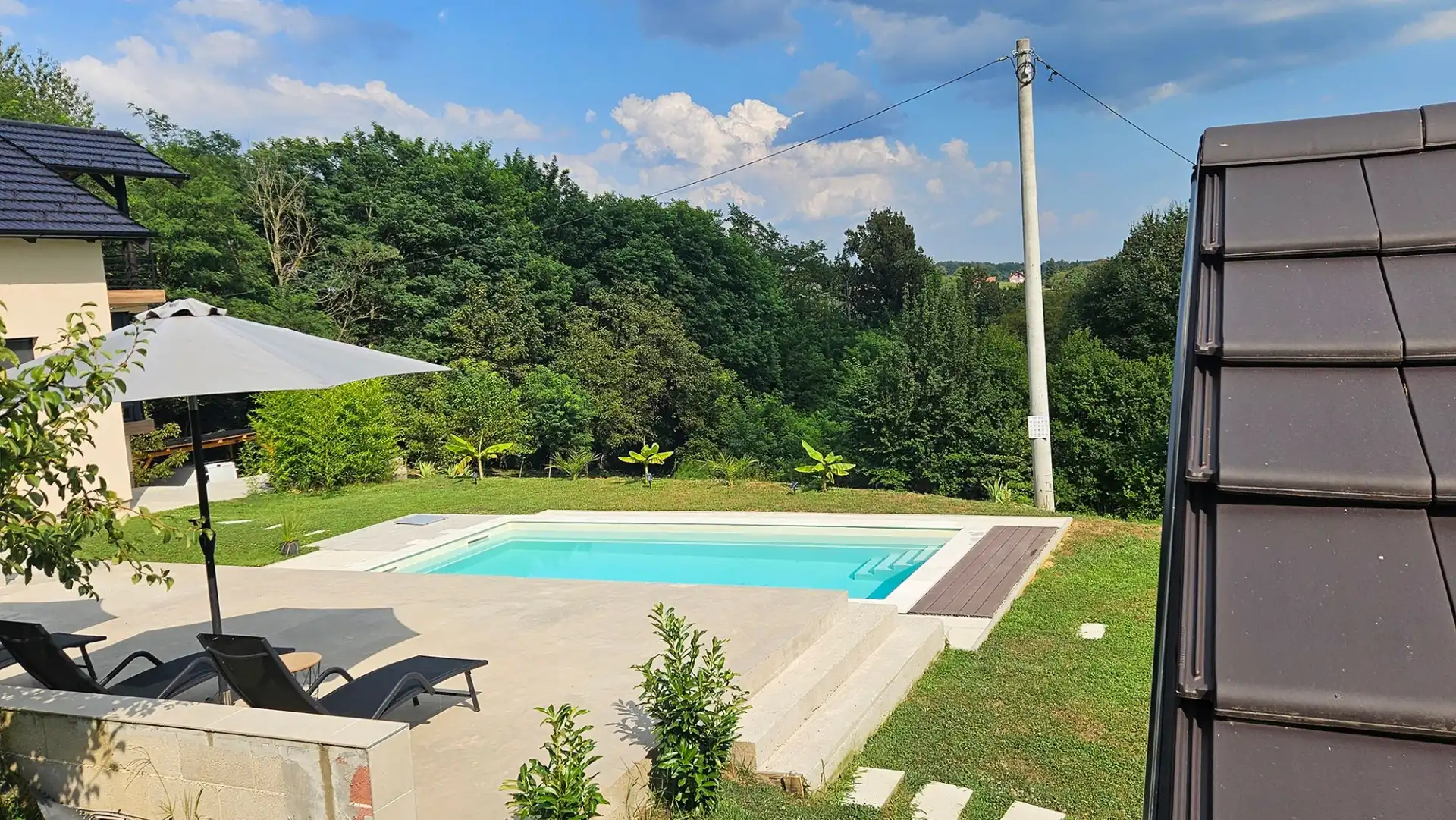 - Detached house 105m2 - Two terraces - Two bedrooms + living room (4+2) - Baby cot - Living room with kitchen (view of the forest and nature) - Bathroom with toilet - Separate toilet on the first floor - Hall - Gas central heating - Air conditioning 2x - TV x2 - Playstation 5 - Children's wooden toys - Yard 1500m2 - Children's park with swings, climbing frames and a slide - Hot tub for two people - outdoor - Heated pool 7x3.5m (1.5. - 1.10.) - Two terraces - Garden kitchen fully equipped (grill with equipment, sink with cold and hot water, fridge with freezer, electric oven, gas and electric stove, table with 8 seats, dishes, utensils, cutlery, basic spices - Sun deck with deck chairs, umbrellas and solar shower -