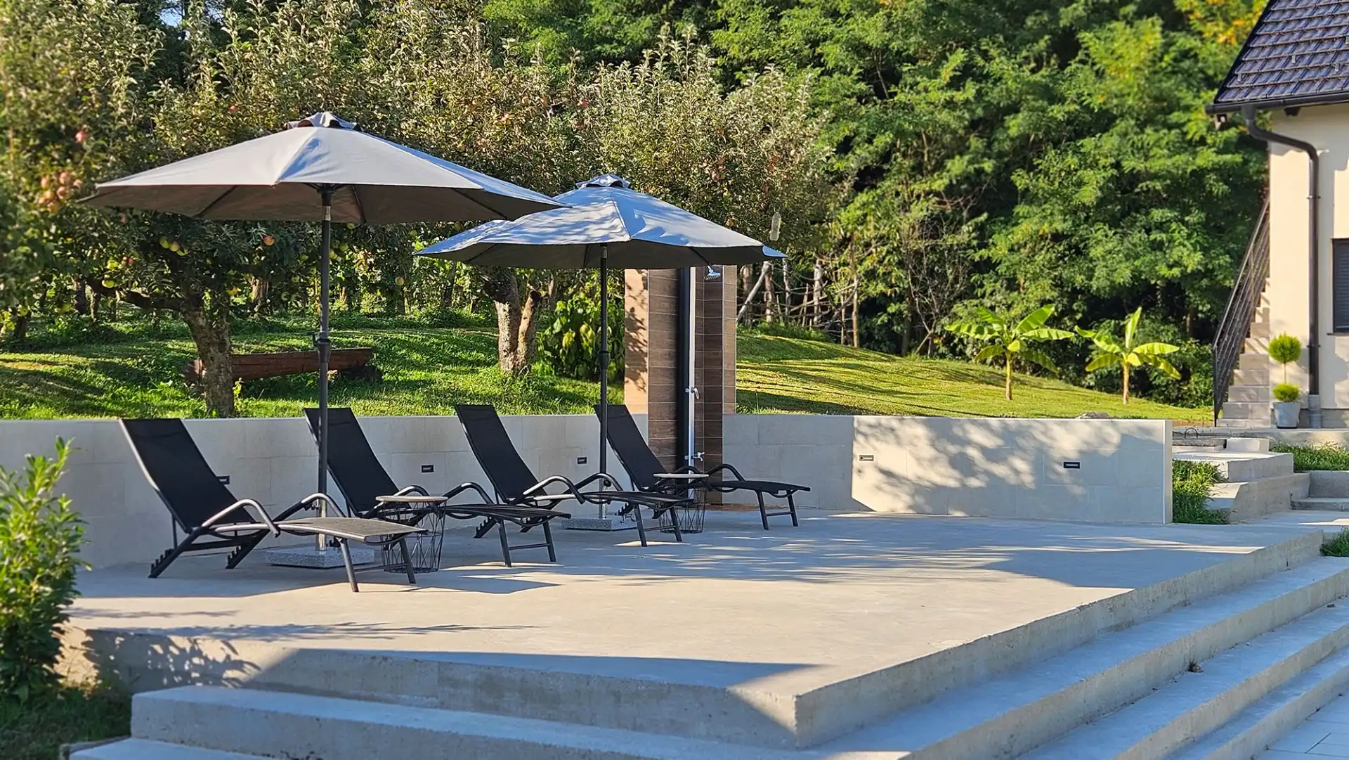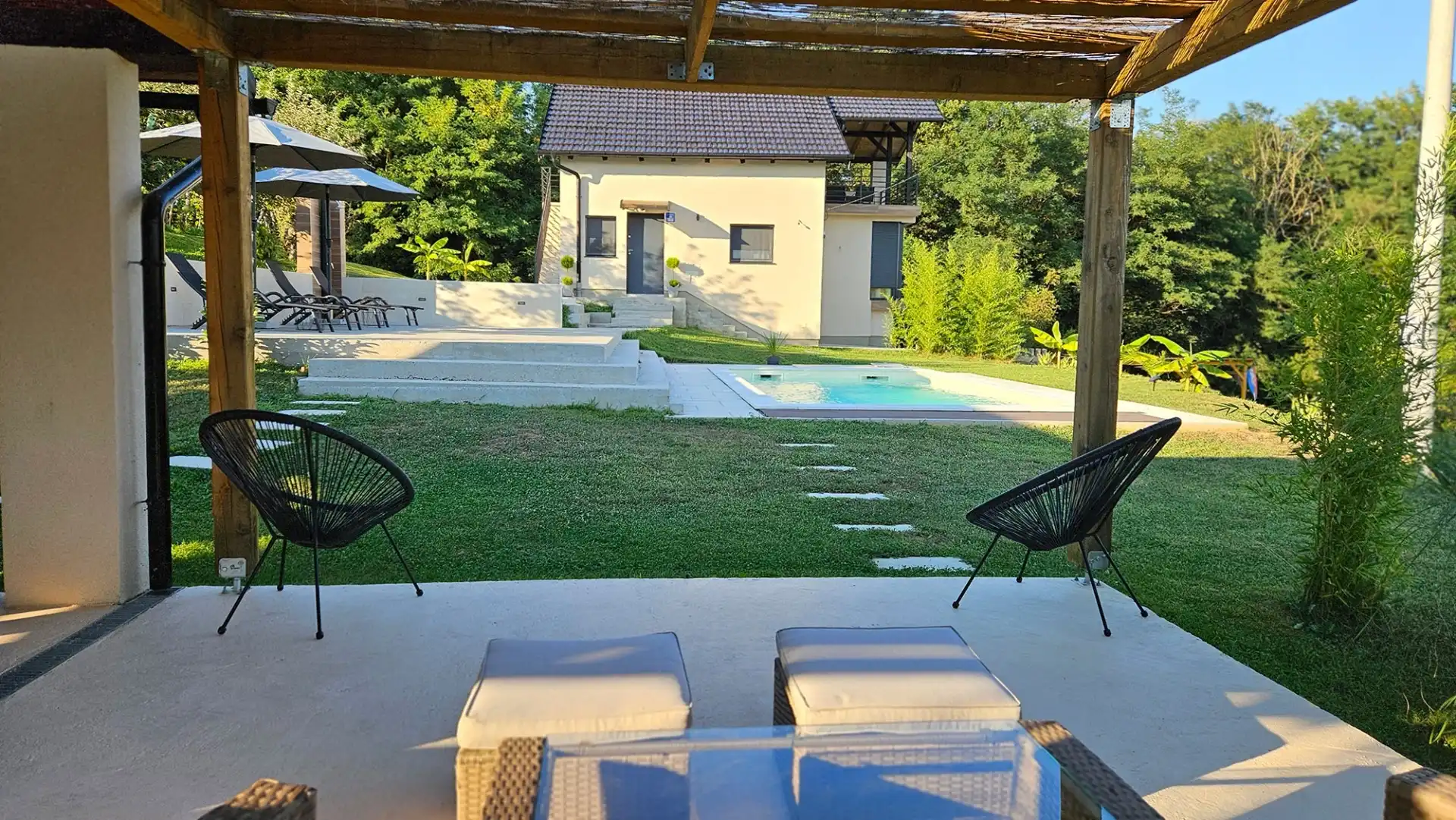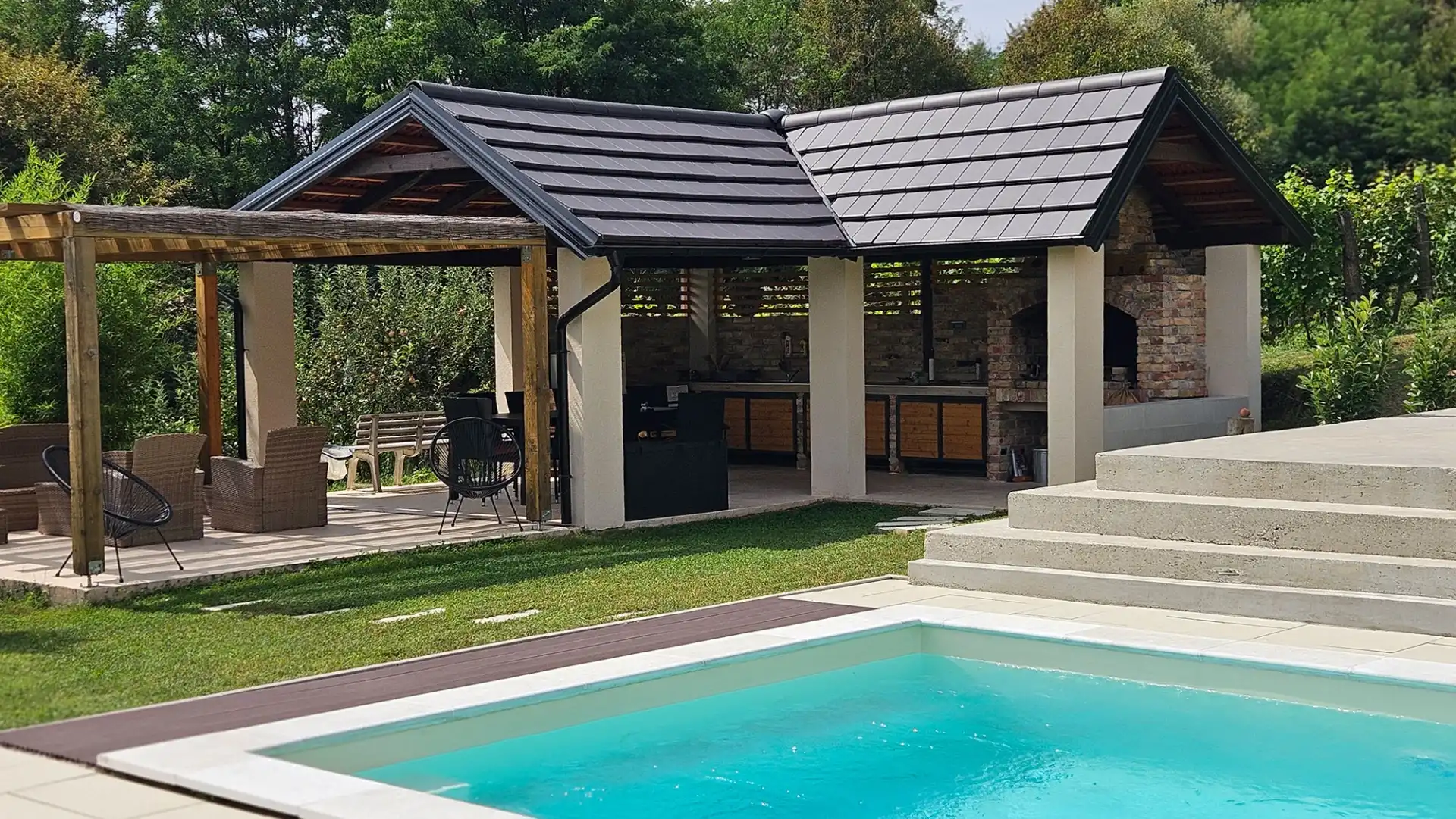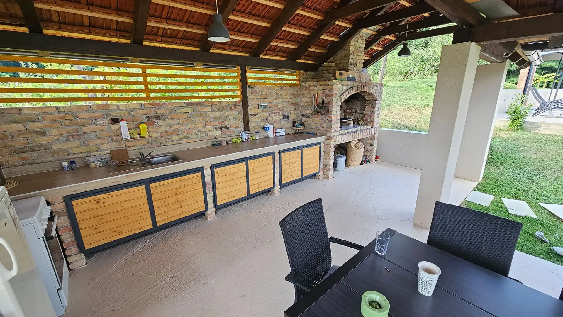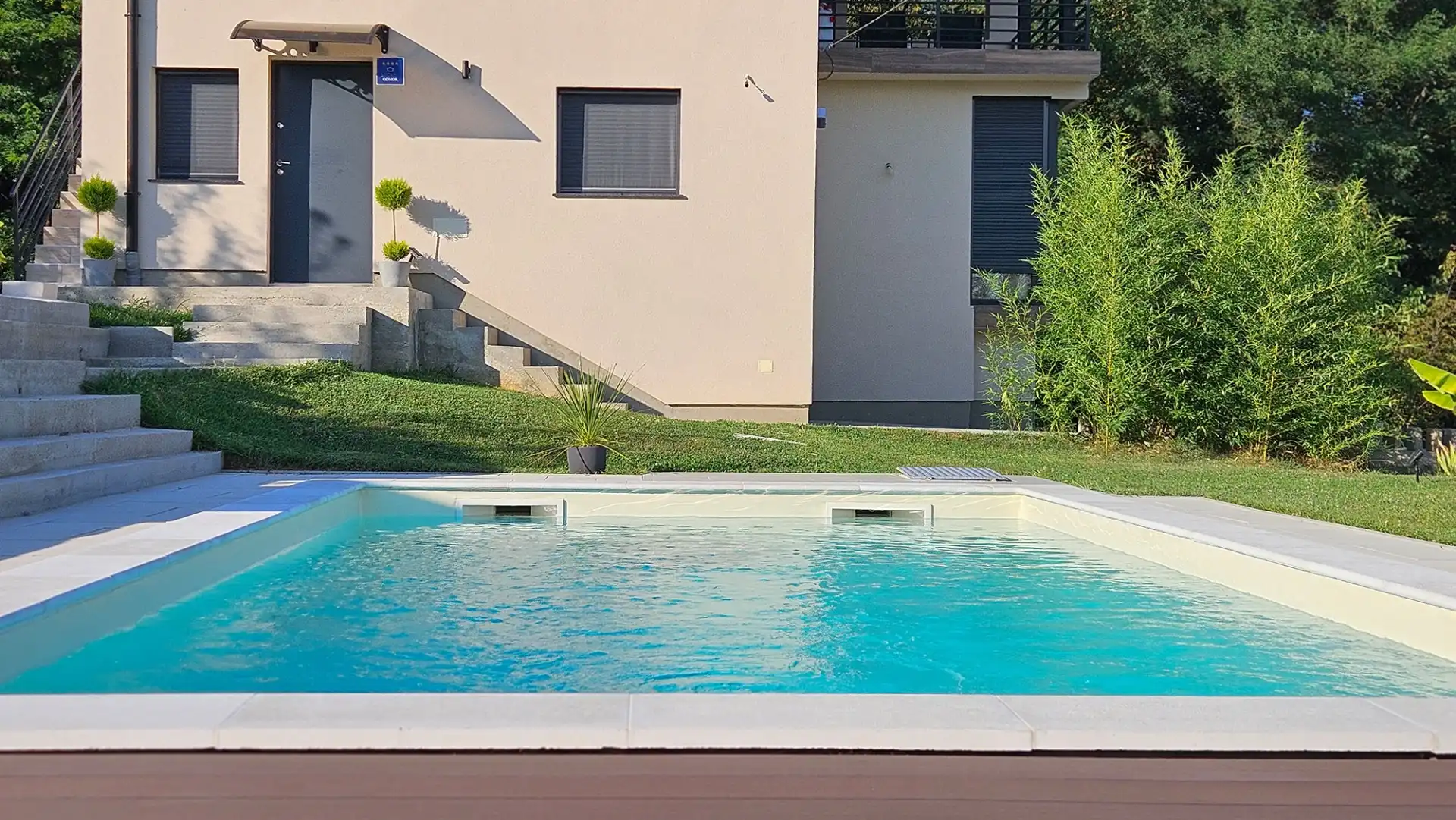 - Detached house 105m2 - Two terraces - Two bedrooms + living room (4+2) - Baby cot - Living room with kitchen (view of the forest and nature) - Bathroom with toilet - Separate toilet on the first floor - Hall - Gas central heating - Air conditioning 2x - TV x2 - Playstation 5 - Children's wooden toys - Yard 1500m2 - Children's park with swings, climbing frames and a slide - Hot tub for two people - outdoor - Heated pool 7x3.5m (1.5. - 1.10.) - Two terraces - Garden kitchen fully equipped (grill with equipment, sink with cold and hot water, fridge with freezer, electric oven, gas and electric stove, table with 8 seats, dishes, utensils, cutlery, basic spices - Sun deck with deck chairs, umbrellas and solar shower -
