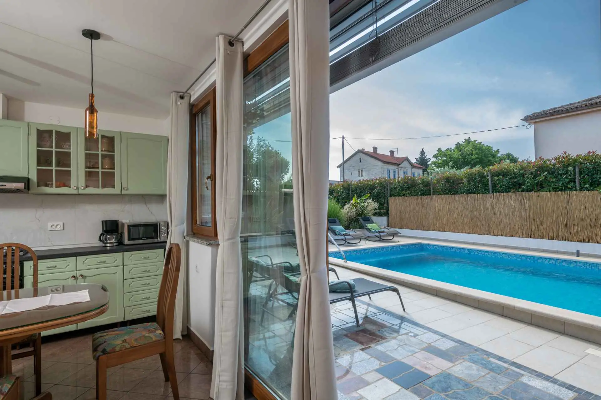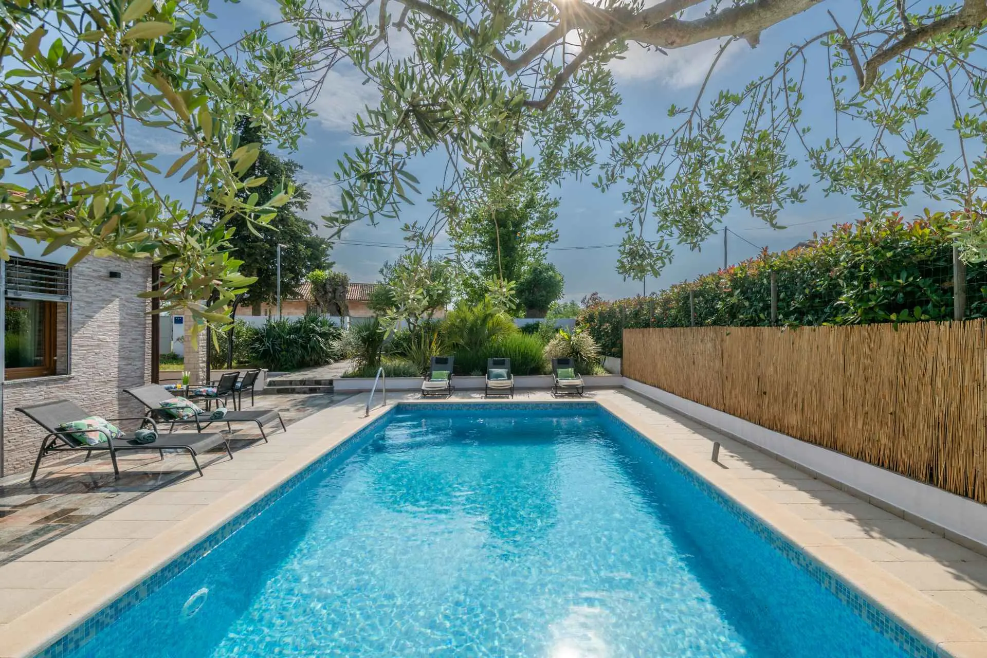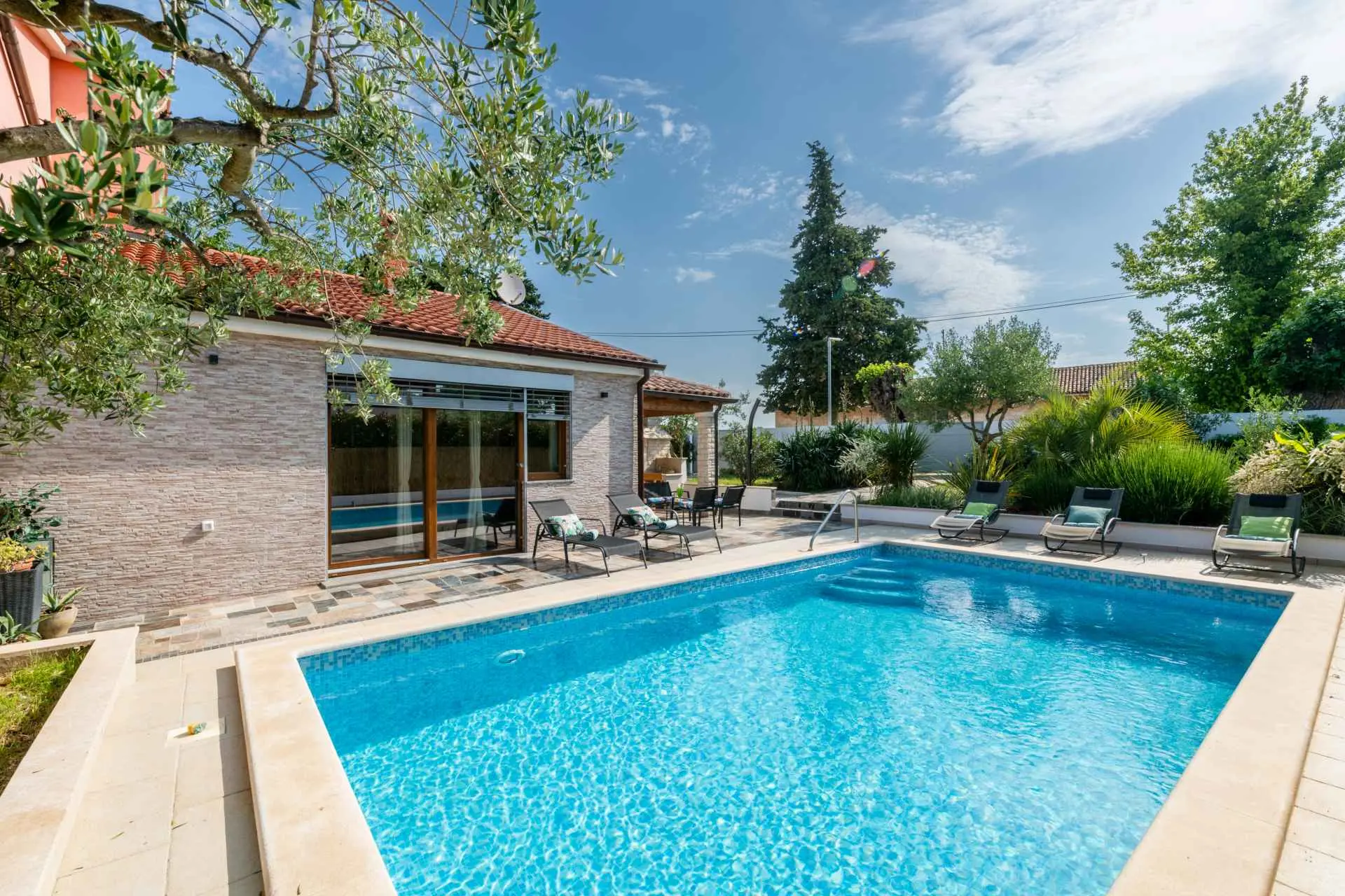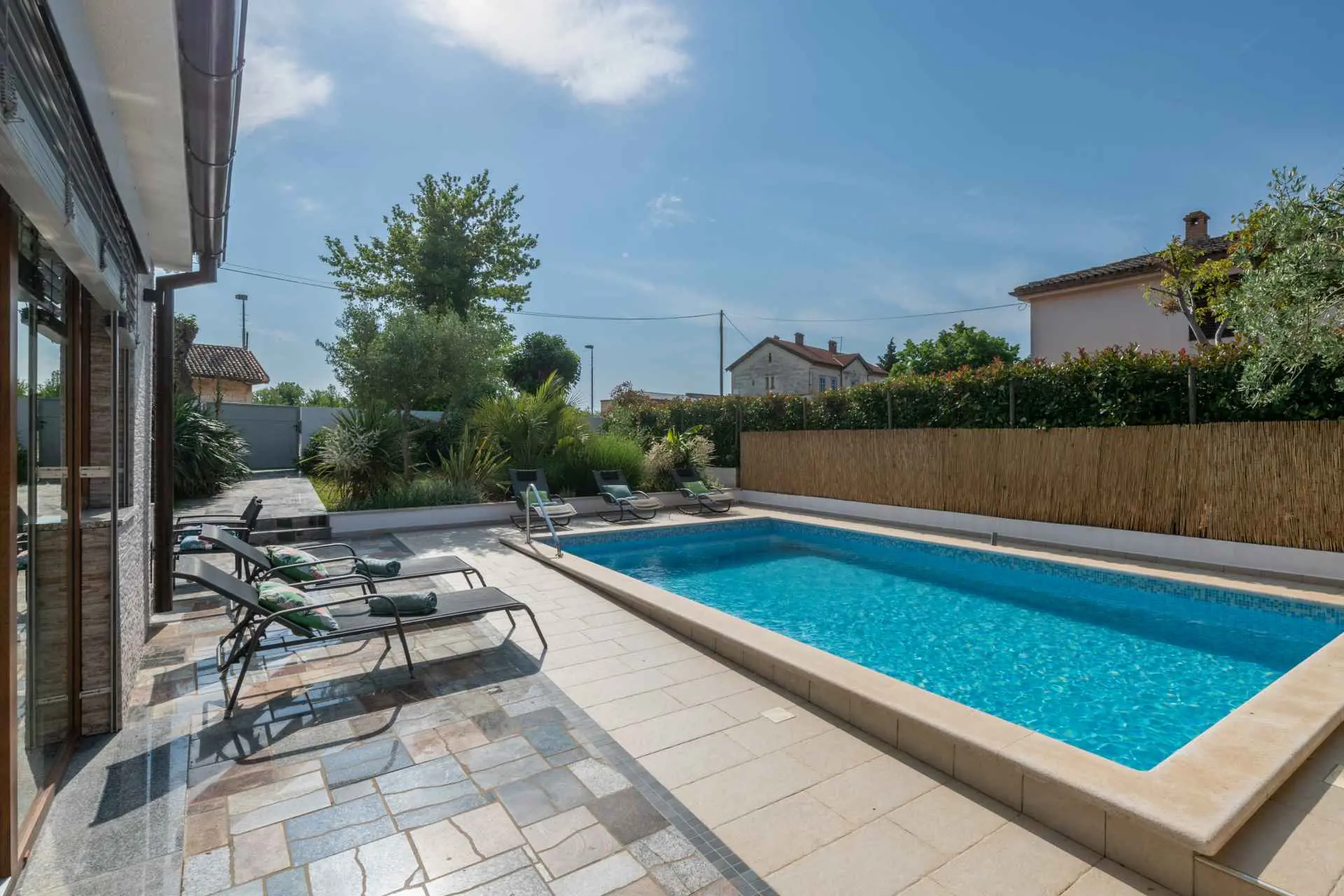 Discover Charming Holiday Home Mare, a family-friendly retreat nestled in the picturesque town of Vodnjan. This spacious 85m² house comfortably accommodates up to 5 guests, offering a perfect blend of comfort and convenience for families and friend groups. The house boasts a private swimming pool spanning 32m², providing a delightful space for relaxation and fun. Enjoy the beautifully landscaped garden and furnished terrace, ideal for outdoor dining and socialising. The fenced plot ensures privacy and safety for families with children. Inside, you'll find three well-appointed bedrooms featuring a mix of double, king-size, and individual beds. The American-style kitchen is fully equipped with modern appliances, including a dishwasher, oven, microwave, and coffee machine, allowing you to prepare delicious meals with ease. The living area features a smart TV with multiple language options and a cosy fireplace for those cooler evenings. Practical amenities include air conditioning in the lounge, free WiFi, and a private bathroom with a shower. Outdoor enthusiasts will appreciate the BBQ area, bicycle parking, and sunloungers. The house provides essential items like a travel crib, ironing board, and cleaning products to ensure a comfortable stay. Located just 600 metres from the town centre, supermarket, restaurants, and bus stop, house Mare offers convenient access to local attractions. The rock beach is a short 7.2 km away, perfect for day trips. With private parking for three vehicles and a designated smoking area, this house promises a memorable and comfortable holiday experience.