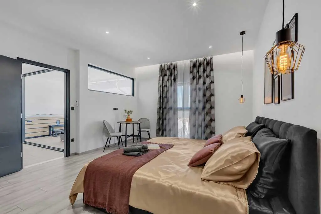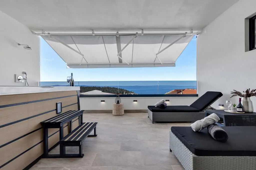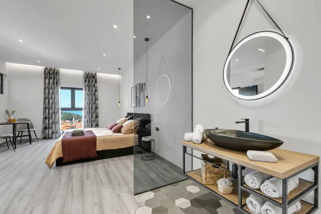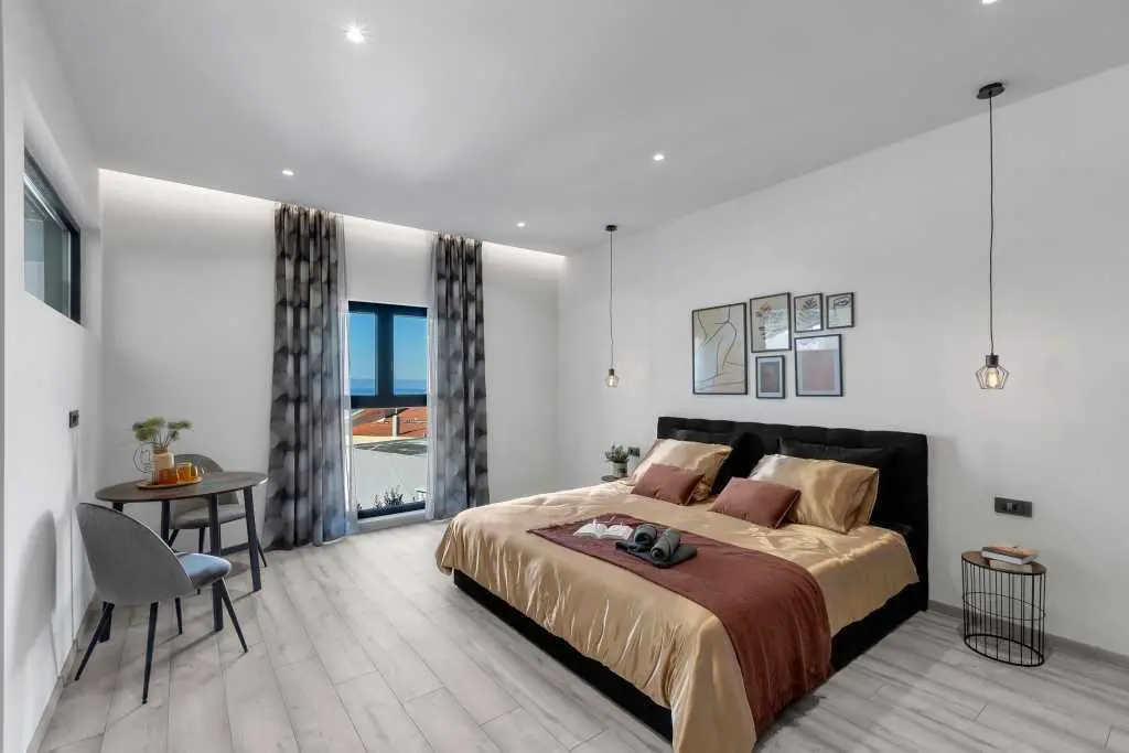 Chers invités, Bienvenue dans notre appartement de luxe 'Black Pearl' L'appartement a été achevé en 2022. L'appartement fait 100m2 et comprend une chambre de luxe avec un lit boxspring 200x200cm et une salle de bain attenante, une cuisine entièrement équipée, un grand salon et des WC supplémentaires. Le grand balcon couvert offre une superbe vue sur le port et la vieille ville ainsi qu'un beau jacuzzi 220x220cm, des bains de soleil et une douche. Un parking couvert se trouve devant l'immeuble. Le port est à 500 mètres et la plage principale à 800 mètres. Nous nous réjouissons de vous accueillir bientôt. Tina et Robert