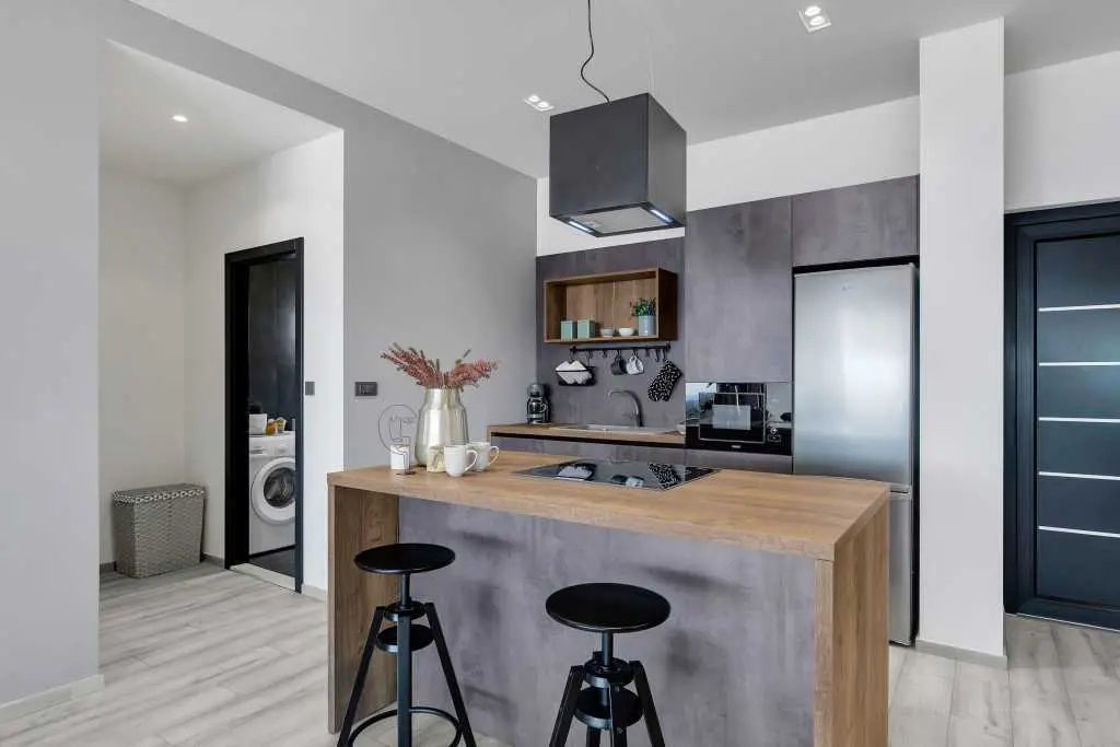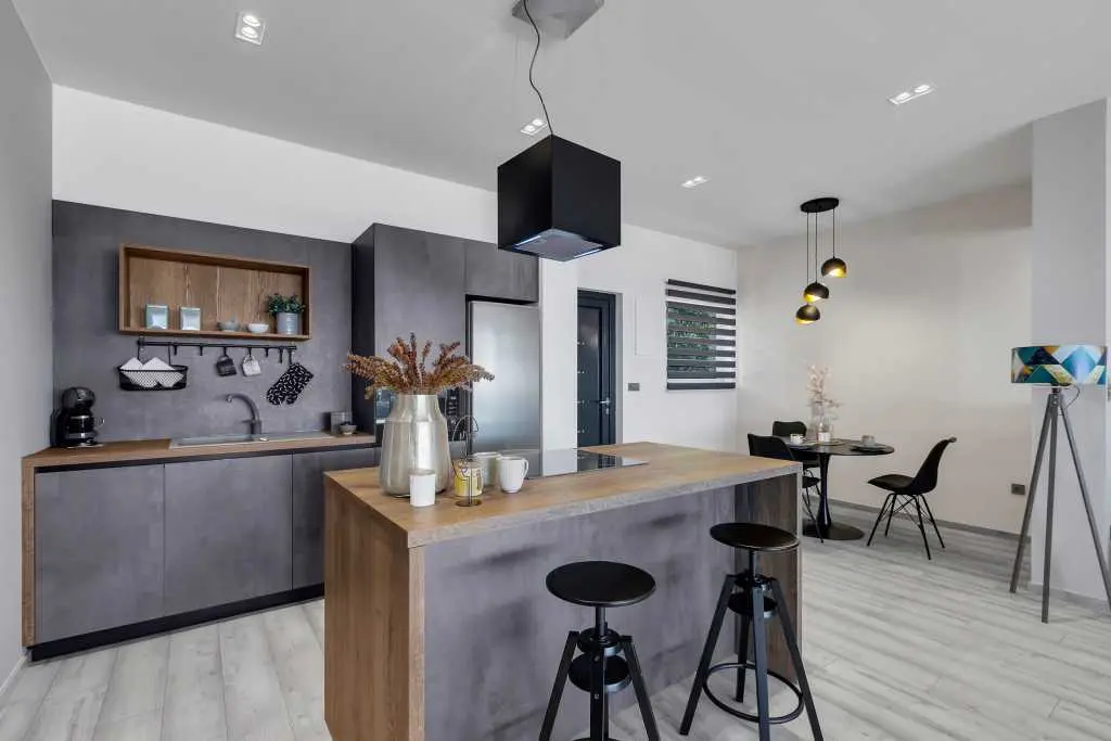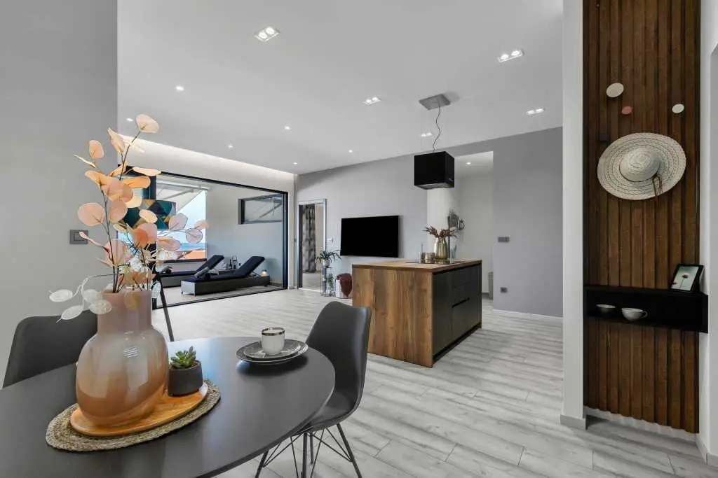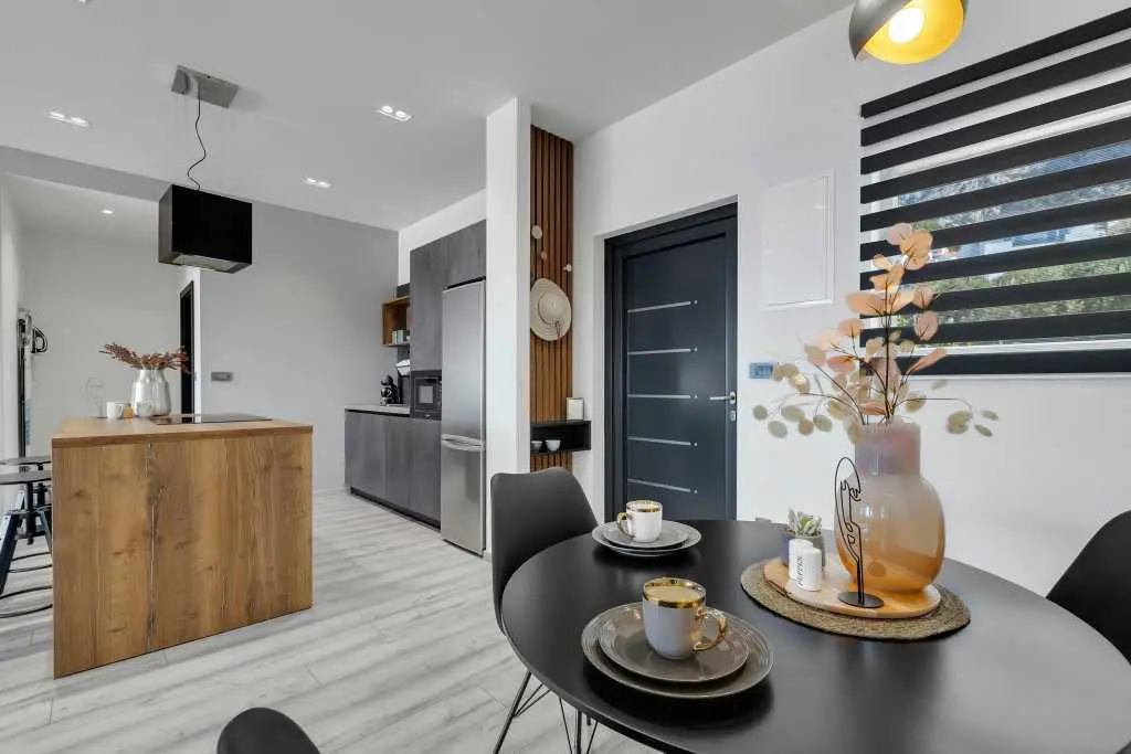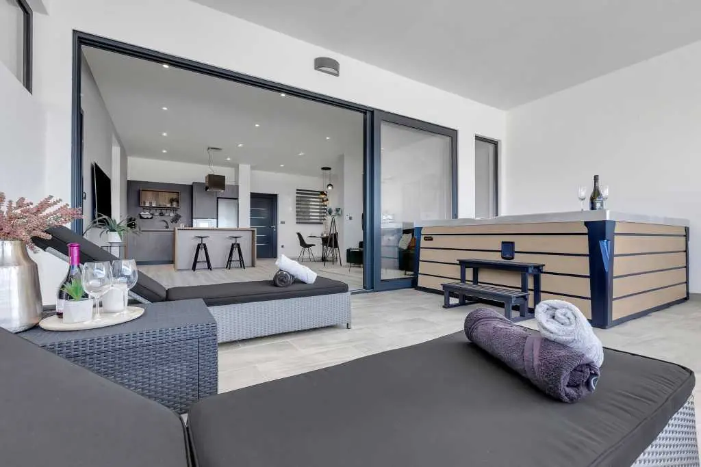 Chers invités, Bienvenue dans notre appartement de luxe 'Black Pearl' L'appartement a été achevé en 2022. L'appartement fait 100m2 et comprend une chambre de luxe avec un lit boxspring 200x200cm et une salle de bain attenante, une cuisine entièrement équipée, un grand salon et des WC supplémentaires. Le grand balcon couvert offre une superbe vue sur le port et la vieille ville ainsi qu'un beau jacuzzi 220x220cm, des bains de soleil et une douche. Un parking couvert se trouve devant l'immeuble. Le port est à 500 mètres et la plage principale à 800 mètres. Nous nous réjouissons de vous accueillir bientôt. Tina et Robert
