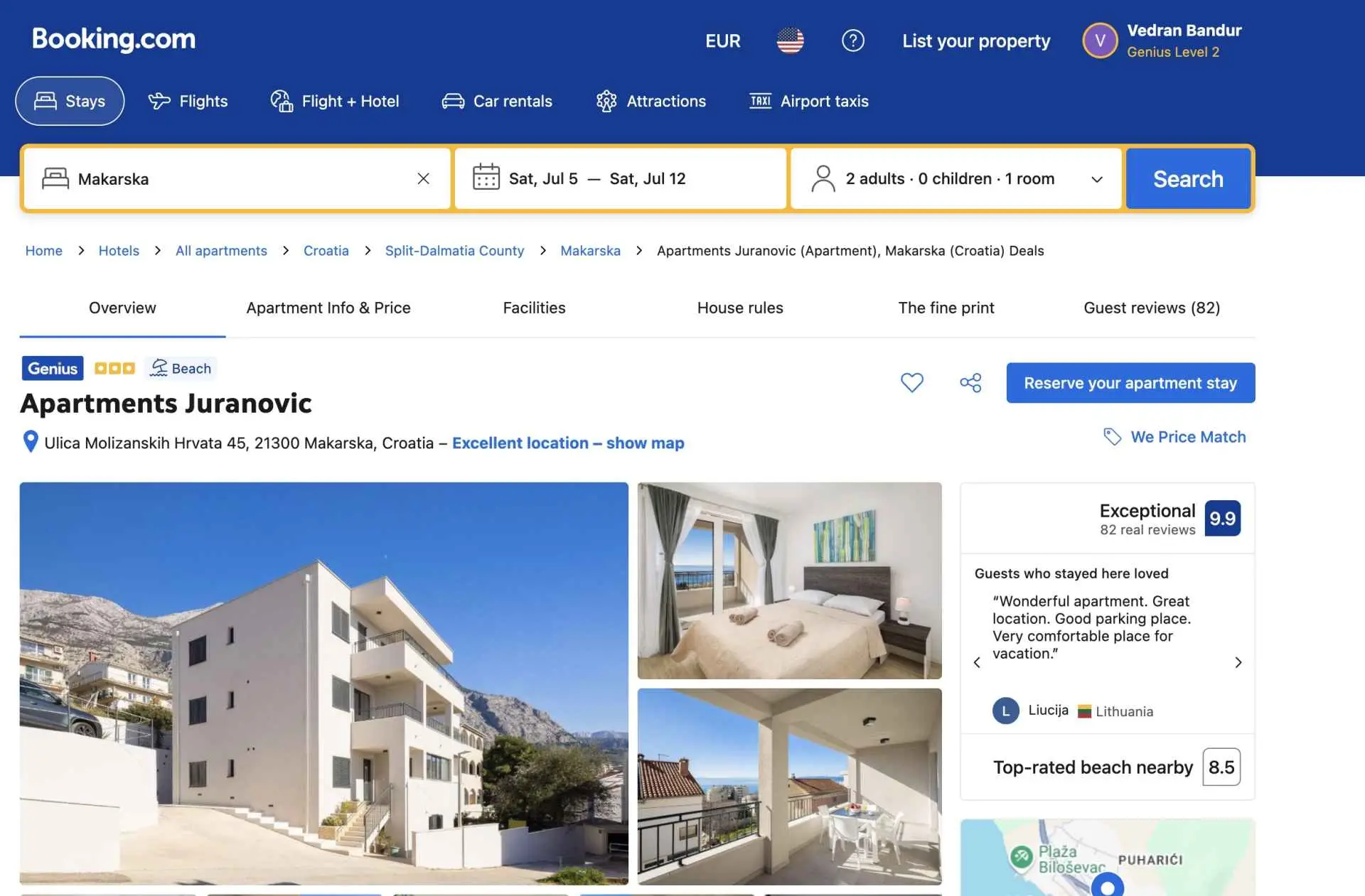 Situé à Makarska, à seulement 300 mètres de la plage de Makarska, l'Apartments Juranovic propose un hébergement avec vue sur la mer, une connexion Wi-Fi gratuite et un parking privé gratuit. Bénéficiant d'une terrasse, l'appartement se trouve à proximité de plusieurs attractions populaires, à environ 700 mètres de la plage de Ratac, à moins de 1 km de la plage Saint-Pierre et à 4 minutes à pied de la gare routière principale de Makarska. Les sièges extérieurs vous permettront de vous asseoir dehors et de profiter du beau temps. Tous les logements du complexe d'appartements sont équipés de la climatisation, d'un coin salon, d'une télévision par satellite à écran plat, d'une cuisine, d'un coin repas et d'une salle de bains privative avec sèche-cheveux et douche. Un four, un réfrigérateur, des plaques de cuisson et une bouilloire sont également disponibles. Le linge de lit et les serviettes de toilette sont fournis. Les sites d'intérêt à proximité de l'appartement incluent la promenade Riva de Makarska, le phare de Saint-Pierre et le monastère franciscain de Makarska. L'aéroport de Brač est à 33 km.