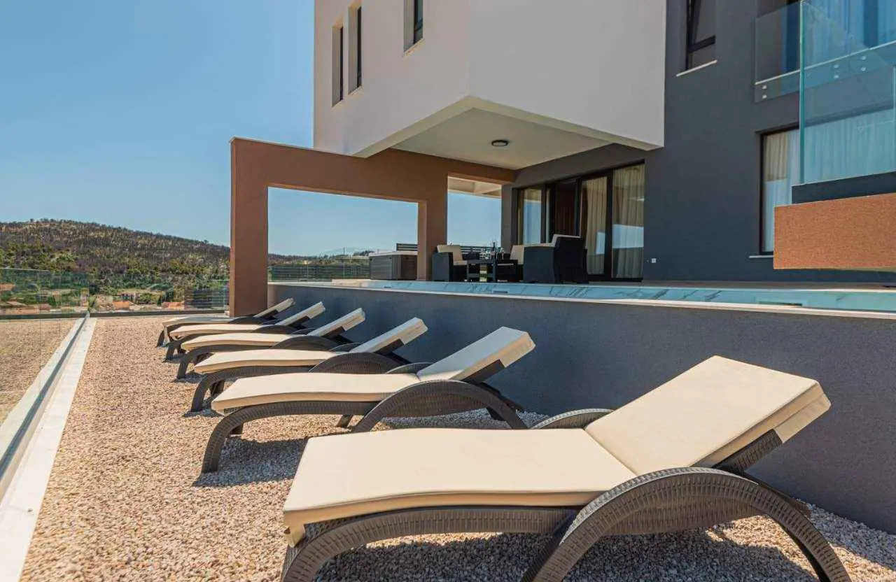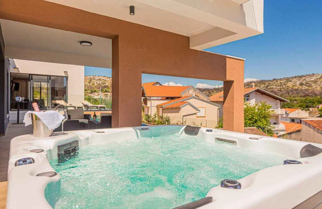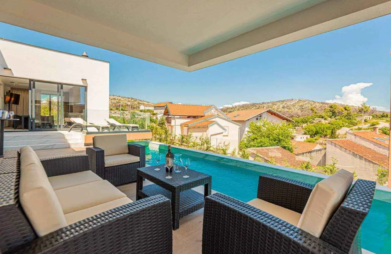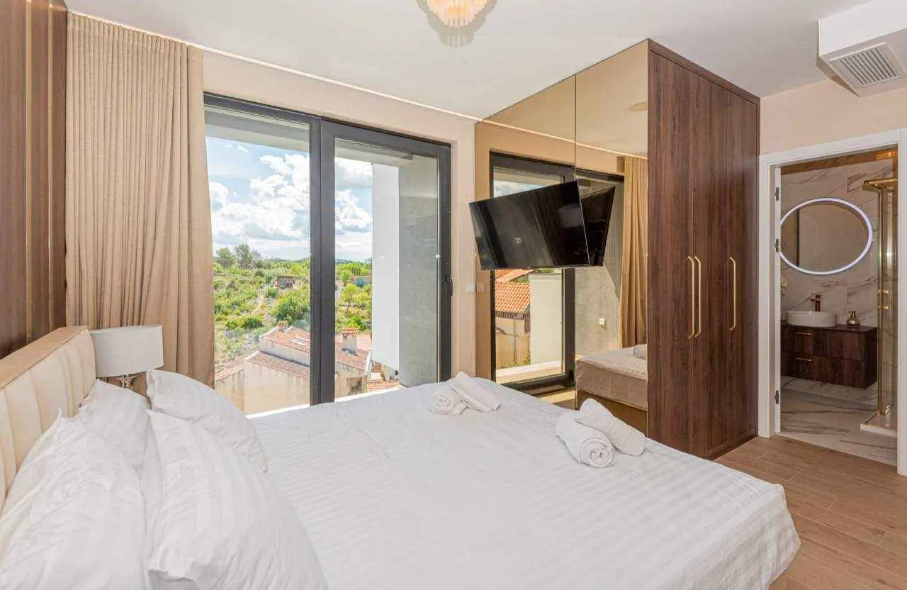 Évadez-vous dans notre superbe villa dans la charmante ville de Zaton ! Cette propriété moderne et magnifique allie confort et luxe, avec une gamme d'équipements haut de gamme pour un séjour inoubliable. Plongez dans un intérieur spacieux et bien aménagé, où vous trouverez 4 chambres douillettes, chacune dotée de son propre charme. Installez-vous confortablement dans les lits moelleux, avec un choix de lits king-size ou queen-size, et réveillez-vous frais et dispos, prêt à explorer la région. La villa dispose de 3 salles de bains, avec douche et toilettes séparées, garantissant intimité et confort à tous les hôtes. Profitez de la chaleur apaisante du sauna privé ou détendez-vous dans le jacuzzi, idéal pour un moment de détente après une journée d'aventure. À l'extérieur, vous serez accueilli par une magnifique oasis de verdure. Profitez du soleil sur les confortables chaises longues ou allumez le barbecue pour un délicieux repas en plein air. La piscine privée de 13 x 3 mètres est l'endroit idéal pour se rafraîchir et profiter d'une baignade rafraîchissante. La cuisine moderne de la villa est équipée de tout le nécessaire, notamment d'un réfrigérateur, d'un congélateur, d'un four, d'un lave-vaisselle et bien plus encore, pour concocter de délicieux repas en toute simplicité. Savourez vos créations culinaires dans la spacieuse salle à manger ou sur le balcon, en admirant la vue magnifique. Restez connecté grâce au Wi-Fi haut débit et divertissez-vous grâce aux multiples téléviseurs à écran plat. Un bureau, une planche à repasser et un extincteur sont également à votre disposition pour votre confort et votre sécurité. Entourée d'un charmant jardin et d'un terrain clôturé, la villa offre un havre de paix et d'intimité. Explorez les attractions à proximité, notamment la magnifique plage de Zvizda, à seulement 2 kilomètres, et le centre animé de Zaton, à seulement 450 mètres à pied. Que vous recherchiez une escapade relaxante ou des vacances pleines d'aventure, notre villa à Zaton a tout pour plaire. Réservez votre séjour dès aujourd'hui et découvrez l'alliance parfaite du confort, du luxe et de la beauté naturelle. Le Wi-Fi et la climatisation sont gratuits. La climatisation est présente dans toute la maison. Le parking est gratuit et disponible sur place. Les animaux de compagnie ne sont pas admis. Il est interdit de fumer dans la maison, uniquement à l'extérieur. Un lit bébé est disponible. La maison est divisée en rez-de-chaussée et premier étage. Occupation maximale : 8 adultes + 1 bébé. Espace repas extérieur avec barbecue, télévision à écran plat et bar à vin. Jacuzzi, piscine et sauna sont disponibles. Télévision à écran plat avec accès Internet et Netflix. Quatre chambres, quatre télévisions, deux salles de bains privatives, une salle de bains séparée et des toilettes séparées. Deux chambres ont accès à la terrasse. Belle vue sur Zaton. Surveillance vidéo à l'extérieur de l'établissement.