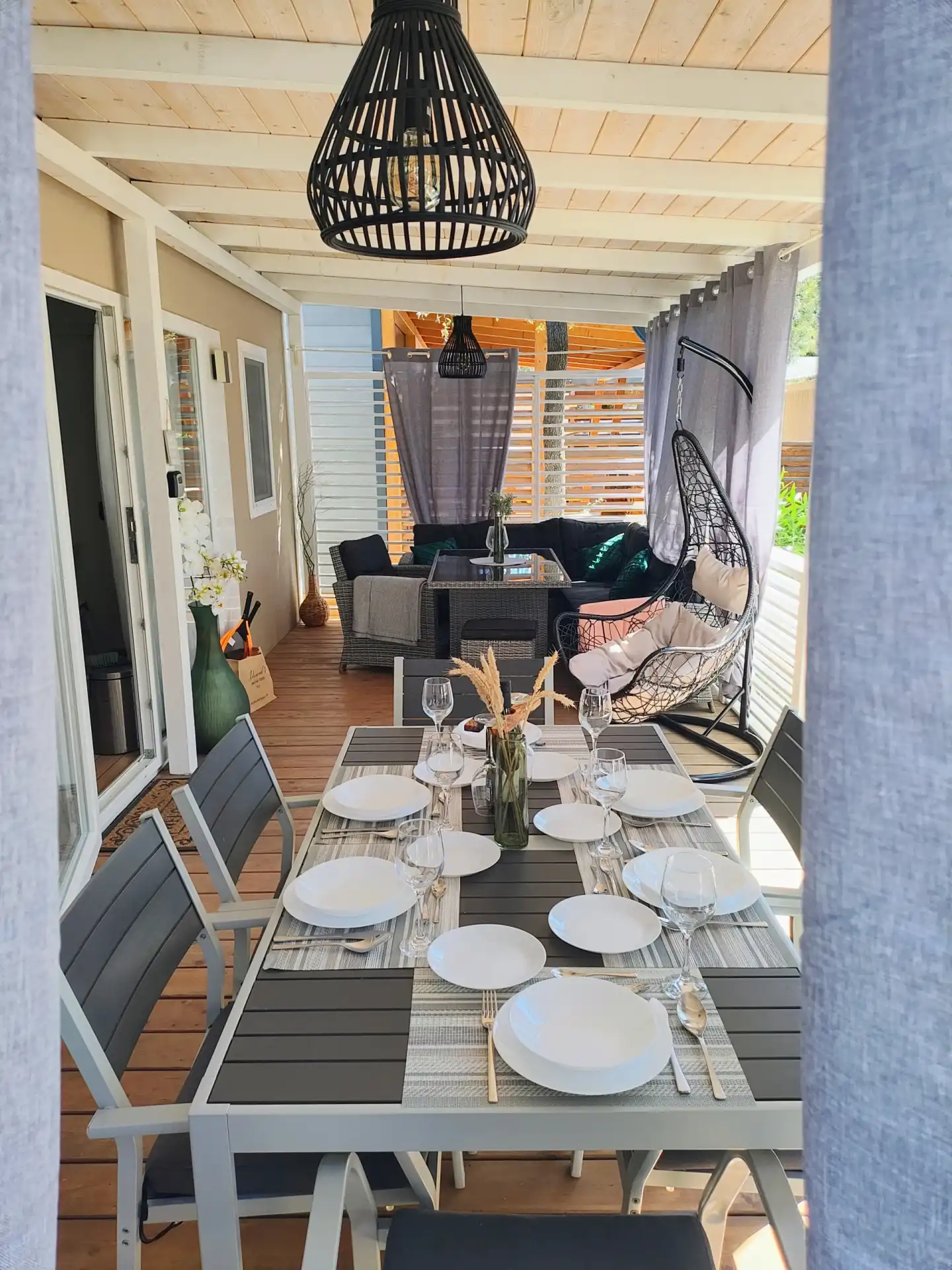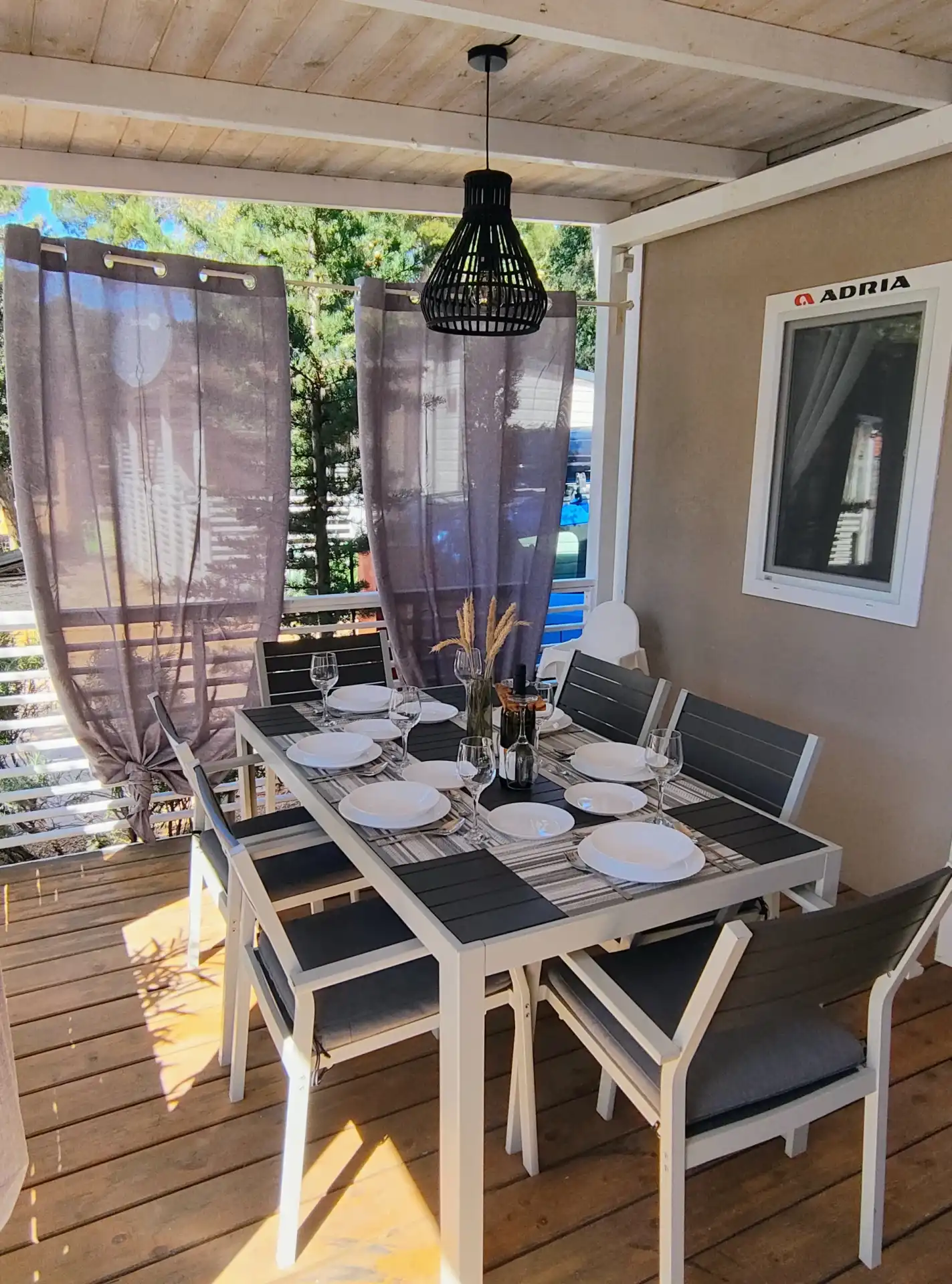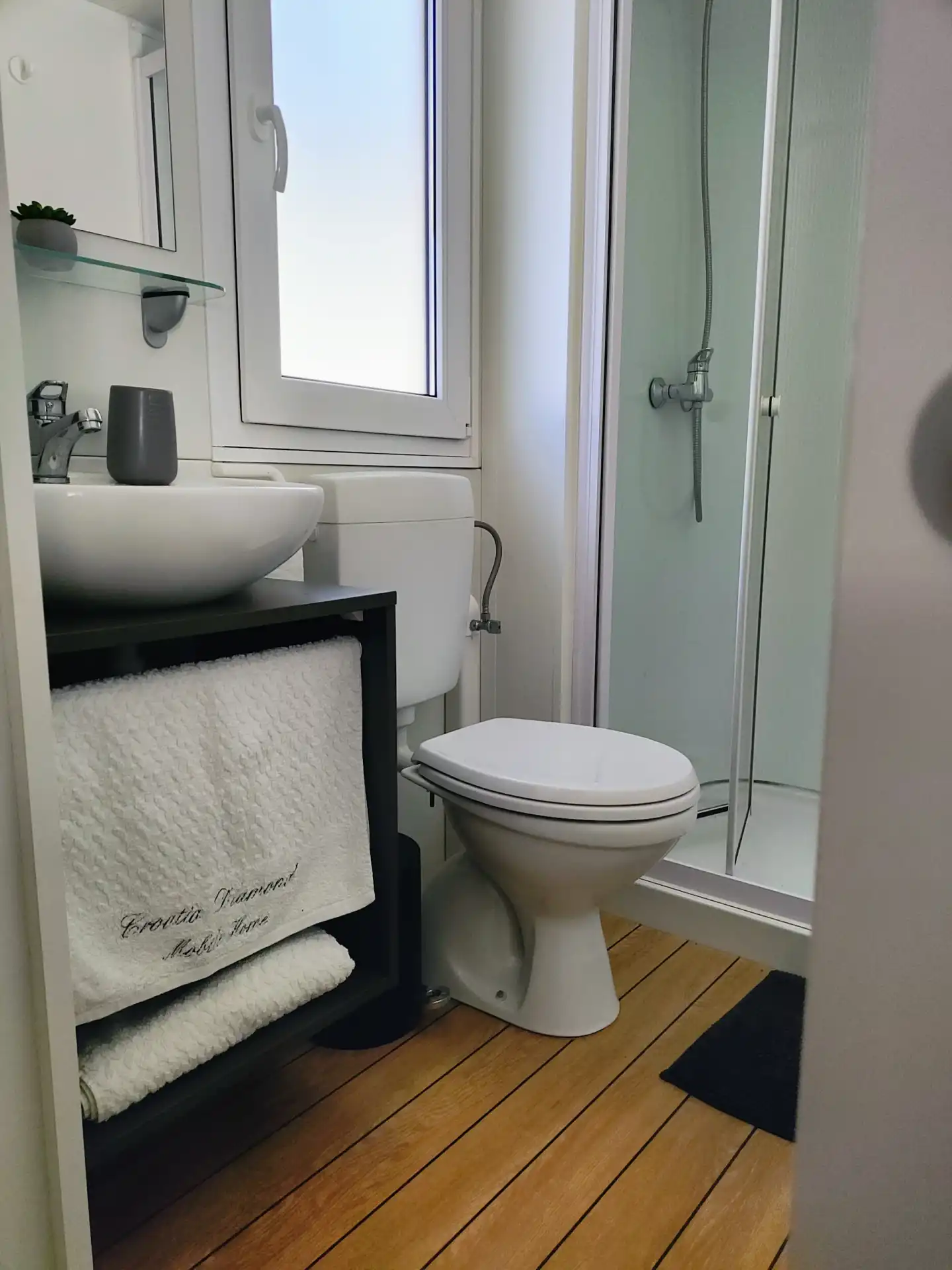 Naša moderno opremljena mobilna kućica nudi udoban smještaj za do 7 osoba, s 2 prostrane spavaće sobe, dnevnim boravkom sa kaučem na razvlačenje i 2 kupaonice. Uživajte na velikoj natkrivenoj terasi opremljenoj prostorom za objedovanje i vanjskim dnevnim boravkom, idealnom za duga noćna druženja. Ovdje možete uživati dok roštiljate na našem velikom plinskom roštilju i kuhalu na otvorenom. Natkrivena terasa okružena je borovima i blagim povjetarcem s mora. Sa jedne strane terase nalazi se prostrani prostor za objedovanje opremljen stolom i 6 stolica, a s druge strane, naš dnevni boravak vani nudi udobnu garnituru za sjedenje na kojoj možete odmoriti se. U kućici možete uživati u omiljenim TV emisijama na TV-u s dostupnim satelitskim TV kanalima, Netflixom i HBO GO-om. ℹ️Velika natktivena terasa sa prostorom za objedovanje i vanjskim dnevnim boravkom ℹ️ Veliki plinski roštilj + plinsko kuhalo ℹ️Potpuno opremljena kuhinja (hladnjak, mikrovalna pećnica, plinski štednjak, kuhalo za vodu, aparat za kavu, perilica posuđa, toster, svo potrebno posuđe) ℹ️Dnevni boravak sa velikim TV-om ℹ️Besplatan WI-FI, SAT TV, klima ℹ️Udobna posteljina i ručnici ℹ️ Fen, pegla ℹ️ Hranilica za djecu ℹ️1 parkirno mjesto, drugo parkirno mjesto uz doplatu Kampu Mobile Home Croatia Diamond nalazi se na samo 3 minute hoda do pješčane i šljunčane plaže te 10 minuta šetnje do centra Biograda. U kampu i njegovoj blizini nalazi se sve što vam je potrebno za opušteni odmor – od trgovina i restorana do sportskih terena i dječjih igrališta. A najveći gušt je upravo uživanje u suncu i moru, kao i mogućnost odlaska na izlete u atraktivne nacionalne parkove poput NP Krka, NP Kornati, NP Paklenica, ili povijesne gradove poput Zadra i Šibenika, a u neposrednoj blizini nalazi se i Vransko jezero koje je atraktivno kao za obiteljske izlete, tako i za ljubitelje ribolova!