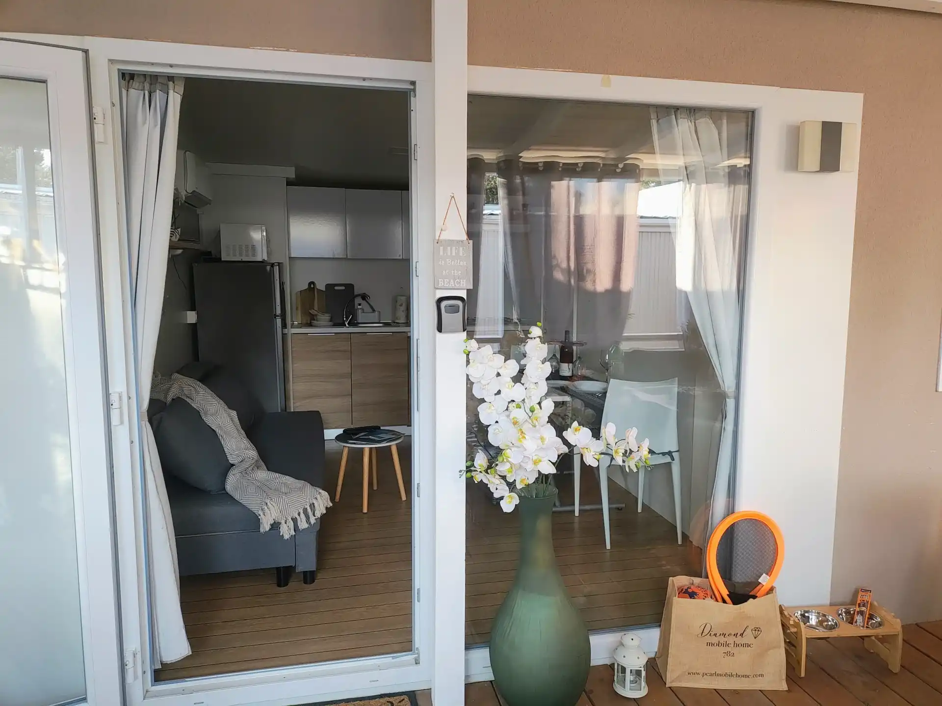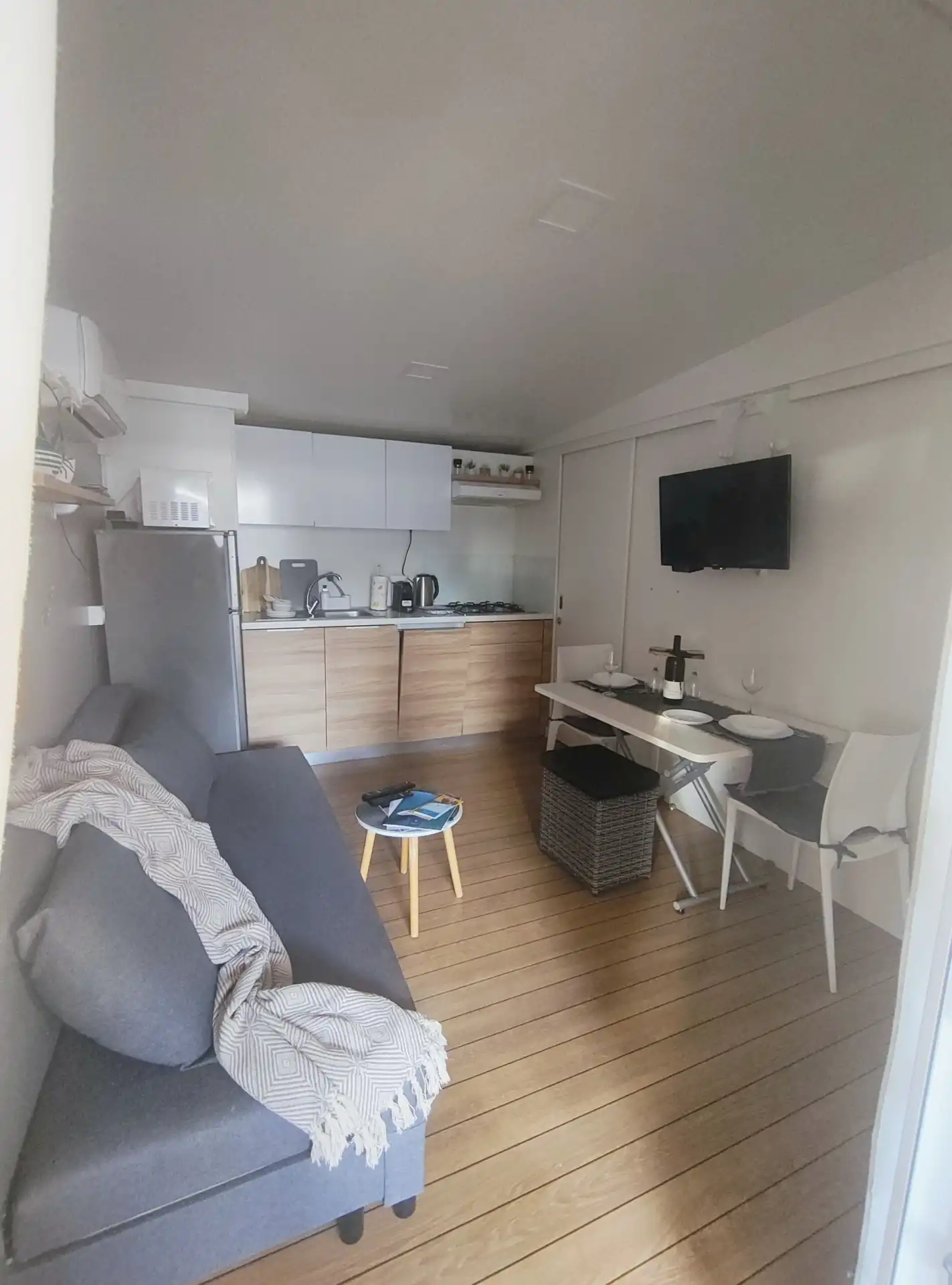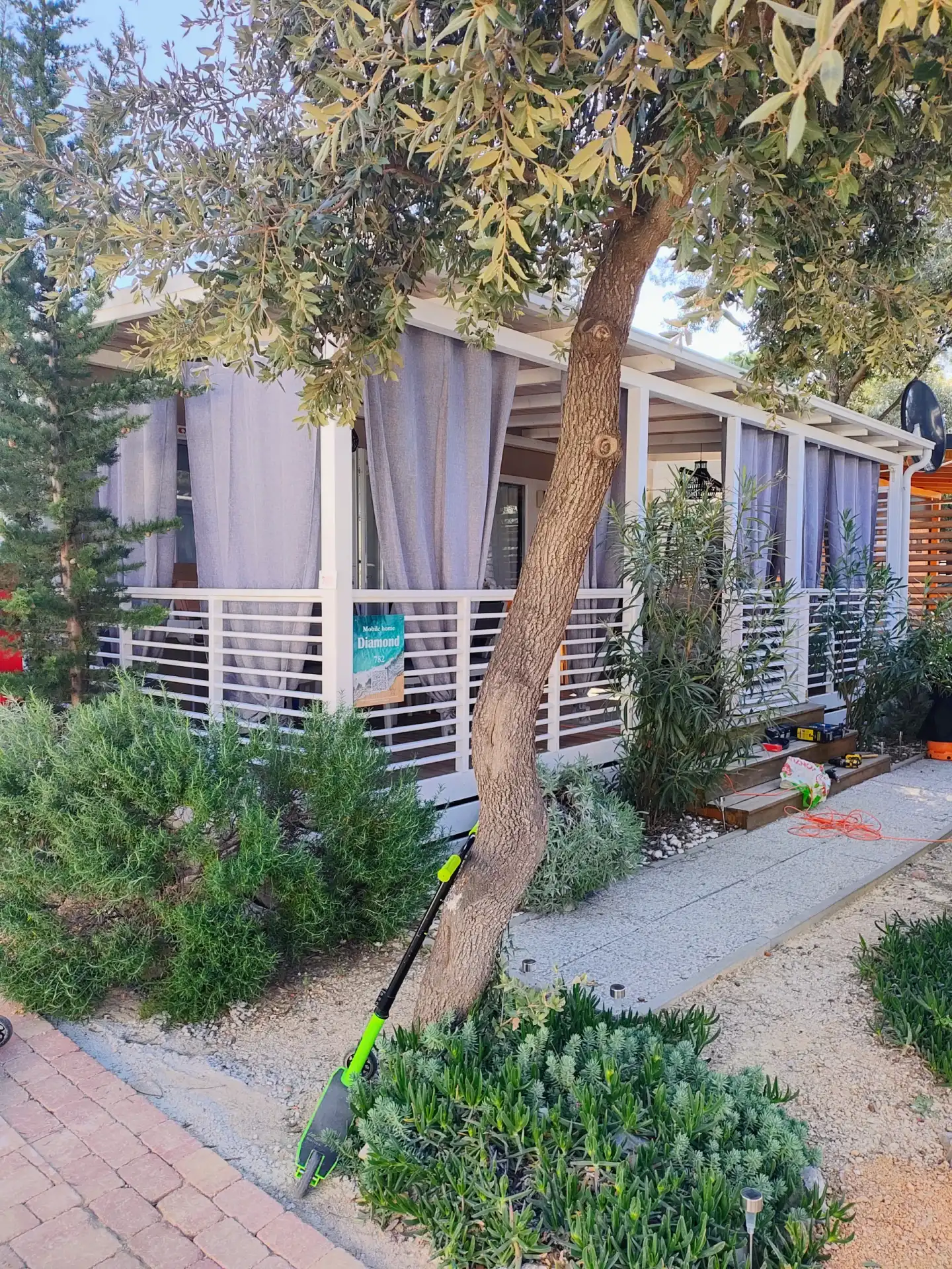 Naša moderno opremljena mobilna kućica nudi udoban smještaj za do 7 osoba, s 2 prostrane spavaće sobe, dnevnim boravkom sa kaučem na razvlačenje i 2 kupaonice. Uživajte na velikoj natkrivenoj terasi opremljenoj prostorom za objedovanje i vanjskim dnevnim boravkom, idealnom za duga noćna druženja. Ovdje možete uživati dok roštiljate na našem velikom plinskom roštilju i kuhalu na otvorenom. Natkrivena terasa okružena je borovima i blagim povjetarcem s mora. Sa jedne strane terase nalazi se prostrani prostor za objedovanje opremljen stolom i 6 stolica, a s druge strane, naš dnevni boravak vani nudi udobnu garnituru za sjedenje na kojoj možete odmoriti se. U kućici možete uživati u omiljenim TV emisijama na TV-u s dostupnim satelitskim TV kanalima, Netflixom i HBO GO-om. ℹ️Velika natktivena terasa sa prostorom za objedovanje i vanjskim dnevnim boravkom ℹ️ Veliki plinski roštilj + plinsko kuhalo ℹ️Potpuno opremljena kuhinja (hladnjak, mikrovalna pećnica, plinski štednjak, kuhalo za vodu, aparat za kavu, perilica posuđa, toster, svo potrebno posuđe) ℹ️Dnevni boravak sa velikim TV-om ℹ️Besplatan WI-FI, SAT TV, klima ℹ️Udobna posteljina i ručnici ℹ️ Fen, pegla ℹ️ Hranilica za djecu ℹ️1 parkirno mjesto, drugo parkirno mjesto uz doplatu Kampu Mobile Home Croatia Diamond nalazi se na samo 3 minute hoda do pješčane i šljunčane plaže te 10 minuta šetnje do centra Biograda. U kampu i njegovoj blizini nalazi se sve što vam je potrebno za opušteni odmor – od trgovina i restorana do sportskih terena i dječjih igrališta. A najveći gušt je upravo uživanje u suncu i moru, kao i mogućnost odlaska na izlete u atraktivne nacionalne parkove poput NP Krka, NP Kornati, NP Paklenica, ili povijesne gradove poput Zadra i Šibenika, a u neposrednoj blizini nalazi se i Vransko jezero koje je atraktivno kao za obiteljske izlete, tako i za ljubitelje ribolova!