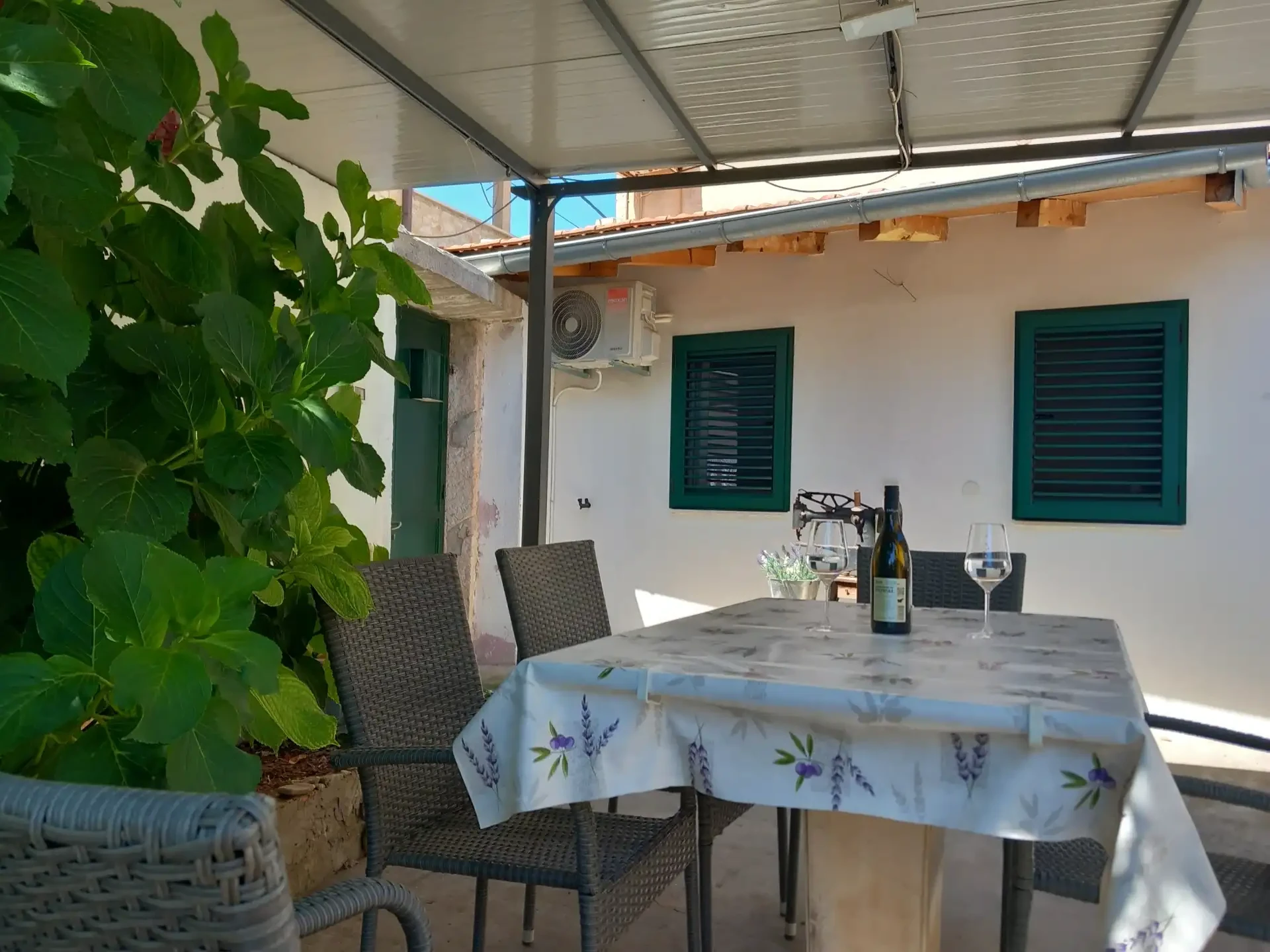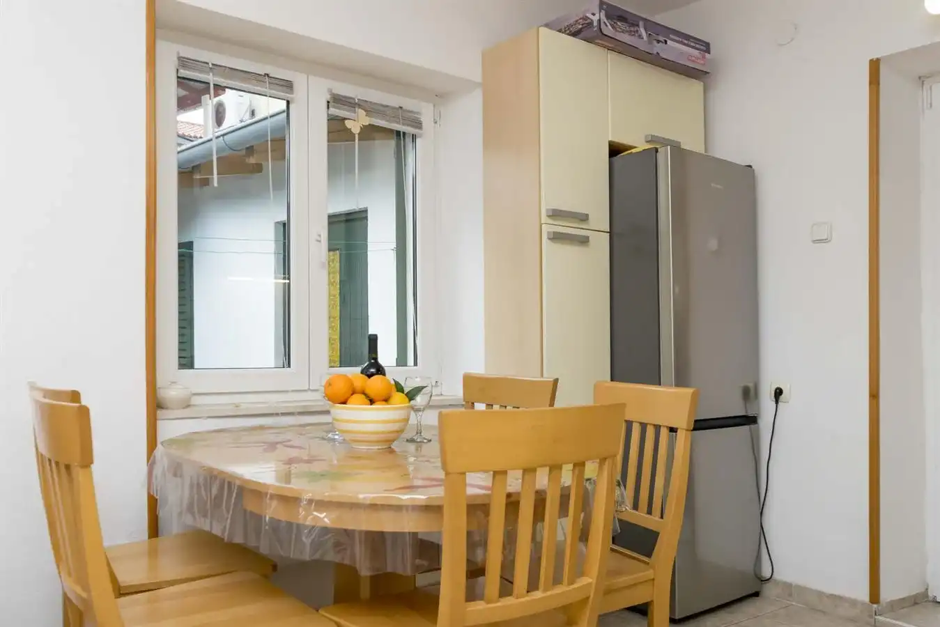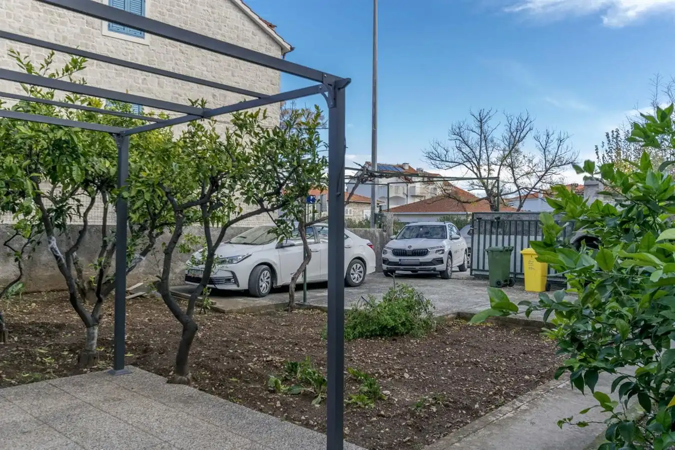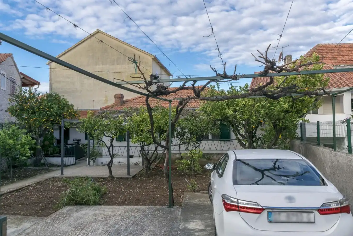 Samostojeca kuca u mirnom dijelu centra, okruzena vrtom, s vlastitim parking mjestom. Kuča je kompletno opremljena, a u vrtu se nalazi Vas kutak za odmor i roštilj, koji pridonosi kompletnom uživanju u Vasem godišnjem odmoru.Kuča se sastoji se od kuhinje s blagavaonom i dnevnim prostorom, kupatila i dvije spavače sobe (max. 4 osobe). Boravišna taksa je ukljucena u cijenu.