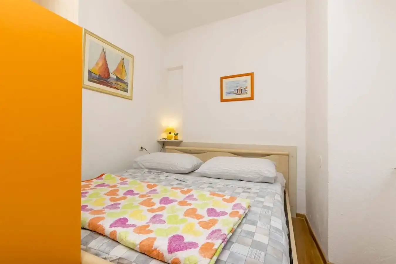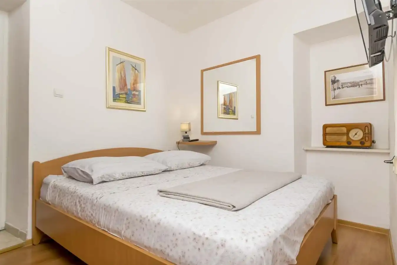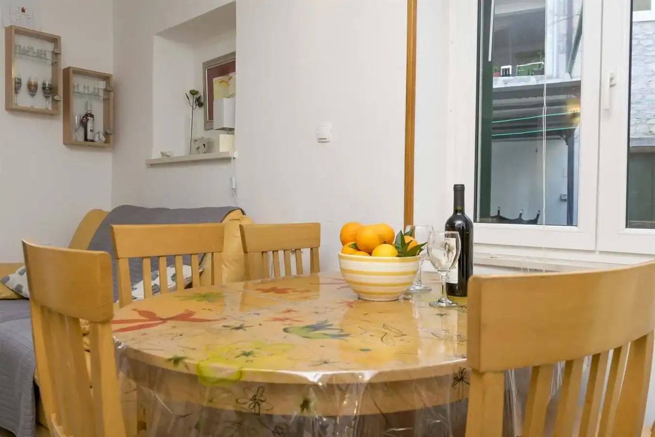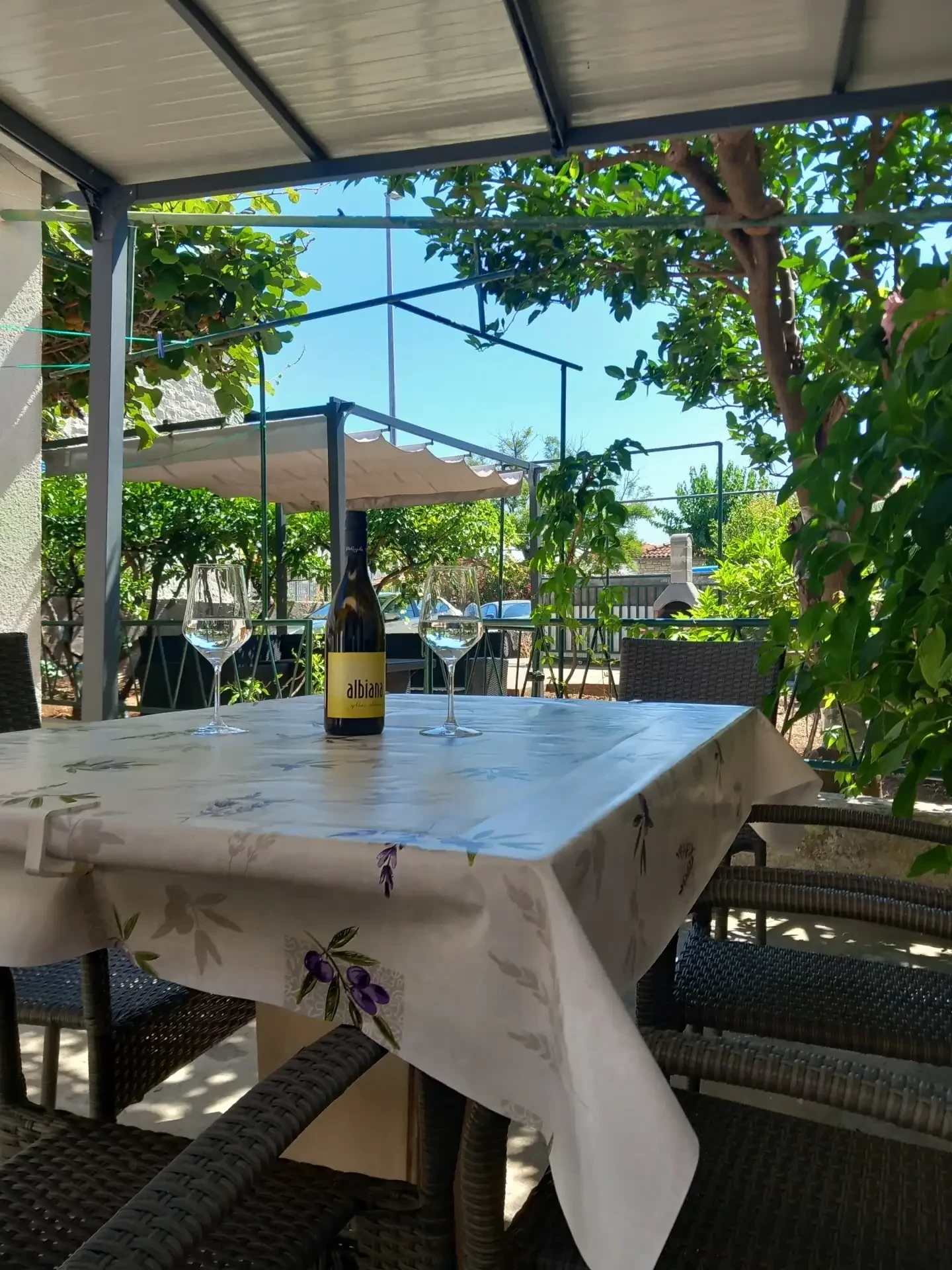 Samostojeca kuca u mirnom dijelu centra, okruzena vrtom, s vlastitim parking mjestom. Kuča je kompletno opremljena, a u vrtu se nalazi Vas kutak za odmor i roštilj, koji pridonosi kompletnom uživanju u Vasem godišnjem odmoru.Kuča se sastoji se od kuhinje s blagavaonom i dnevnim prostorom, kupatila i dvije spavače sobe (max. 4 osobe). Boravišna taksa je ukljucena u cijenu.