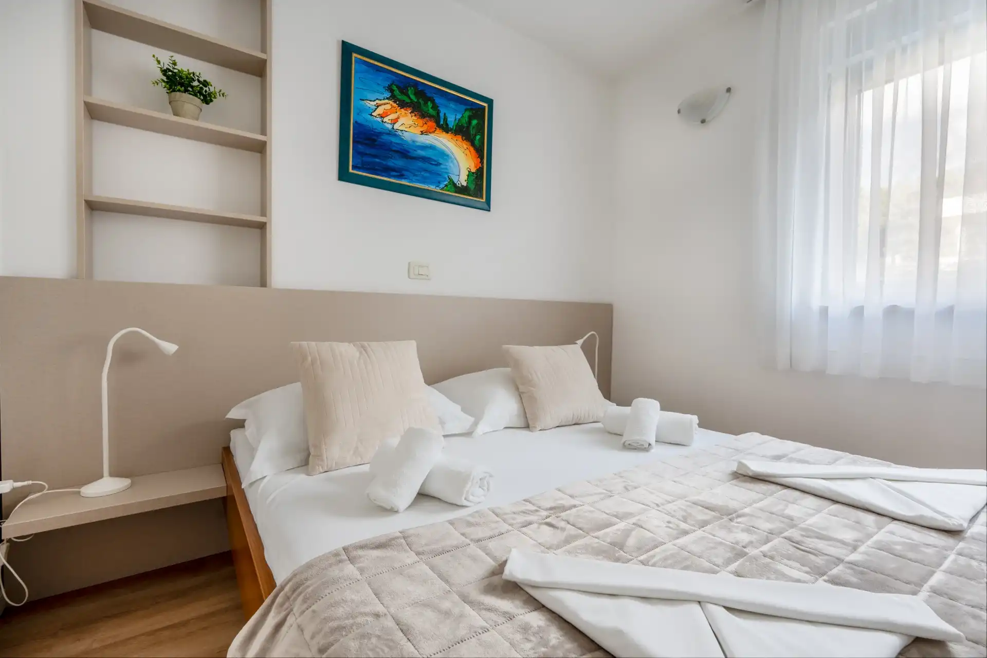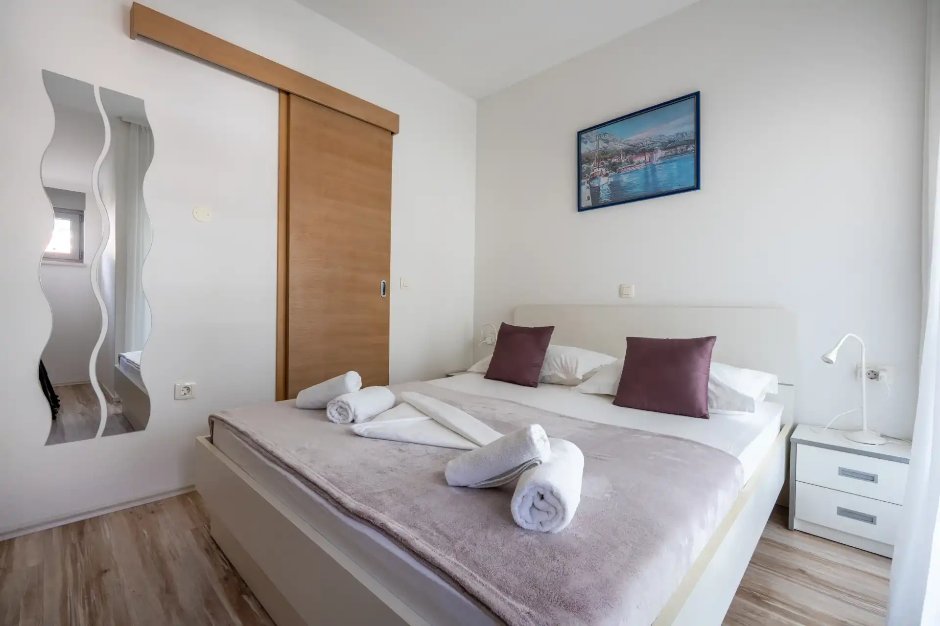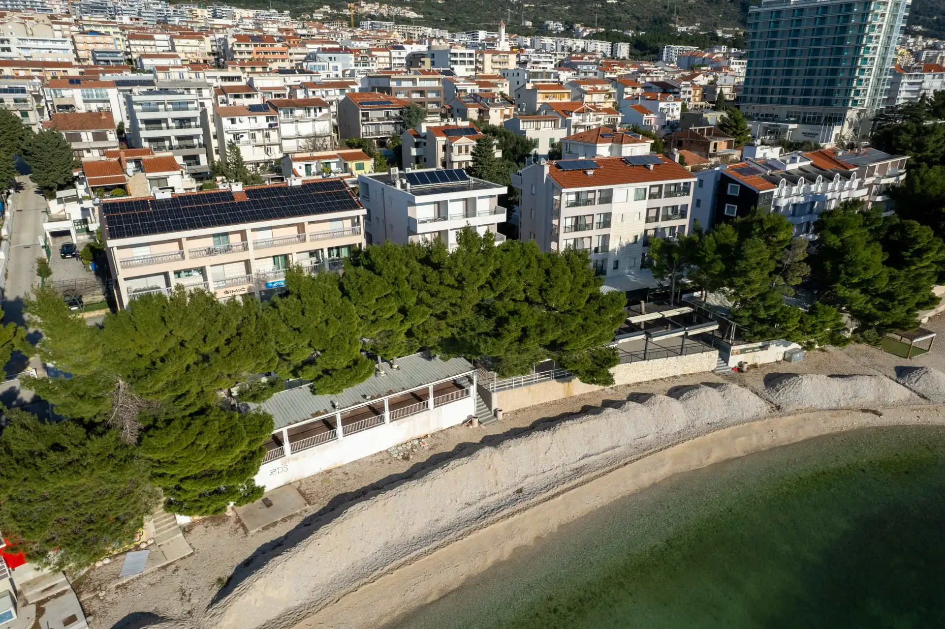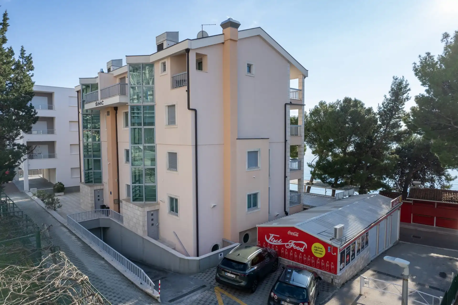 Apartmani Simic nude vrhunski smještaj na idealnoj lokaciji, svega 10-ak metara od mora, s očaravajućim pogledom na obalu. Sastoji se od četiri kata, a svaki kat sadrži različite vrste apartmana koji zadovoljavaju potrebe svih gostiju. Na prvom i drugom smješteni su prostrani dvosobni apartmani, savršeni za obitelji ili veće grupe. Svaki apartman opremljen je modernim namještajem, kuhinjom, dnevnim boravkom i balkonima s pogledom na more, omogućujući gostima udoban i ugodan boravak. Trosobni apartman na trećem katu nudi još više prostora i luksuza, idealan za veće obitelji ili grupe koje žele uživati u maksimalnom komforu i privatnosti. S tri spavaće sobe, dnevnim boravkom i velikim balkonima, ovaj apartman pruža potpunu privatnost za opuštanje i neometan užitak u prelijepom pogledu na more. Na četvrtom katu smješteni su studio apartmani, idealni za parove ili samostalne putnike koji traže intimu i udobnost. Svaki studio apartman posjeduje balkon, savršen za jutarnje opuštanje uz kavu ili uživanje u zalasku sunca. Kompleks također nudi garažni parking smješten ispod objekta,ili pak u zakupljenom posjedu 200 m od posjeda , čime je gostima omogućena sigurnost i bezbrižnost tijekom boravka. Parking se naplaćuje dodatno. S obzirom na blizinu mora i mirnu lokaciju, ovaj apartmanski kompleks savršeno je mjesto za opuštanje, uživanje u suncu i moru i nezaboravno ljetovanje.