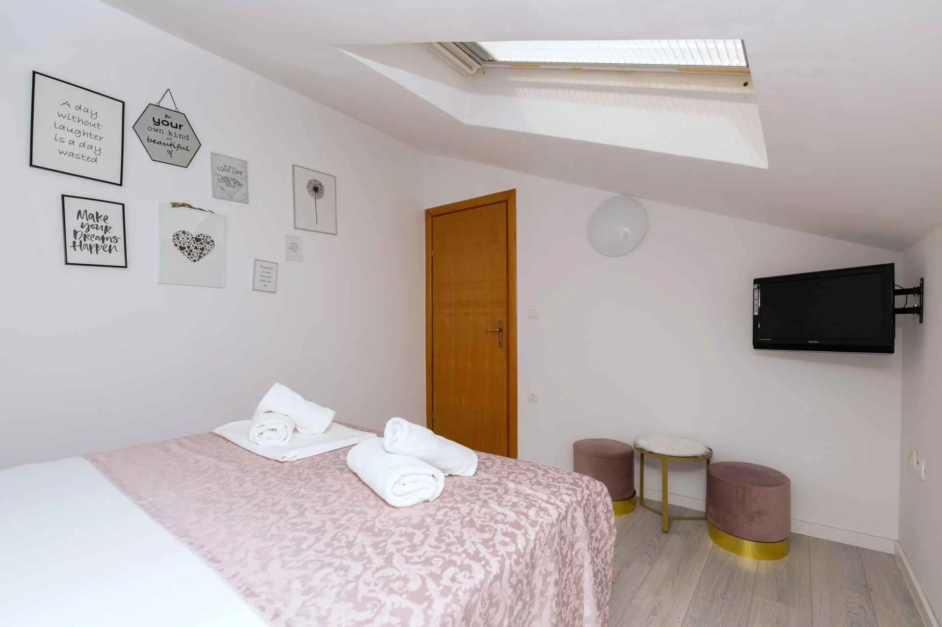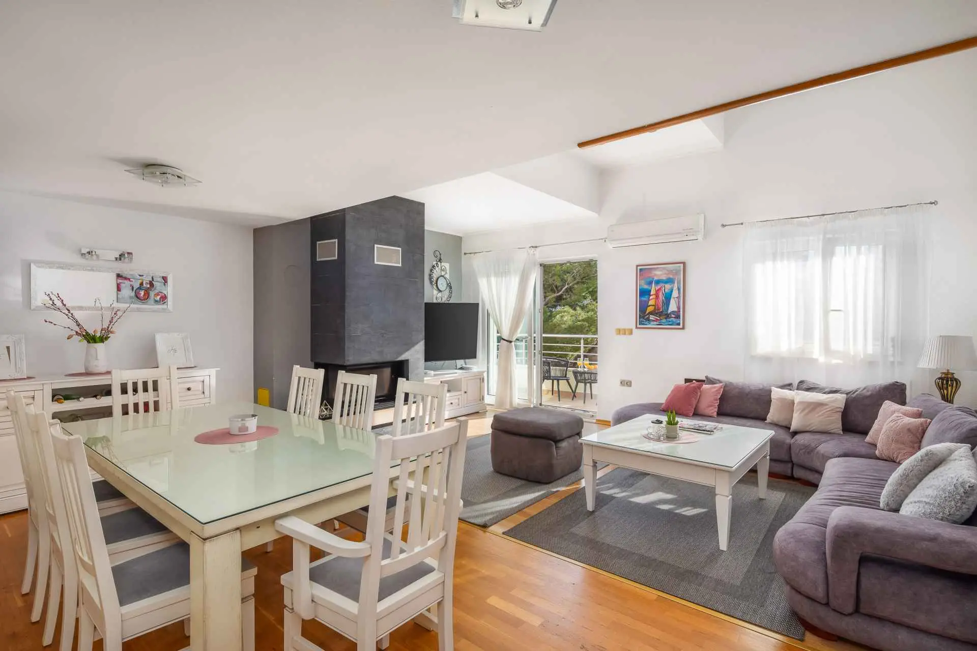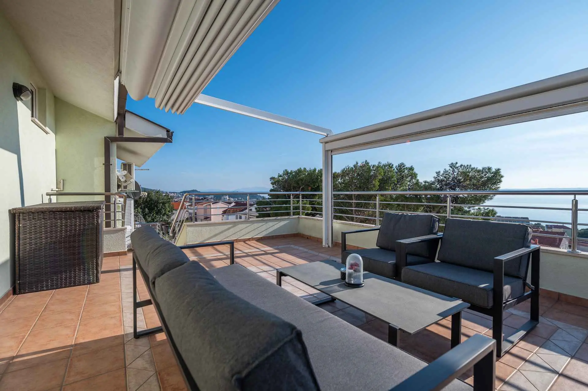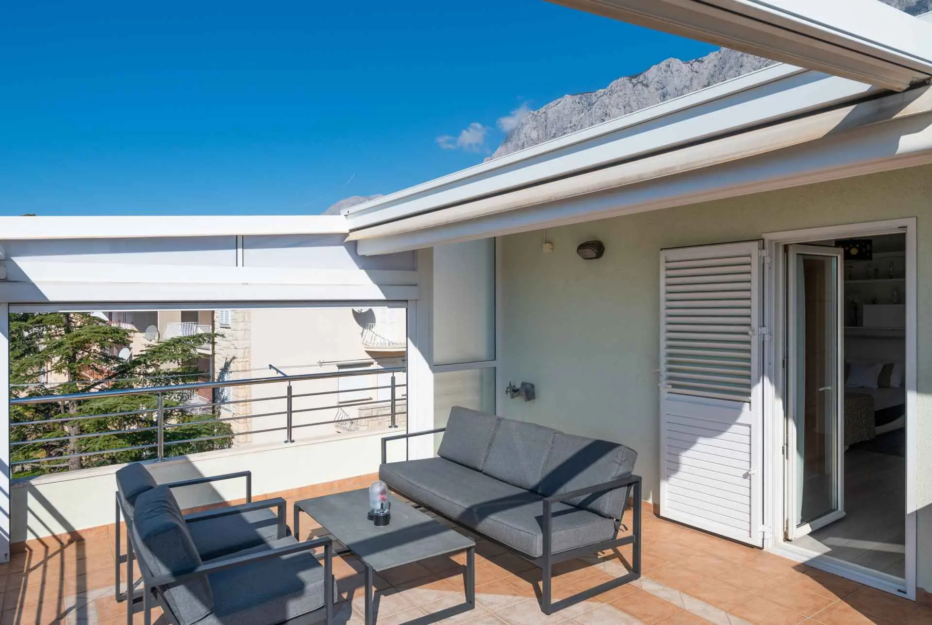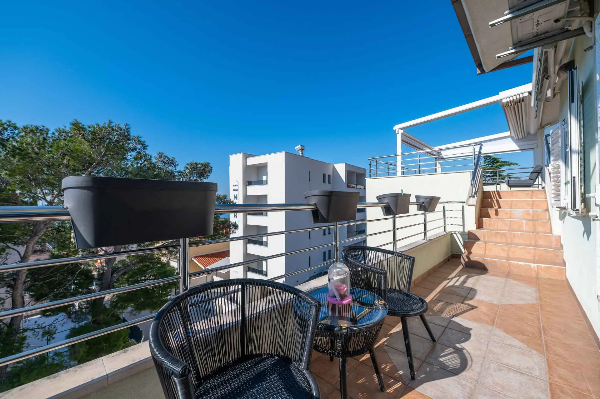 Dobrodošli u naš penthouse apartman u Makarskoj! Naš apartman se nalazi samo 450 metara od prekrasne plaže, te ima prostranu natkrivenu terasu s djelomičnim pogledom na more. Na donjoj etaži apartmana, smješten je prostrani dnevni boravak i potpuno opremljena kuhinja, dok se na gornjoj etaži nalaze udobne spavaće sobe. Za vašu udobnost, osigurali smo dva parkirna mjesta koja su uključena u cijenu. Naše osoblje vam je dostupno za savjet i pomoć tijekom vašeg boravka. Rezervirajte svoj boravak u našem penthouse apartmanu i uživajte u istinskom komforu.