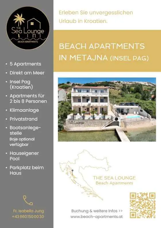 Doživite nezaboravan odmor tik uz more u našim Beach Apartments Metajna Pag. Naša kuća se nalazi u idiličnom mjestu Metajna na prekrasnom otoku Pagu u Hrvatskoj i nudi vam pet ekskluzivnih apartmana koji su savršeno prilagođeni vašim potrebama. Uživajte u luksuzu privatne plaže s pristaništem za čamce i opustite se uz bazen u kući dok se divite prekrasnom pogledu na kristalno čisto more. Dopustite da vas očaraju jedinstveni položaj i udoban namještaj naših apartmana. Kod nas ćete pronaći savršenu kombinaciju mira, opuštanja i ekskluzivnog ugođaja odmora. Rezervirajte svoj boravak u Beach Apartments Metajna Pag već danas i doživite nezaboravne dane uz more. Dobrodošli!