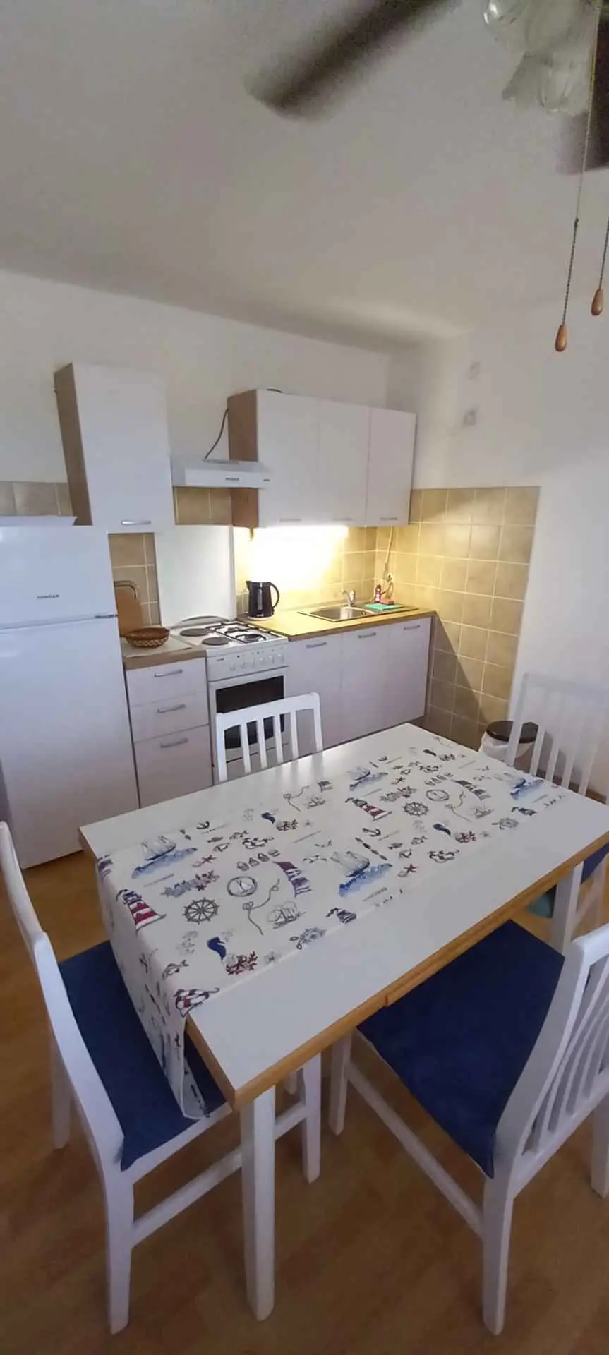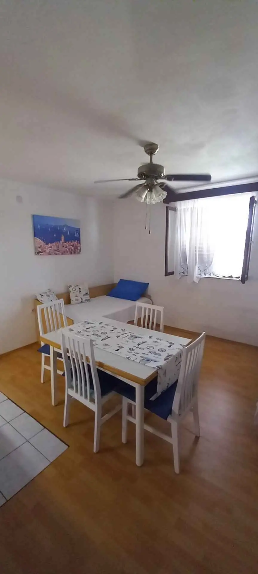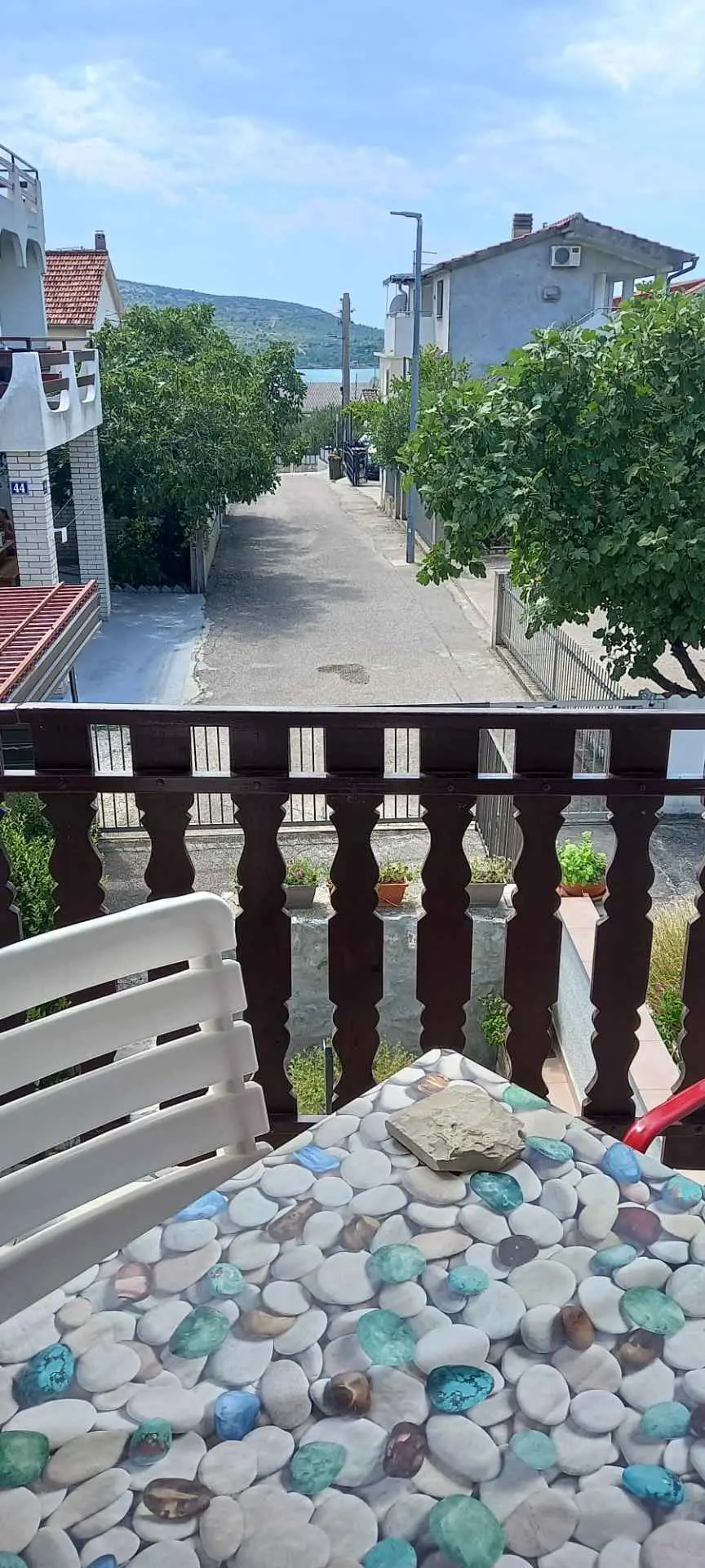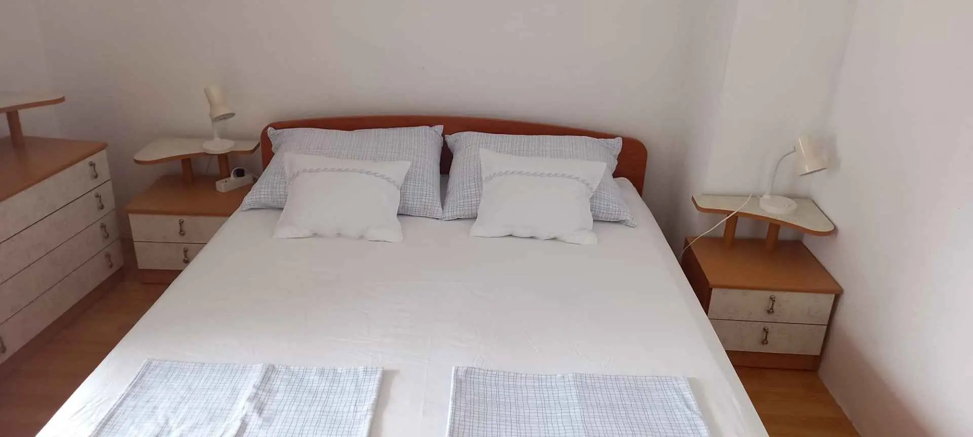 Ugodan obiteljski apartman u mirnom susjedstvu, sa prostranom spavaćom sobom, opremljenom kuhinjom i terasom s pogledom na more. Apartman se nalazi u Starinama, udaljen 350m od plaže, 300m od autobusne stanice i 1km od centra općine. Sadrži prostranu terasu, spavaću sobu sa bračnim krevetom, kupaonicu i opremljenu kuhinju, televiziju, dva dodatna ležaja te jedan pomoćni. Apartman ukupno ugošćuje maksimalno 5 ljudi. U apartmanu se nalazi klima uređaj, te je dostupan parking u hladu u dvorištu kuće.