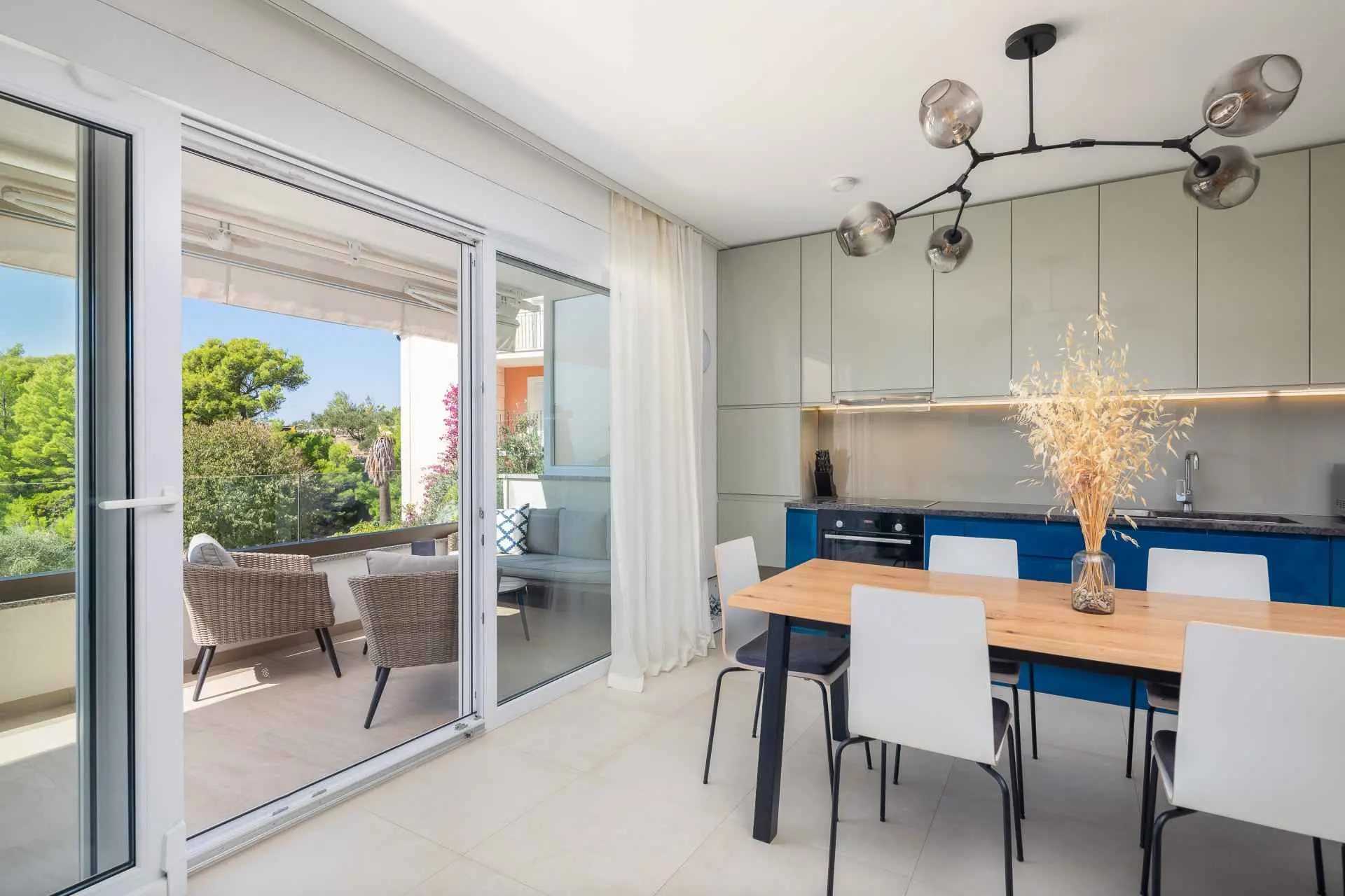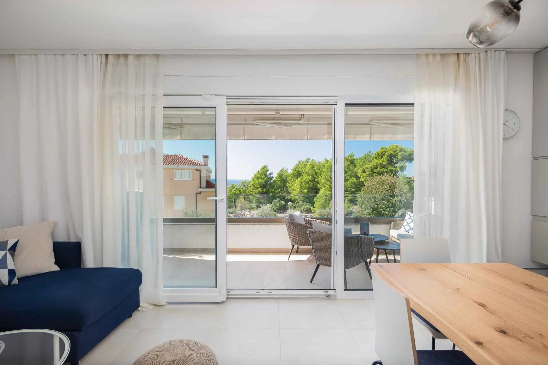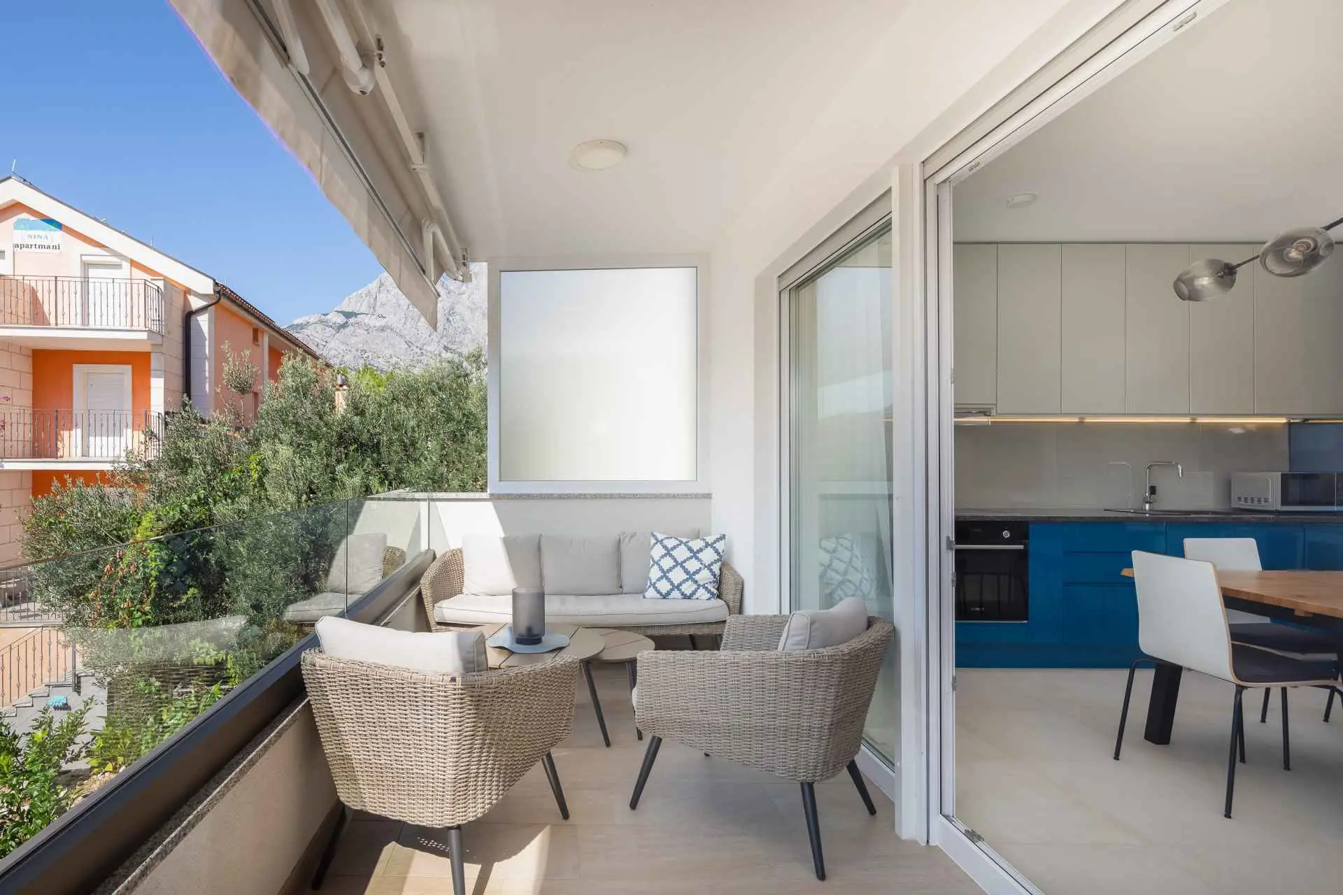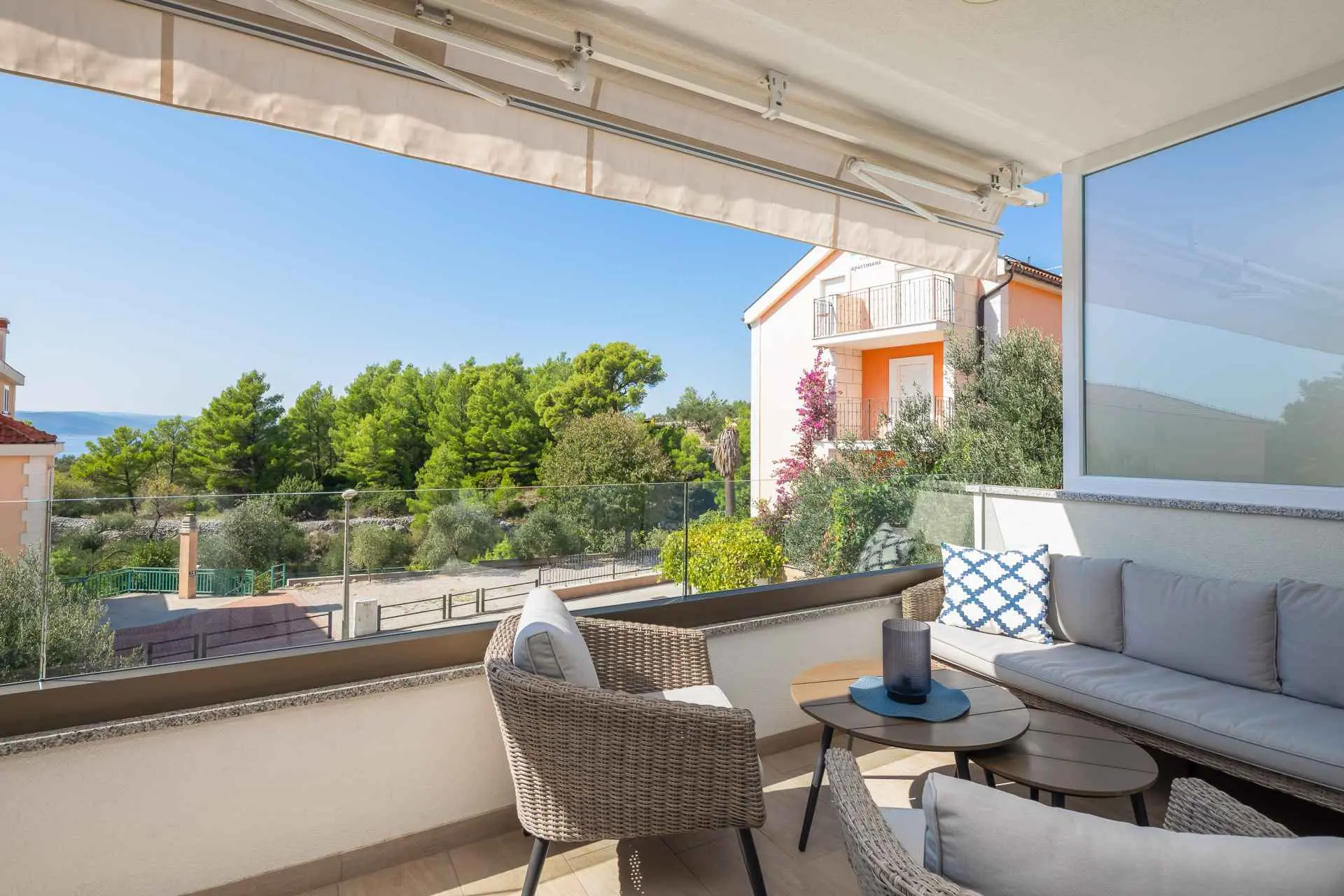 Ovaj novoizgrađeni luksuzni apartman sastoji se od 2 spavaće sobe, 1 kupaonice, dnevnog boravka i balkona s djelomičnim pogledom na more. Apartman je opremljen vrhunskim namještajem i uređajima. Nalazi se na 1. katu zgrade s liftom, a parking se nalazi u prizemlju. Kontaktirajte nas za dodatne informacije.