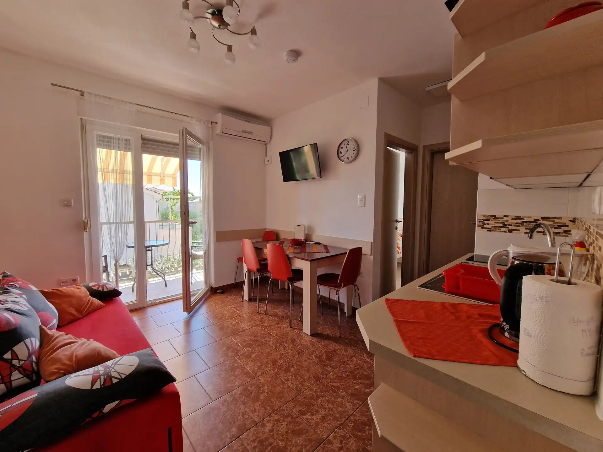 Color apartmani se nalaze u mirnom i tihom dijelu romantičnog gradića Vodica. Od smještaja je 400m do plaže i vrlo lijepa šetnja uz more. Udaljeni su samo nekoliko minuta od svega što vam Vodice nude – trgovine, restorani, kafići, noćni život. Drugi glavni gradovi na ovom području su Šibenik (14 km), Zadar (62 km) i Split (98 km). Apartmani su opremljeni svom opremom i sastoje se od kuhinje / dnevne sobe, kupaone, spavaće sobe, balkona koji su natkriveni ili imaju tende i zajednička terasa za druženje. Klima uređaj s kartom (uključujući u cijeni 5 jedinica dnevno) Uz normalnu potrošnju klime uređaja je po izkustvu 5 jedinica dnevno dovoljno.U slučaju potrošnje cijelih jedinica, punjenje kartice je moguće za paušalni iznos od 2€ po jedinici.