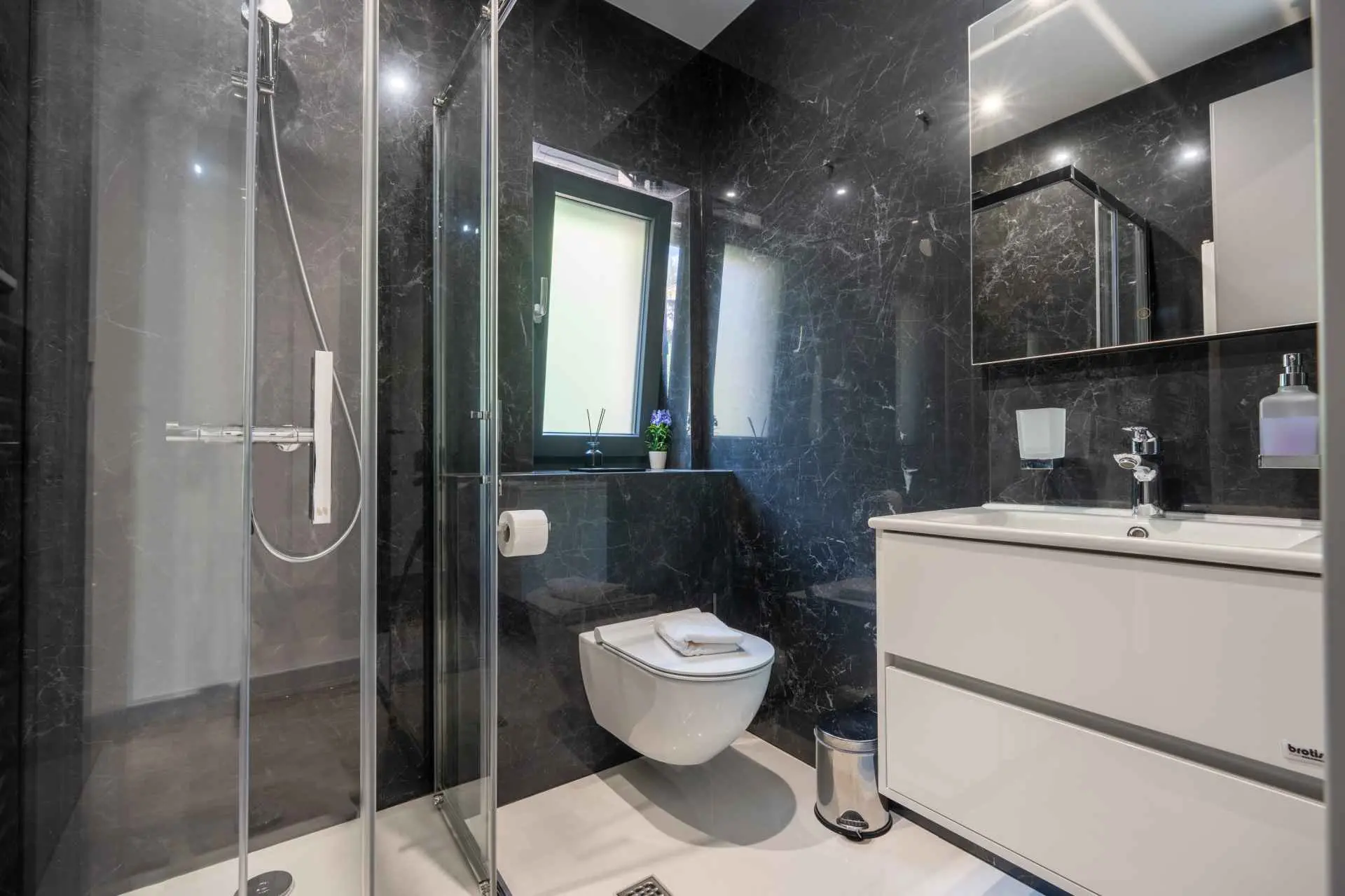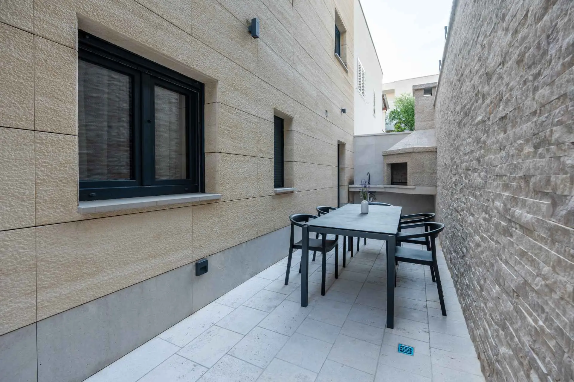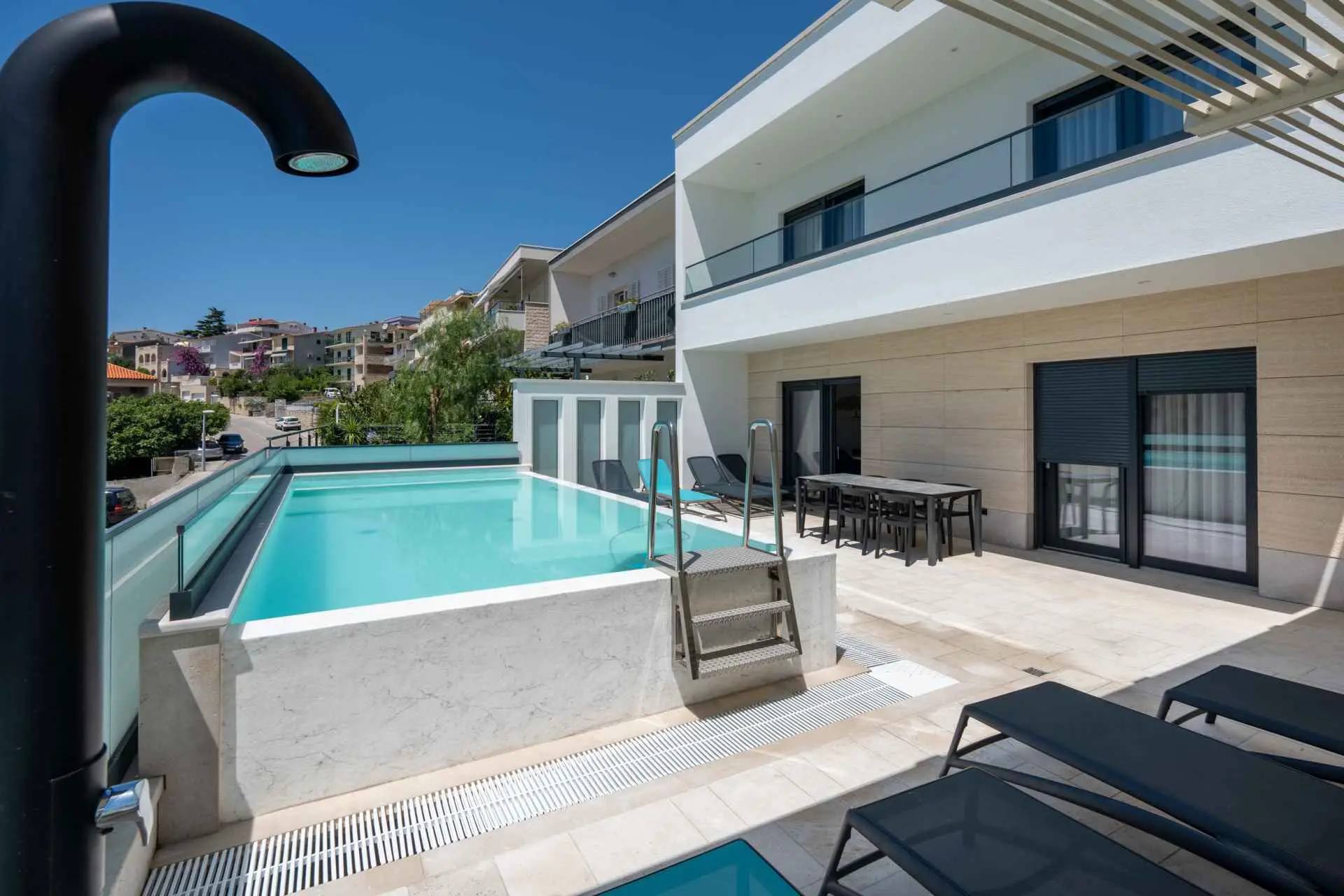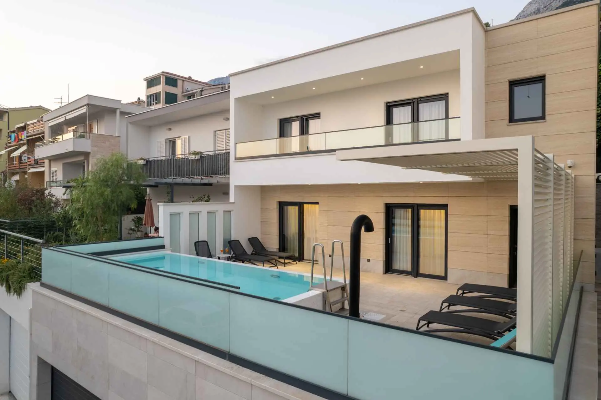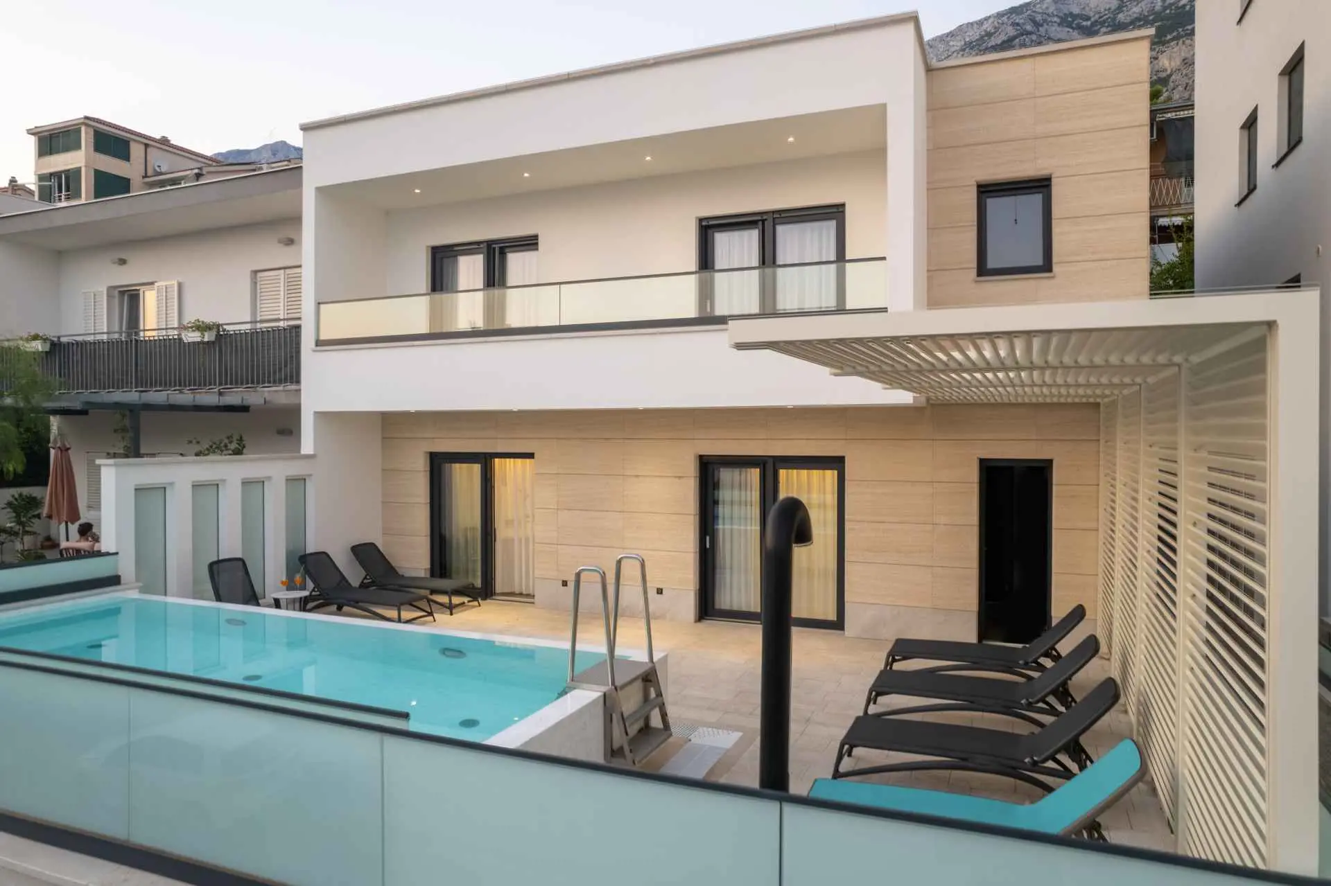 Egy csodálatos új építésű villa Makarska központjának közelében, mely luxust és kényelmet áraszt, és várja, hogy álmai nyaralását töltse benne. A külső és belső dekorációban nagy figyelmet szentelve a részletekre, modern technikai felszereltséggel, varázslatos csillogású legújabb építőanyagokkal ez a villa minden alkalomra luxus bérleti szolgáltatást nyújt. A legmagasabb kényelem, a modern belső tér és az elegáns dizájn lenyűgöző. A Villa Iva 5 hálószobával rendelkezik. Négy szoba van franciaággyal, egy pedig egy személy elszállásolására alkalmas. Az épület bejáratánál, az emeleten található egy tágas nappali esti összejövetelekre alkalmas nagy kanapéval. Tágas étkező és modern, teljesen felszerelt konyha található, így el vannak választva a nappalitól. A folyosón sétálva a fürdőszobába, egy hálószobába és egy további WC-be jutunk. A második emeleten találhatóak a tágas fő hálószobák, mindegyik saját fürdőszobával. Ezenkívül lépjen ki az erkélyre. A belső tér minőségi gépekkel van felszerelve, mint például nagyméretű síkképernyős TV, LED világítás, automata hűtés, és a legjobb háztartási gépek. A nappaliból megközelíthető kültéri teraszon úszómedence található, ahol a meleg és napsütéses nyári napokon hűsölni lehet. Nyugágyak is a kellemes napozáshoz. Egy szabadtéri zuhanyzó is rendelkezésre áll. A létesítményben szabadtéri kandalló is rendelkezésre áll, így ízletes ételeket készíthet családja számára. )