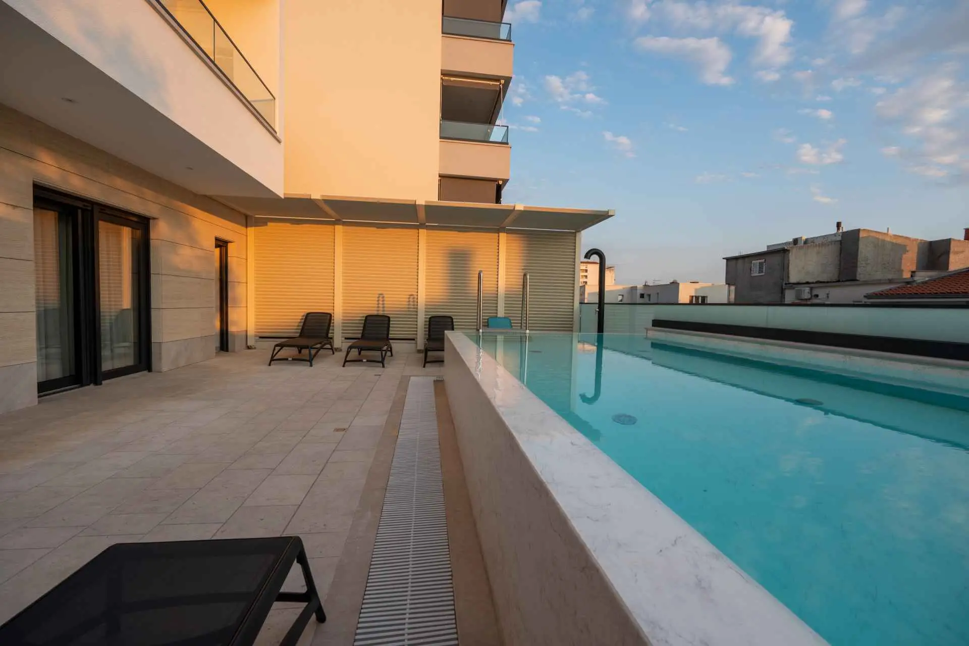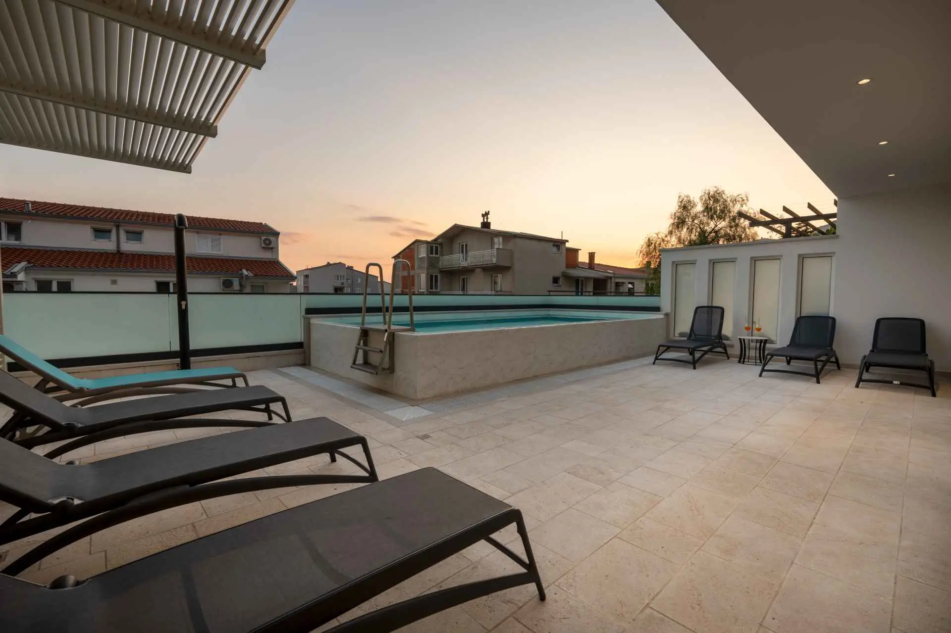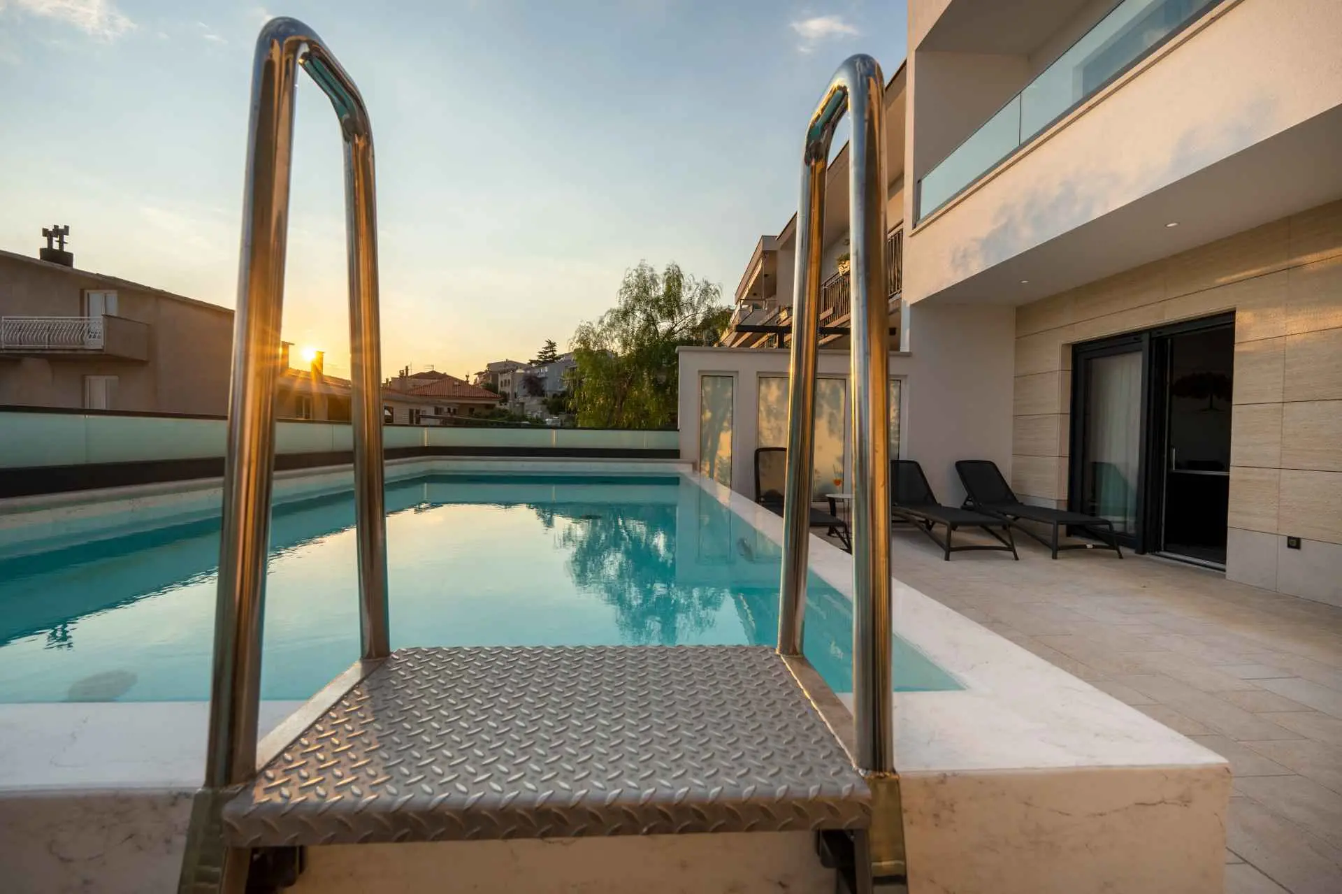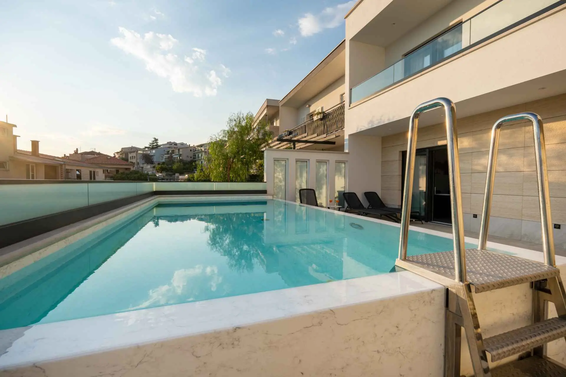 Egy csodálatos új építésű villa Makarska központjának közelében, mely luxust és kényelmet áraszt, és várja, hogy álmai nyaralását töltse benne. A külső és belső dekorációban nagy figyelmet szentelve a részletekre, modern technikai felszereltséggel, varázslatos csillogású legújabb építőanyagokkal ez a villa minden alkalomra luxus bérleti szolgáltatást nyújt. A legmagasabb kényelem, a modern belső tér és az elegáns dizájn lenyűgöző. A Villa Iva 5 hálószobával rendelkezik. Négy szoba van franciaággyal, egy pedig egy személy elszállásolására alkalmas. Az épület bejáratánál, az emeleten található egy tágas nappali esti összejövetelekre alkalmas nagy kanapéval. Tágas étkező és modern, teljesen felszerelt konyha található, így el vannak választva a nappalitól. A folyosón sétálva a fürdőszobába, egy hálószobába és egy további WC-be jutunk. A második emeleten találhatóak a tágas fő hálószobák, mindegyik saját fürdőszobával. Ezenkívül lépjen ki az erkélyre. A belső tér minőségi gépekkel van felszerelve, mint például nagyméretű síkképernyős TV, LED világítás, automata hűtés, és a legjobb háztartási gépek. A nappaliból megközelíthető kültéri teraszon úszómedence található, ahol a meleg és napsütéses nyári napokon hűsölni lehet. Nyugágyak is a kellemes napozáshoz. Egy szabadtéri zuhanyzó is rendelkezésre áll. A létesítményben szabadtéri kandalló is rendelkezésre áll, így ízletes ételeket készíthet családja számára. )