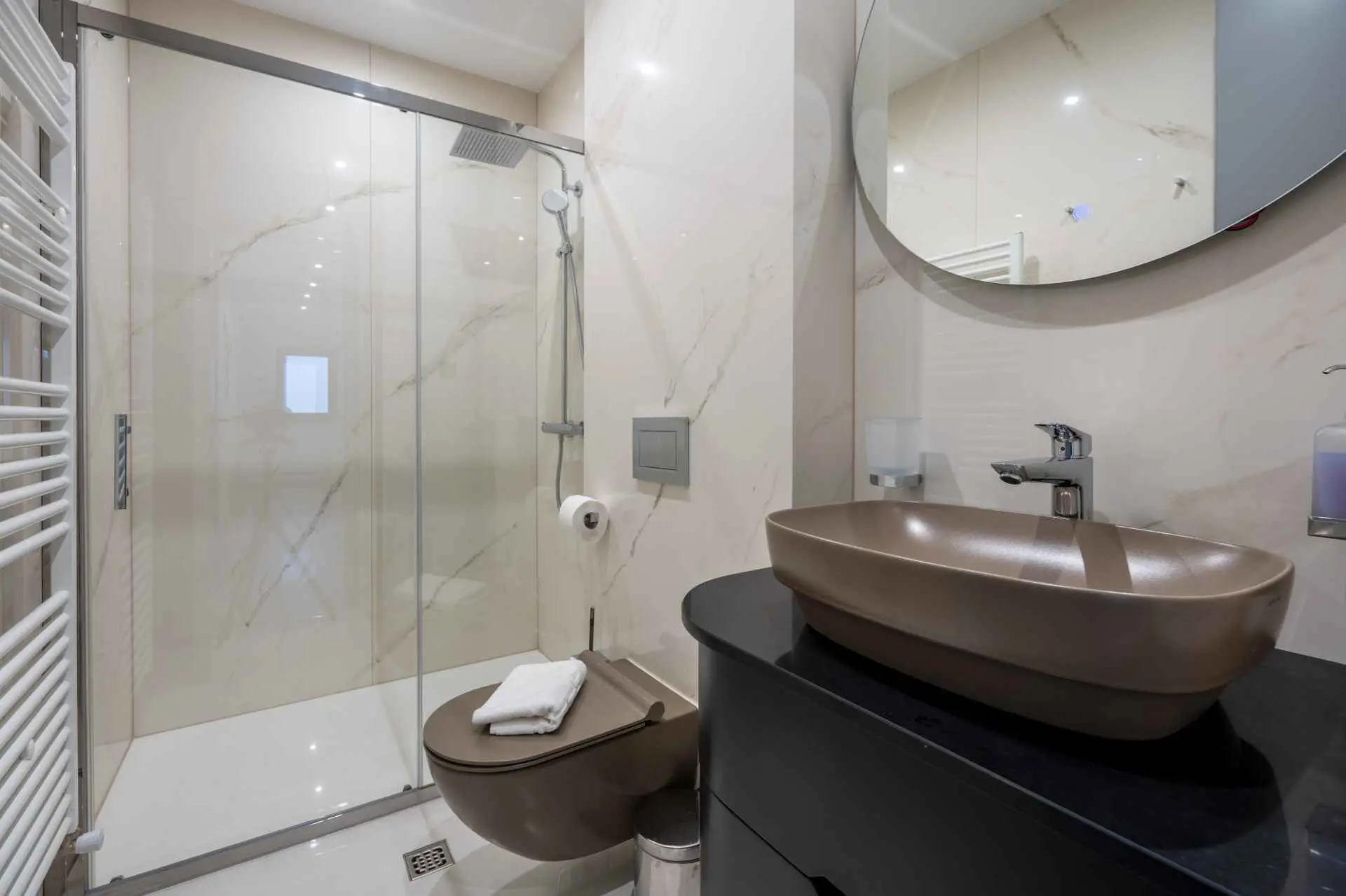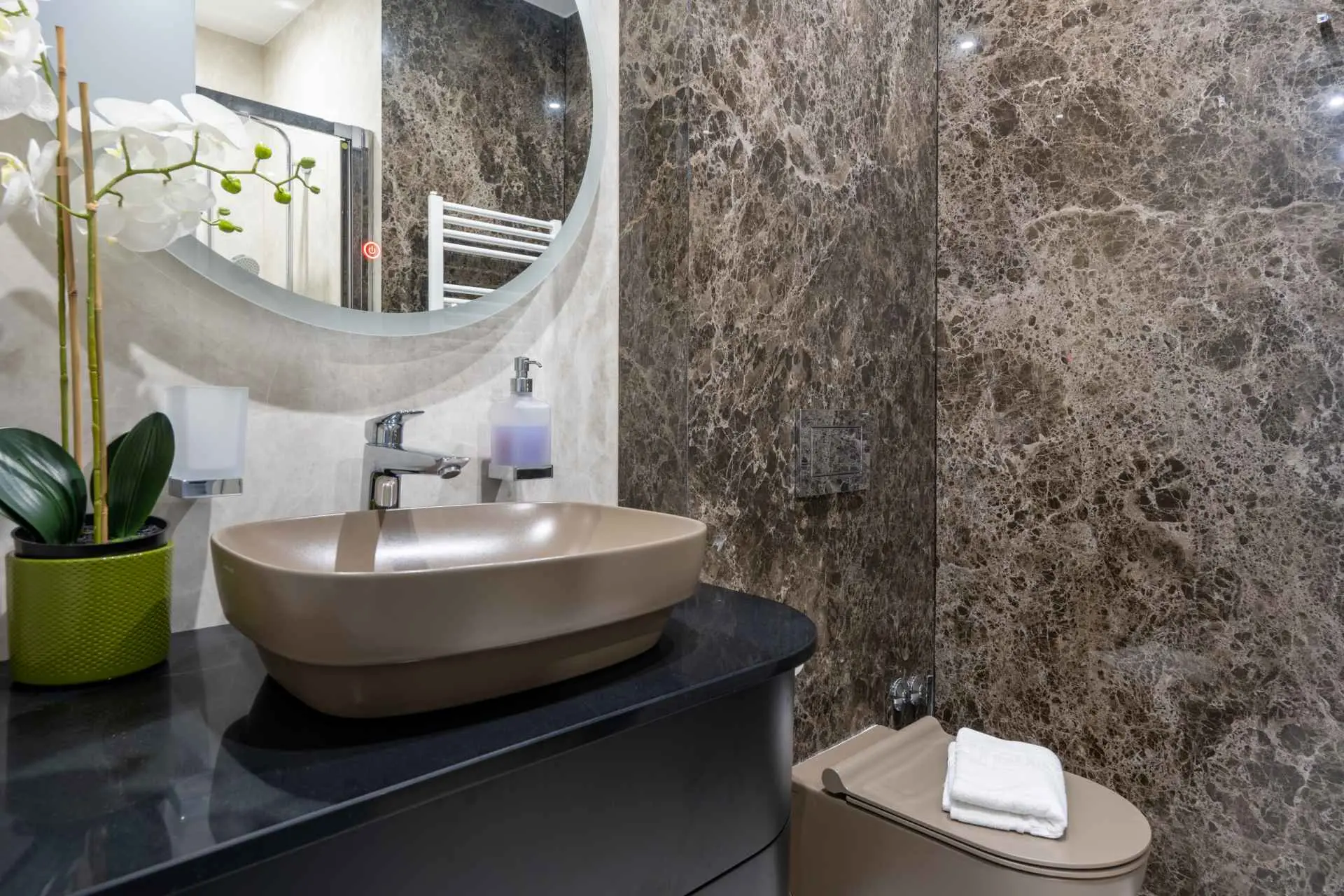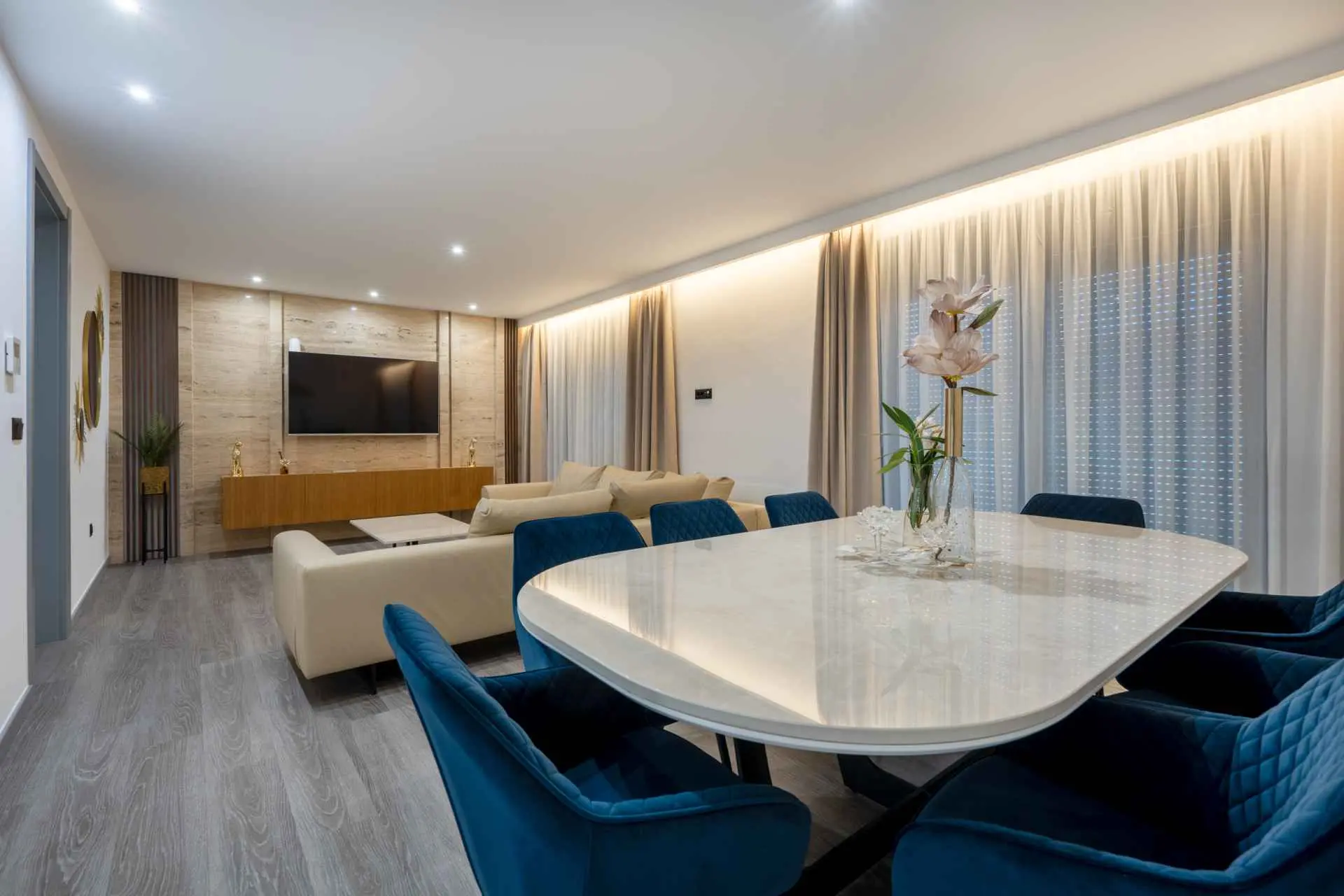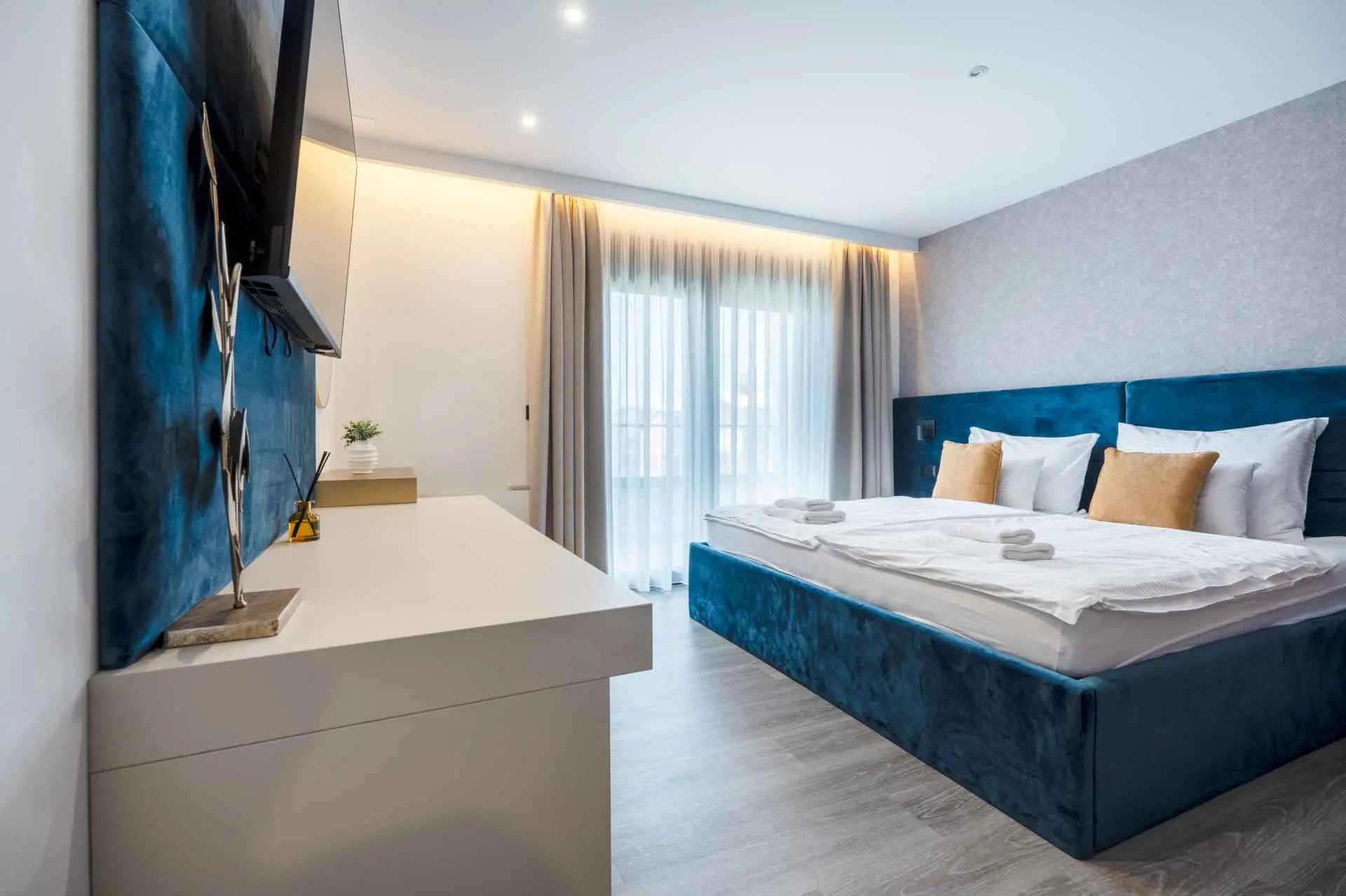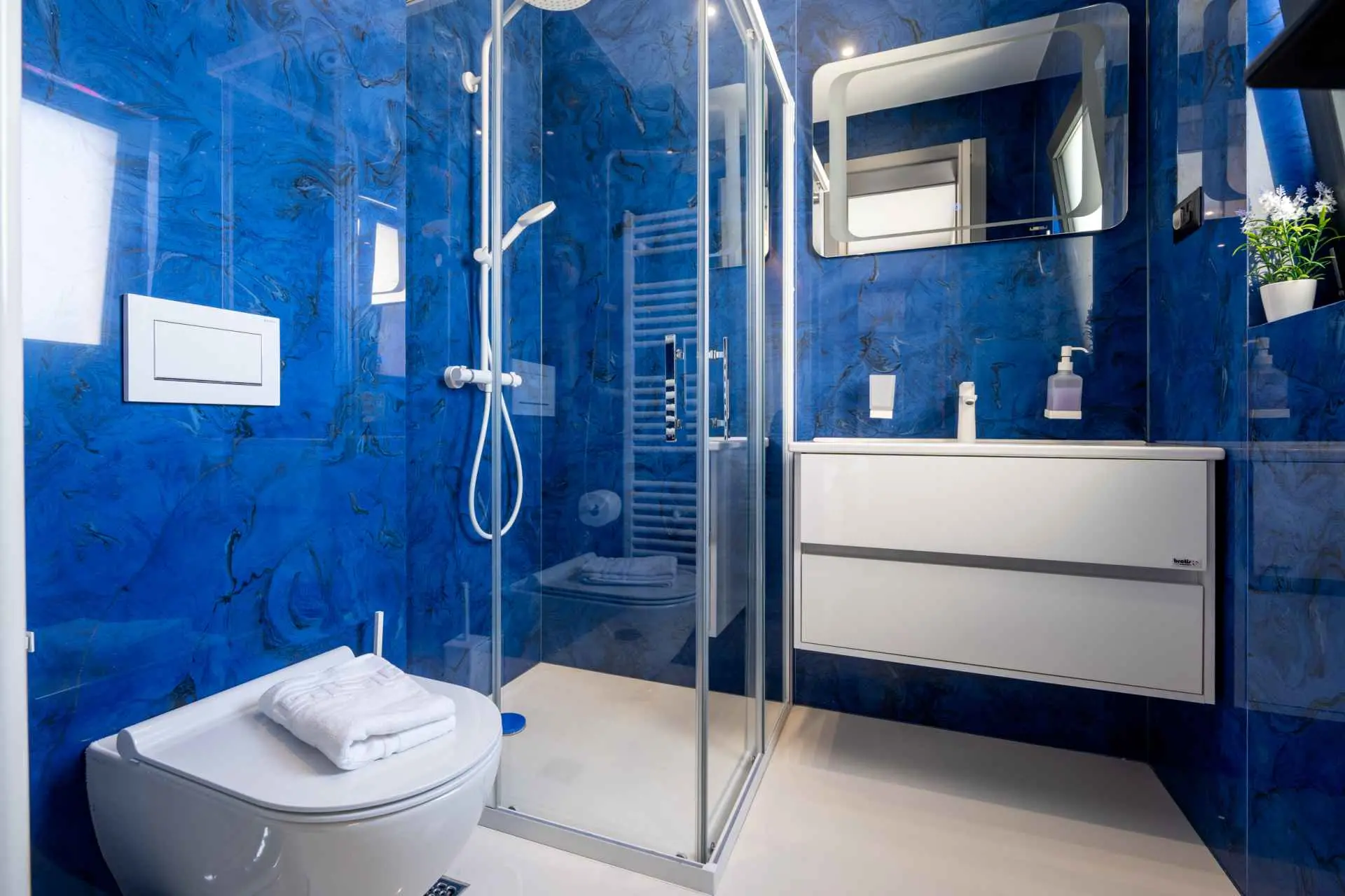 Egy csodálatos új építésű villa Makarska központjának közelében, mely luxust és kényelmet áraszt, és várja, hogy álmai nyaralását töltse benne. A külső és belső dekorációban nagy figyelmet szentelve a részletekre, modern technikai felszereltséggel, varázslatos csillogású legújabb építőanyagokkal ez a villa minden alkalomra luxus bérleti szolgáltatást nyújt. A legmagasabb kényelem, a modern belső tér és az elegáns dizájn lenyűgöző. A Villa Iva 5 hálószobával rendelkezik. Négy szoba van franciaággyal, egy pedig egy személy elszállásolására alkalmas. Az épület bejáratánál, az emeleten található egy tágas nappali esti összejövetelekre alkalmas nagy kanapéval. Tágas étkező és modern, teljesen felszerelt konyha található, így el vannak választva a nappalitól. A folyosón sétálva a fürdőszobába, egy hálószobába és egy további WC-be jutunk. A második emeleten találhatóak a tágas fő hálószobák, mindegyik saját fürdőszobával. Ezenkívül lépjen ki az erkélyre. A belső tér minőségi gépekkel van felszerelve, mint például nagyméretű síkképernyős TV, LED világítás, automata hűtés, és a legjobb háztartási gépek. A nappaliból megközelíthető kültéri teraszon úszómedence található, ahol a meleg és napsütéses nyári napokon hűsölni lehet. Nyugágyak is a kellemes napozáshoz. Egy szabadtéri zuhanyzó is rendelkezésre áll. A létesítményben szabadtéri kandalló is rendelkezésre áll, így ízletes ételeket készíthet családja számára. )