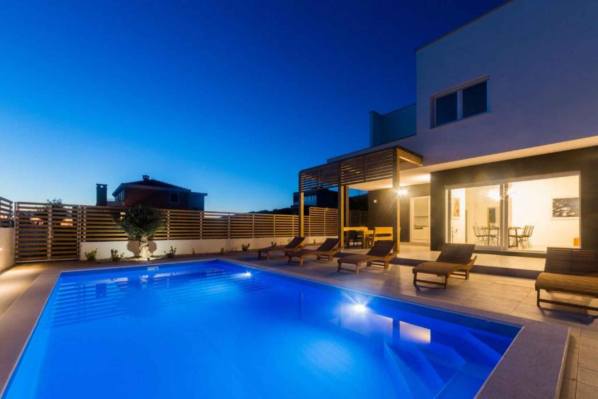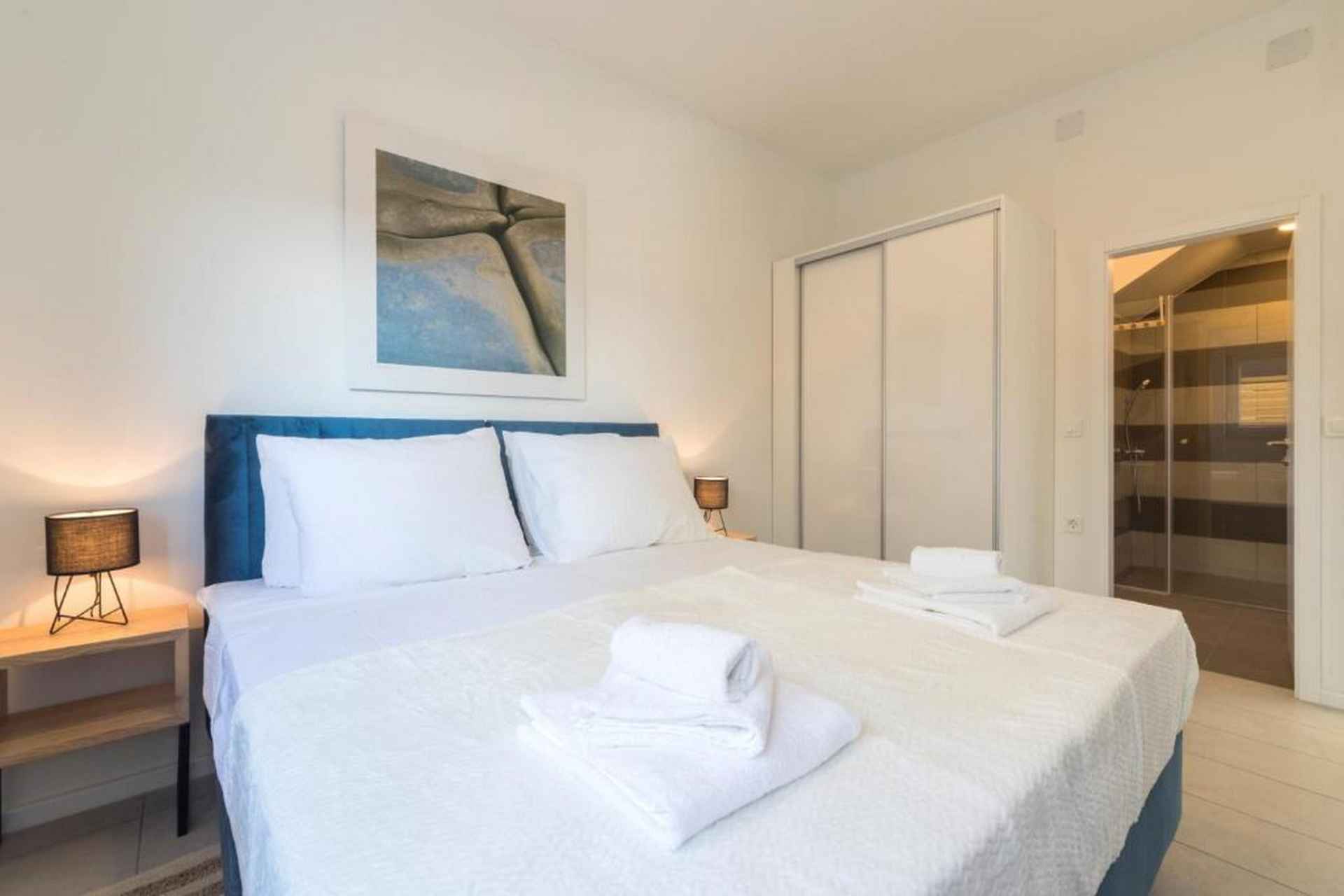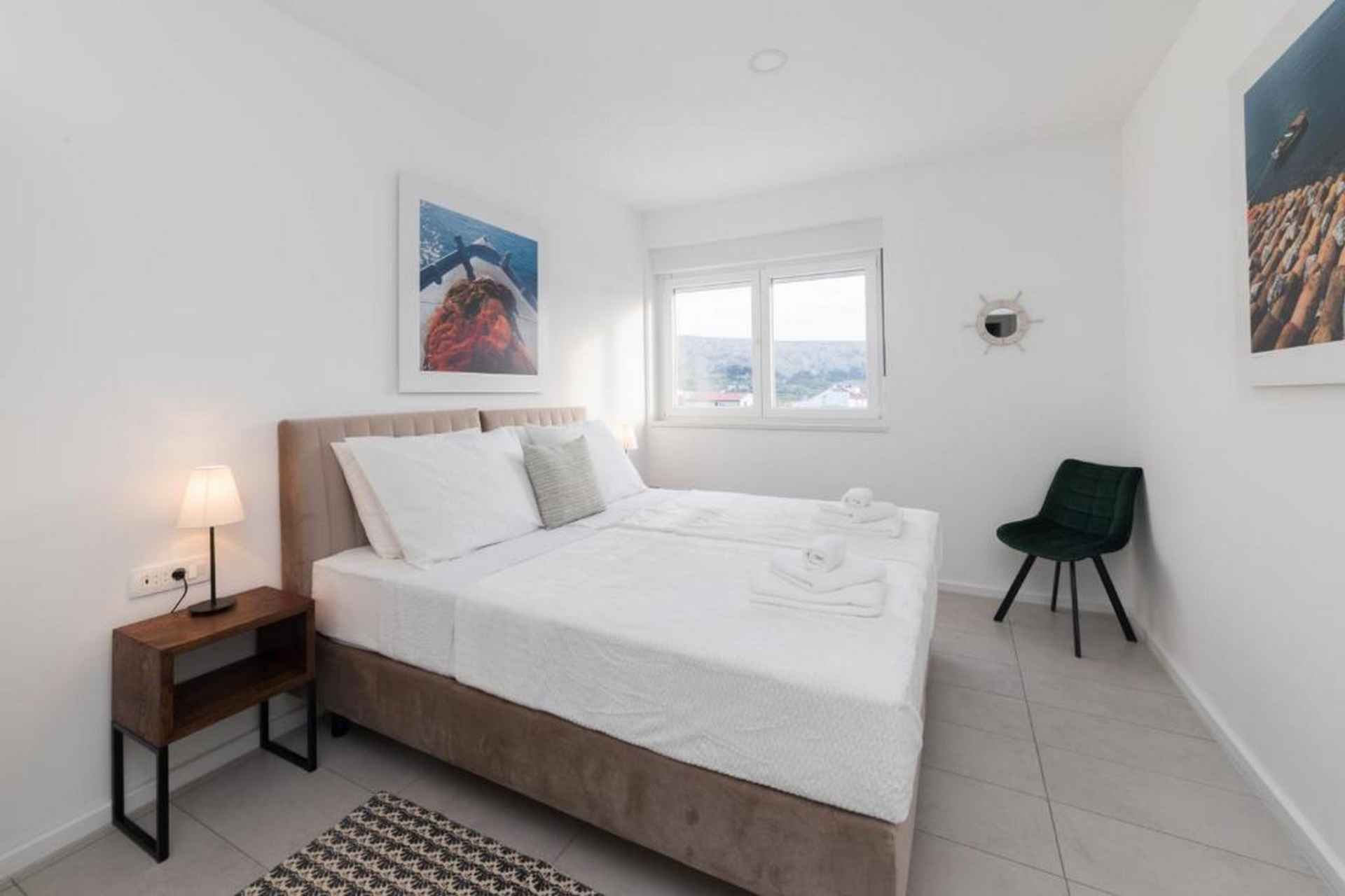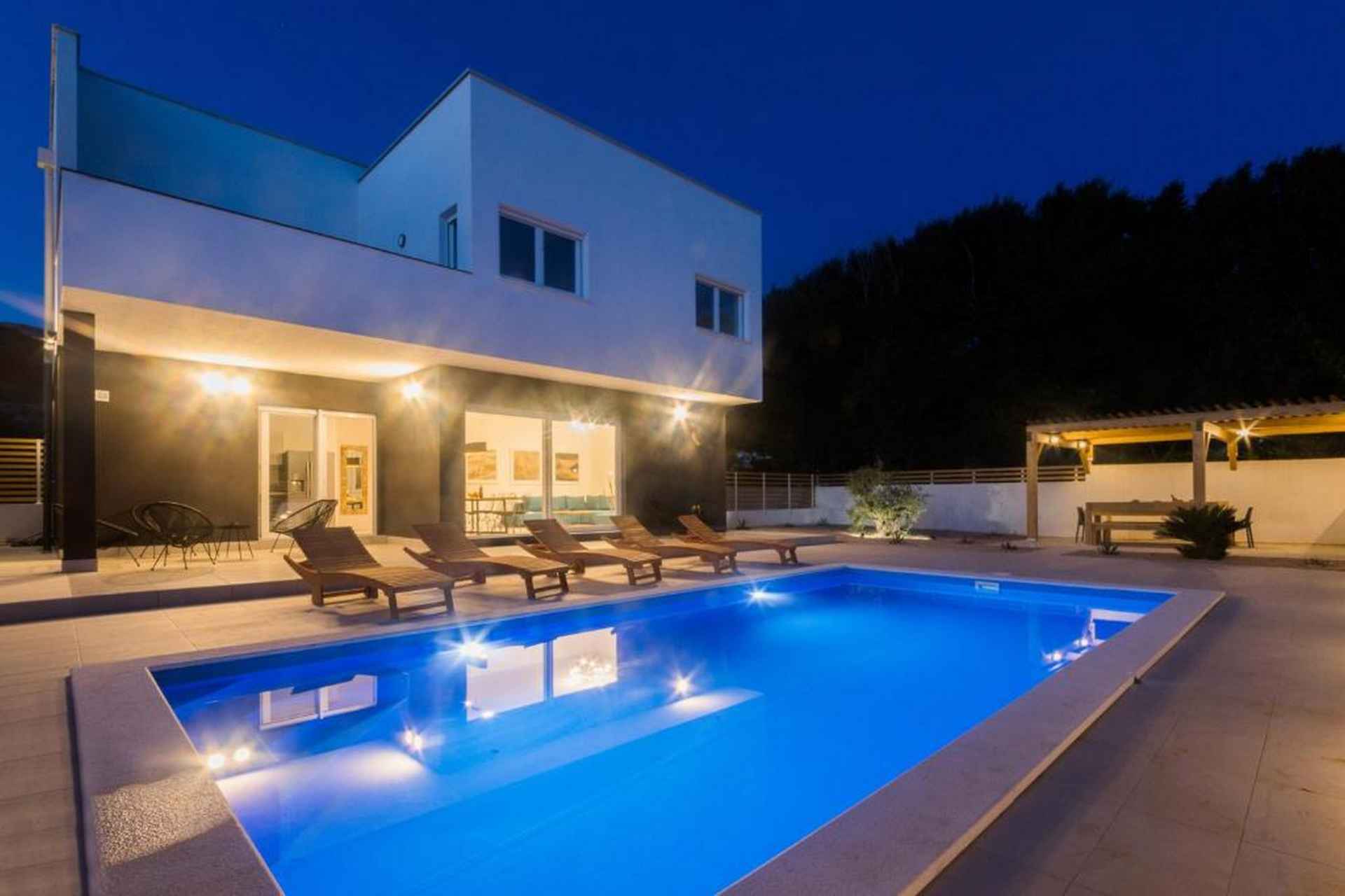 Oppdag en moderne og vakker villa som ligger på den sjarmerende øya Pag, og tilbyr en eksepsjonell ferieopplevelse for opptil 10 gjester. Denne romslige eiendommen kombinerer komfort, stil og fantastisk havutsikt som vil gjøre oppholdet ditt virkelig minneverdig. Villaen har fire soverom med seks komfortable senger, inkludert fire king-size-senger og to sovesofaer, noe som sikrer at alle har et perfekt sted å hvile. Med fire bad - fire med dusj og ett ekstra toalett - er det god plass for alle å forberede seg til dagens eventyr. Ditt private oppvarmede svømmebasseng (4x8 meter) er midtpunktet i utendørs avslapning, supplert med solsenger, utemøbler og et grillområde. Den inngjerdede tomten gir privatliv og sikkerhet, mens hagen og terrassen tilbyr flere plasser for å slappe av og nyte middelhavsatmosfæren. Innvendig finner du et fullt utstyrt uavhengig kjøkken med moderne fasiliteter, inkludert kjøleskap, fryser, oppvaskmaskin, stekeovn, kaffemaskin og alt nødvendig kjøkkenutstyr. Stuene har smart-TVer, spisebord og komfortable sitteplasser, noe som skaper et perfekt miljø for gruppesamlinger. Villaen ligger kun 550 meter fra stranden Pagus, med både sand- og steinstrand, og tilbyr praktisk tilgang til lokale attraksjoner. Et supermarked, restaurant og kaffebar ligger innen gangavstand, mens gamlebyen og flyplassen i Zadar er lett tilgjengelig for dagsturer. Ytterligere fasiliteter inkluderer klimaanlegg, WiFi, privat parkering for tre biler og en sterk boks for verdisakene dine. Ett lite kjæledyr er velkommen, noe som gjør dette til et ideelt valg for familier og små grupper som søker et komfortabelt kroatisk feriehus. Barneseng og barnestol er på forespørsel. Røyking er ikke tillatt. Ett kjæledyr er tillatt, opptil maks 10 kilo og det betales kontant ved ankomst 20 euro per bestilling. Det er TV i stuen og ett soverom. Ett separat toalett, fire bad (3 med eget bad). Utendørsbasseng, møbler, dusj, solsenger og BBQ.