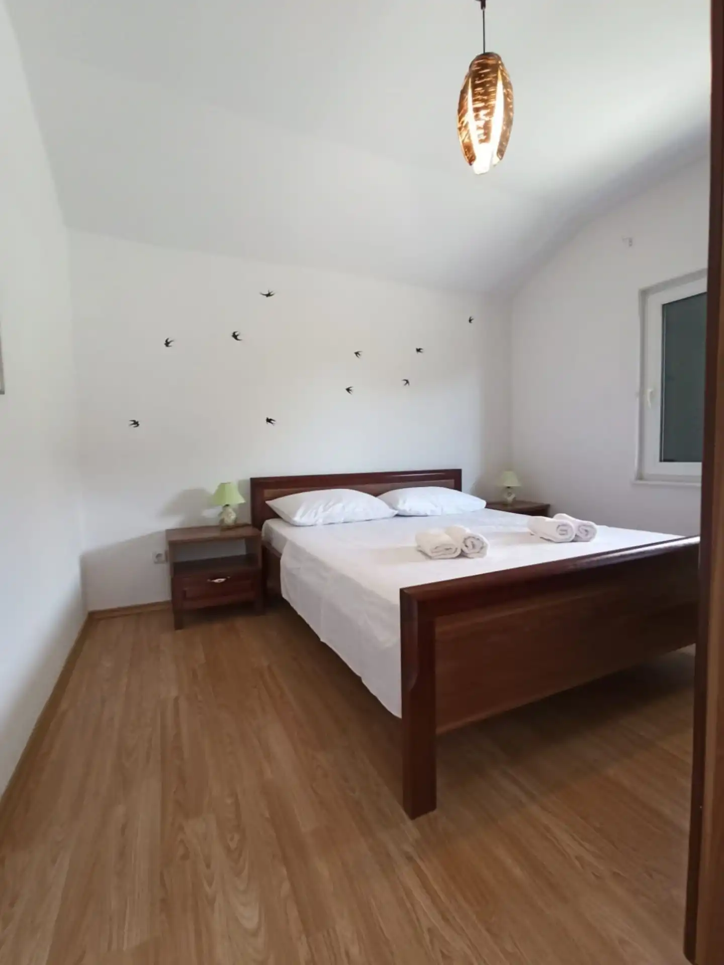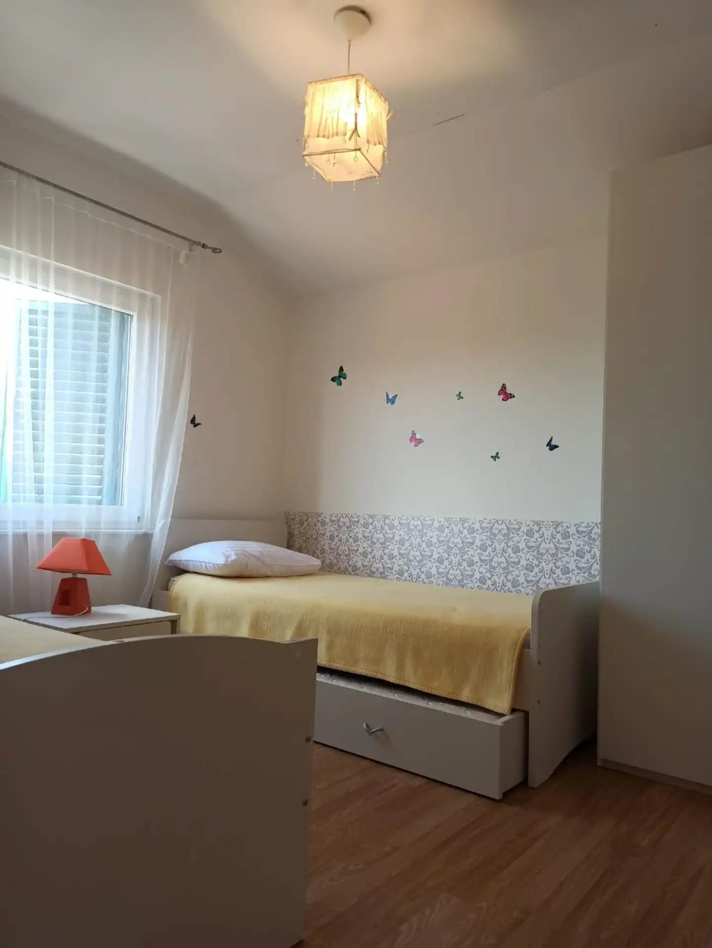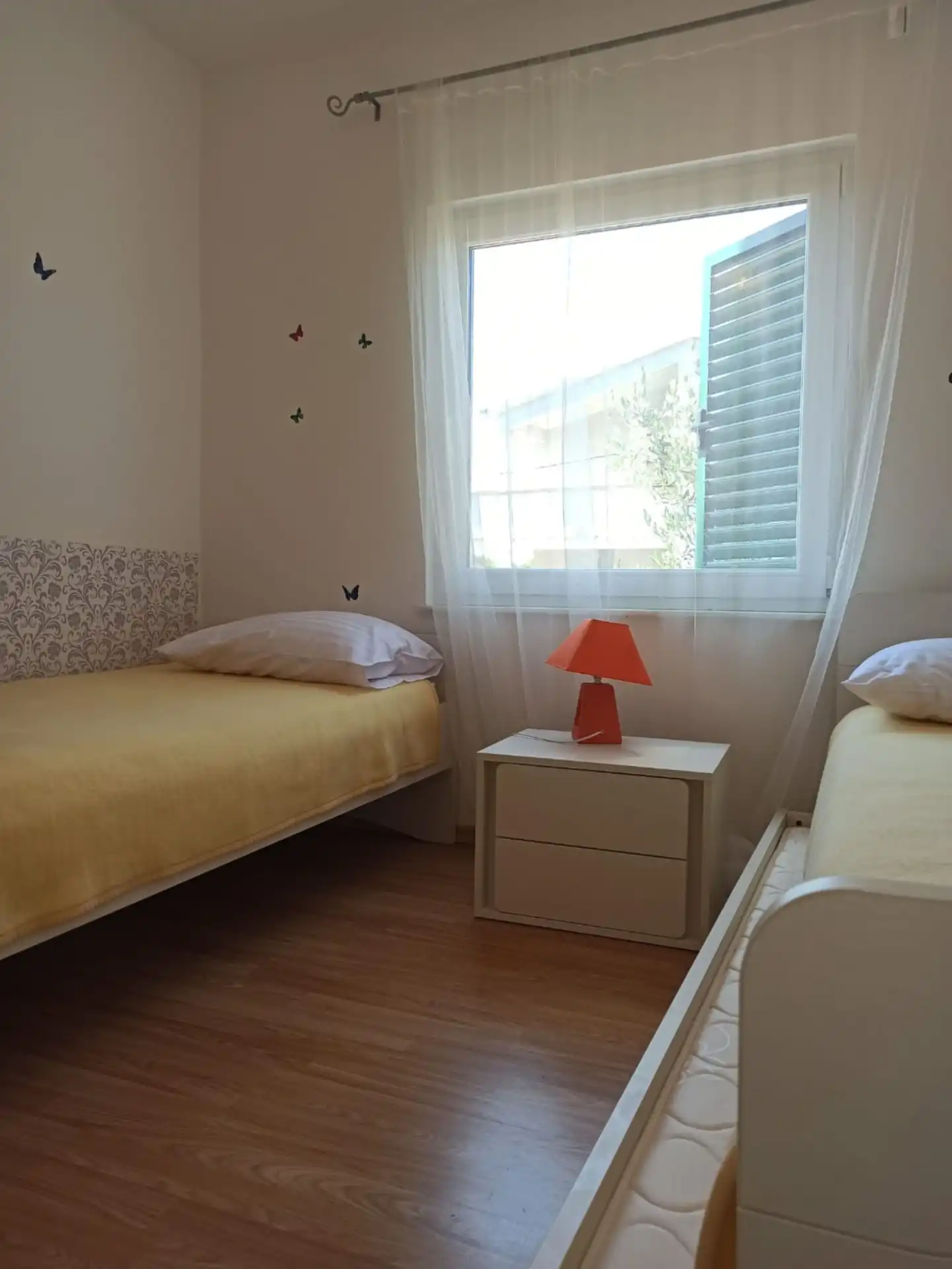Apartment Aurora er lokalisert i Tribunj. Tribunj er en landsby og en kommune i Šibenik-Knin fylke i Kroatia. Det ligger omtrent tre kilometer nordvest for Vodice og er kjent for sine fredelige kafeer ved sjøen. Tribunj kommune har 2 byer: Tribunj og Sovje, mot vest, en rolig landsby kjent for sin sjarmerende strand. Denne leiligheten med 2 soverom har Wi-Fi, klimaanlegg og flatskjerm-TV. Kjøkkenkroken er utstyrt med komfyr, elektrisk ovn, kjøkkenutstyr, vannkoker, mikrobølgeovn, kjøleskap, oppvaskmaskin og spisebord. Stue har flatskjerm-TV og sofa. Det er to soverom. Det første soverommet har en stor dobbeltseng og det andre har to enkeltsenger. Det er en ekstra seng. Badet har dusj, toalett, vaskemaskin, hårføner og toalettsaker. Det er også en terrasse med utemøbler og utsikt over hagen. Parkering er gratis og tilgjengelig på stedet. Wi-Fi og klimaanlegg er gratis. Husdyr er tillatt med varsel, gratis. Røyking er ikke tillatt i leiligheten, kun ute. Hage, BBQ og utemøbler. Stranden ligger 270 meter unna. Markedet ligger 900 meter unna. Restauranten ligger 650 meter unna. Kaffebaren ligger 550 meter unna. Kjøpesenteret ligger 14 km unna. Nasjonalparken Krka ligger 27 km unna. Vranasjøen ligger 31 km unna. Zadar lufthavn ligger 77 km unna.